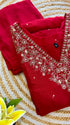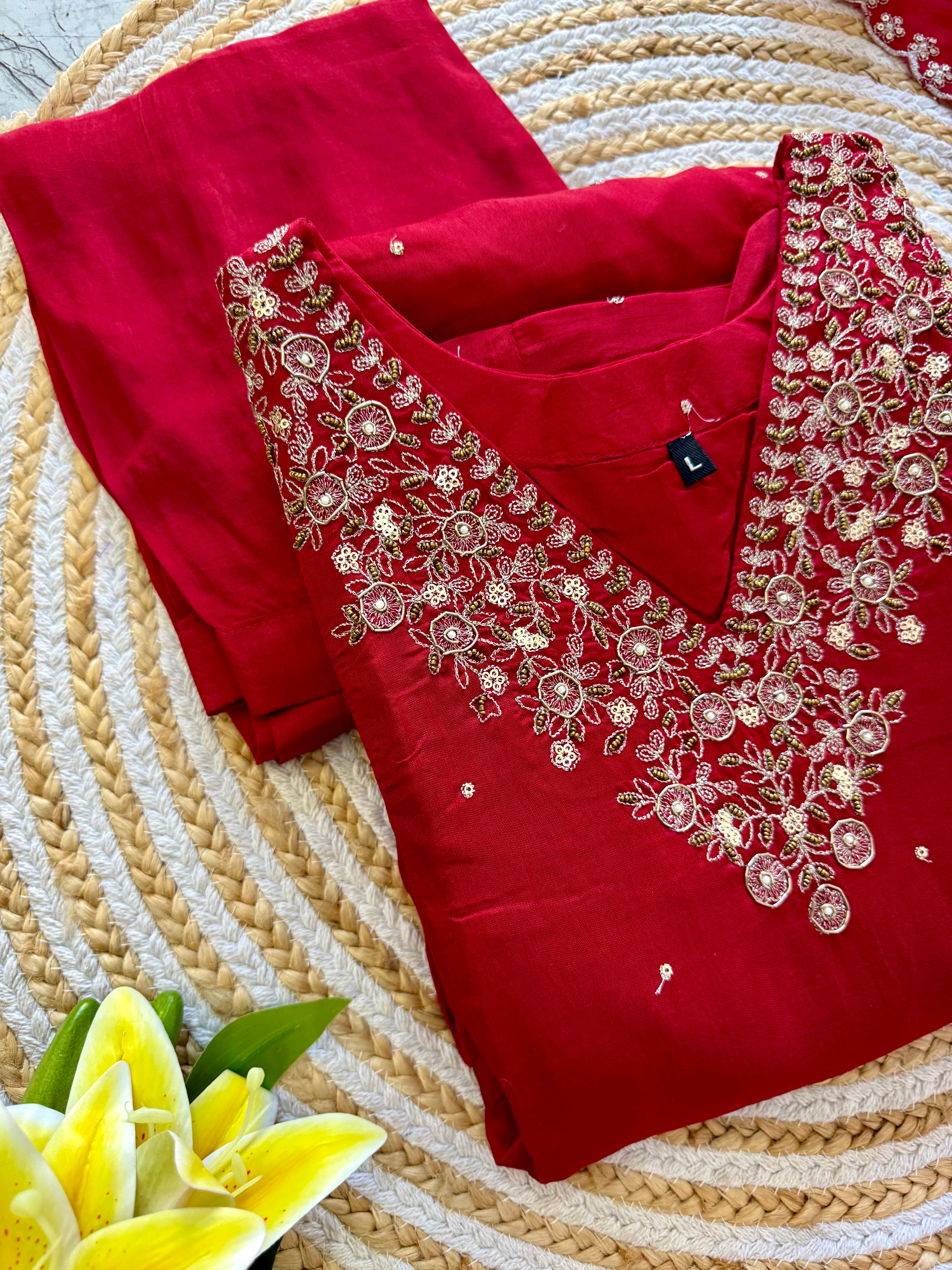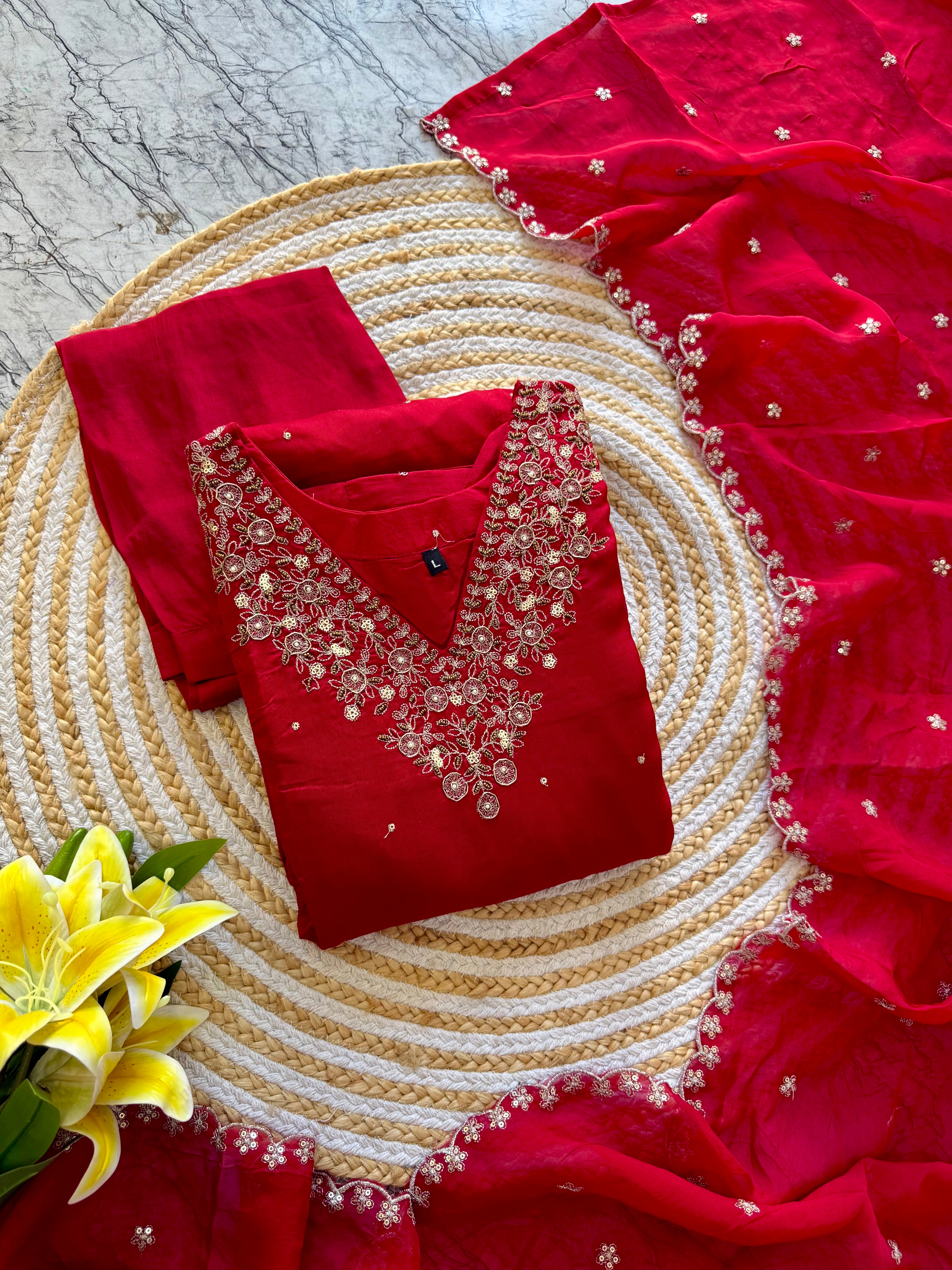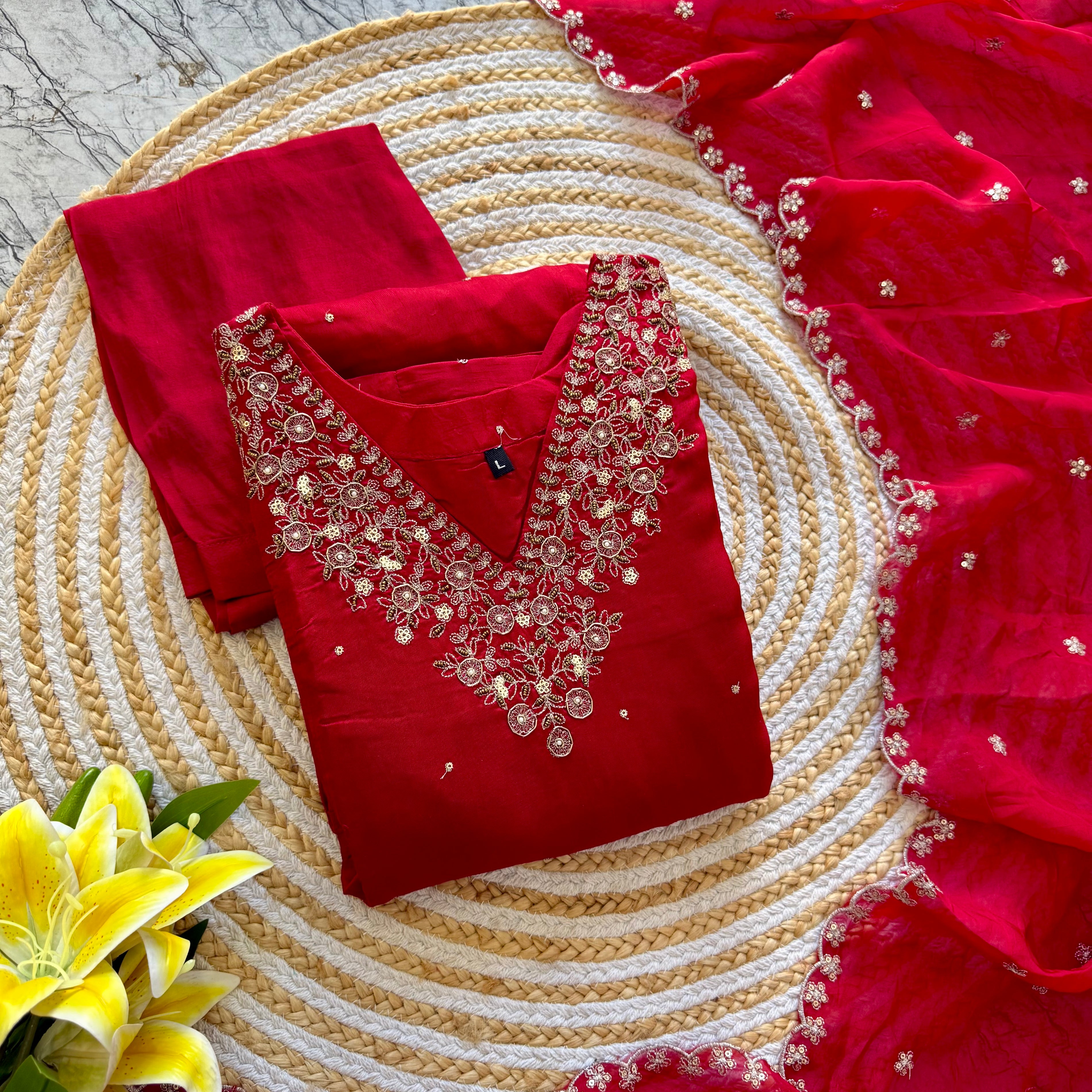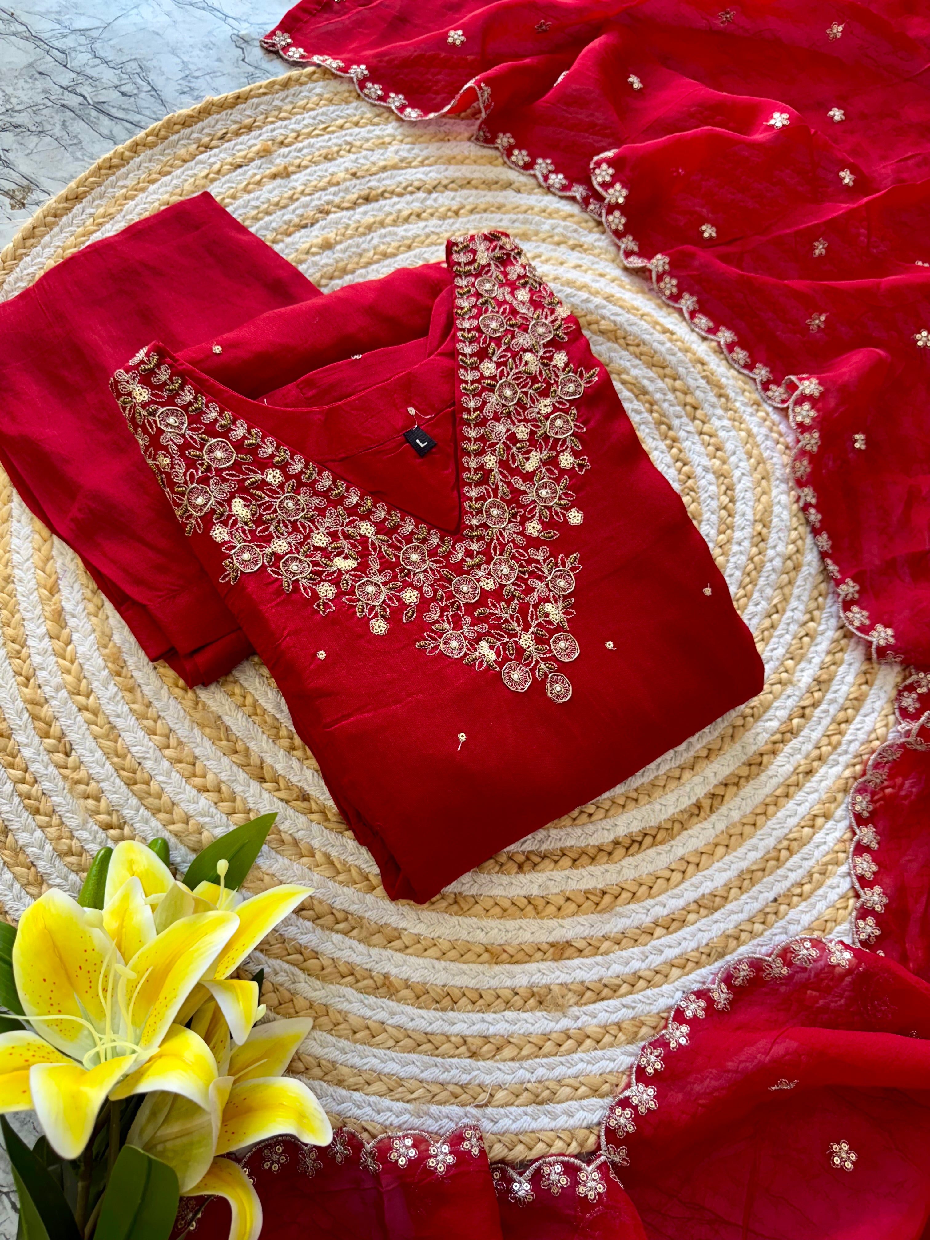 This Tissue silk Anarkali boasts handcrafted details and comes with matching pants and an organza dupatta. Luxurious and elegant, this ensemble is perfect for special occasions. The intricate handiwork adds a unique touch, making this outfit a true standout.
