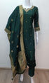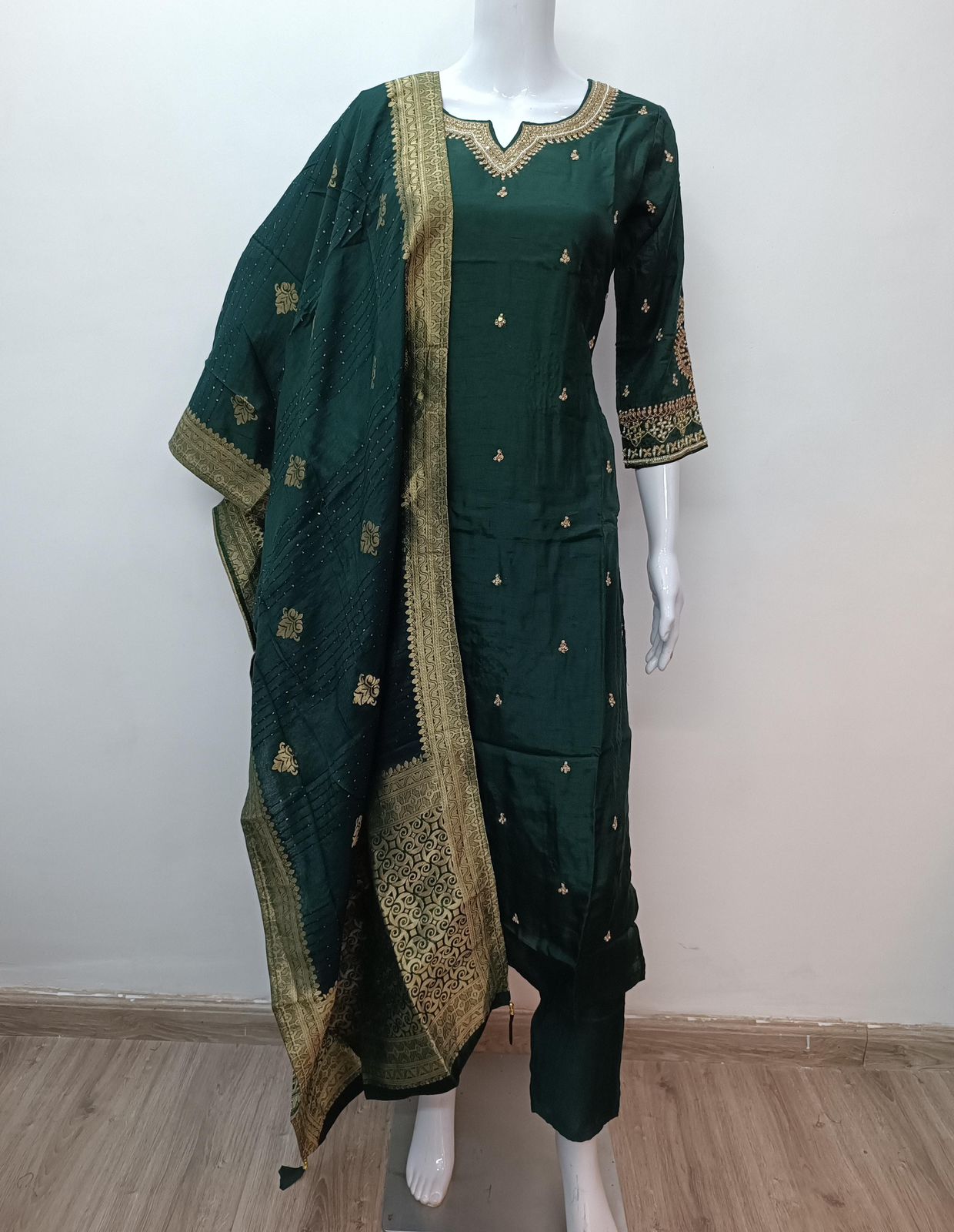 Premium range dola silk set with heavy Handwork on the yoke & sleeve with a beautiful woven Banarasi dupatta and a plane dola silk bottom