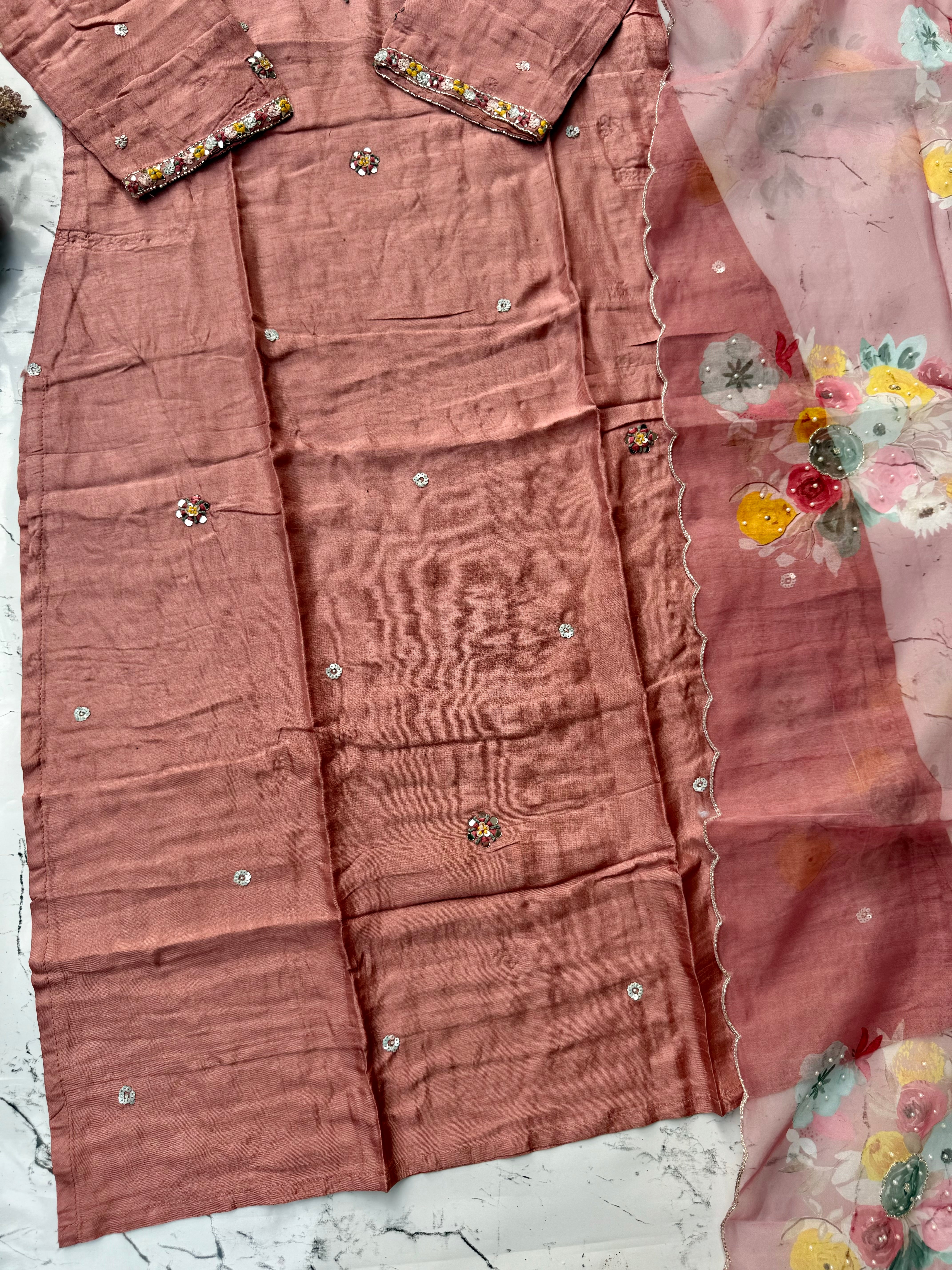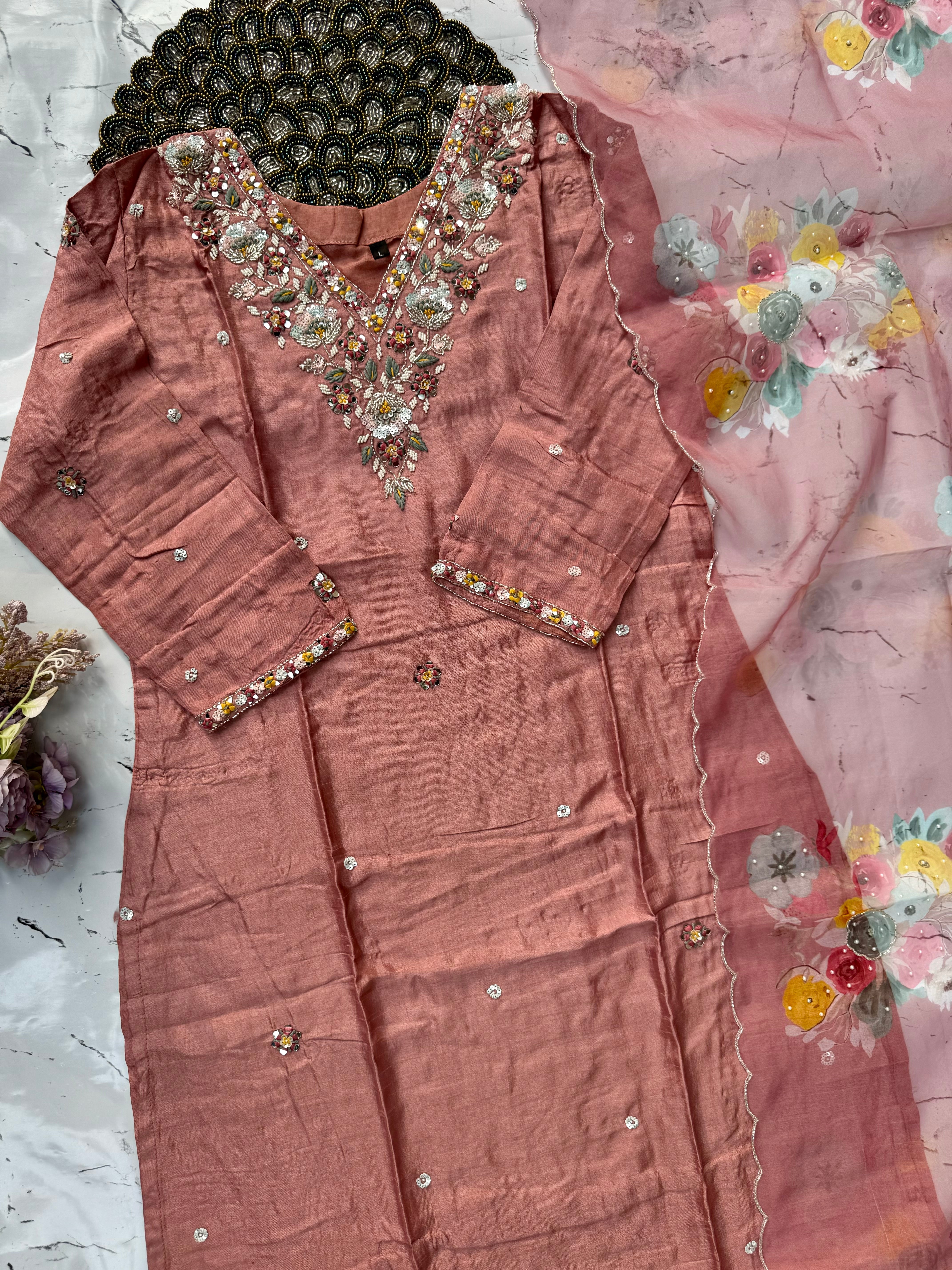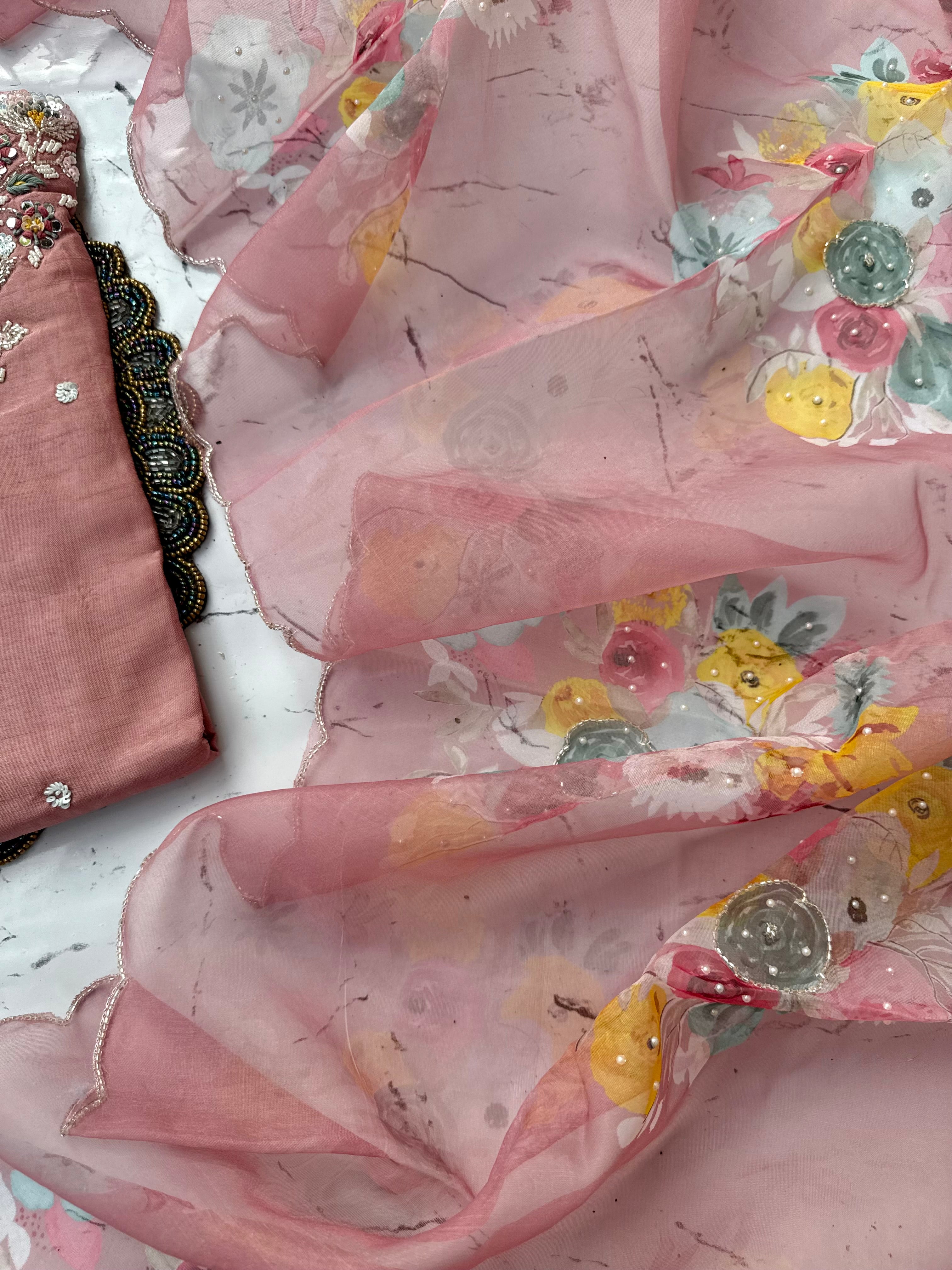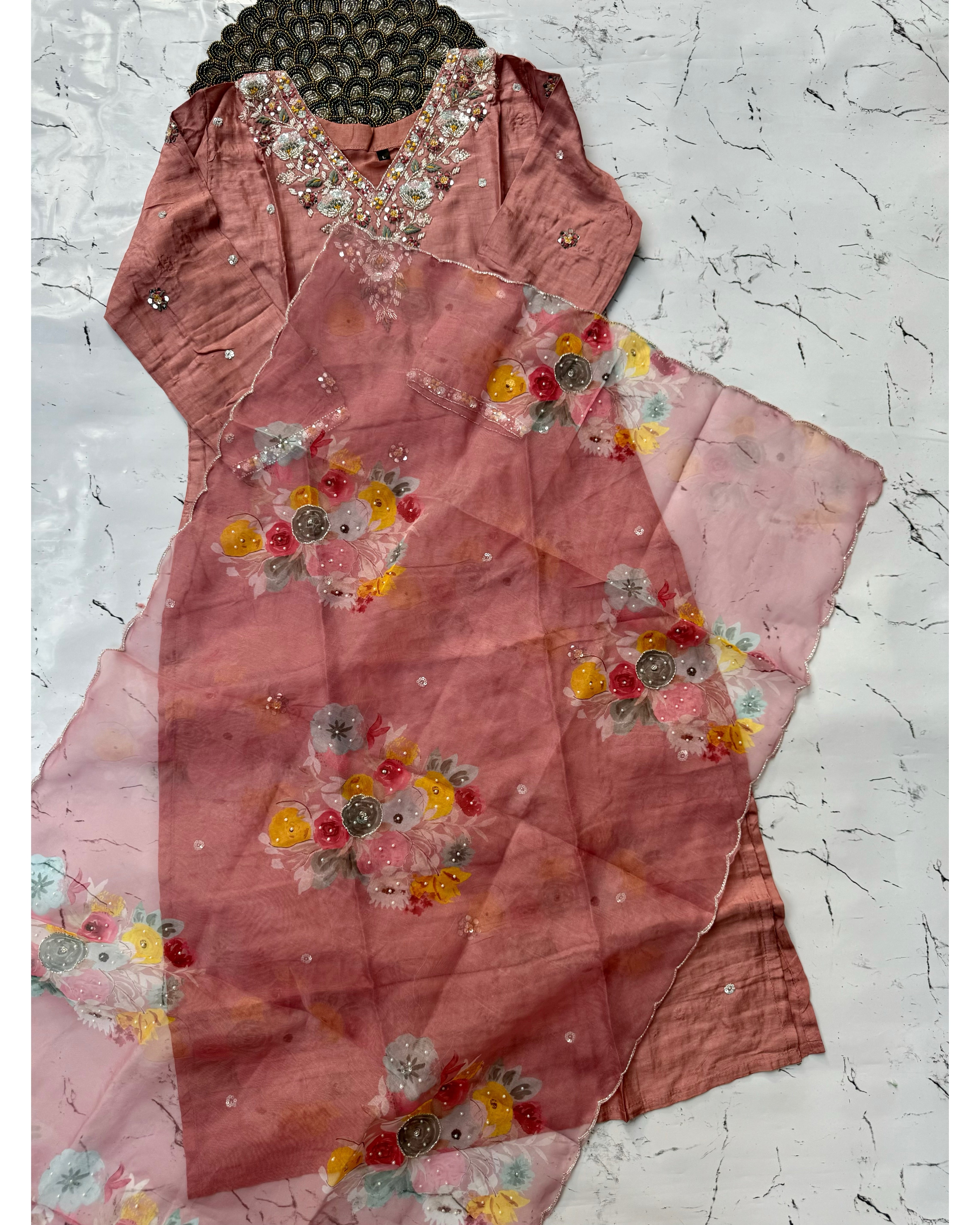 Dola silk kurti dupatta bottom set with handwork on the yoke and sleeves of the kurta with a beautiful Printed & handwork organza dupatta with a silk bottom with work