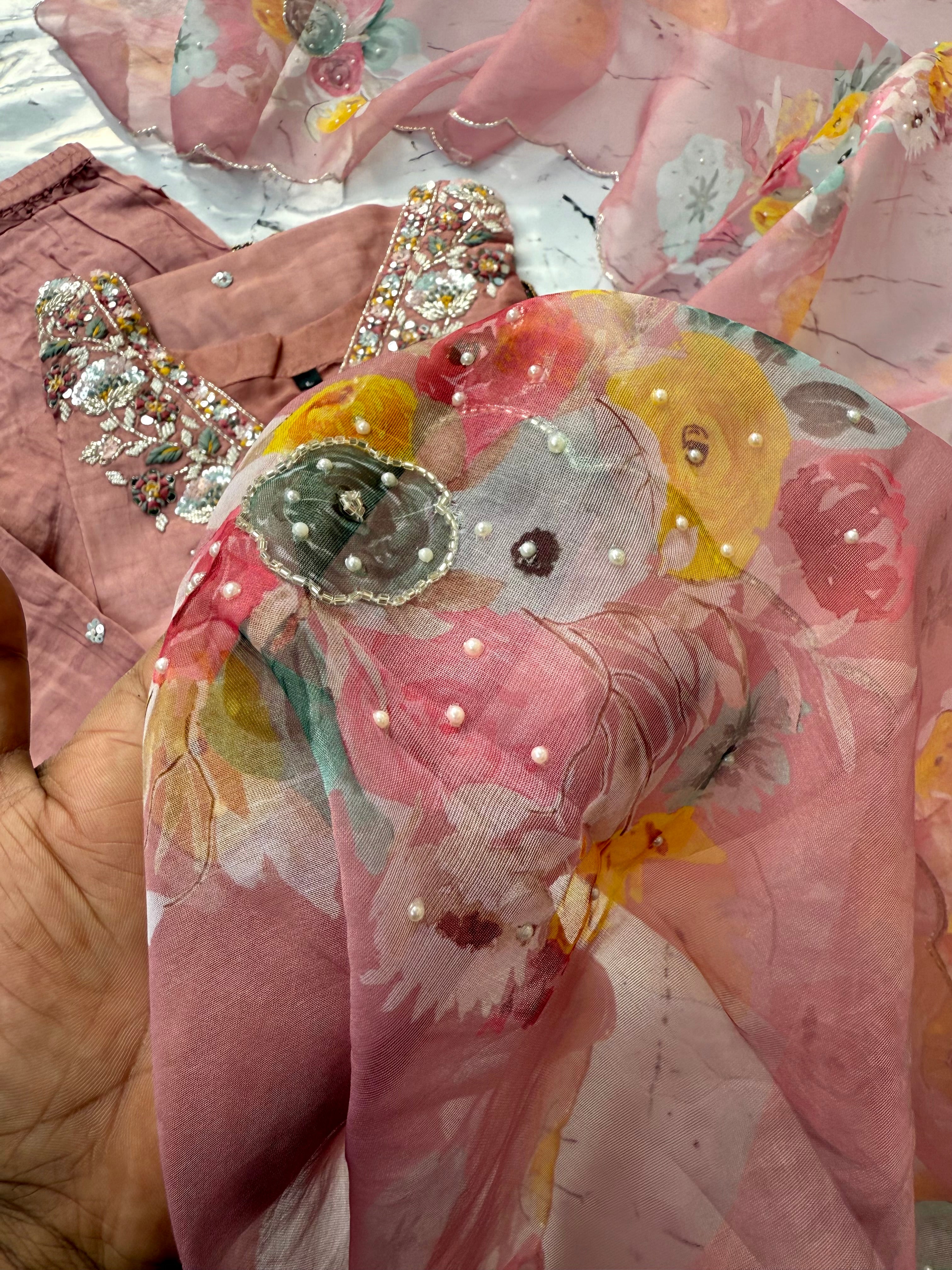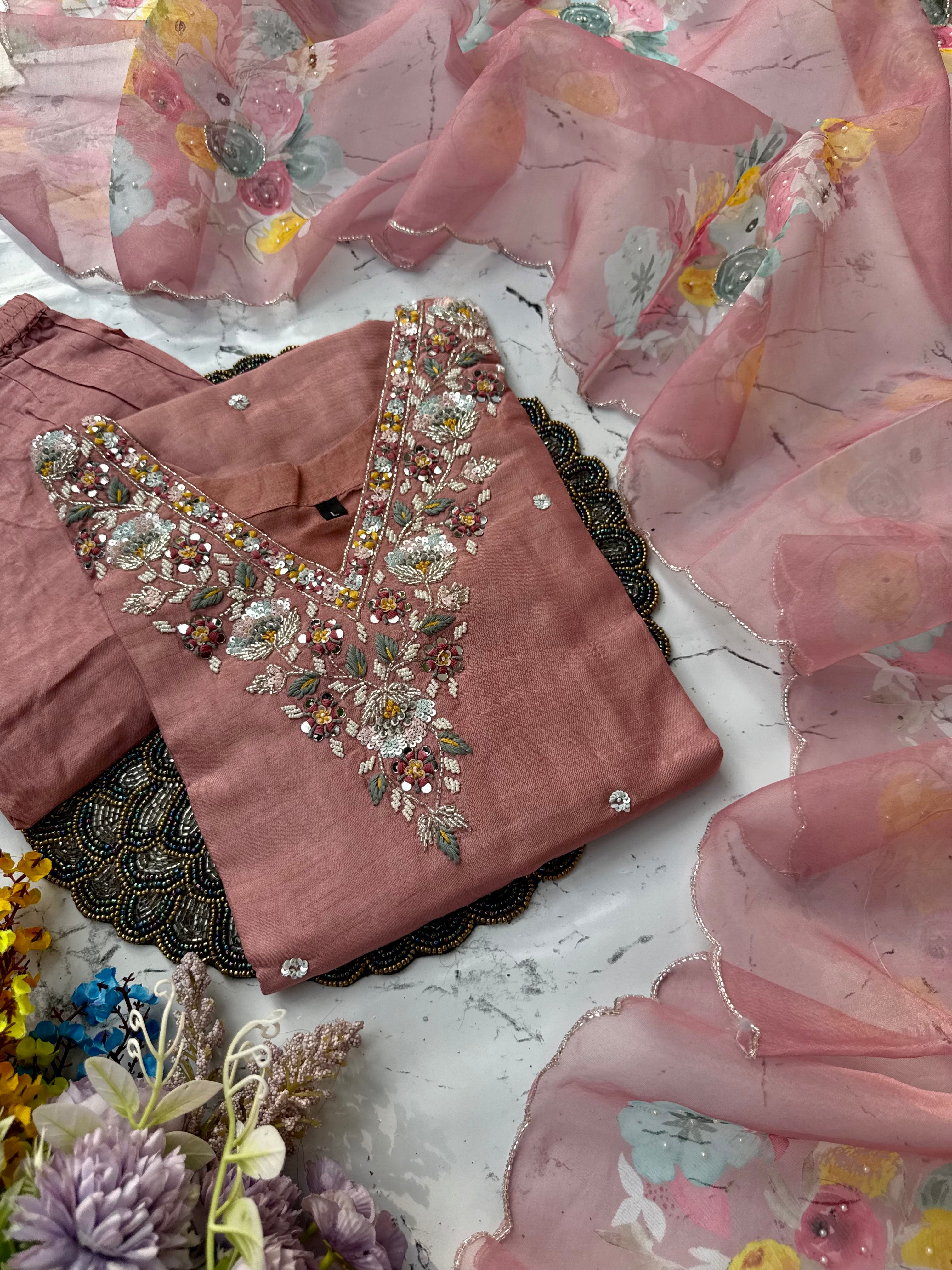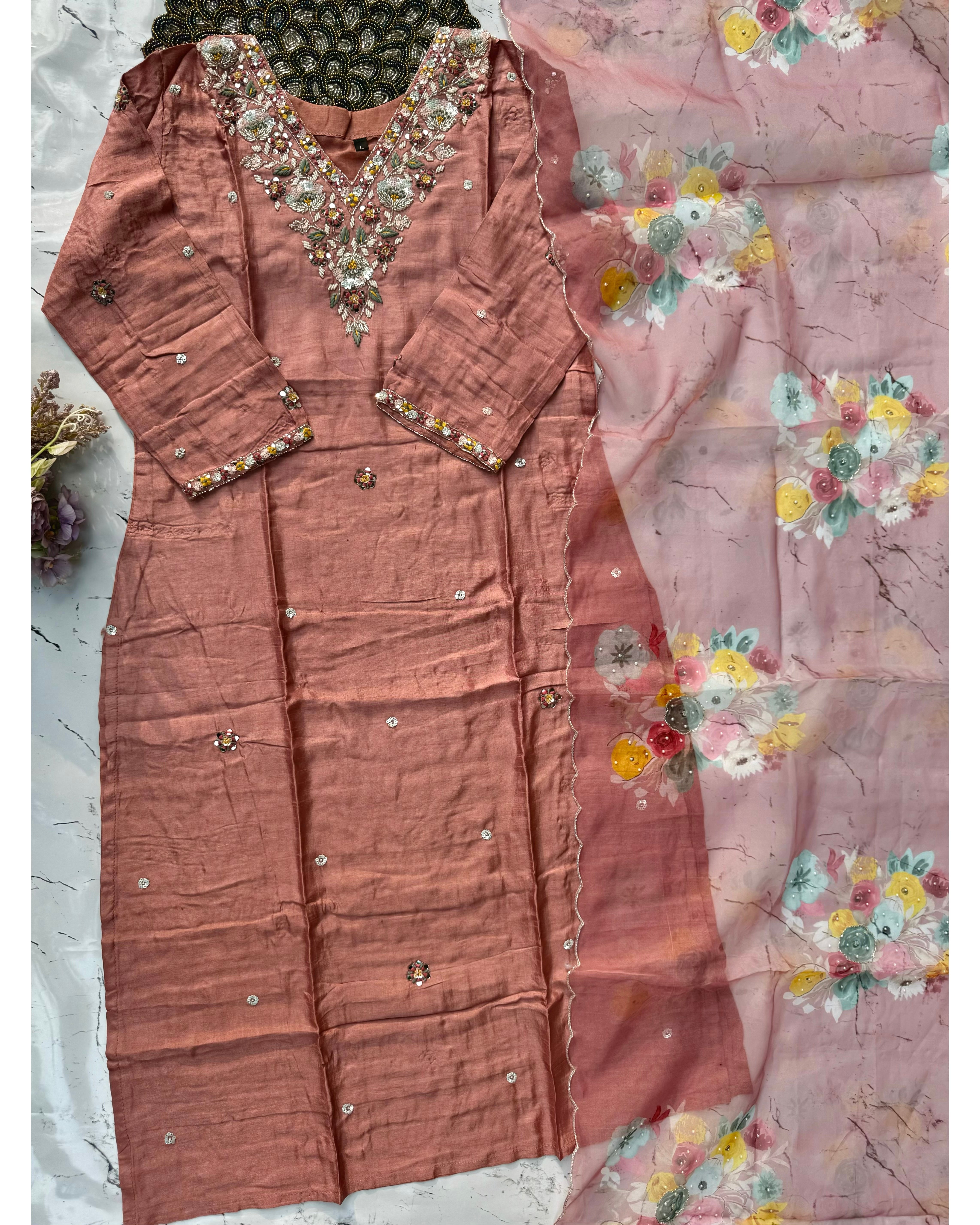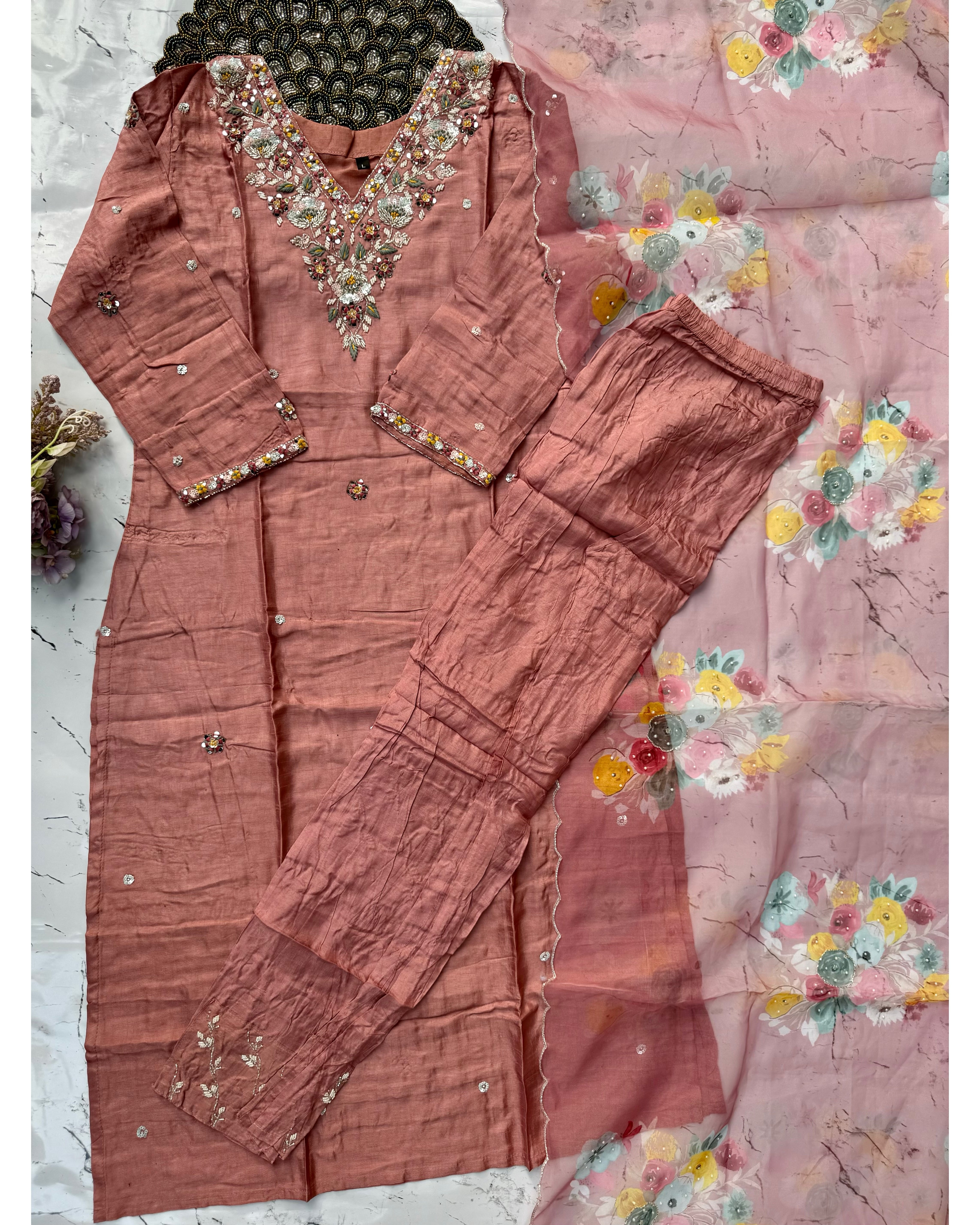 Dola silk kurti dupatta bottom set with handwork on the yoke and sleeves of the kurta with a beautiful Printed & handwork organza dupatta with a silk bottom with work