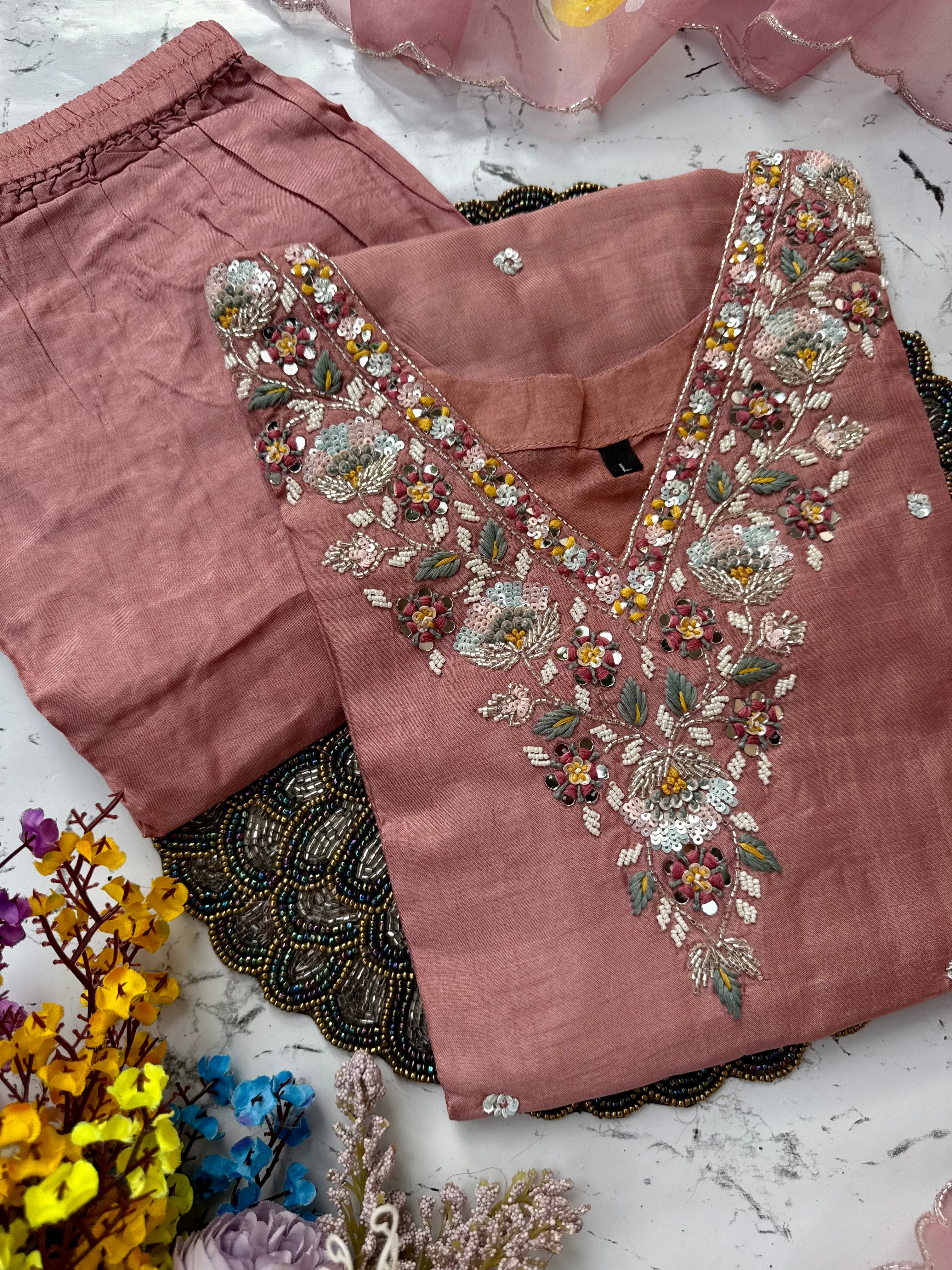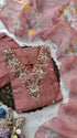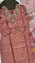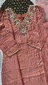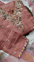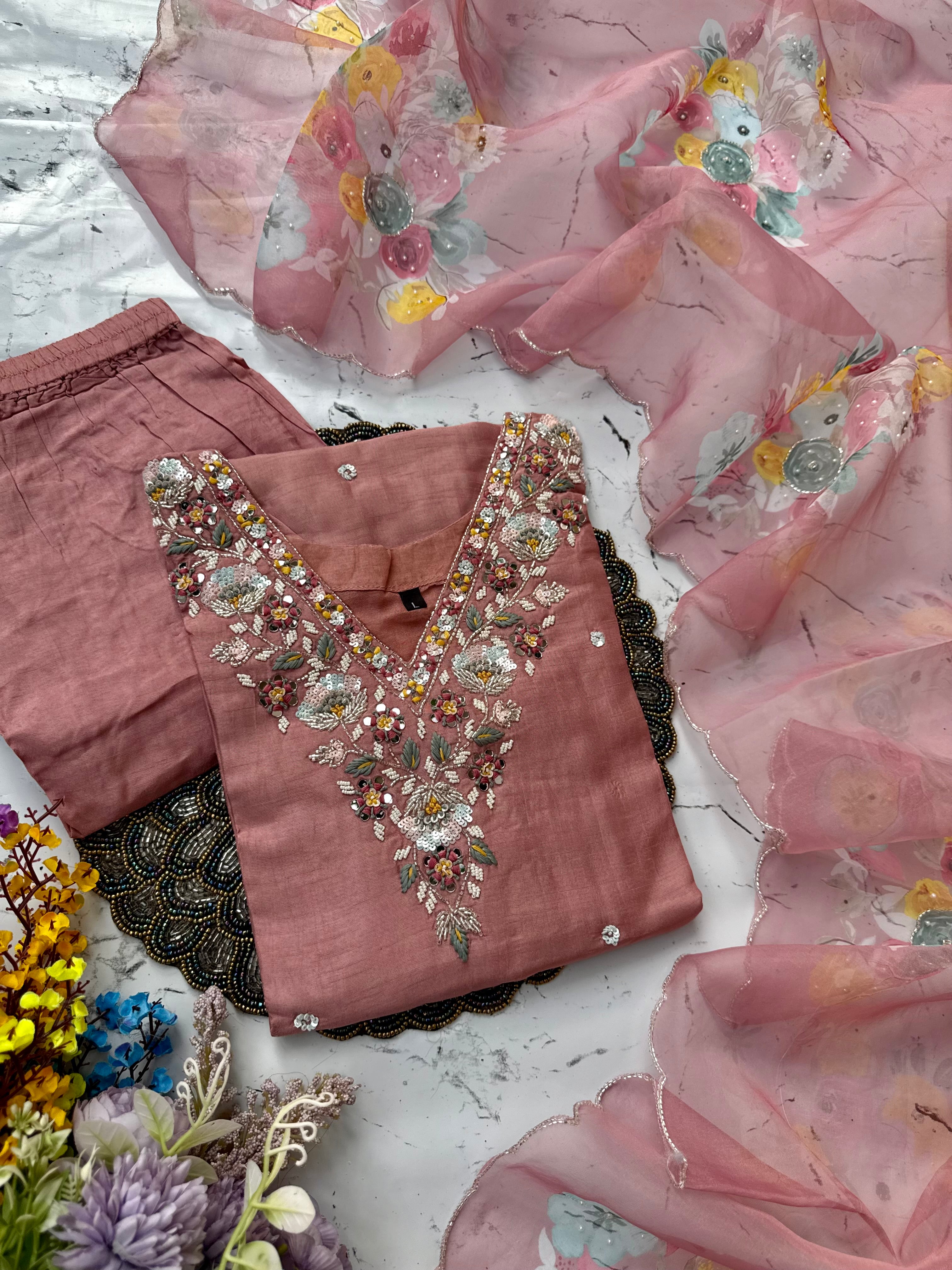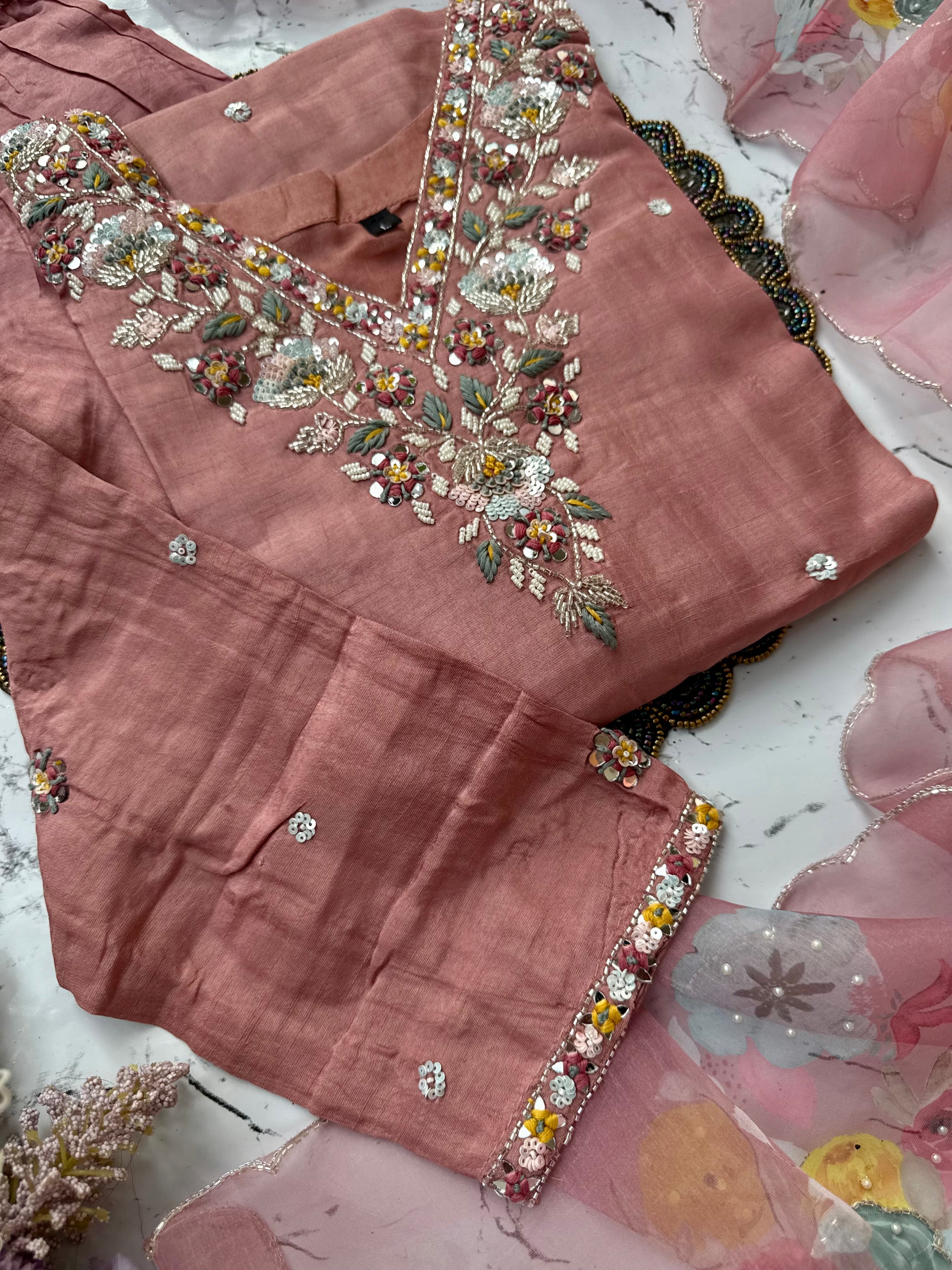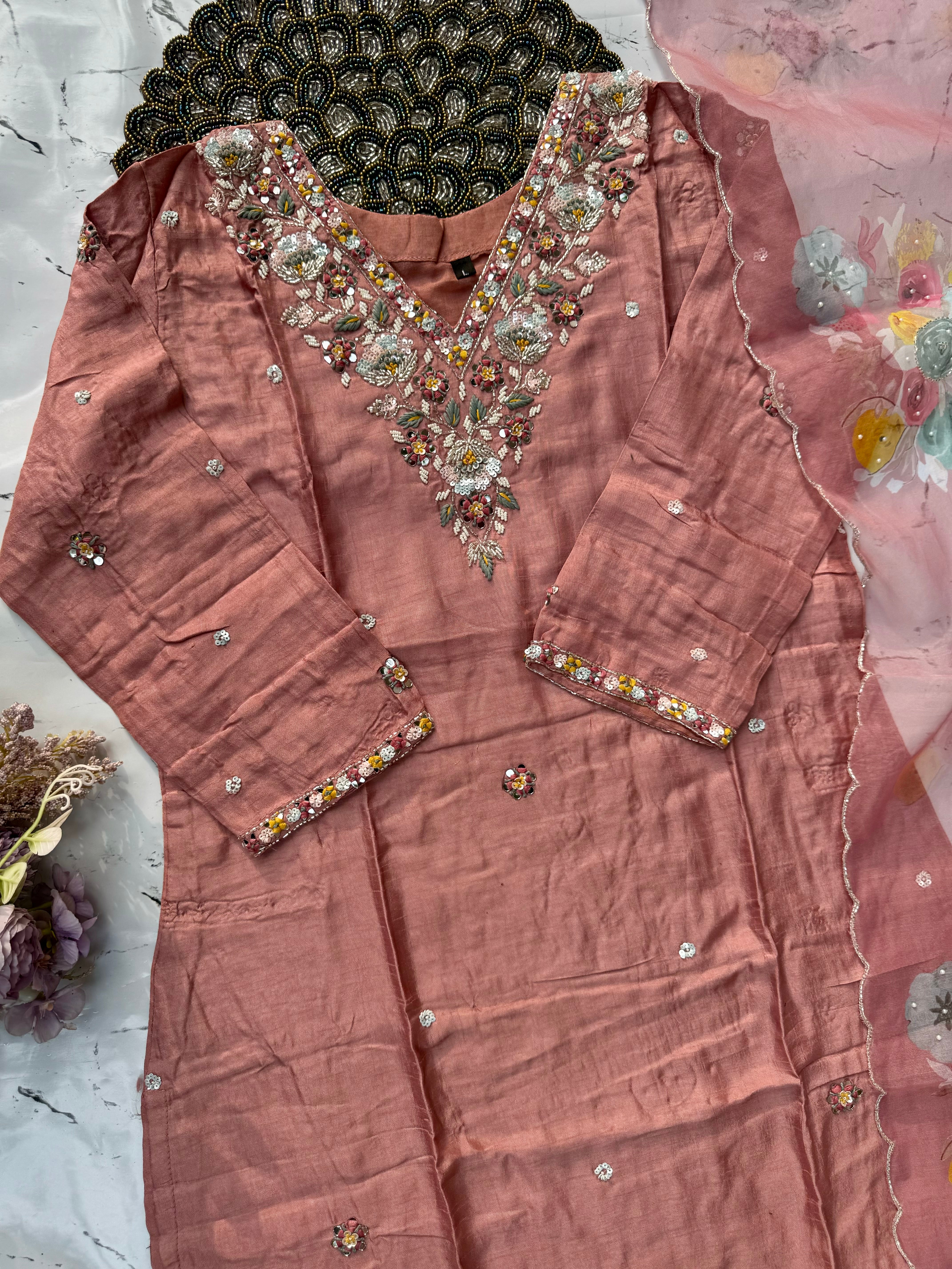 Dola silk kurti dupatta bottom set with handwork on the yoke and sleeves of the kurta with a beautiful Printed & handwork organza dupatta with a silk bottom with work