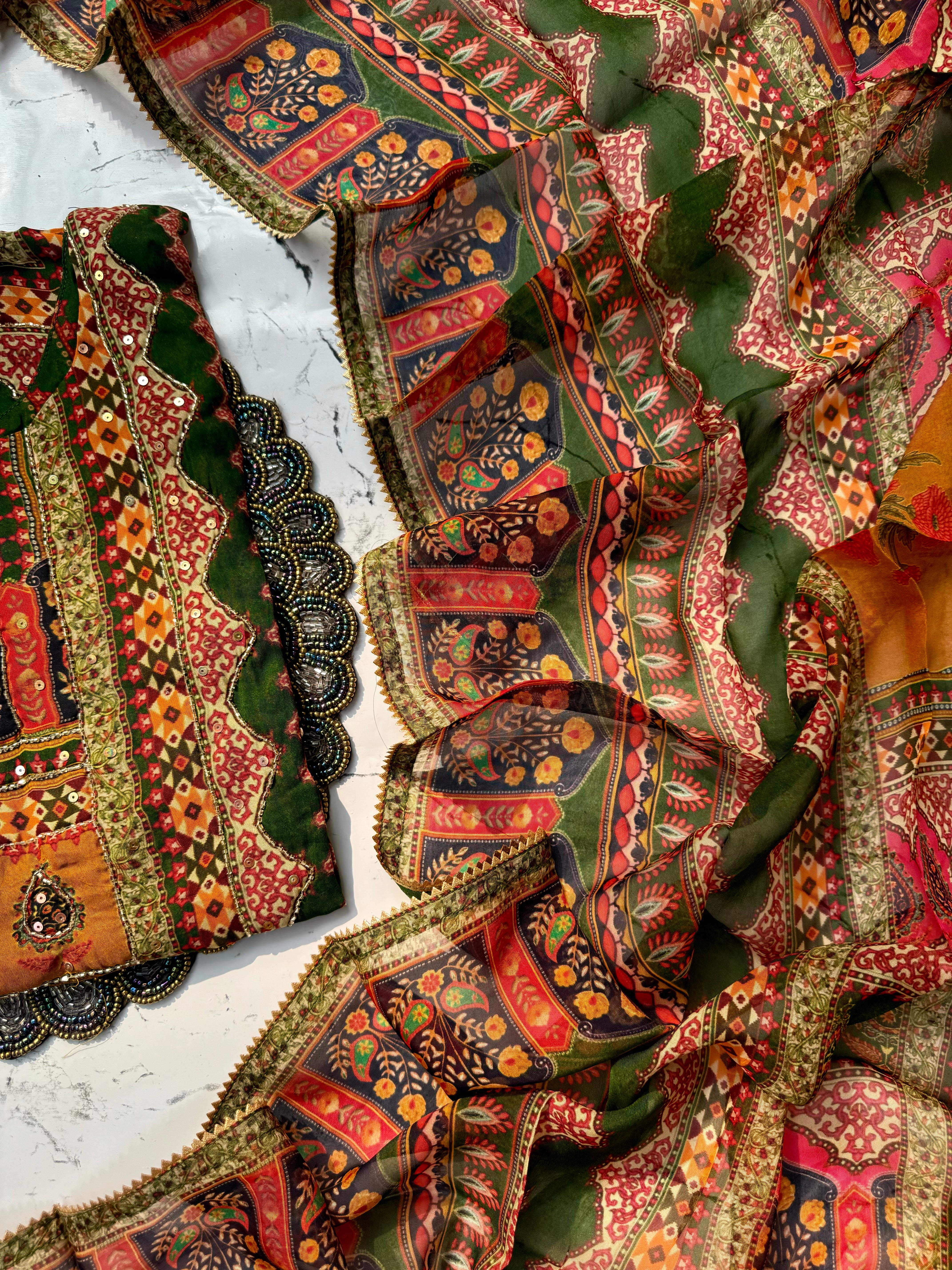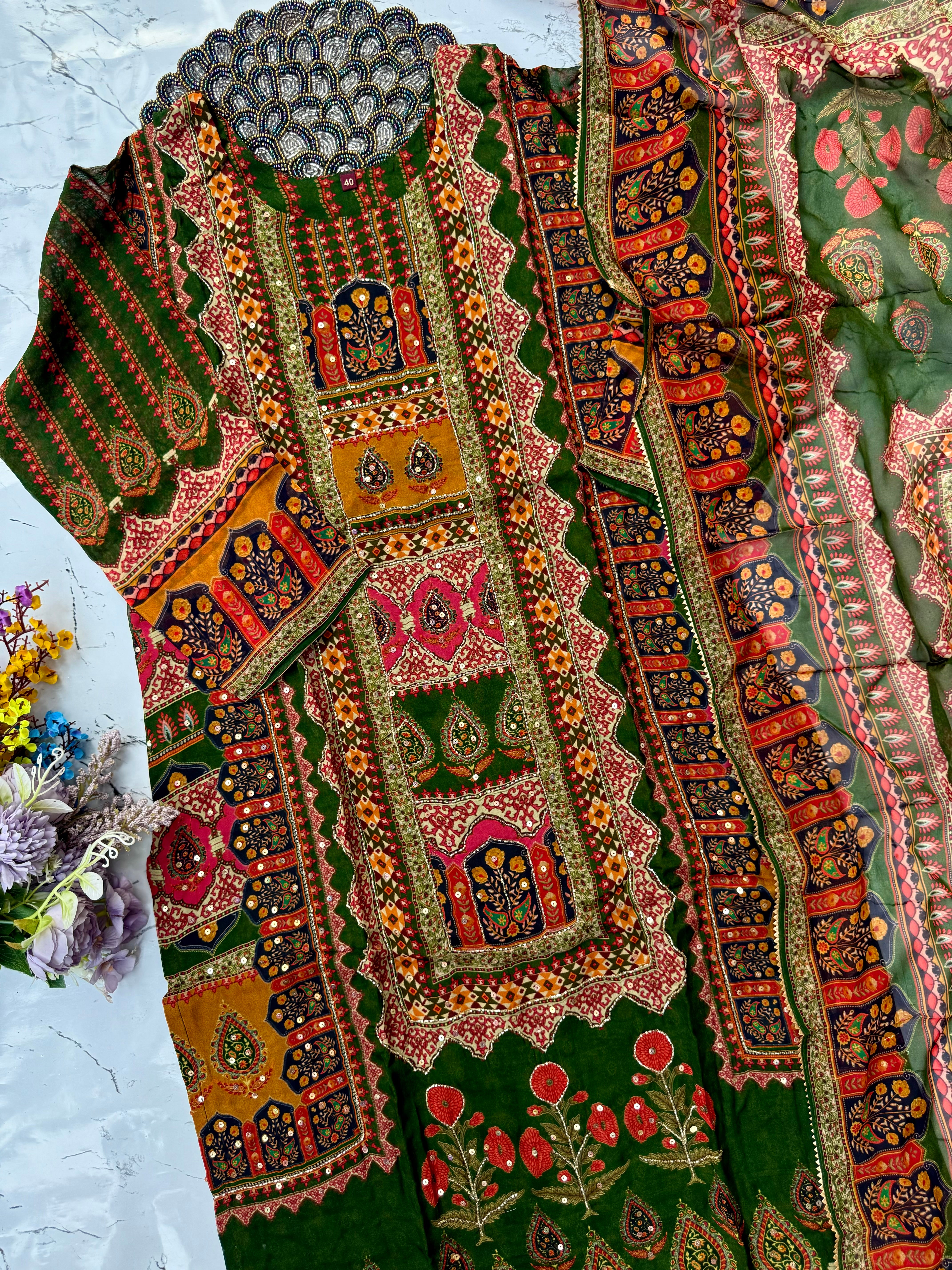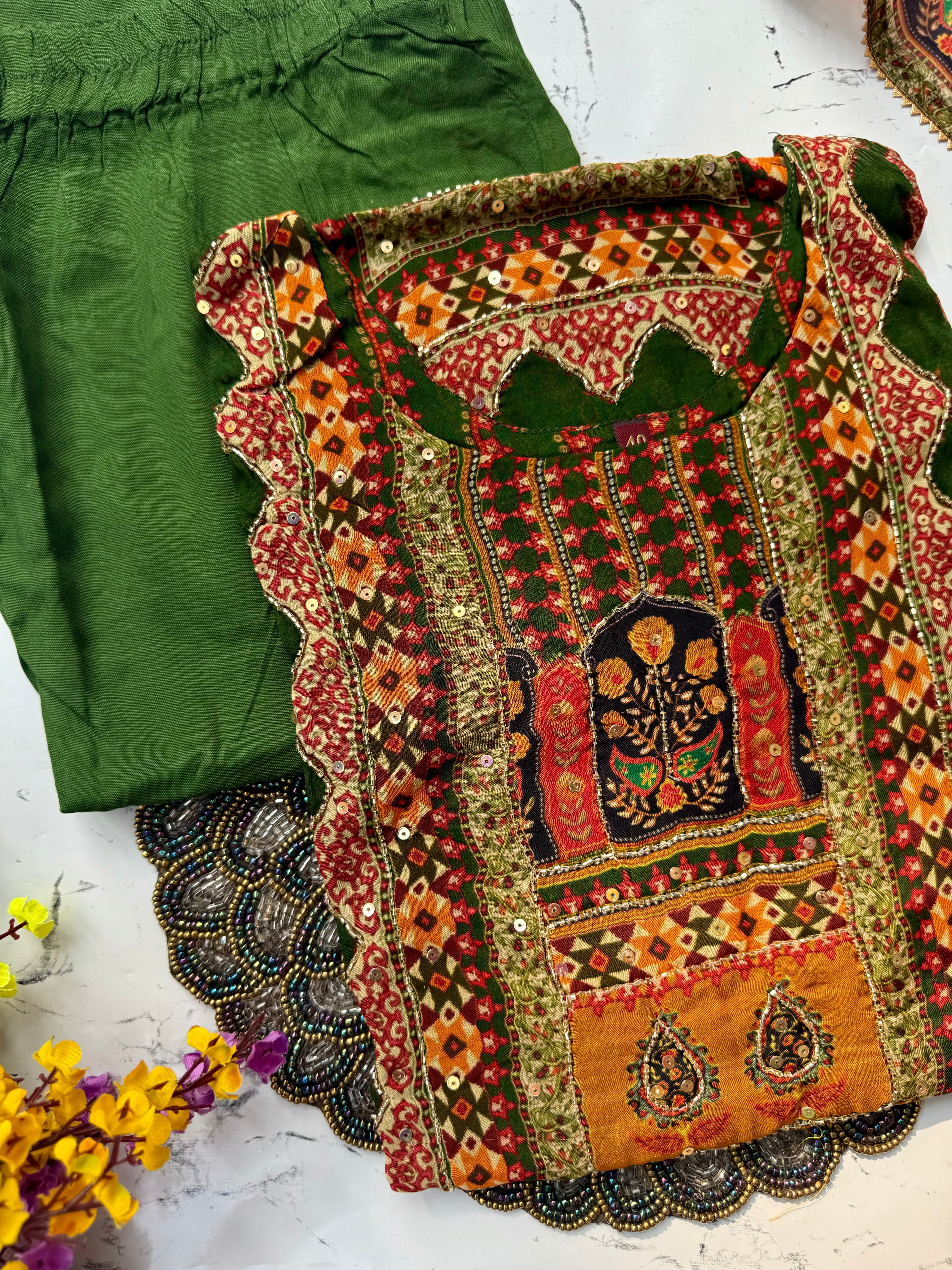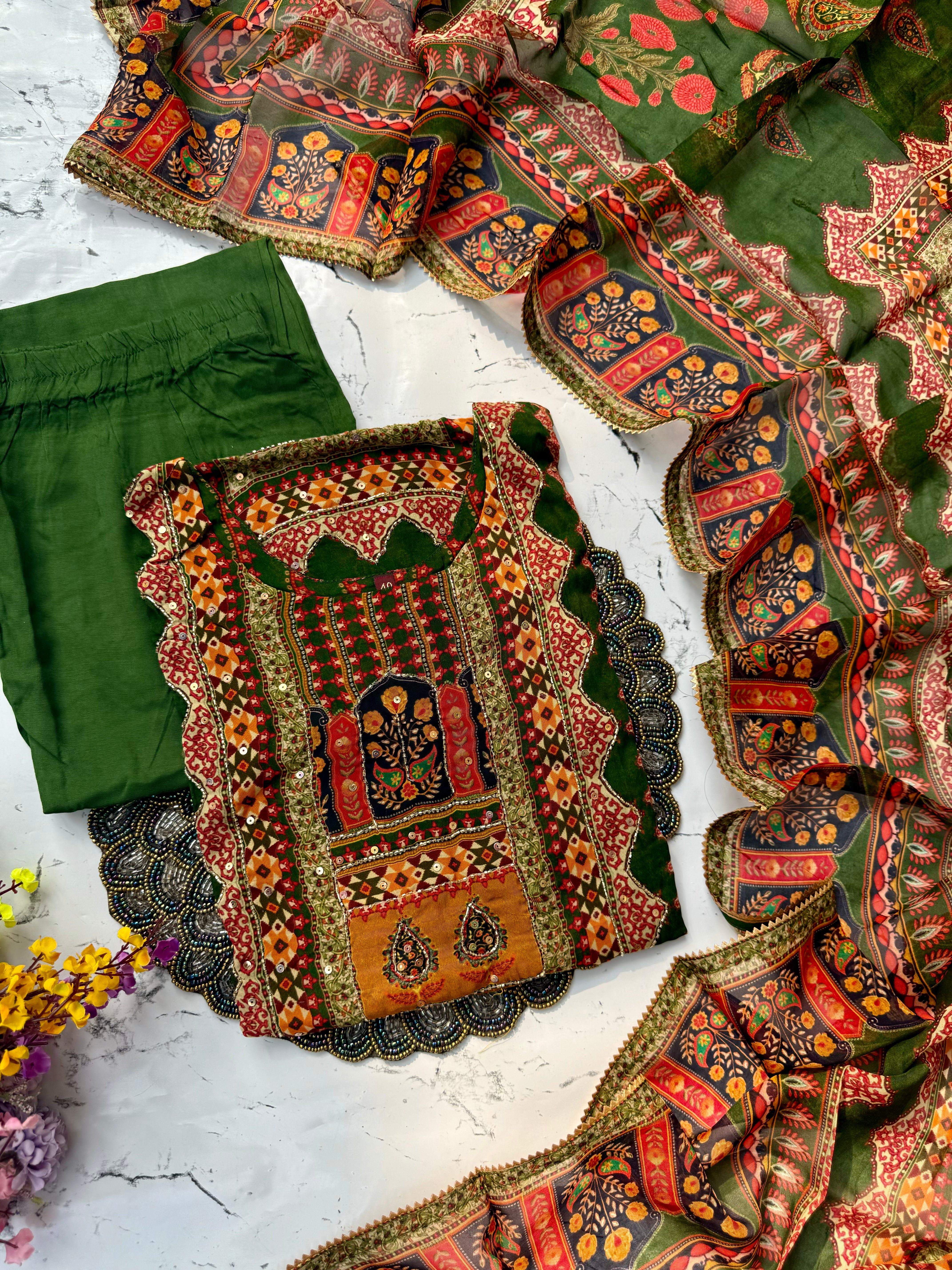Dola silk kurti dupatta bottom set with handwork on the yoke and sleeves of the kurta with a beautiful contrast Printed Banarsi dupatta with a plane silk bottom with work