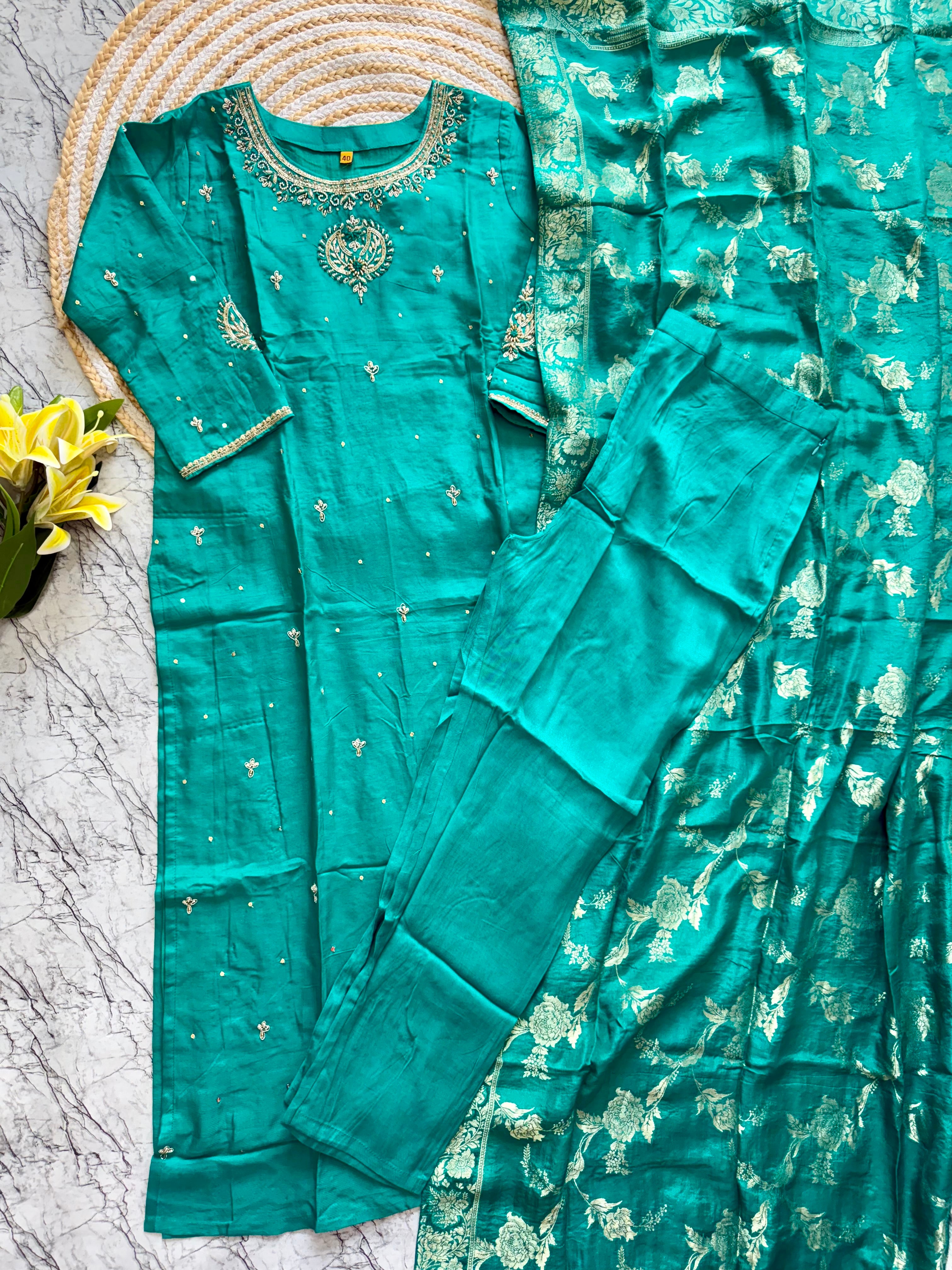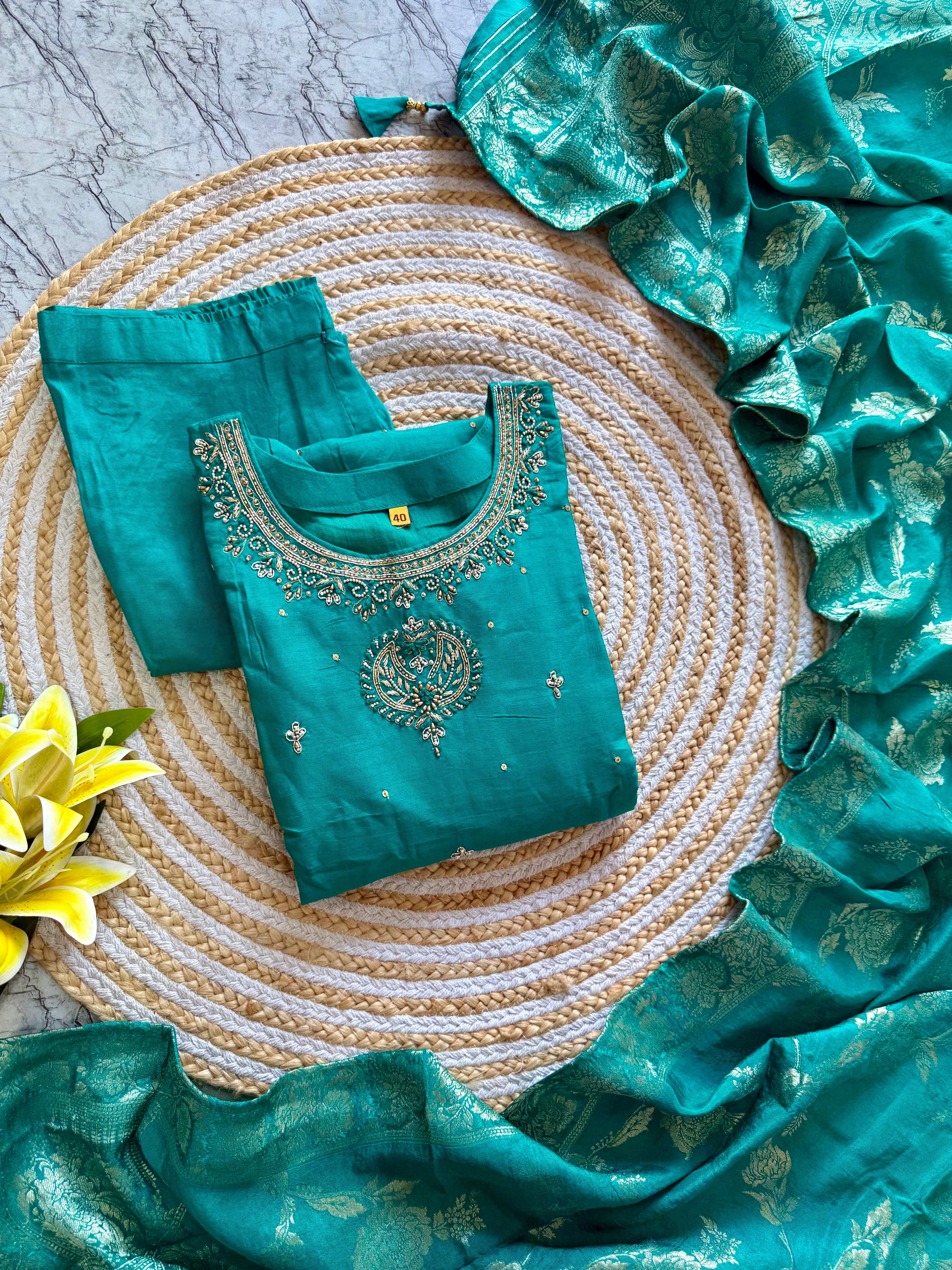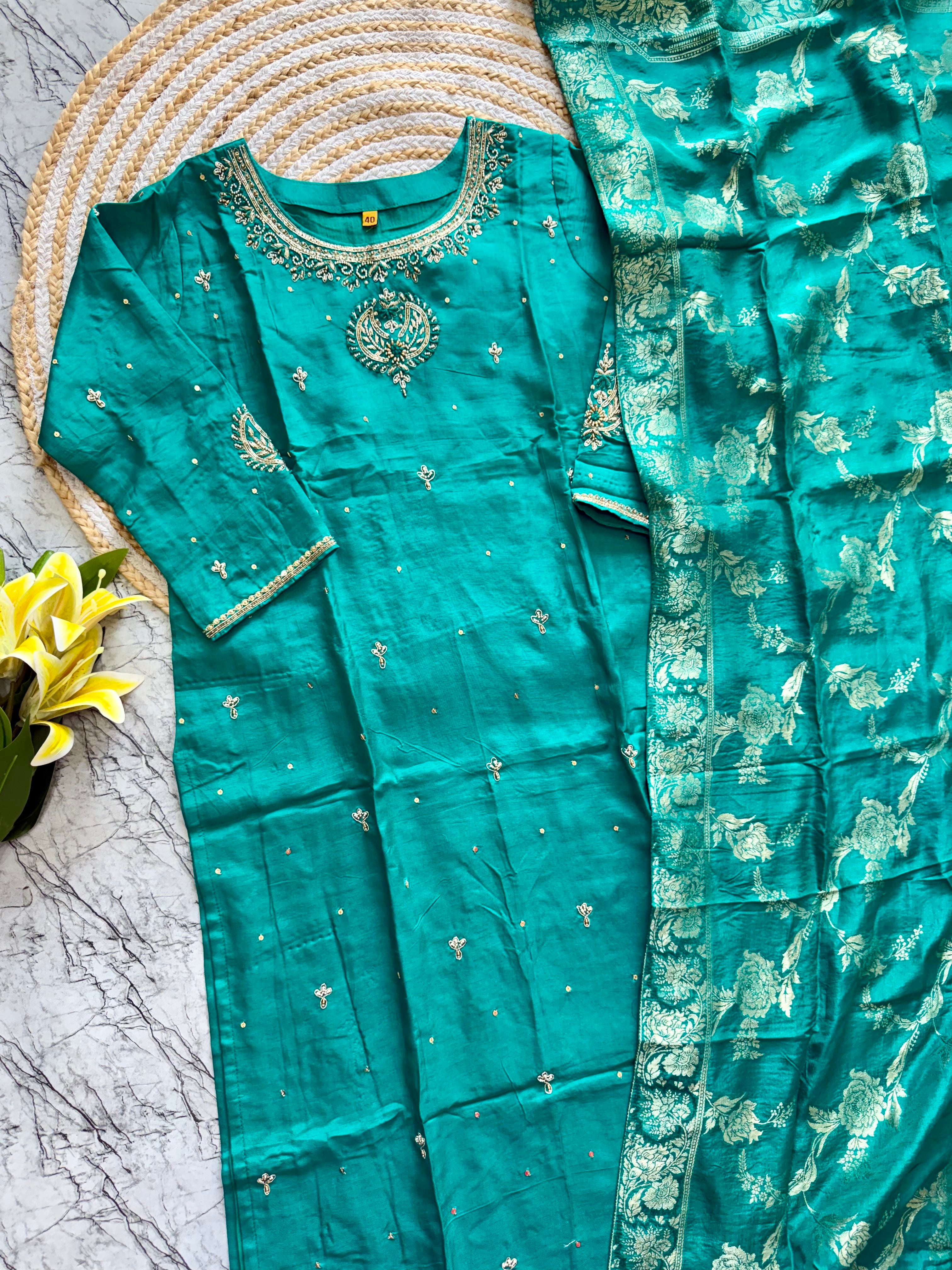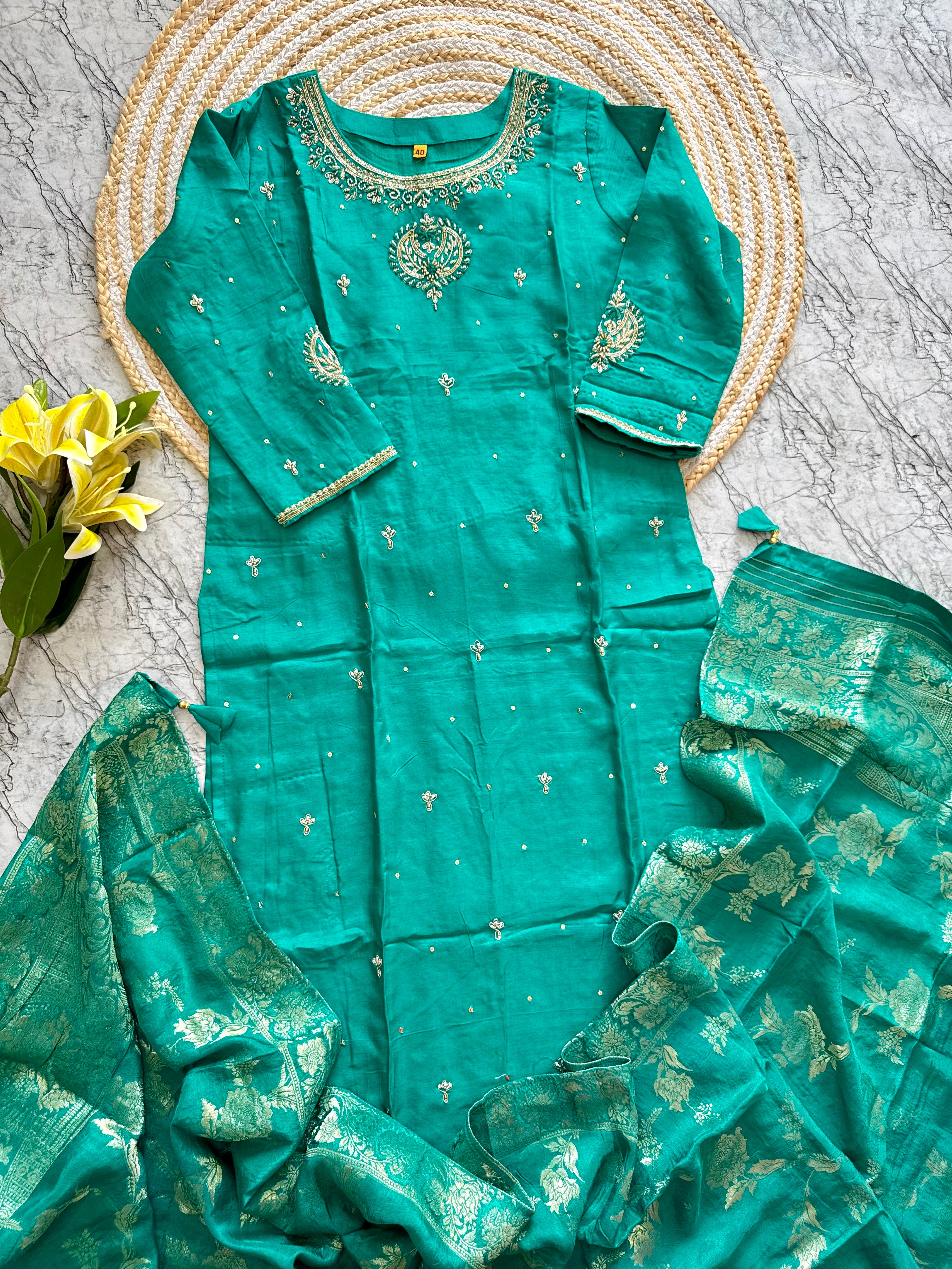 Premium range dola silk set with Handwork on the yoke, sleeves with a beautiful Banarasi dupatta and a plane dola silk bottom