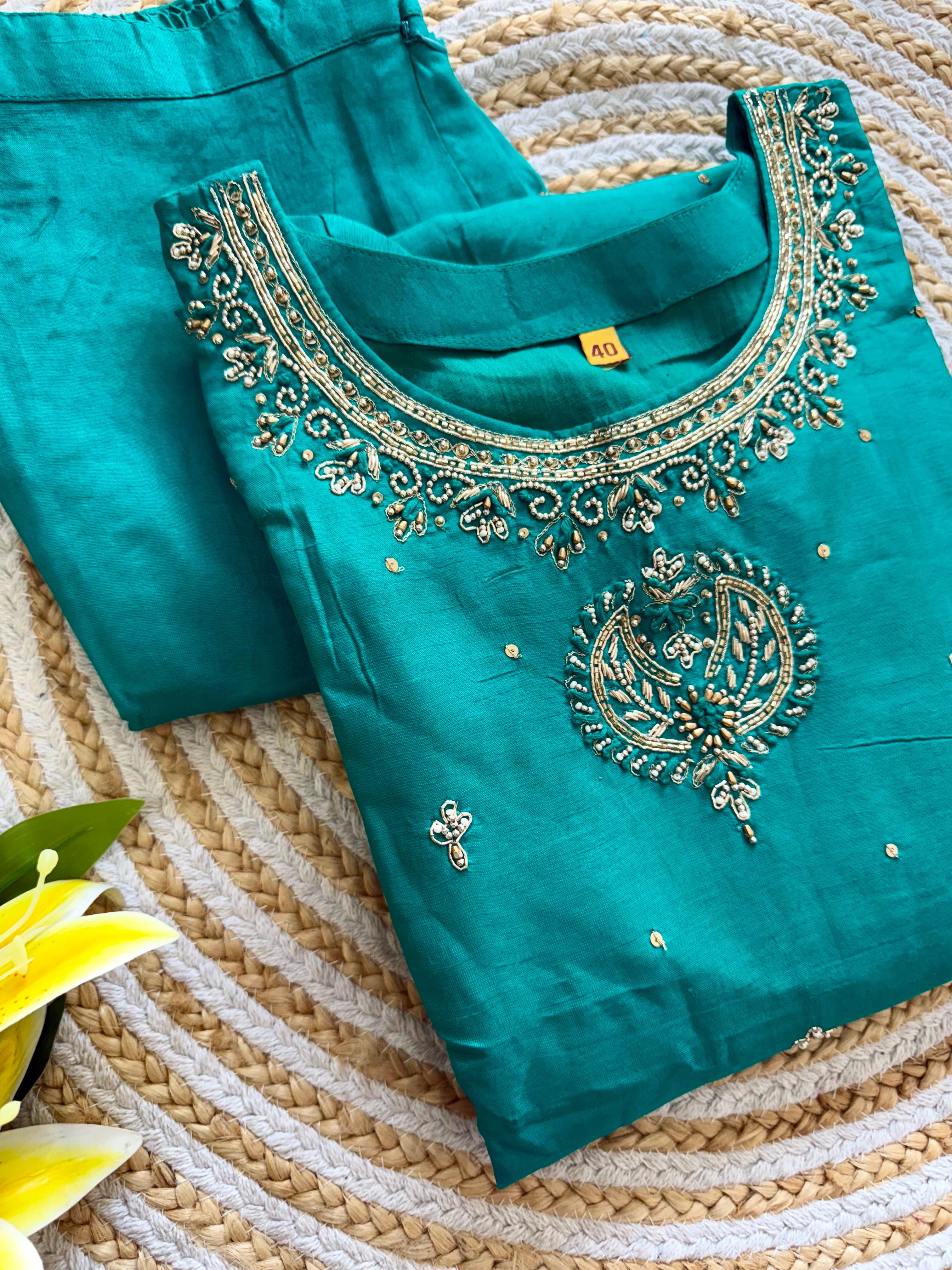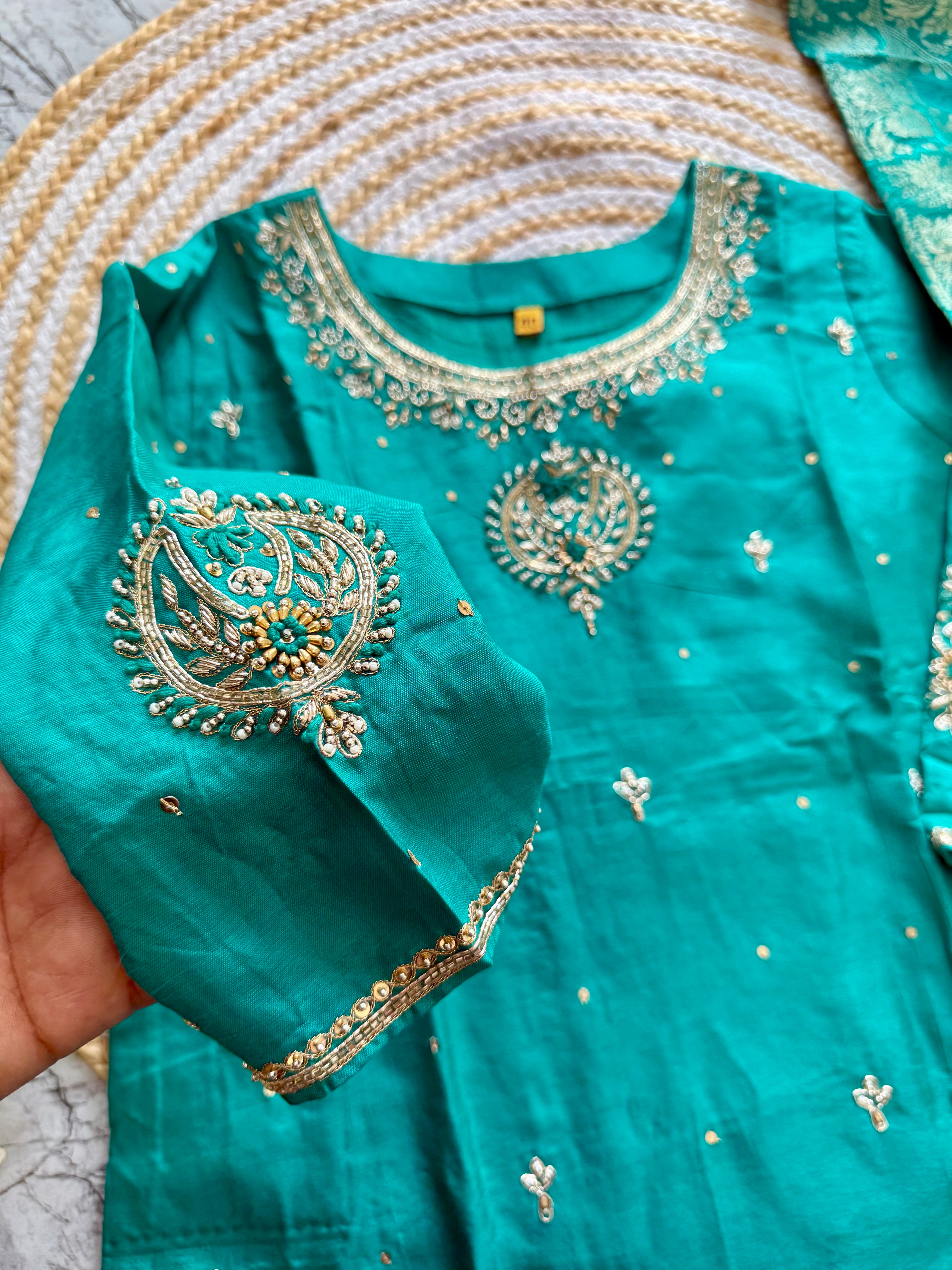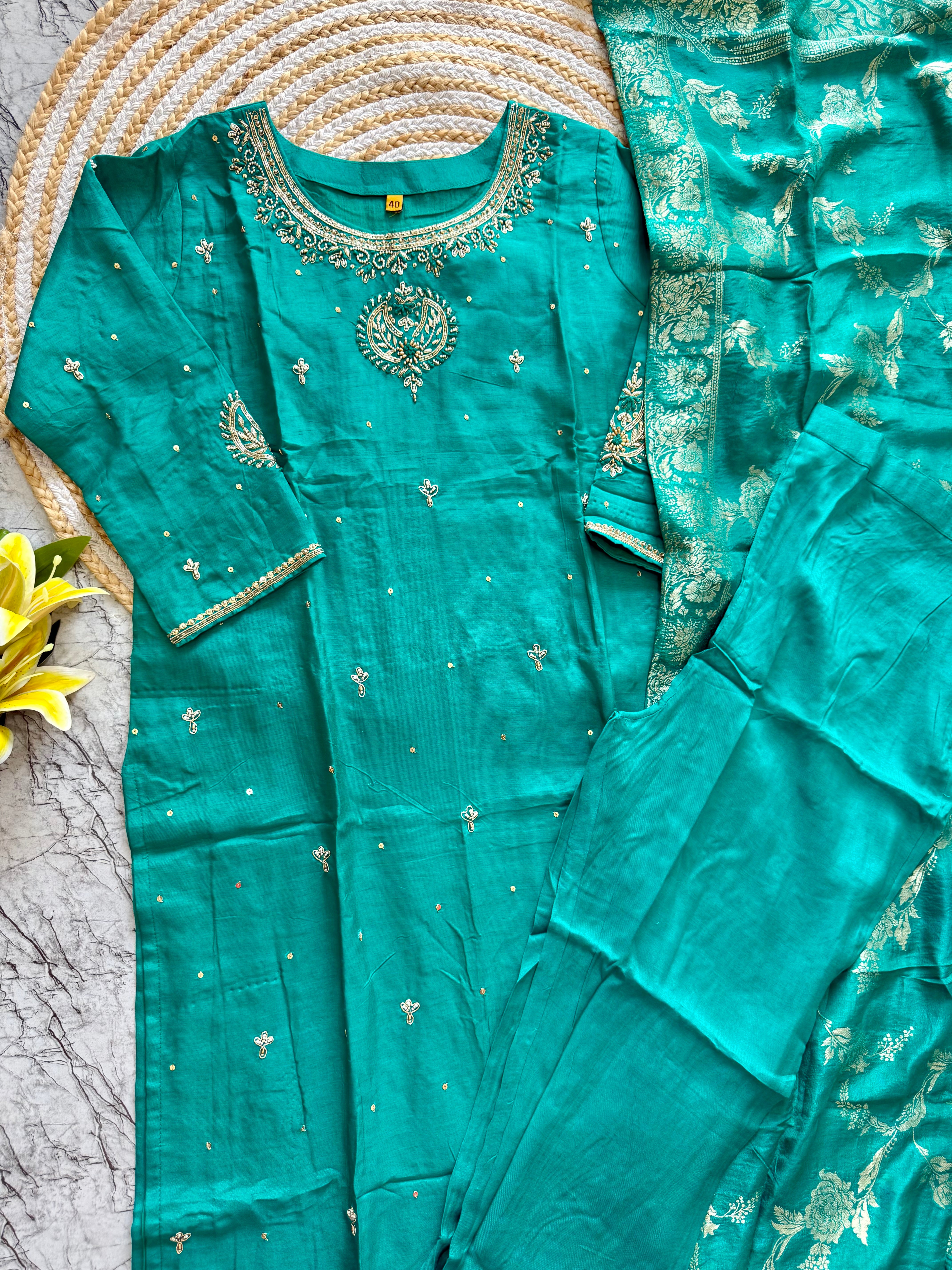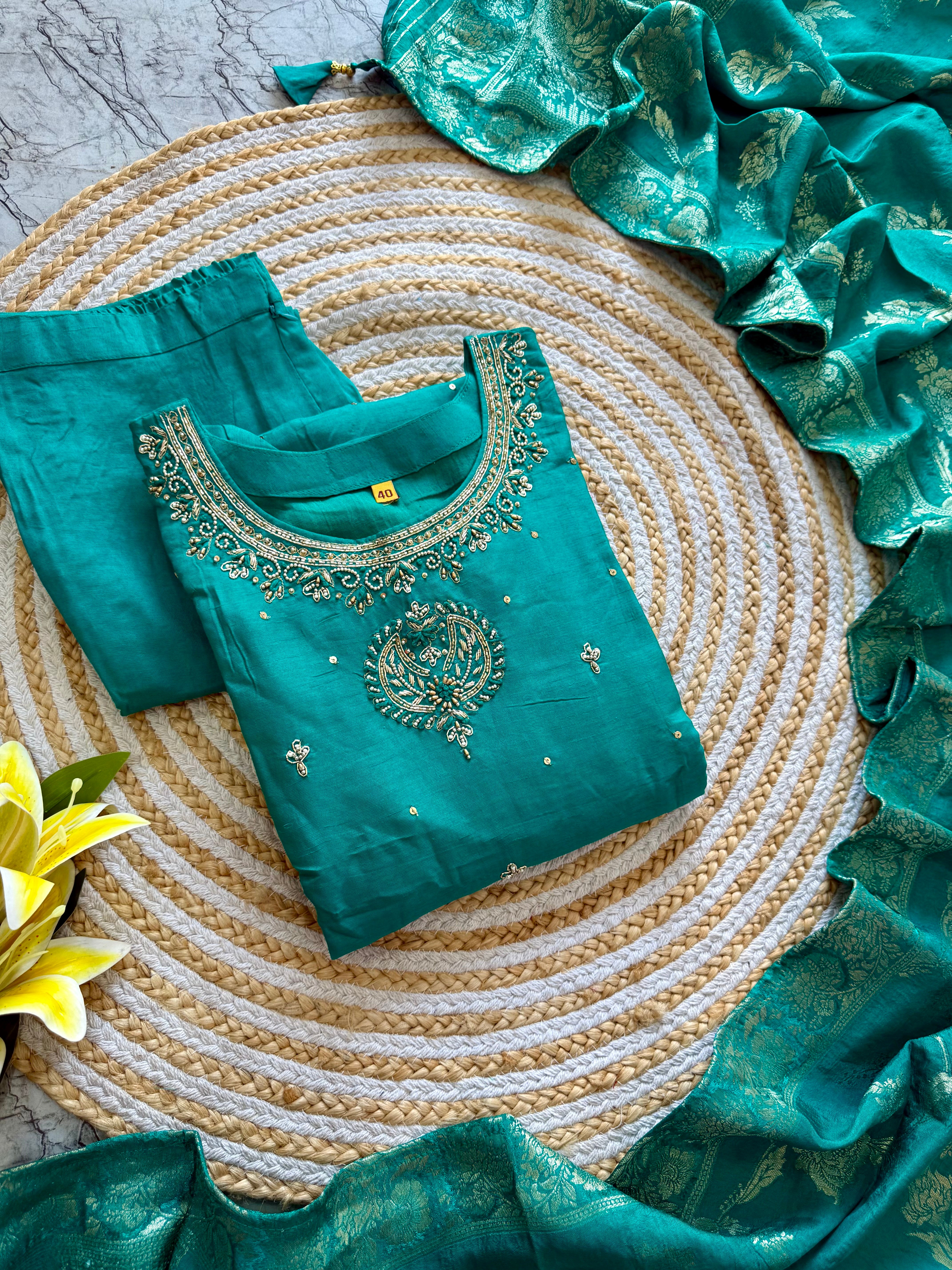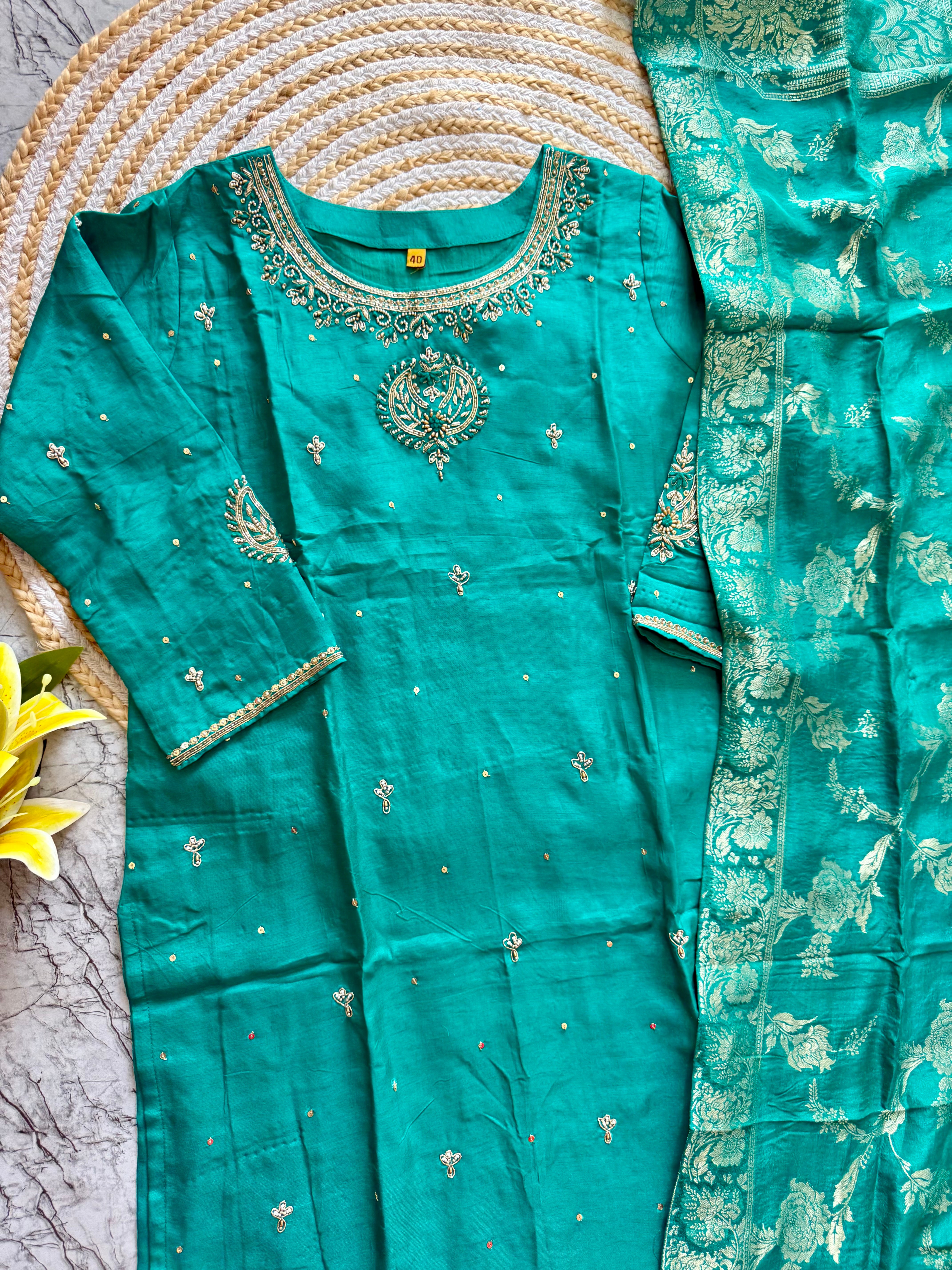 Premium range dola silk set with Handwork on the yoke, sleeves with a beautiful Banarasi dupatta and a plane dola silk bottom