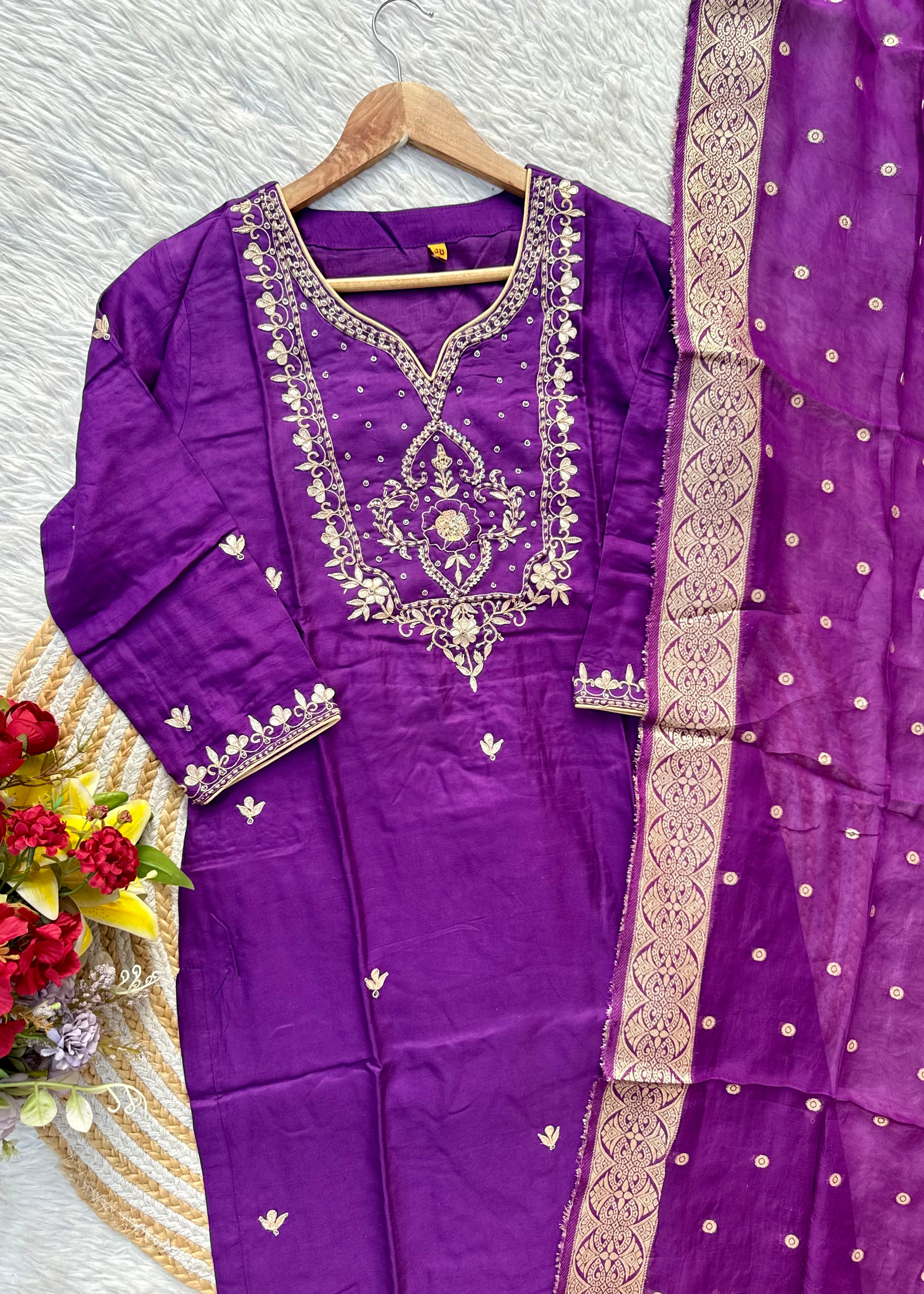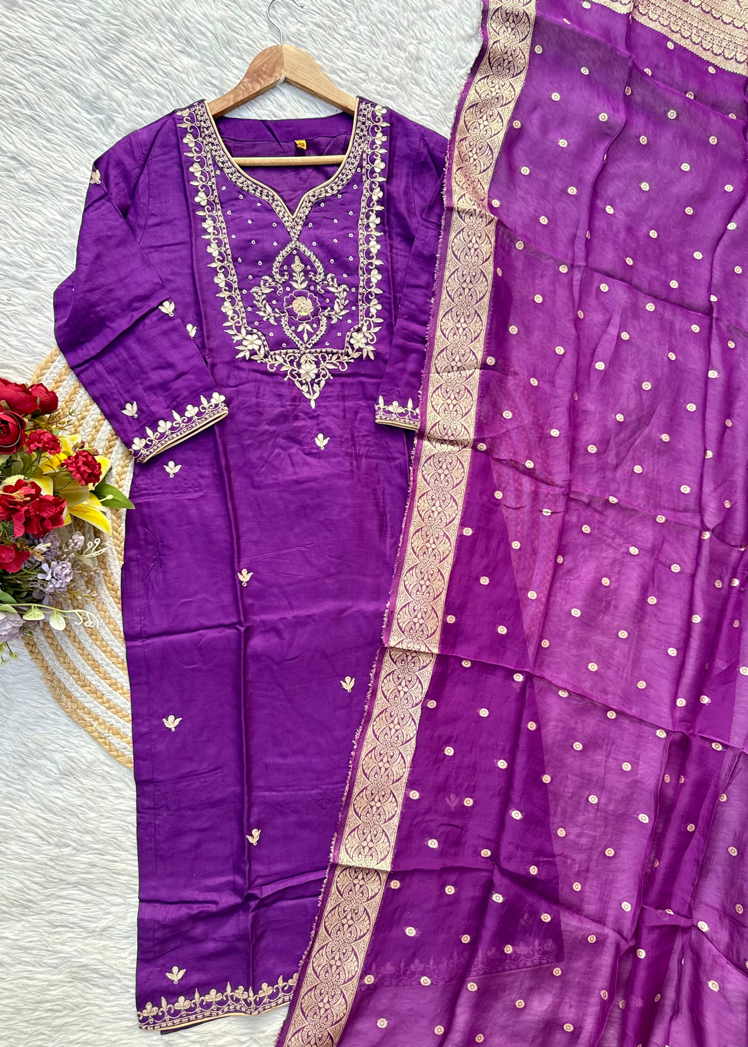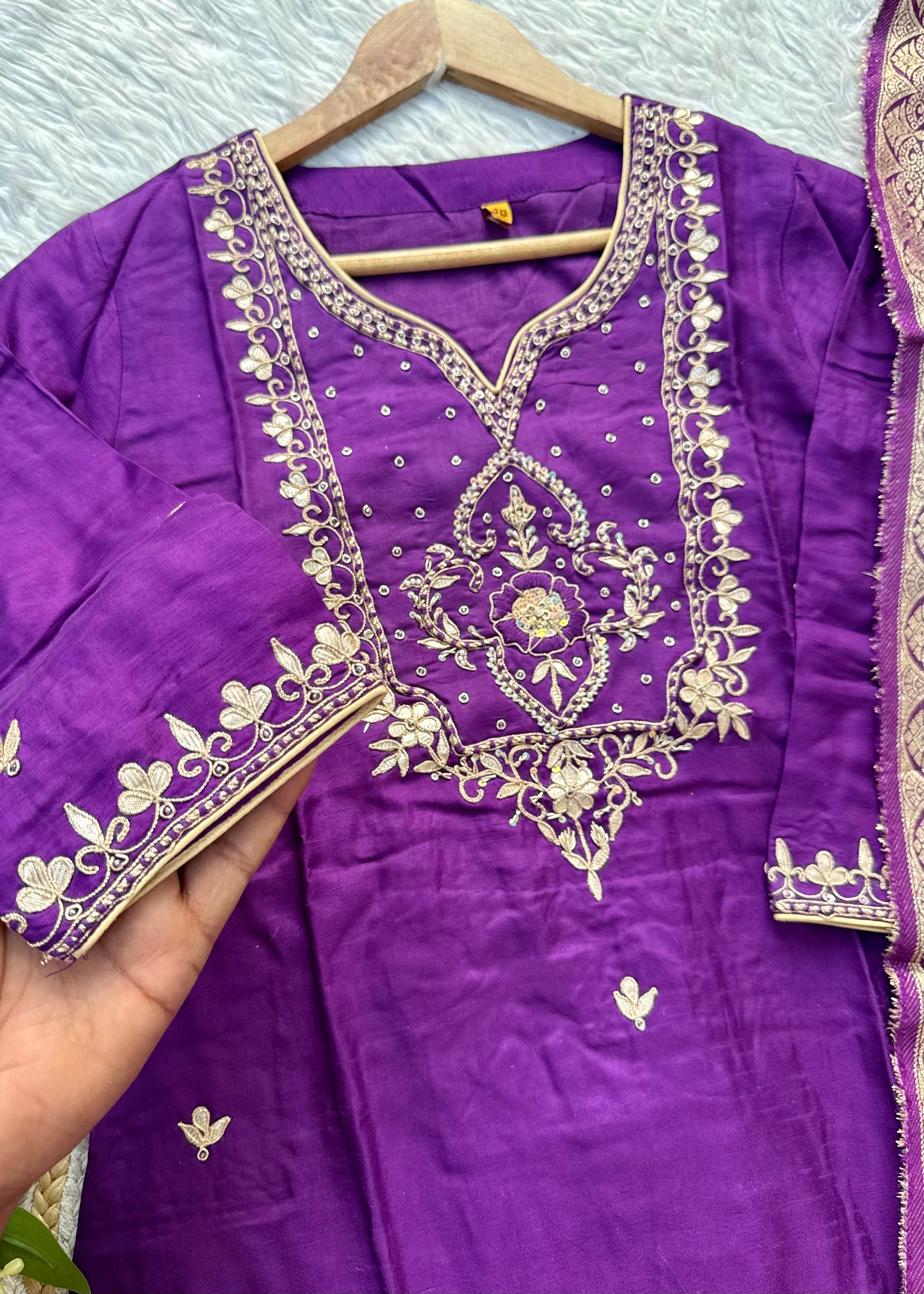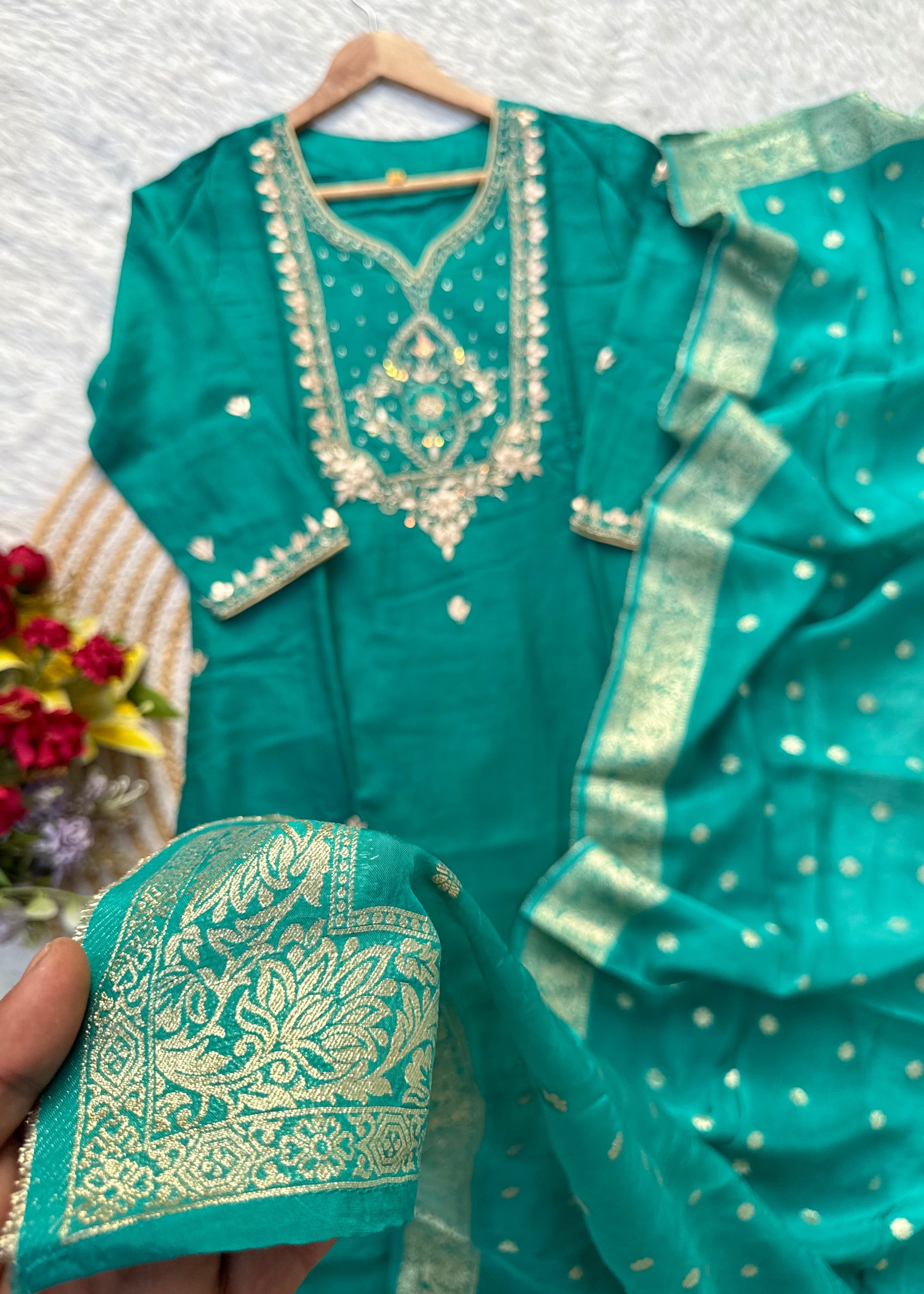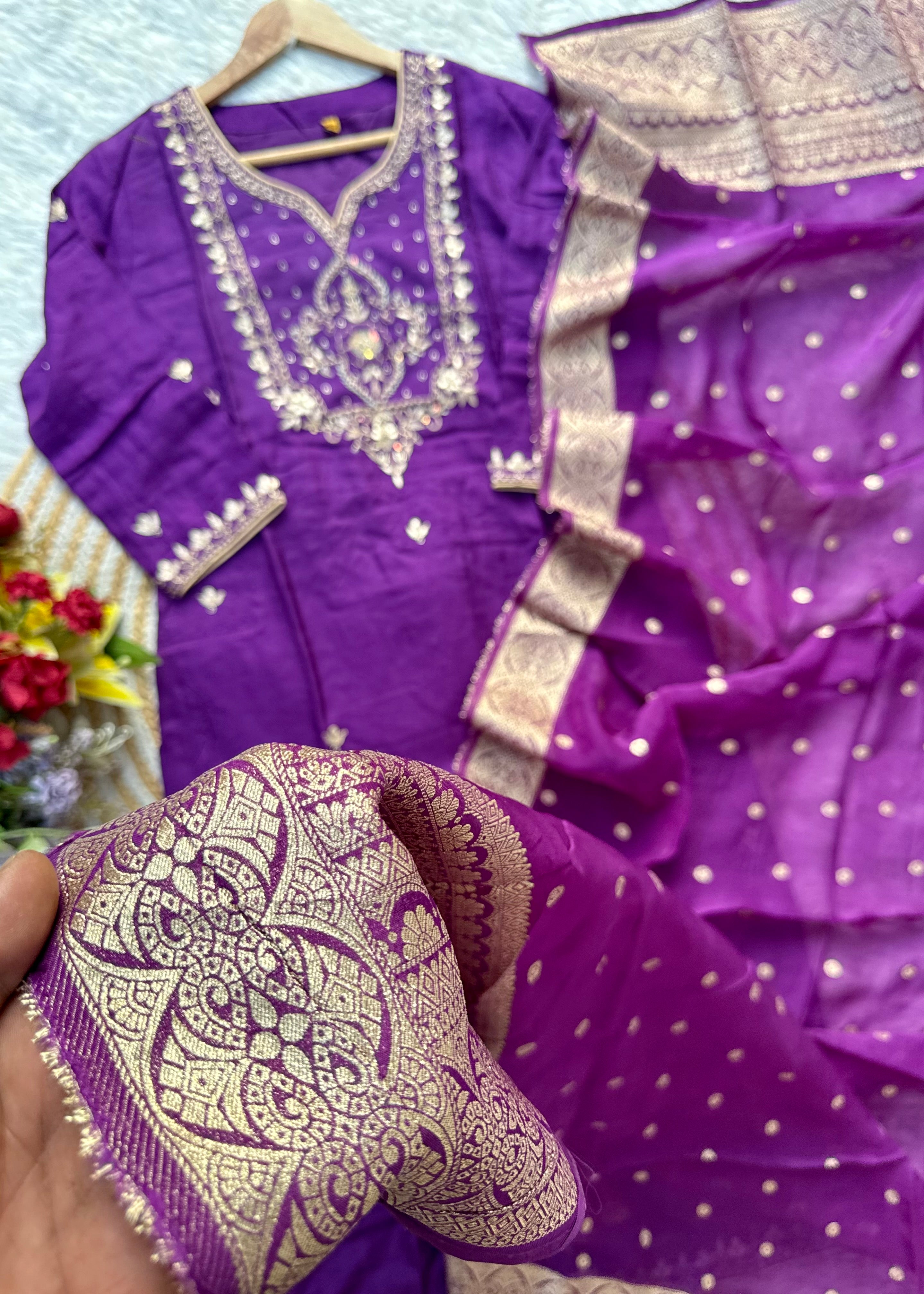Premium range dola silk set with Handwork on the yoke, sleeves & Daman with a beautiful woven organza dupatta and a plane dola silk bottom