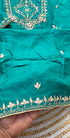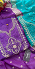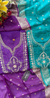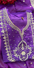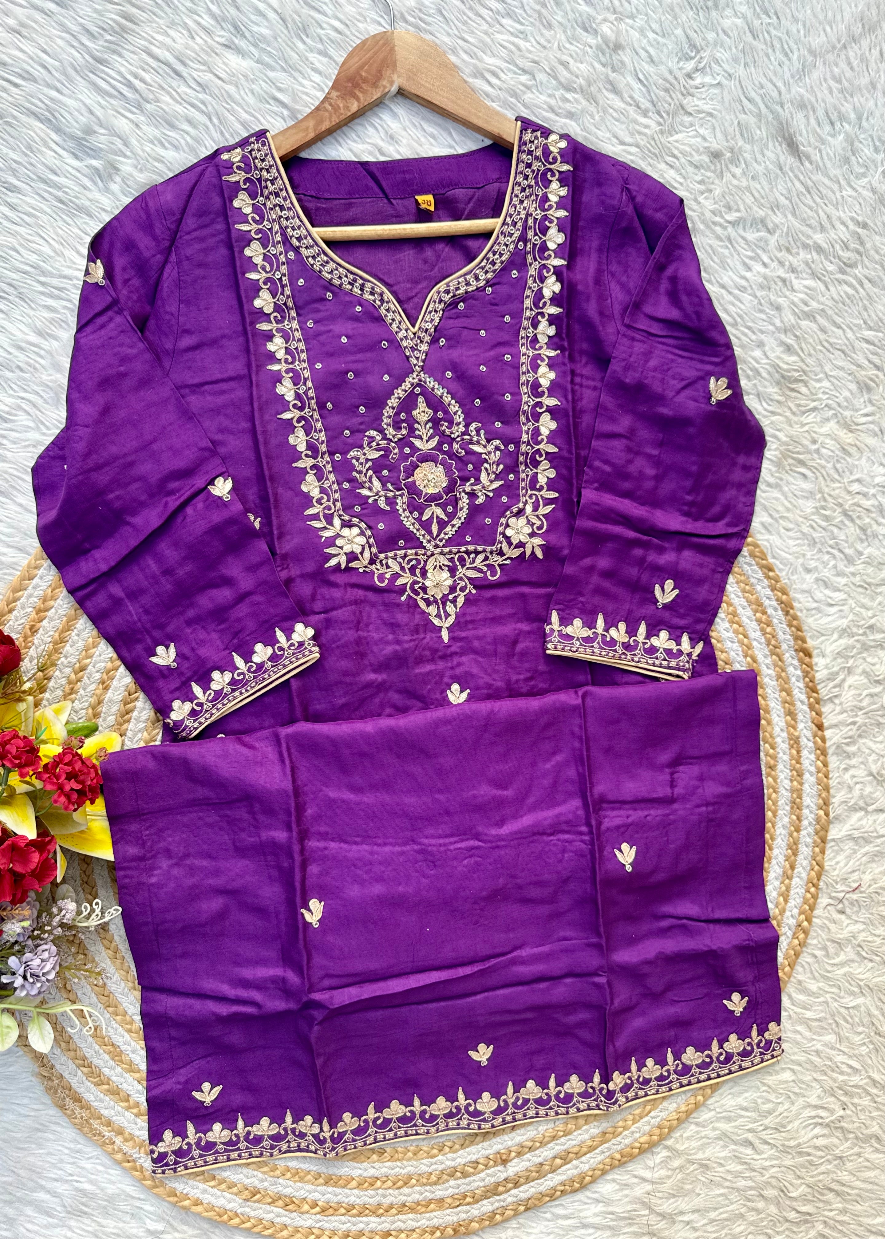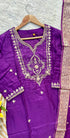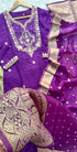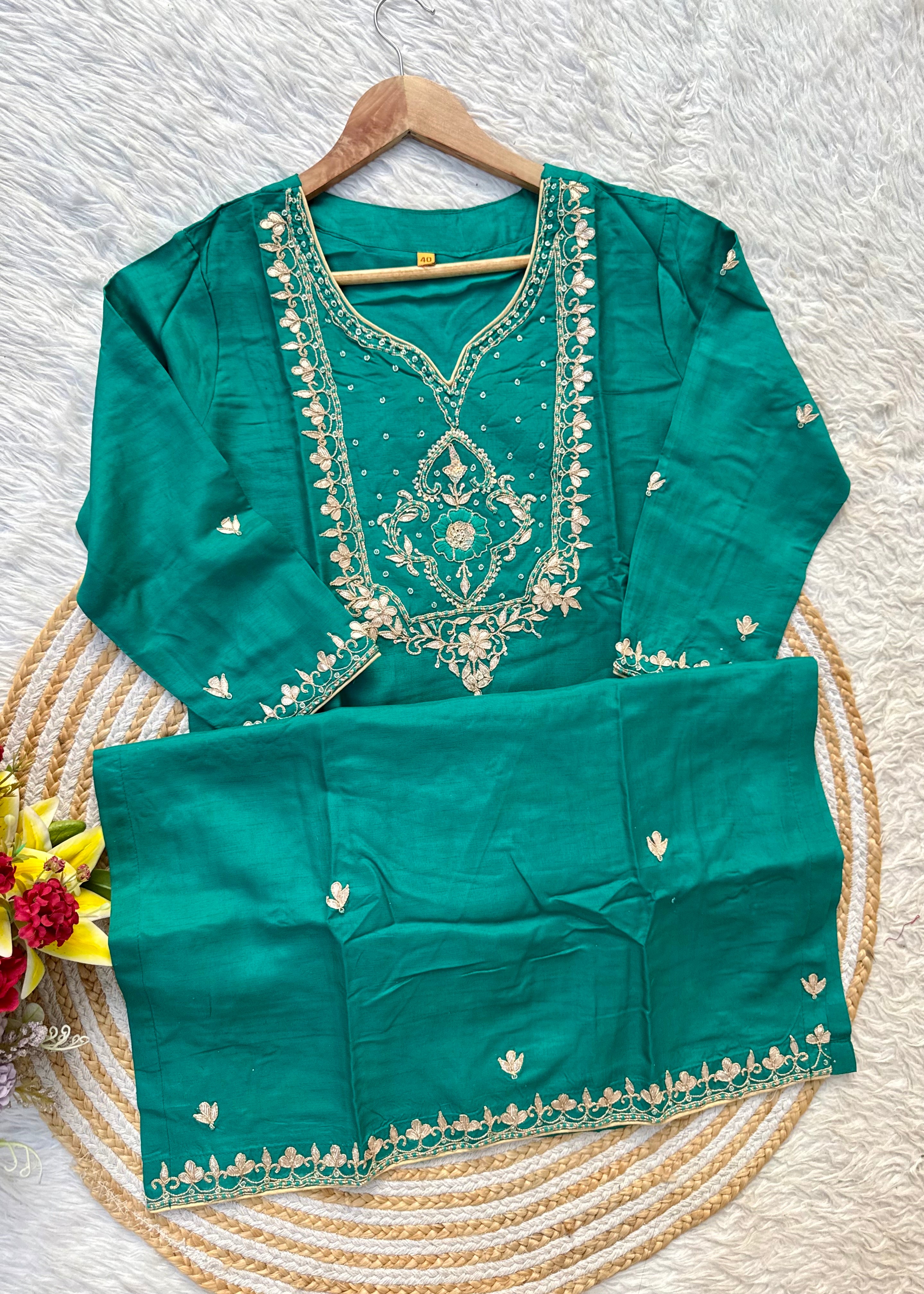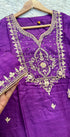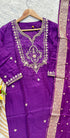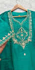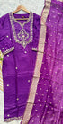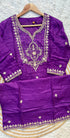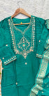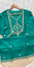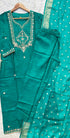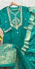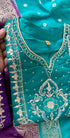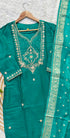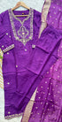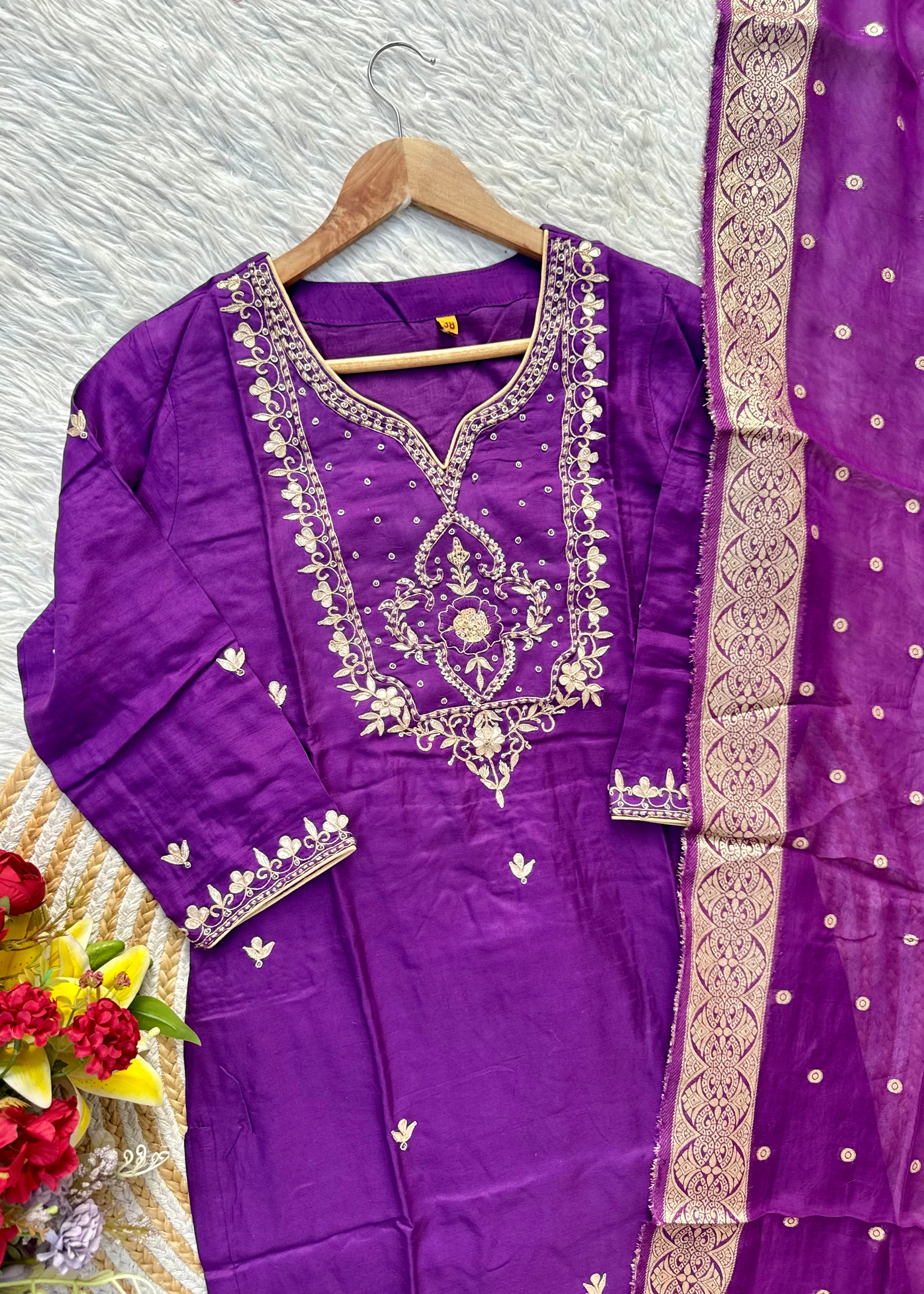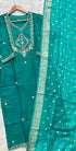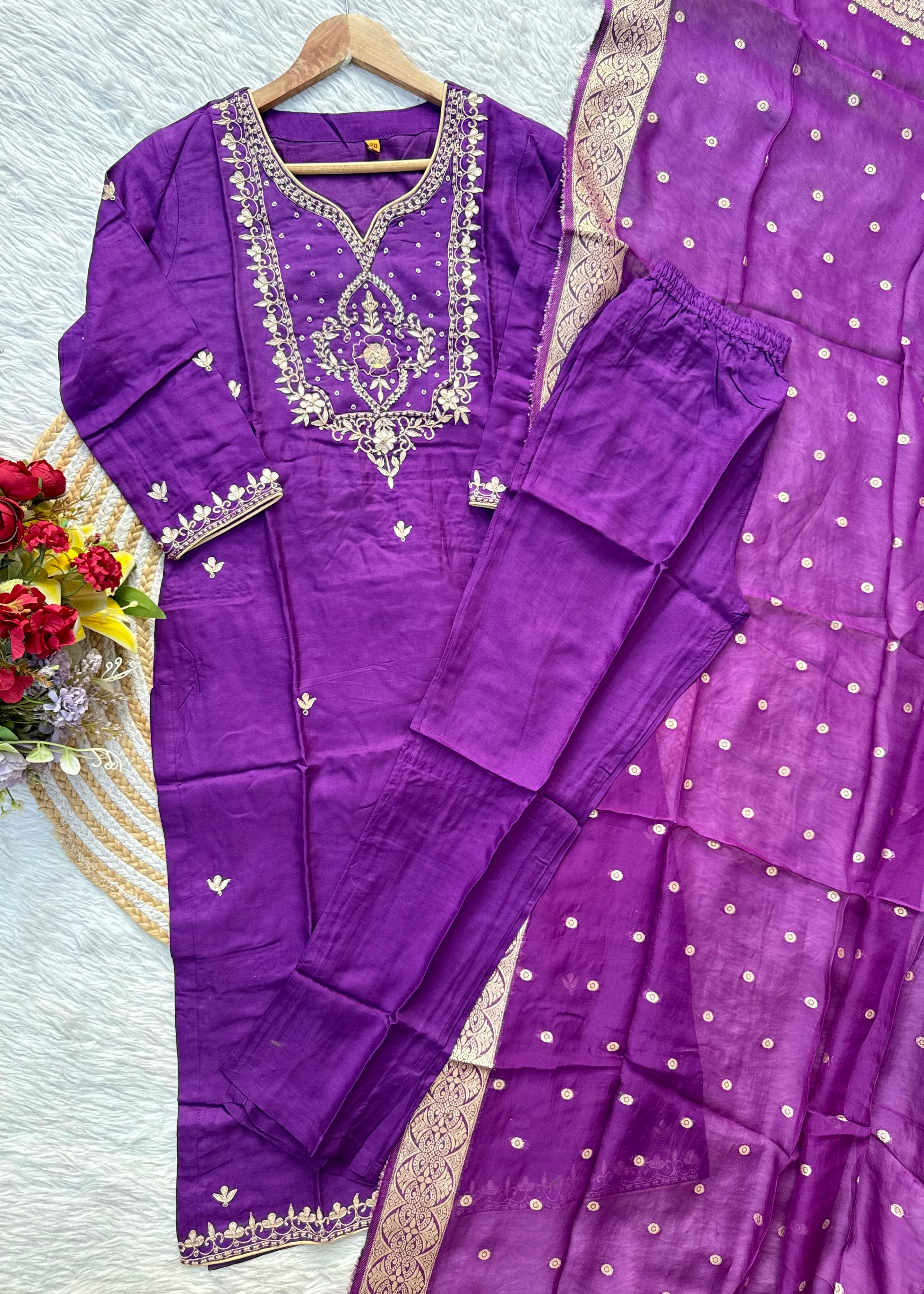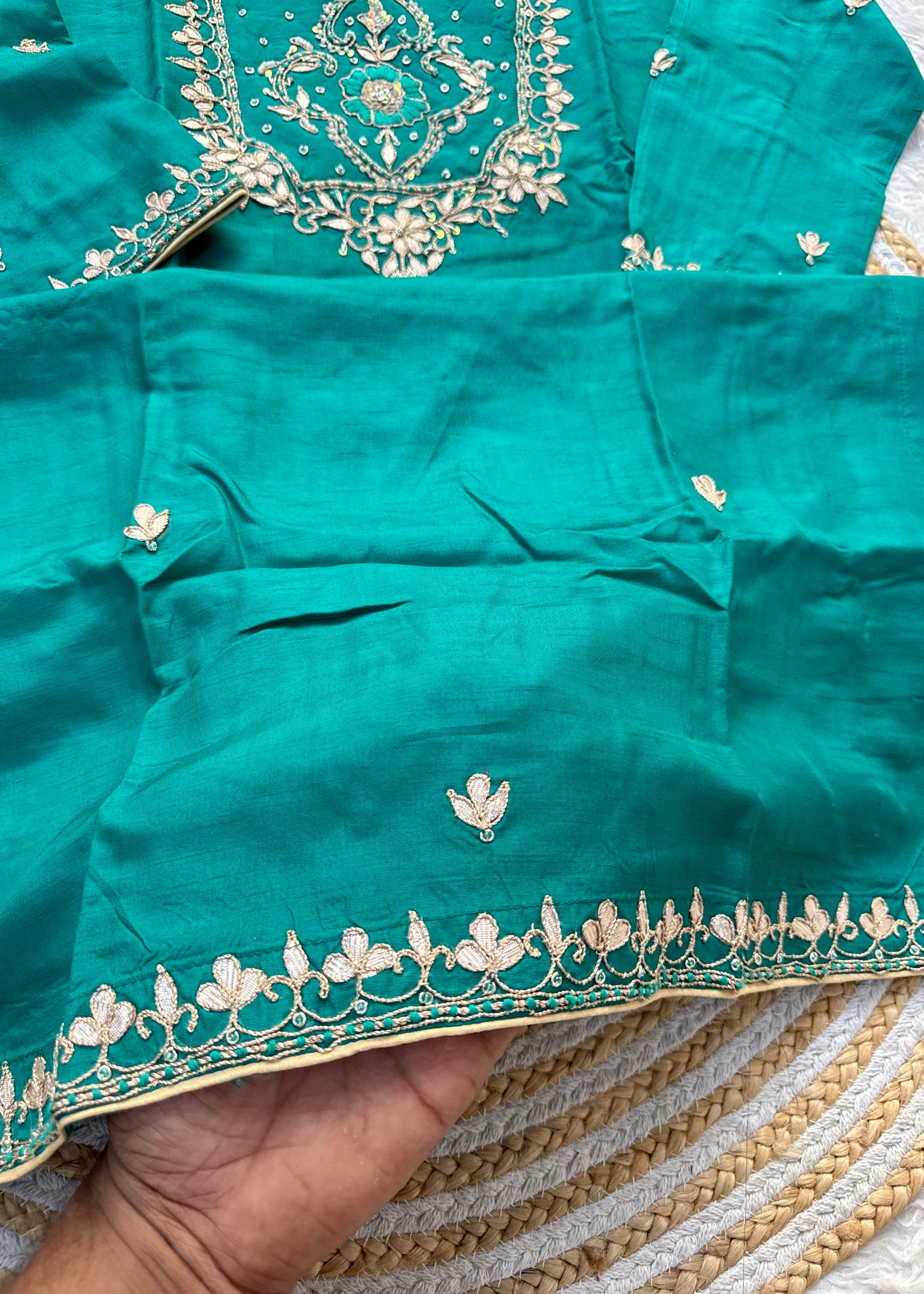 Premium range dola silk set with Handwork on the yoke, sleeves & Daman with a beautiful woven organza dupatta and a plane dola silk bottom