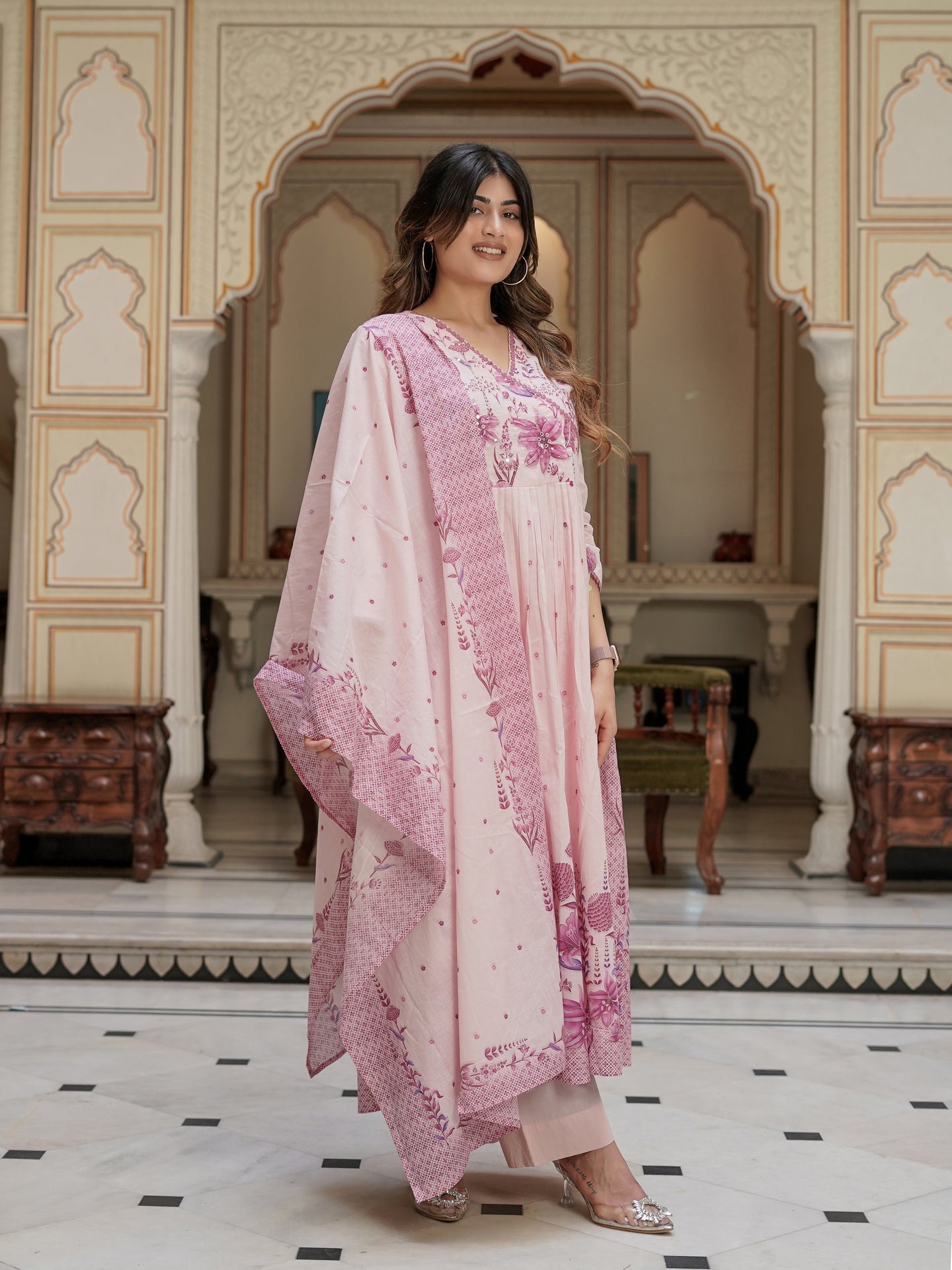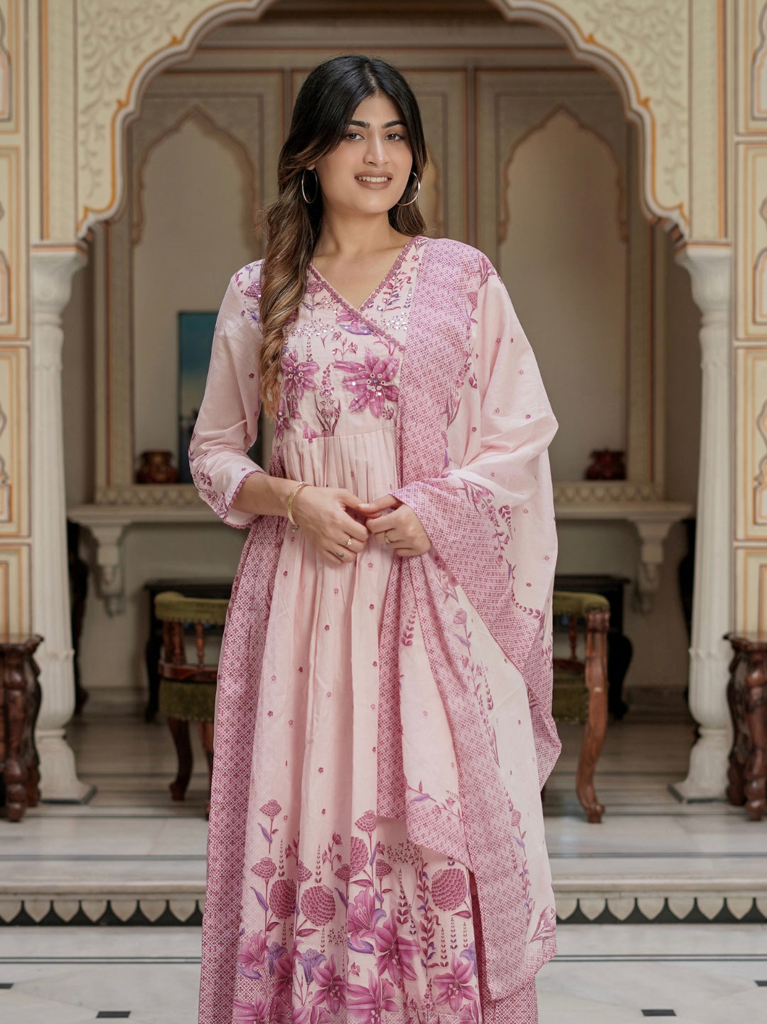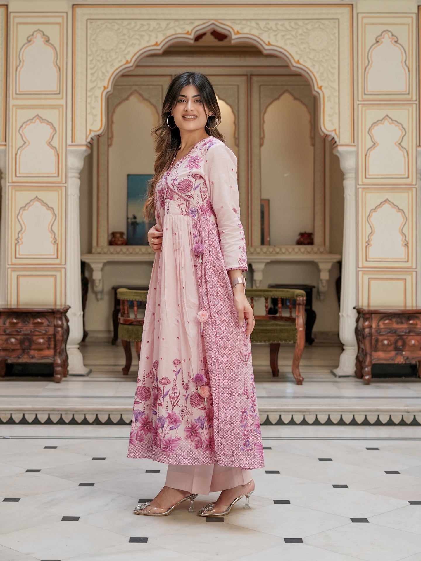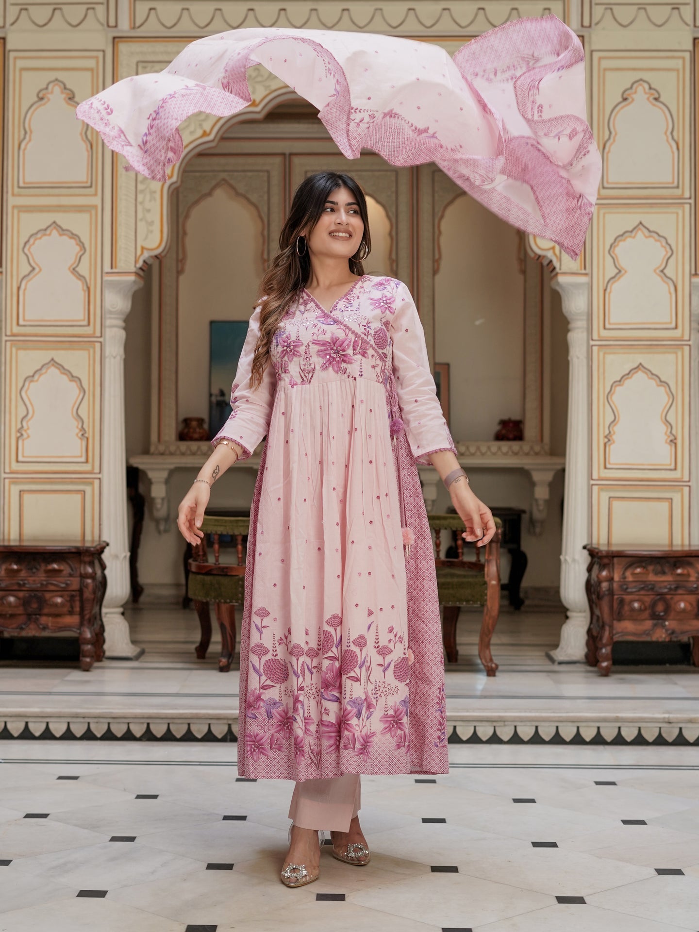 Beautiful Mul cotton printed anarkali kurti with handwork detailing on the neck line of the kurta with a printed work front and back side all over the kurta with a beautiful printed cotton dupatta and a plan cotton bottom