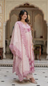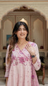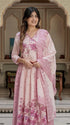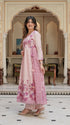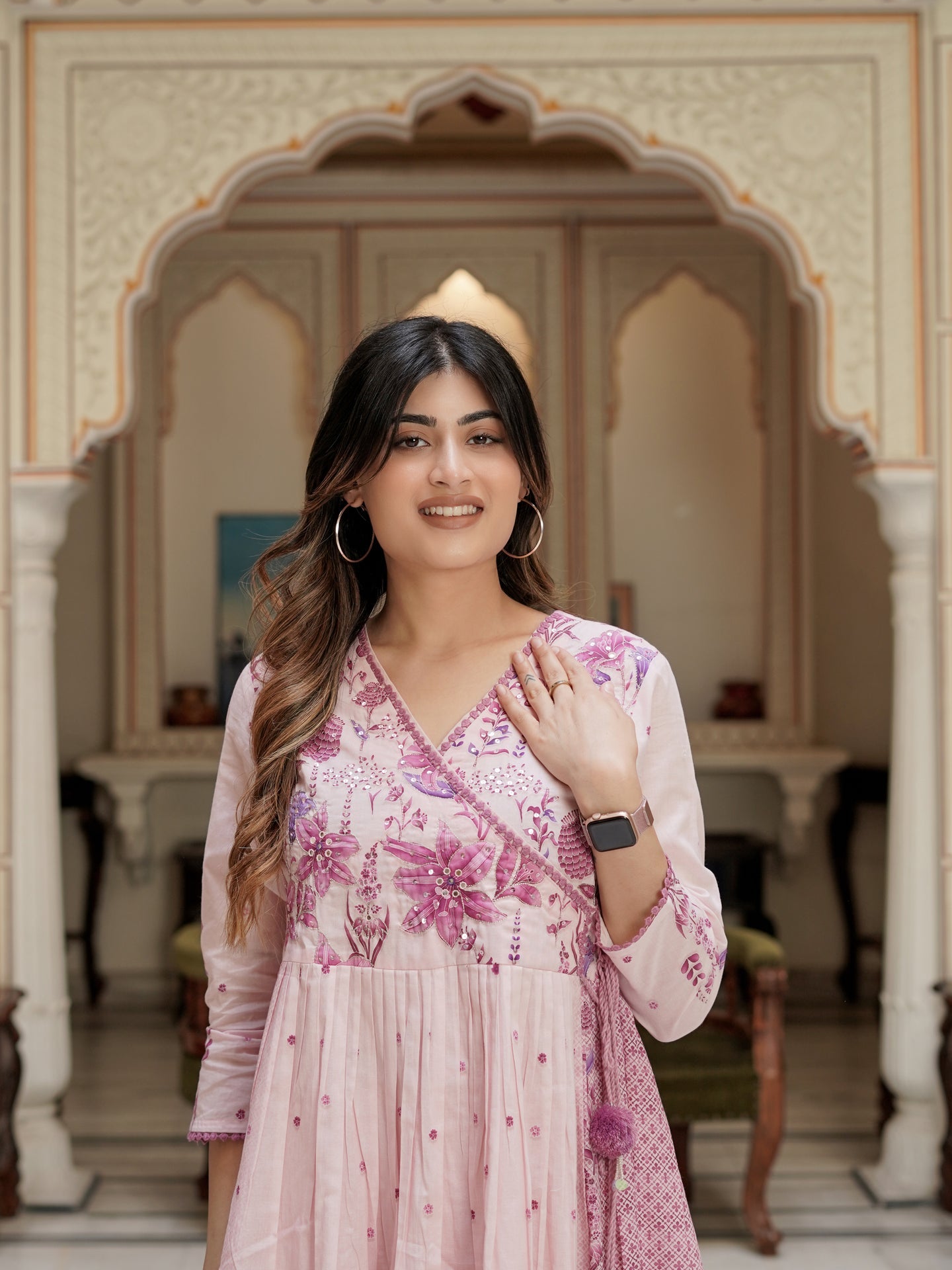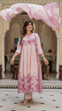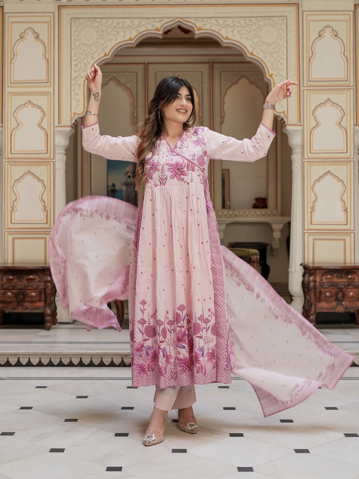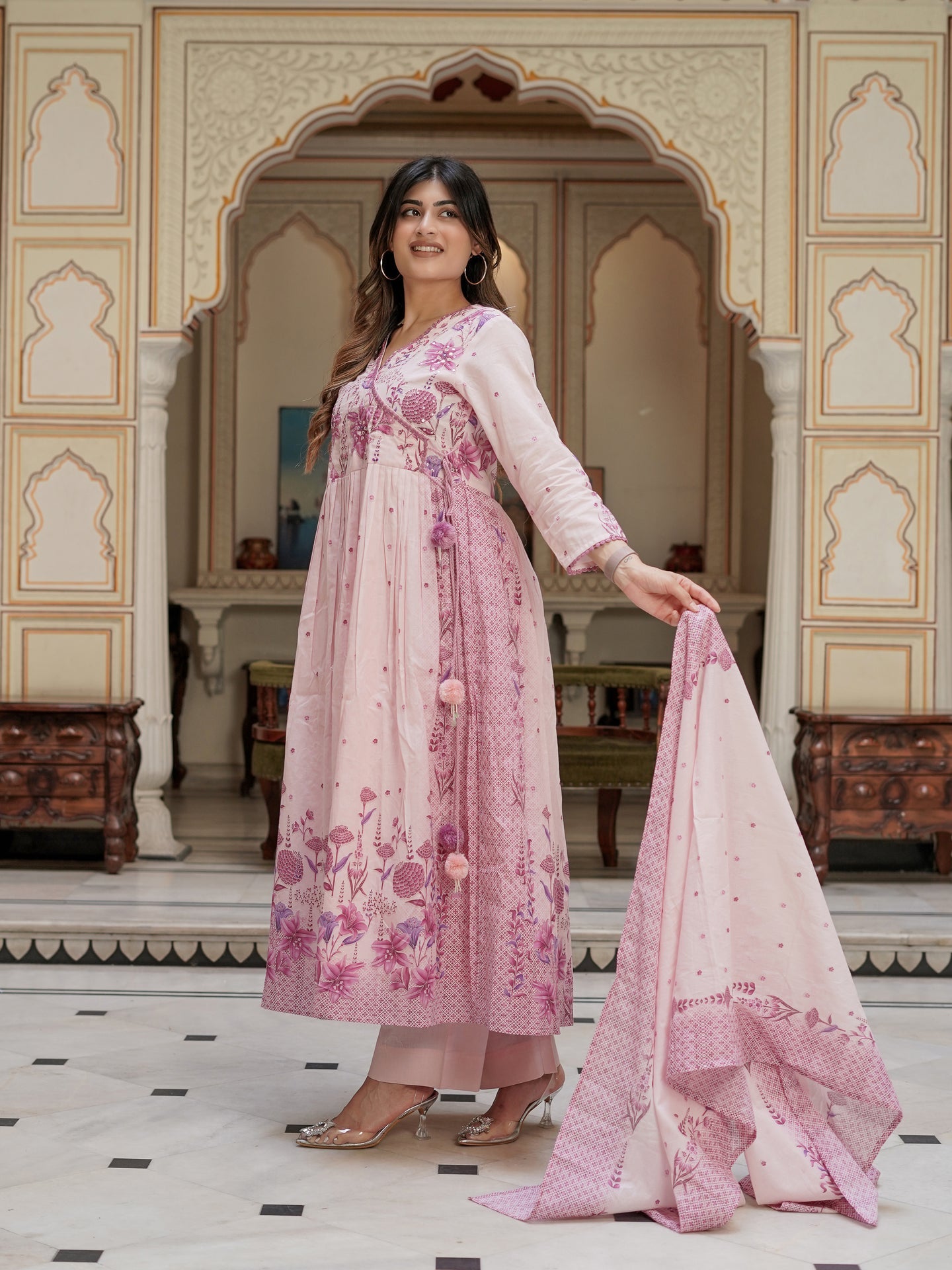 Beautiful Mul cotton printed anarkali kurti with handwork detailing on the neck line of the kurta with a printed work front and back side all over the kurta with a beautiful printed cotton dupatta and a plan cotton bottom
