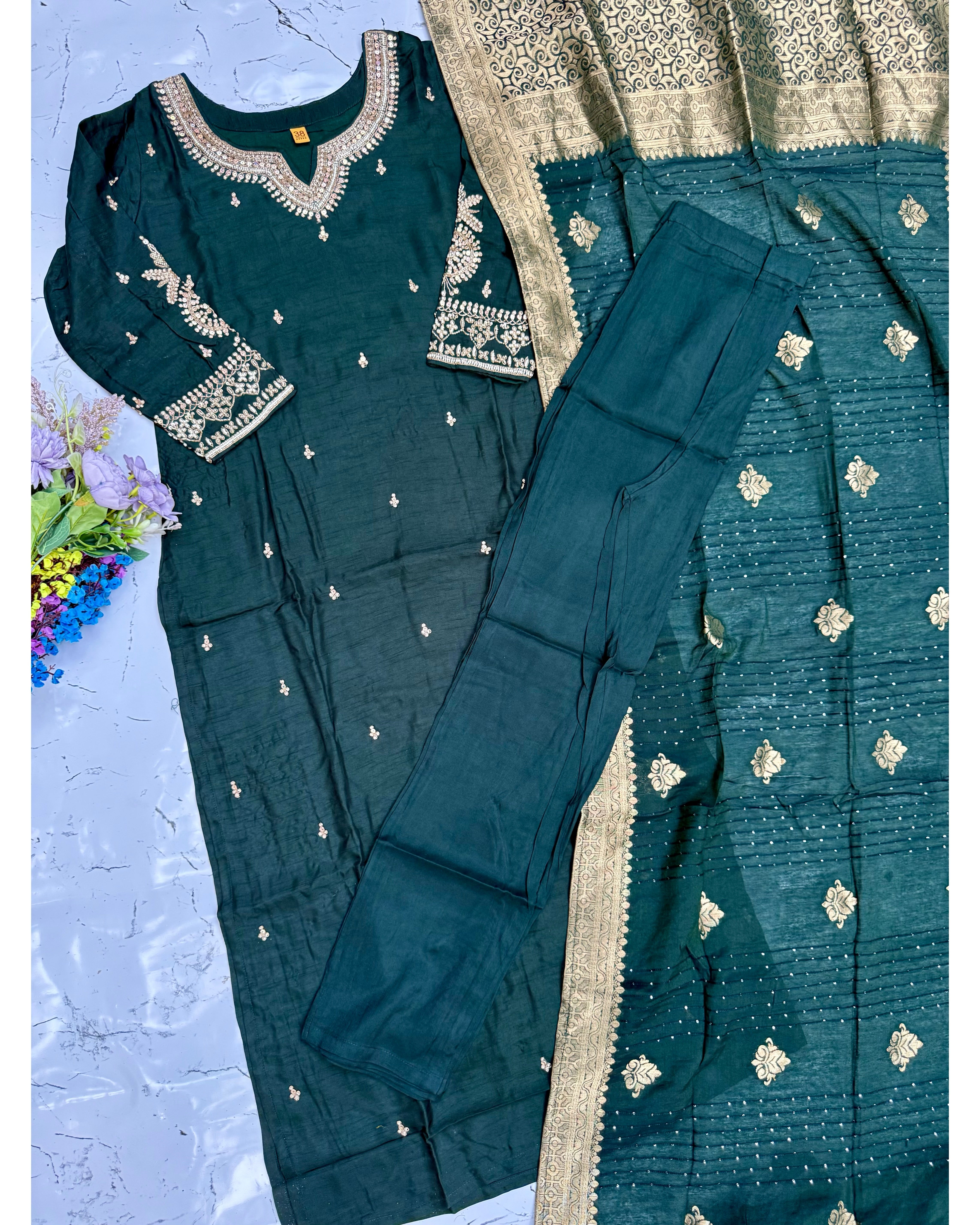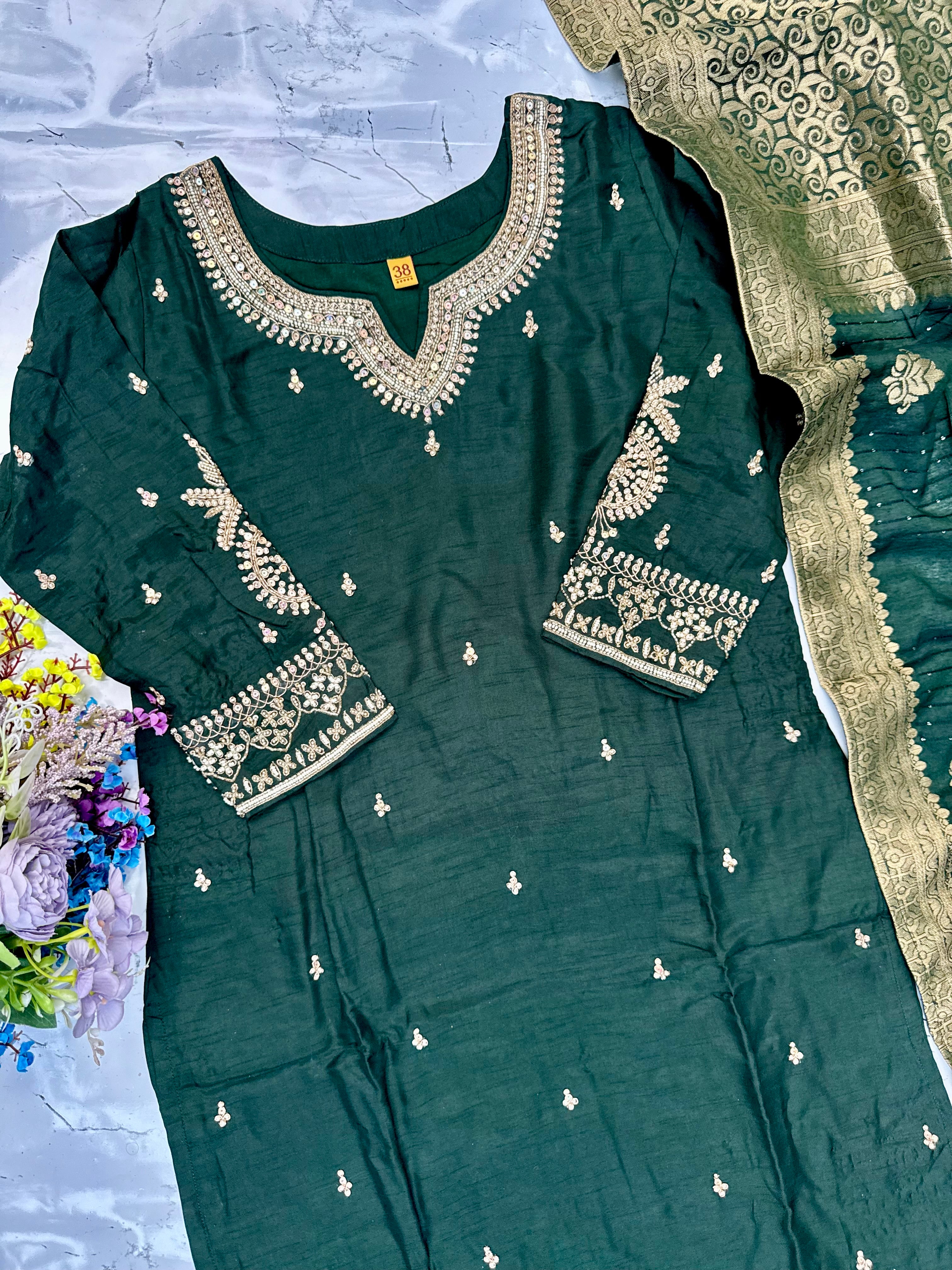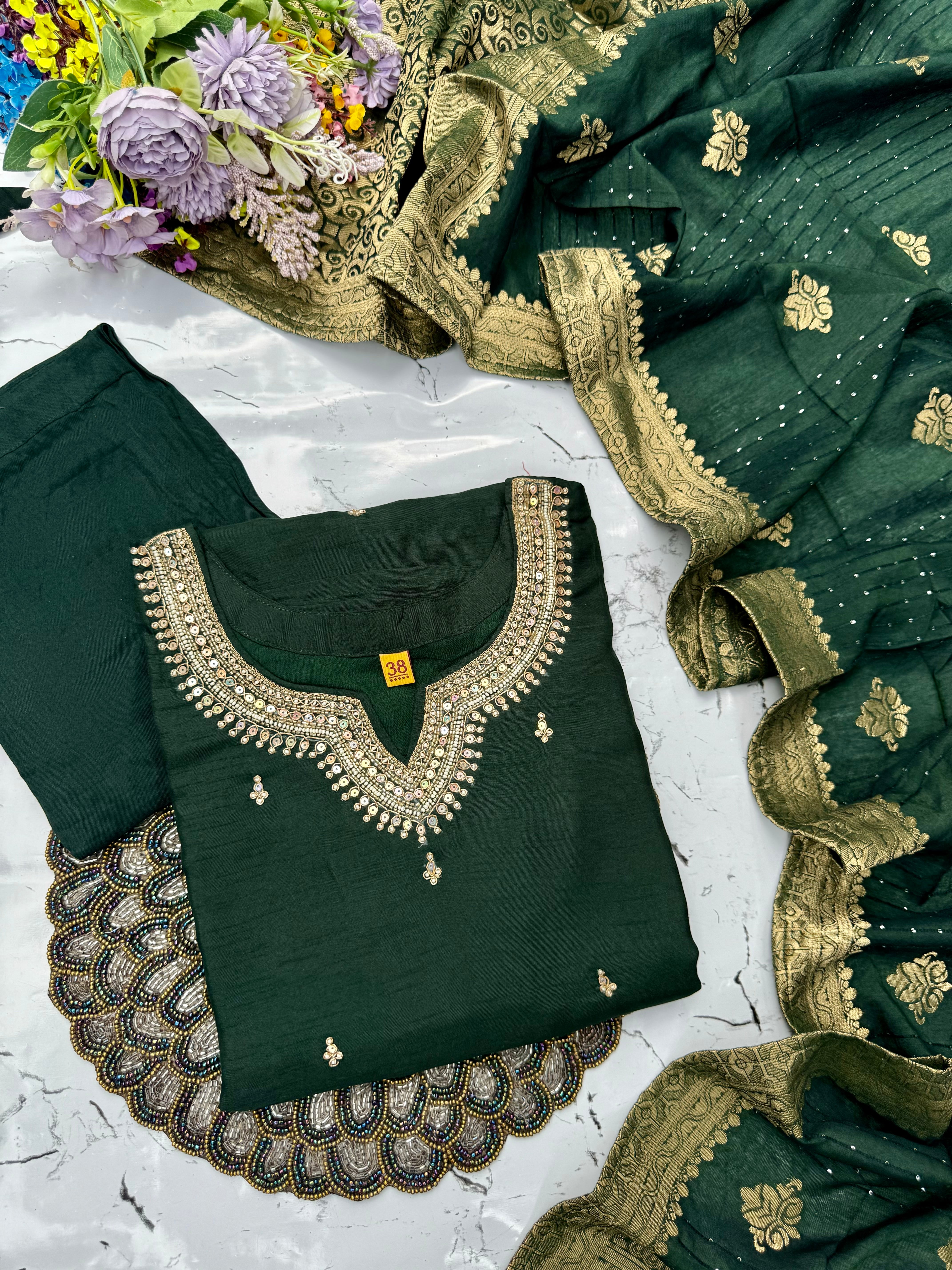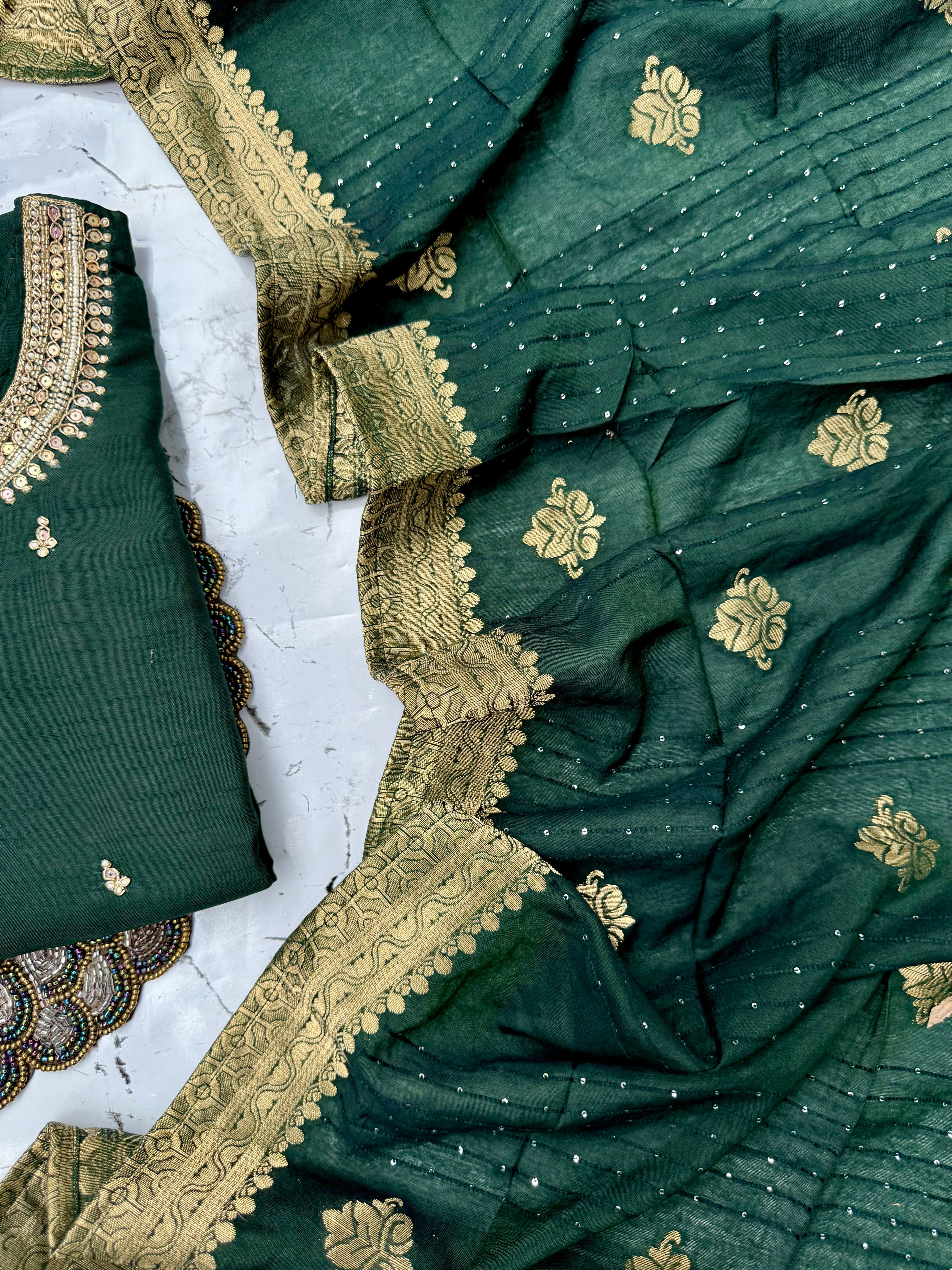Premium range dola silk set with heavy Handwork on the yoke & sleeve with a beautiful woven Banarasi dupatta and a plane dola silk bottom
