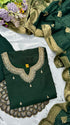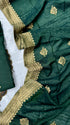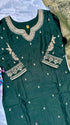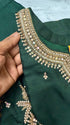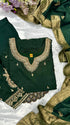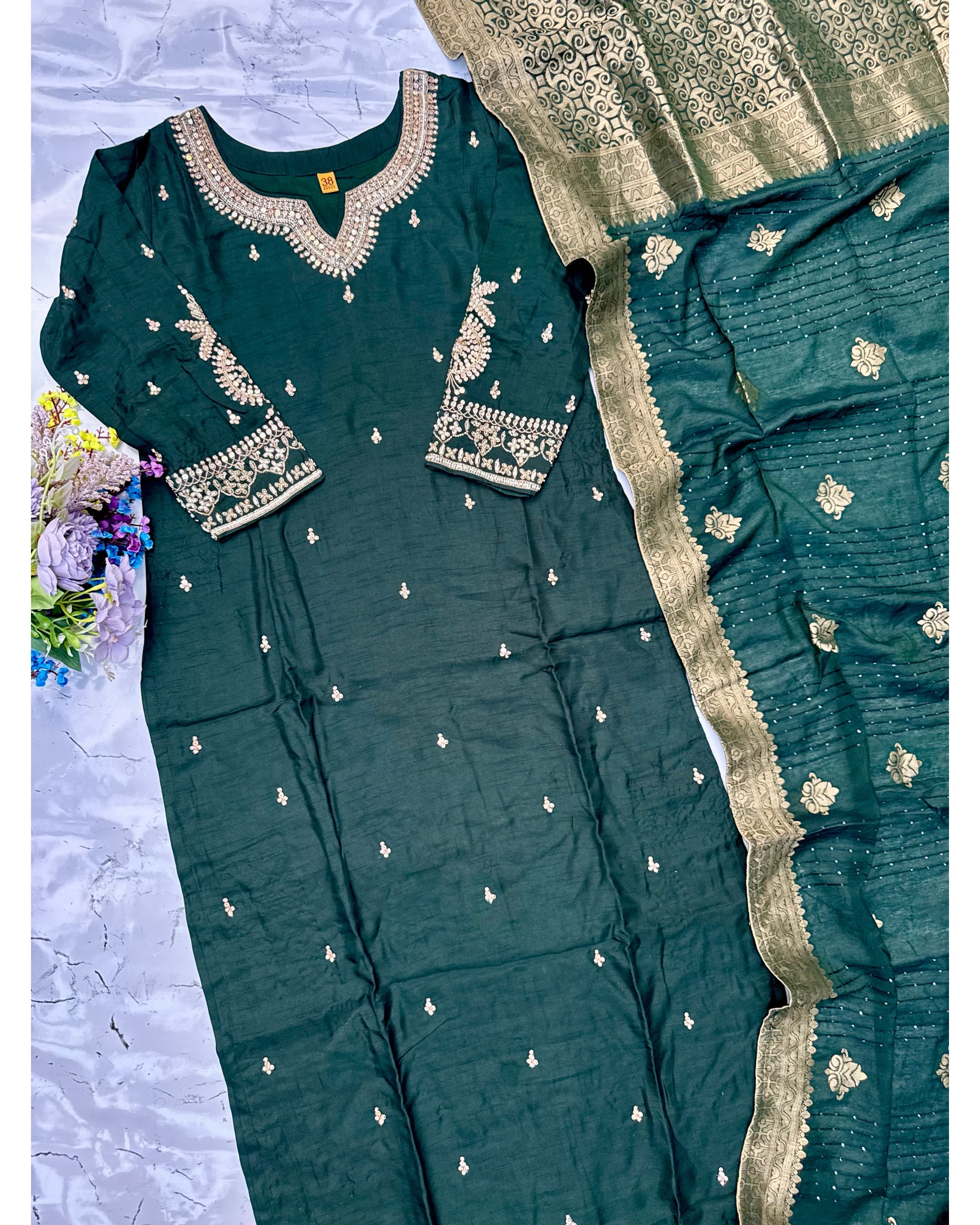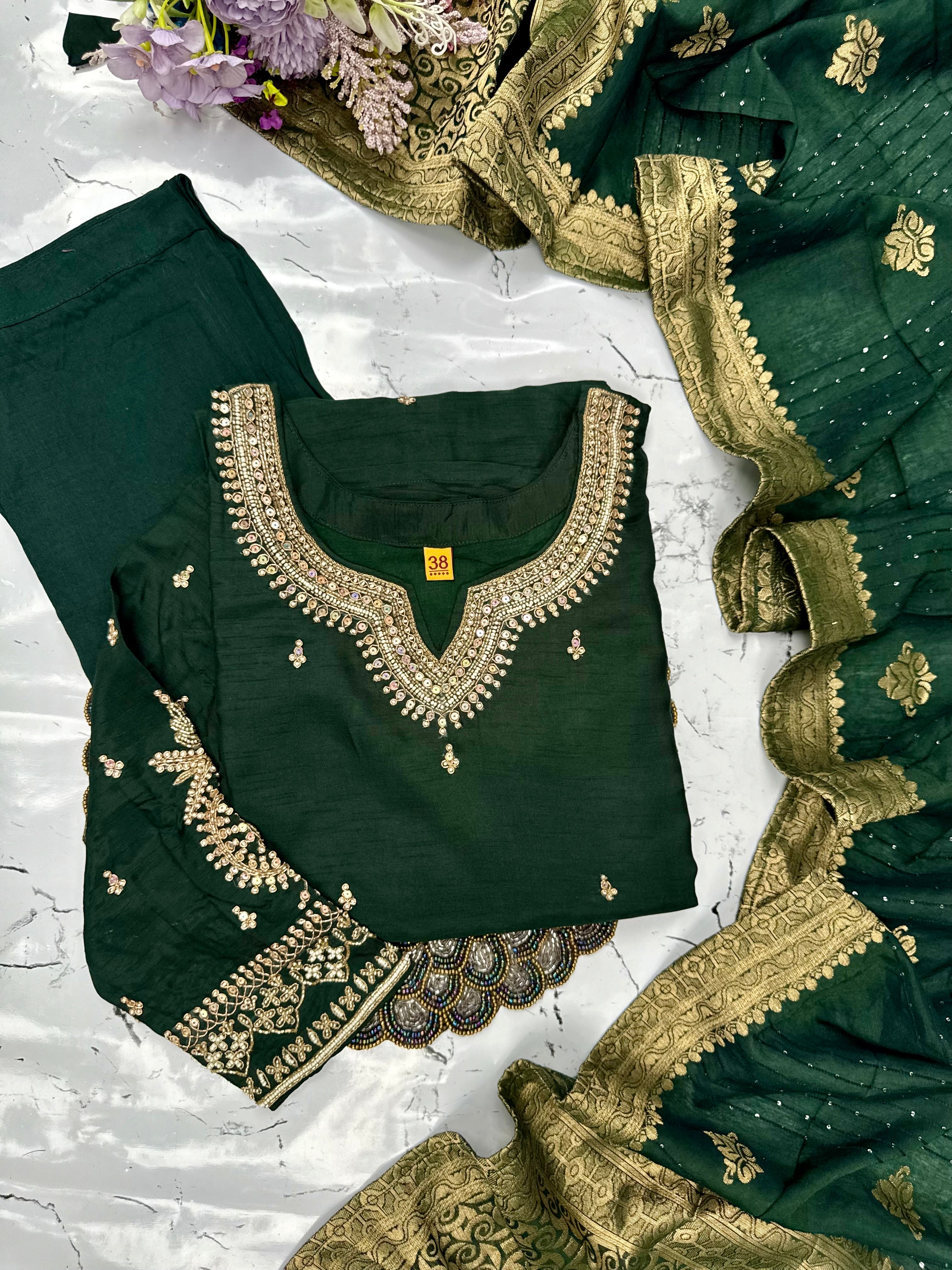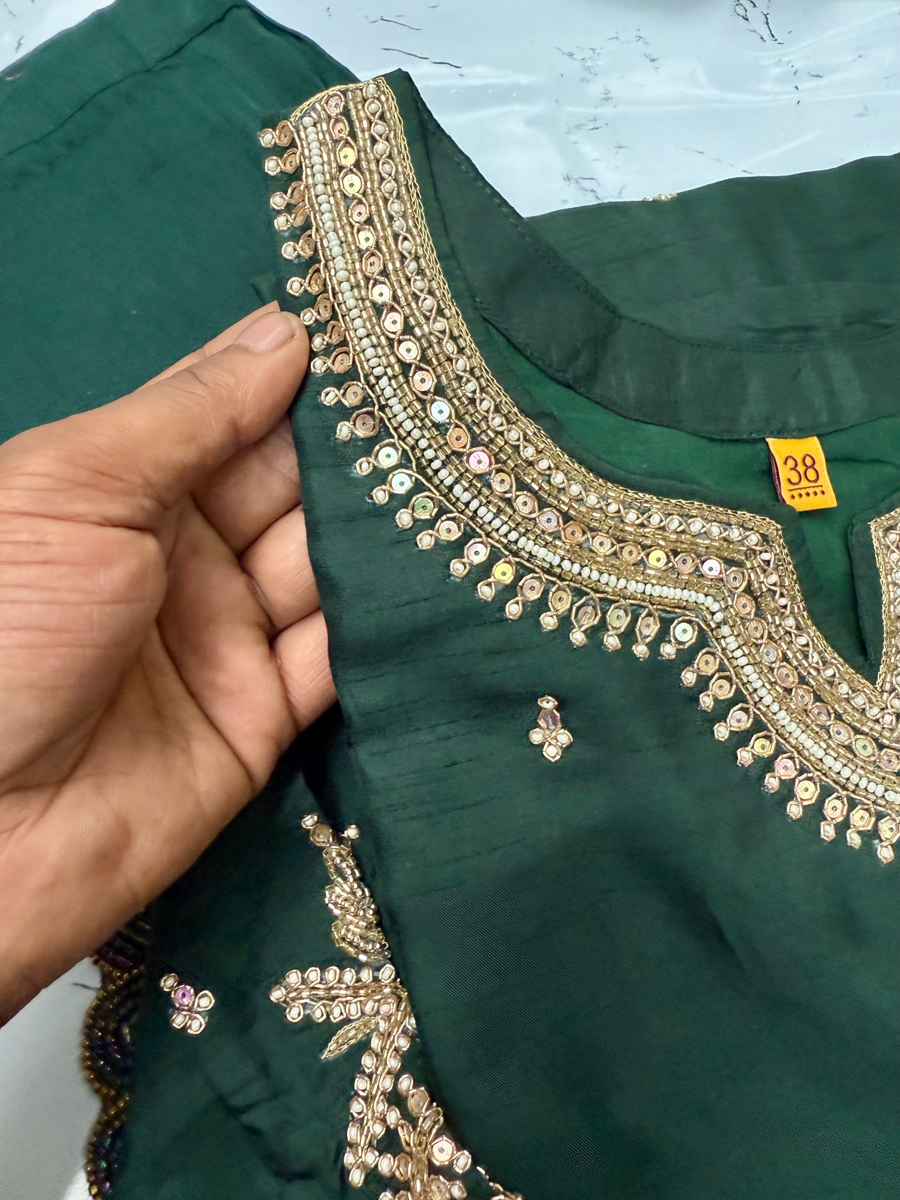 Premium range dola silk set with heavy Handwork on the yoke & sleeve with a beautiful woven Banarasi dupatta and a plane dola silk bottom