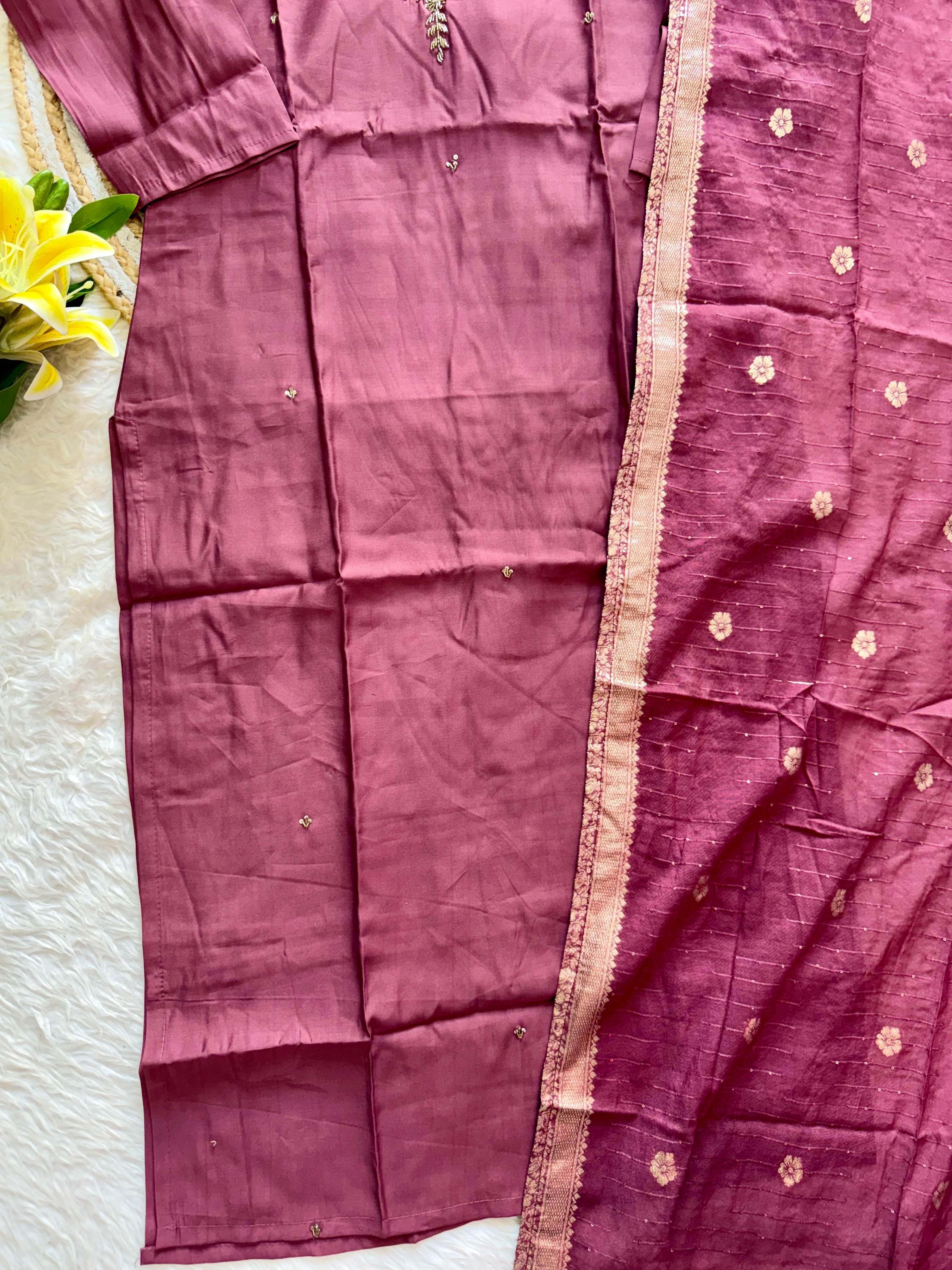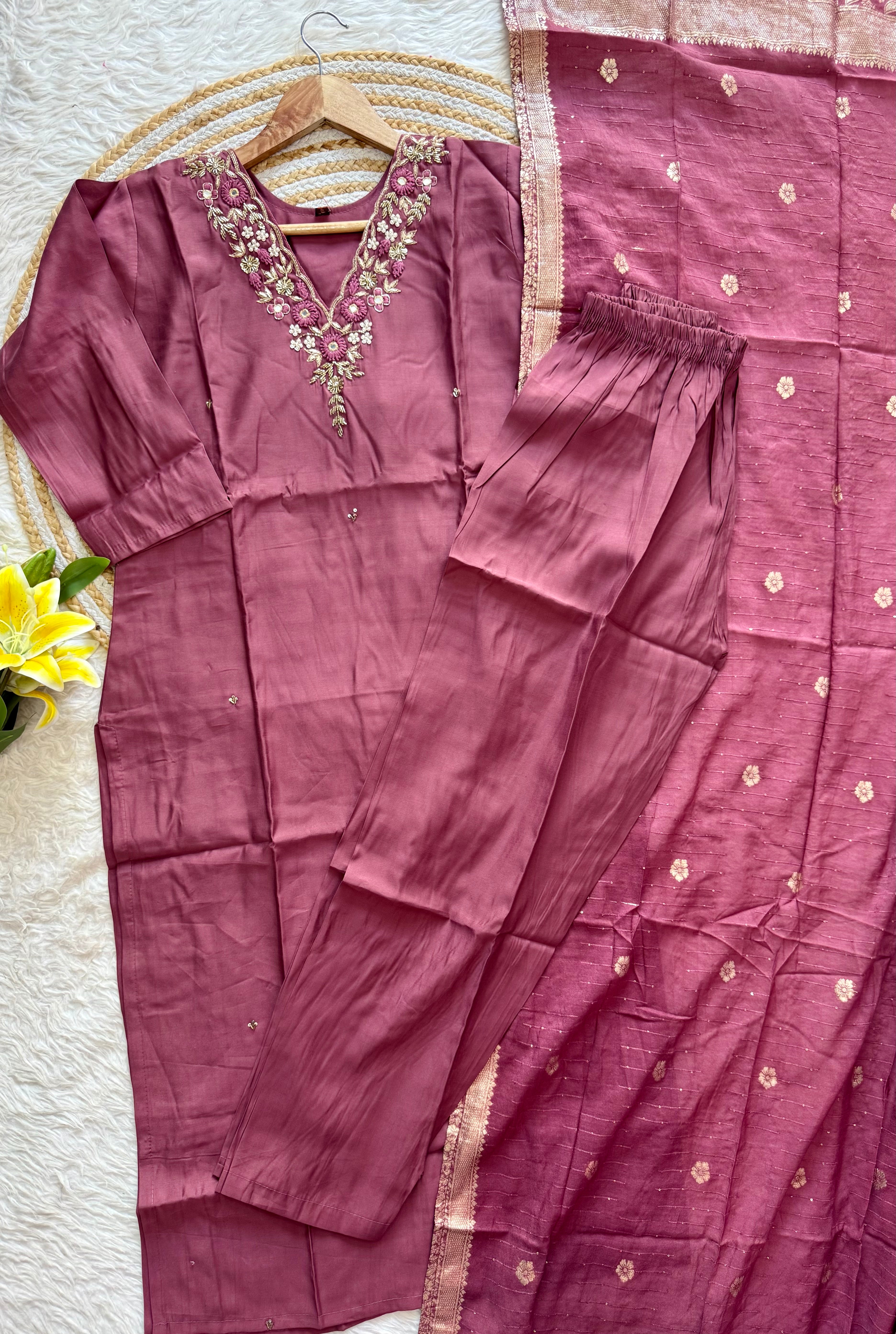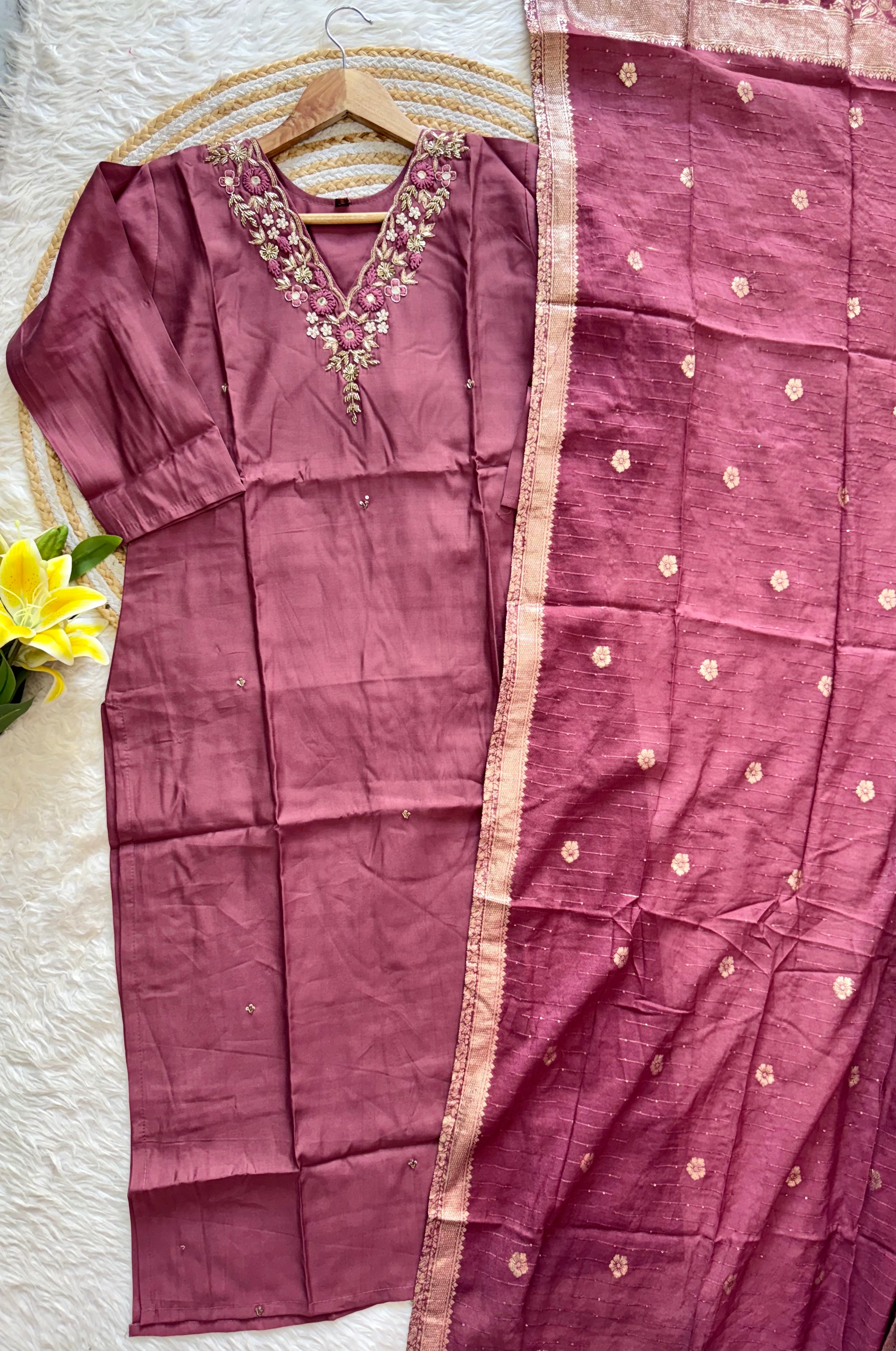 Beautiful silk kurta(attached lining)and pant. Hand work embroidery on kurta Paired with jaqurad chanderi self zari duppata