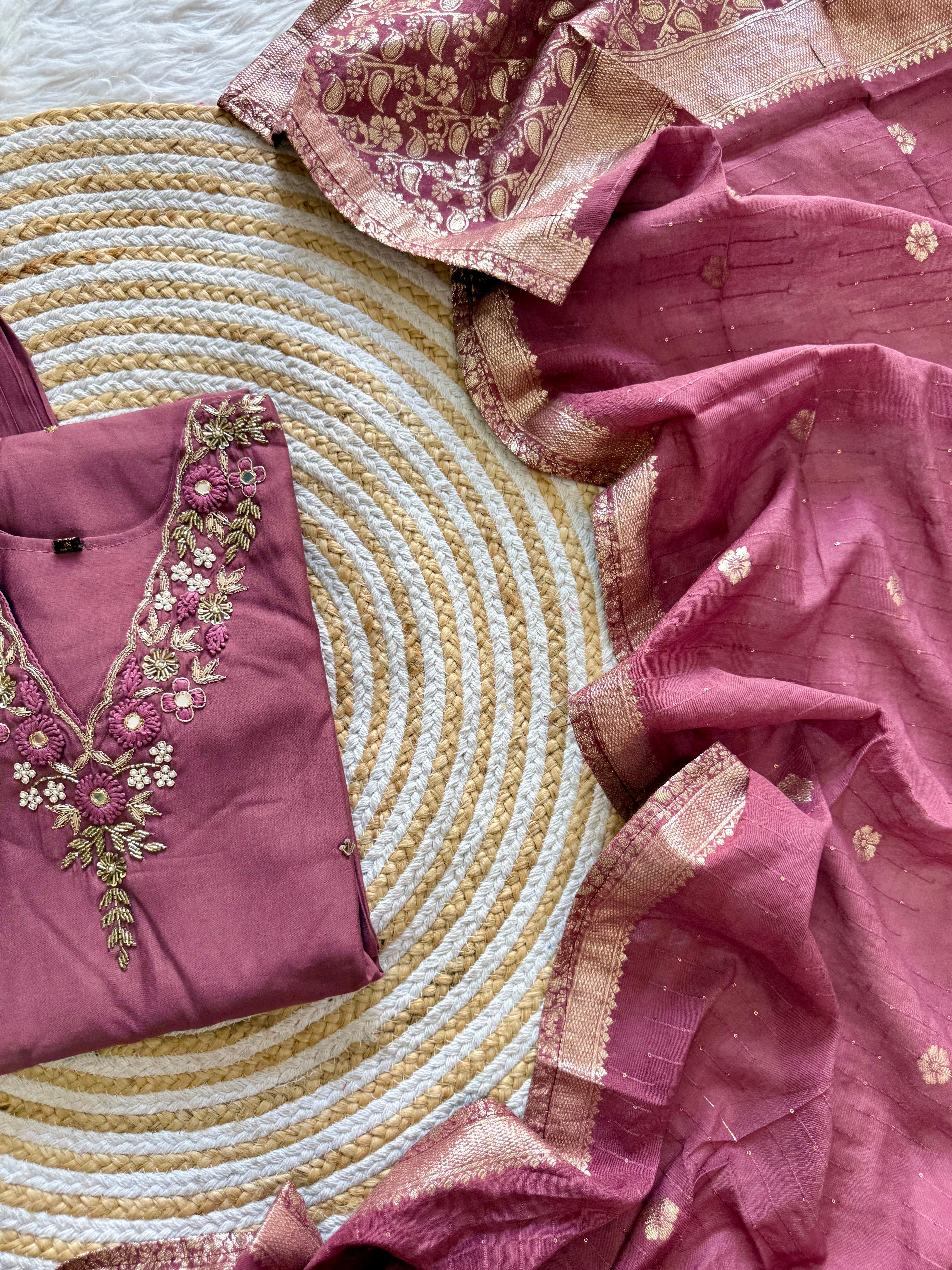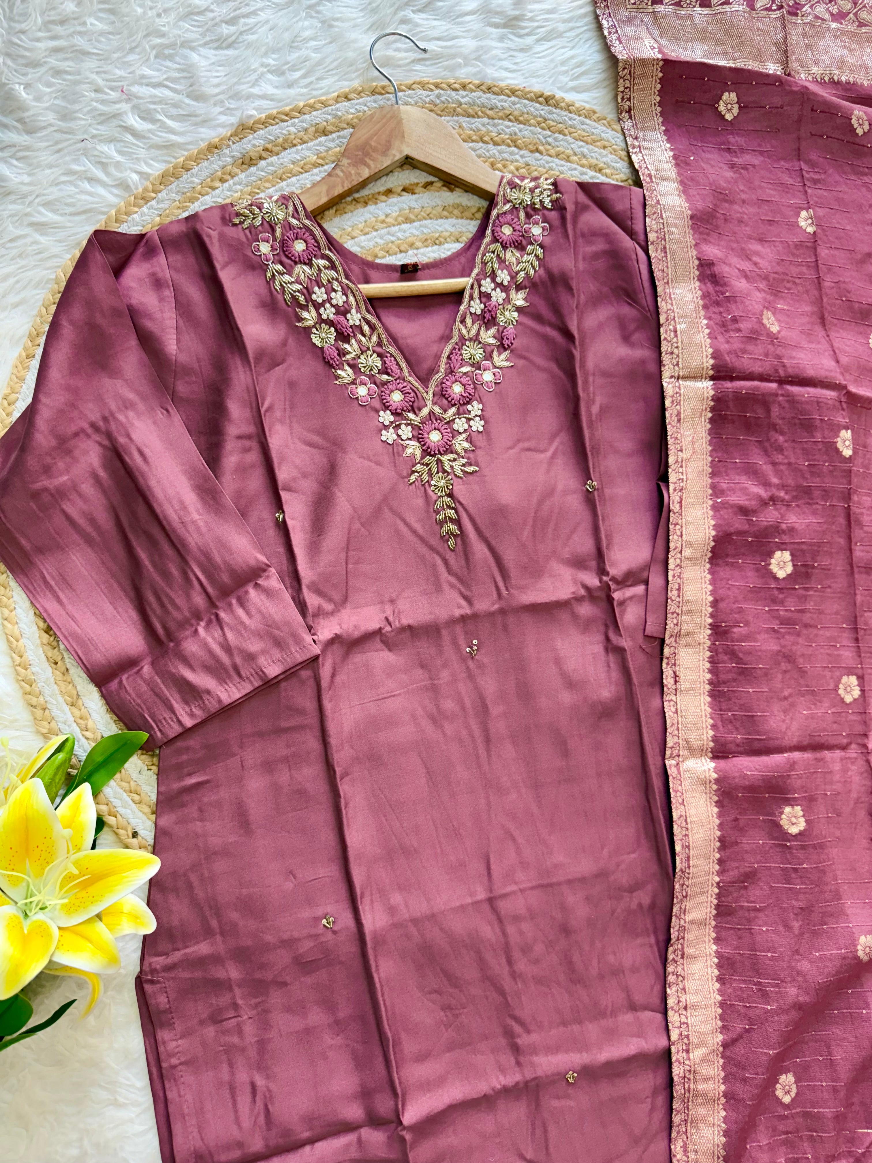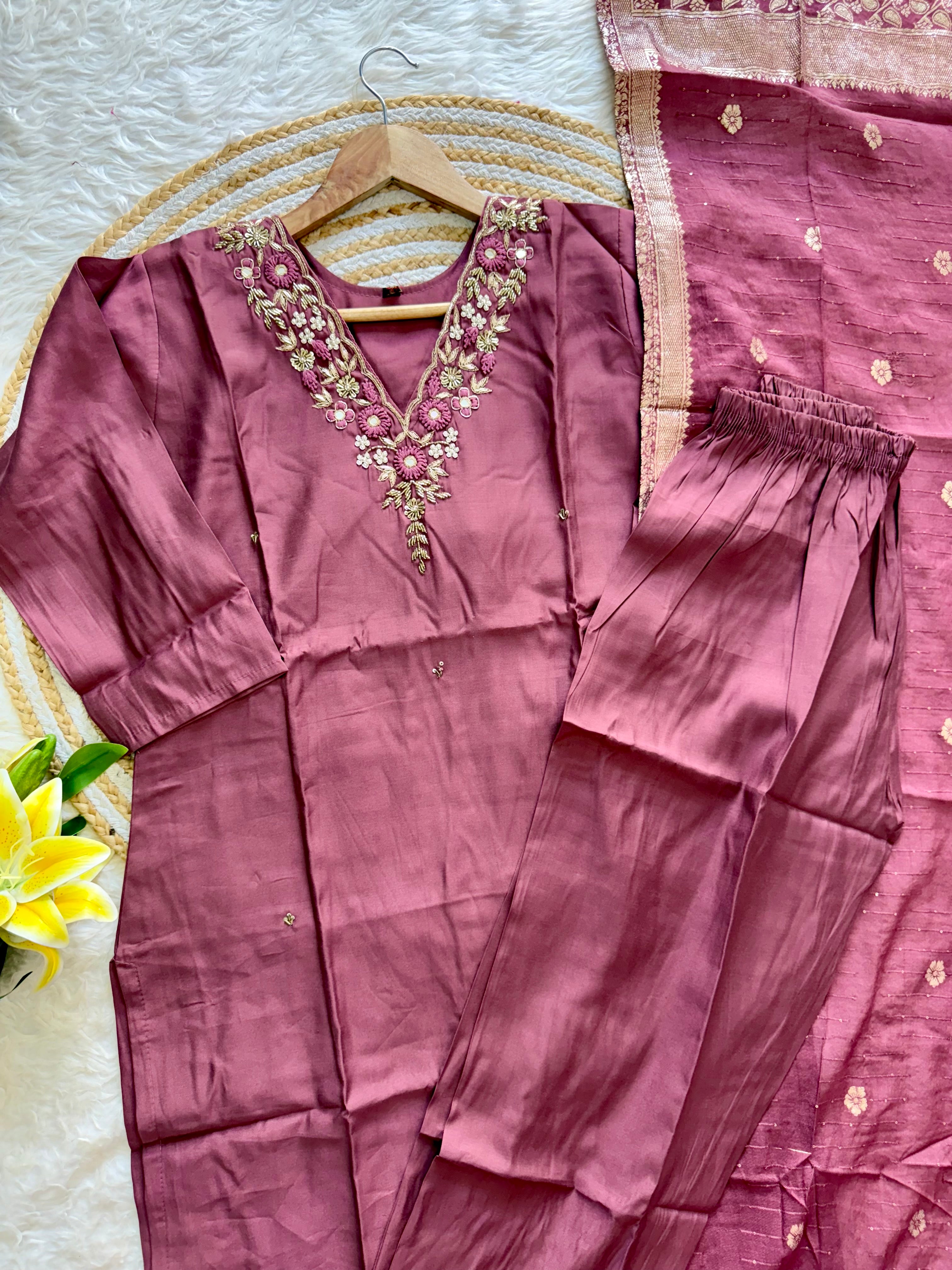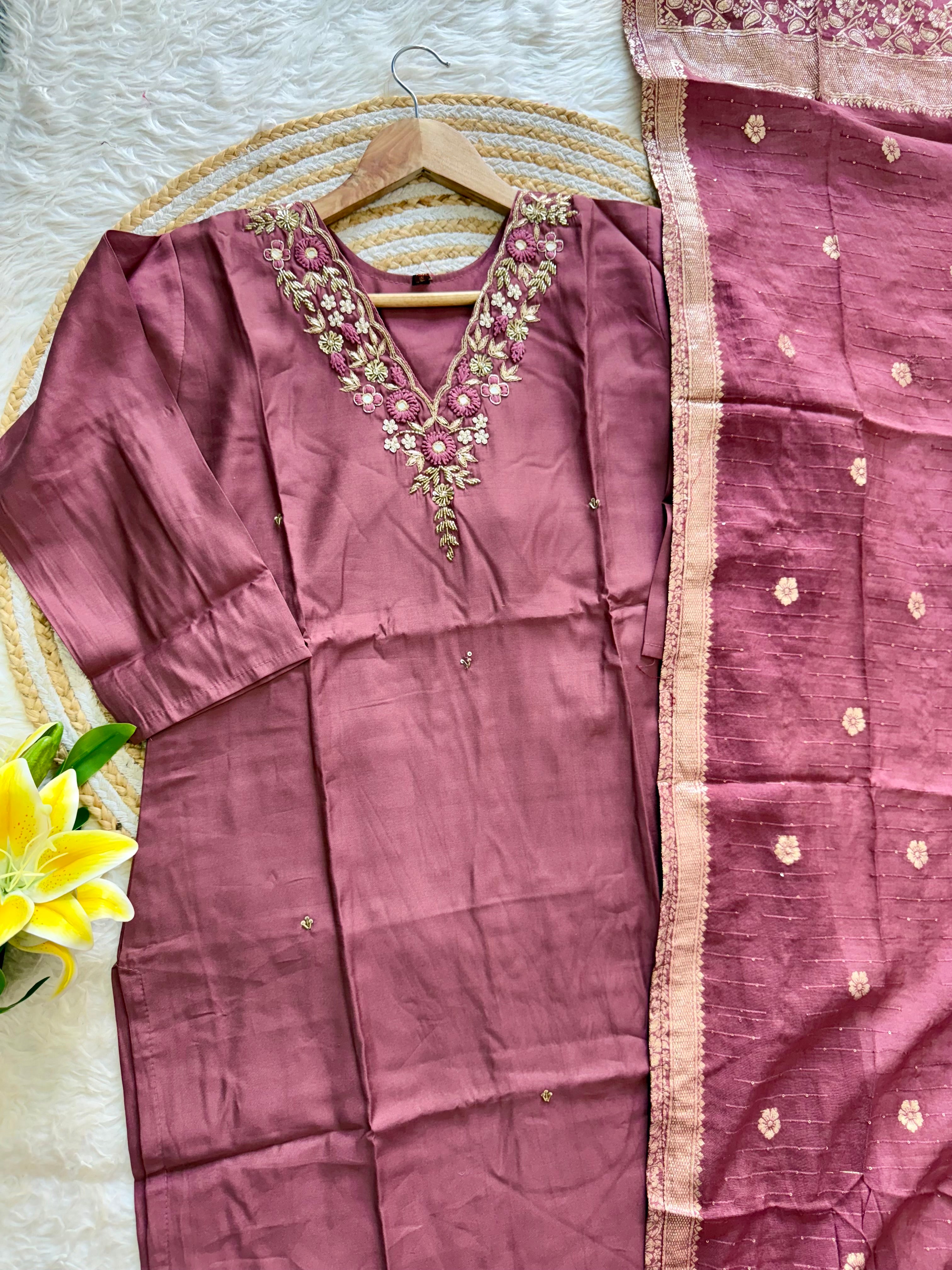 Beautiful silk kurta(attached lining)and pant. Hand work embroidery on kurta Paired with jaqurad chanderi self zari duppata