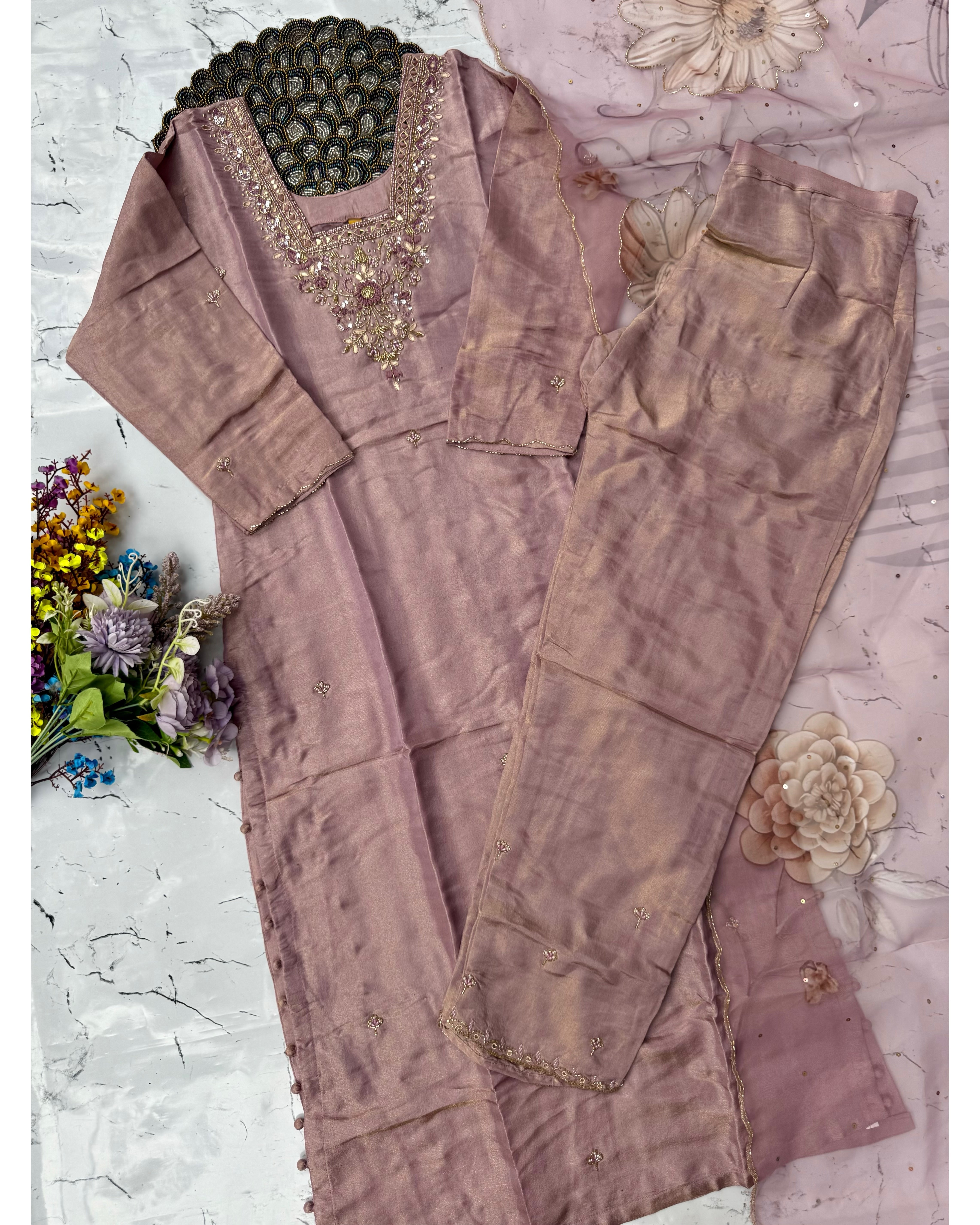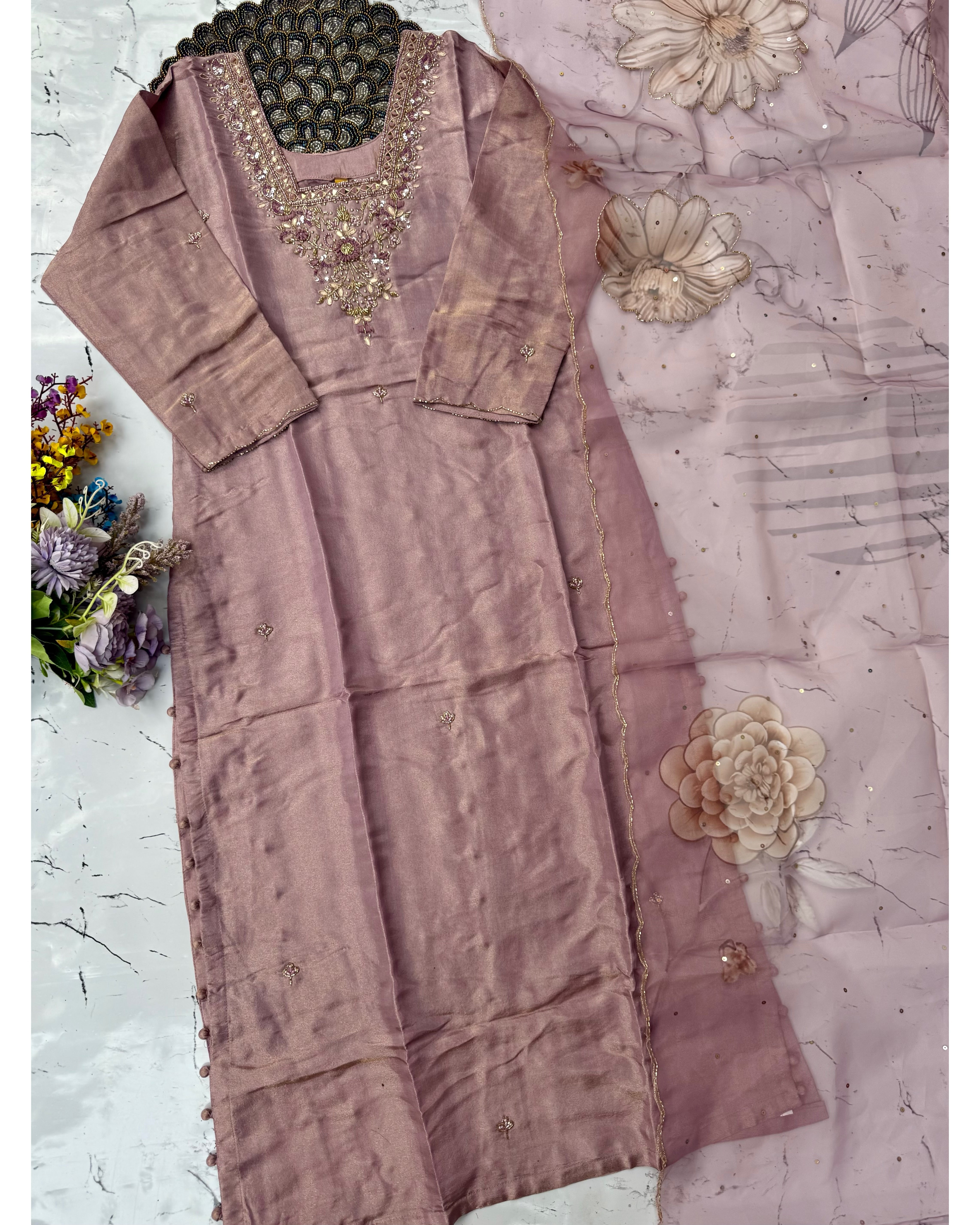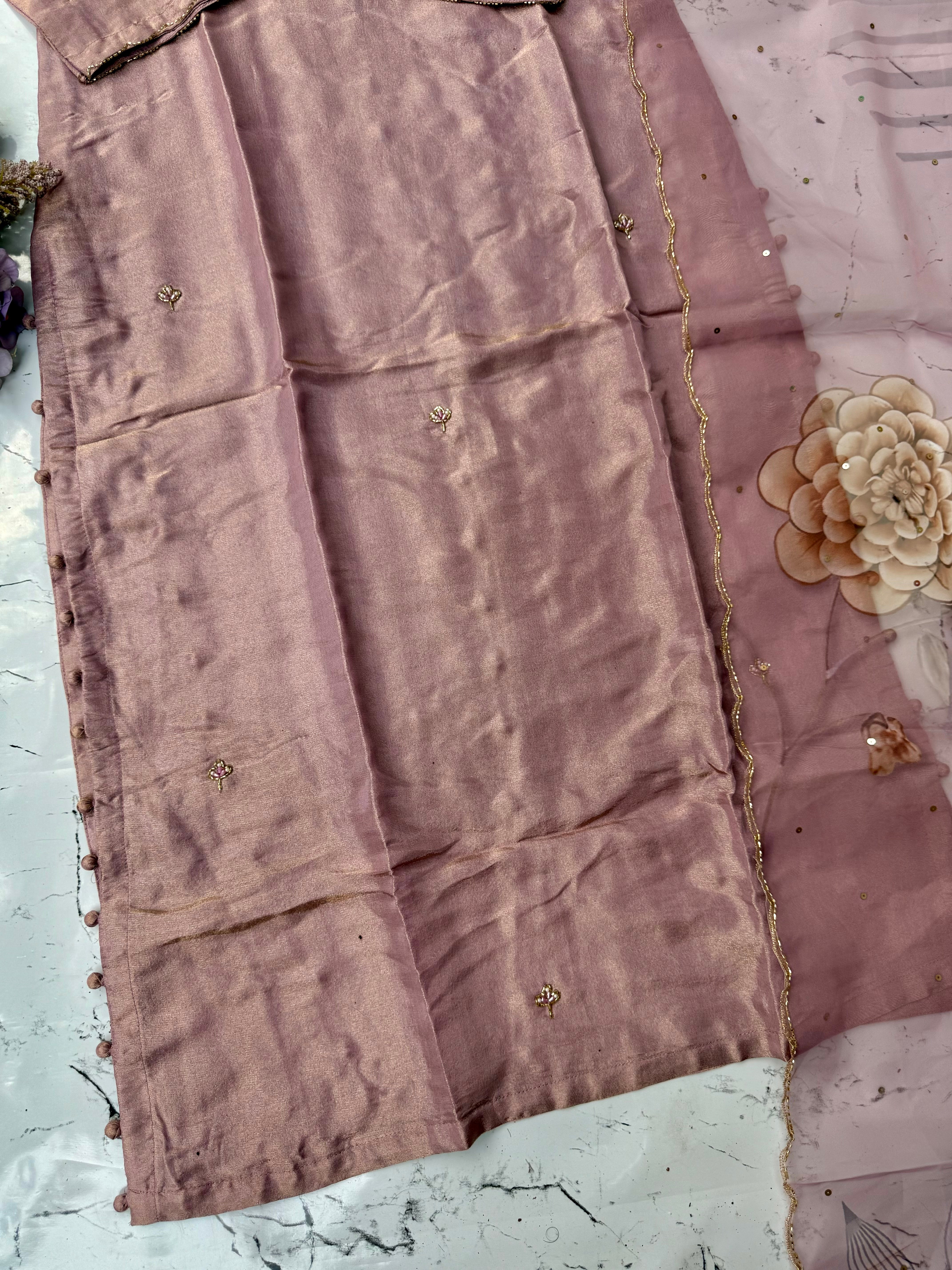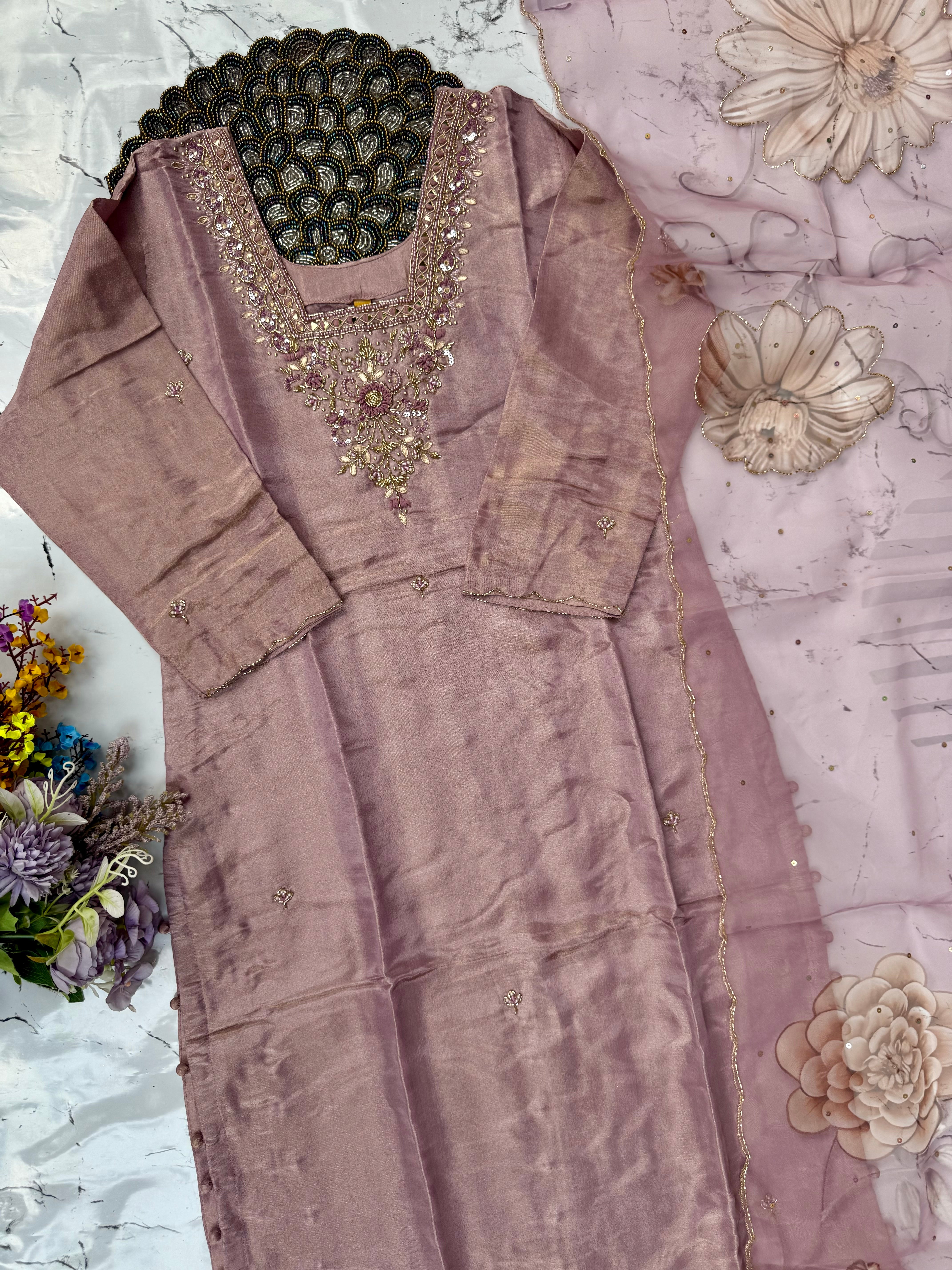 Tissue silk kurti palazzo with dupatta set with handwork on the yoke of the kurta with a beautiful Printed & hand work detailing organza dupatta with a tissue silk palazzo with work