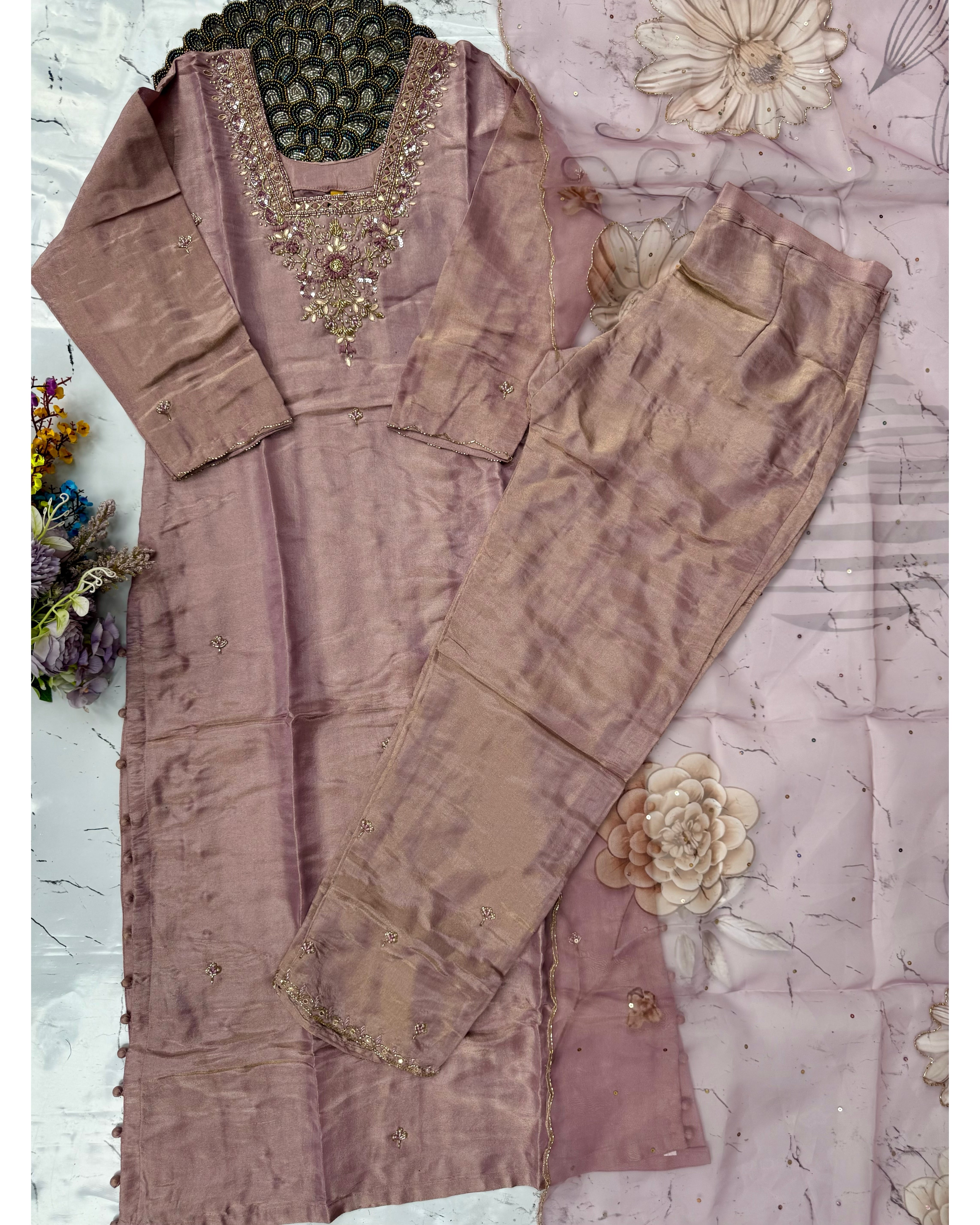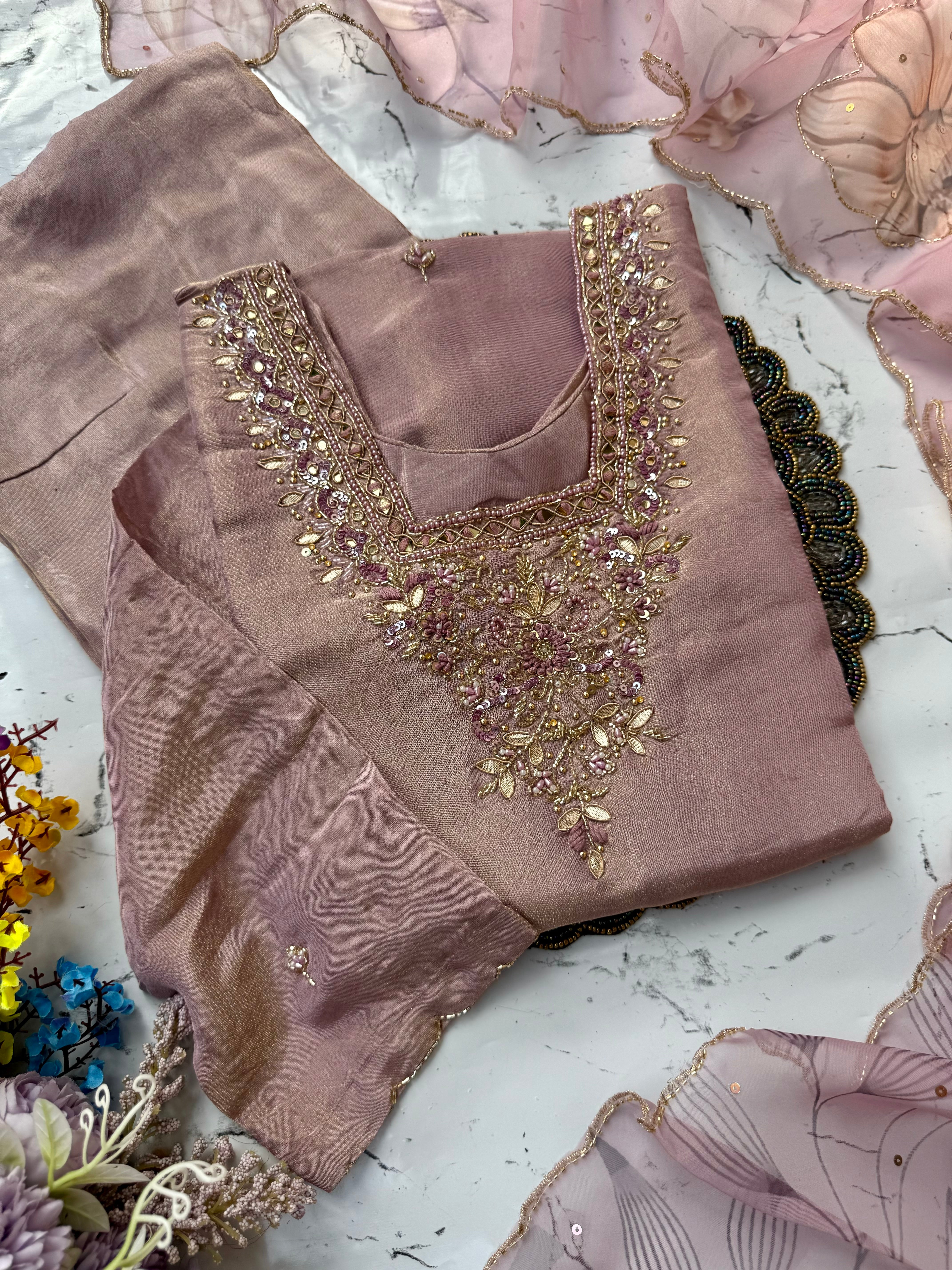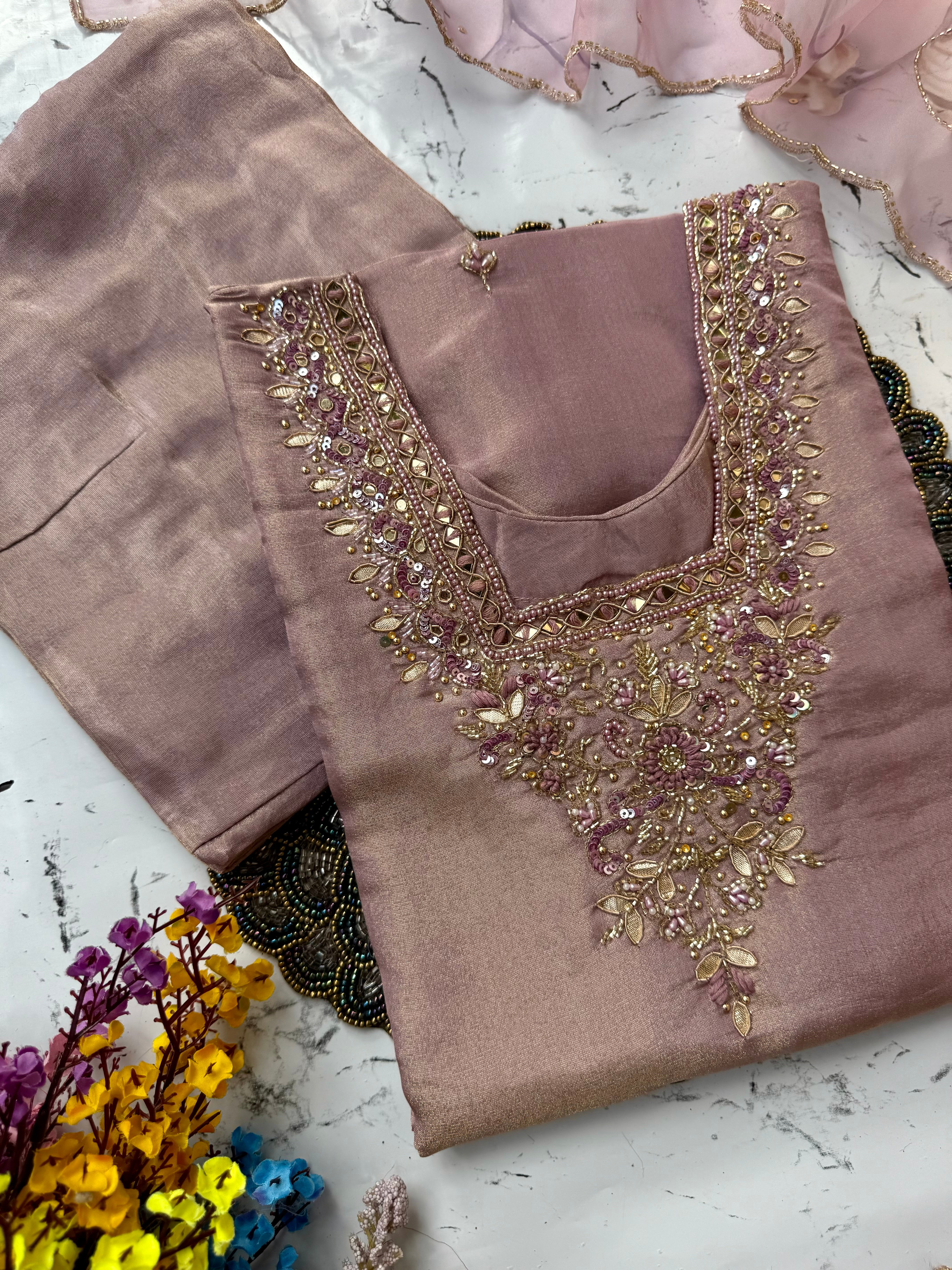 Tissue silk kurti palazzo with dupatta set with handwork on the yoke of the kurta with a beautiful Printed & hand work detailing organza dupatta with a tissue silk palazzo with work