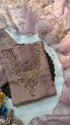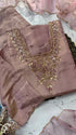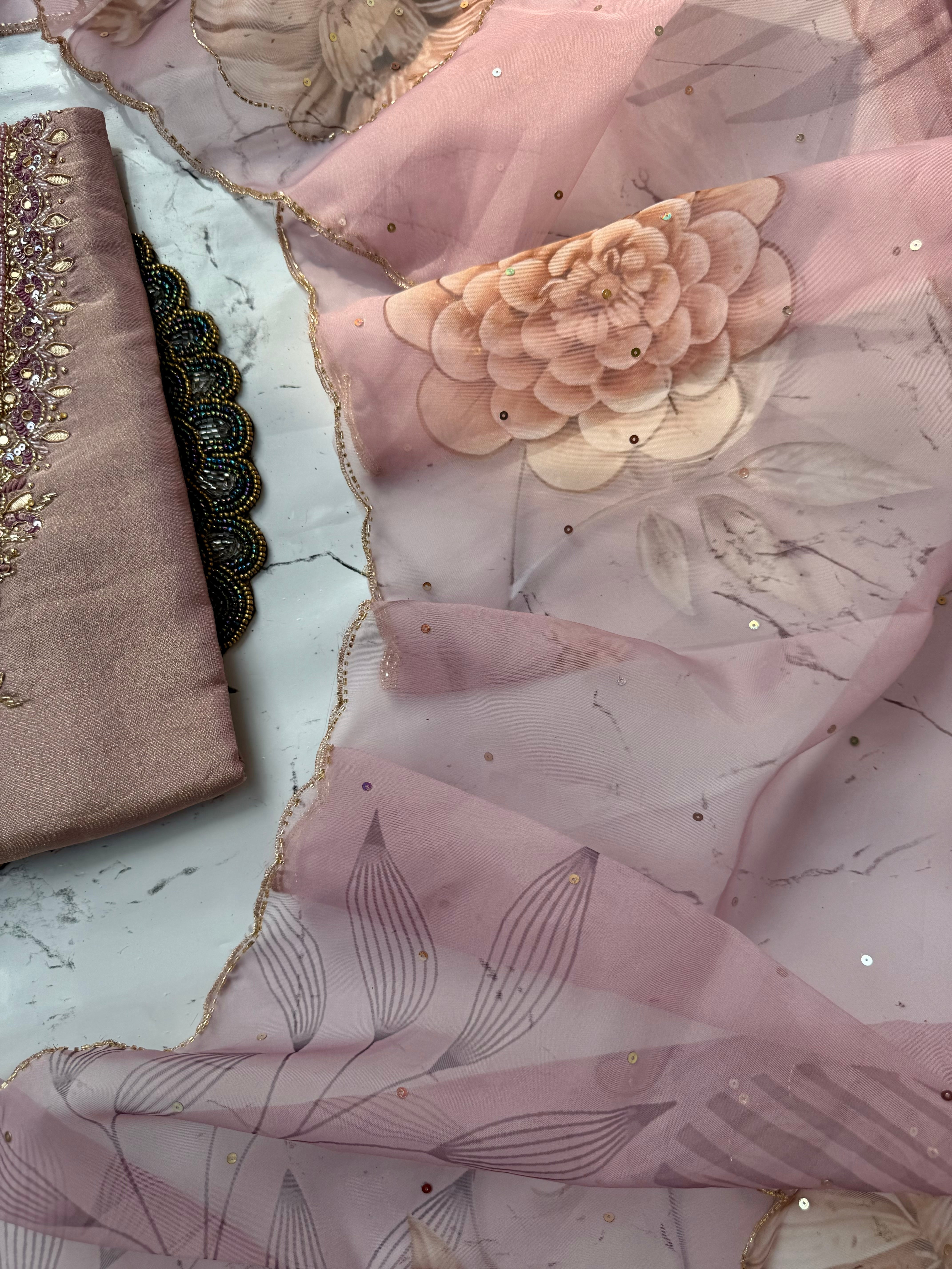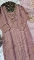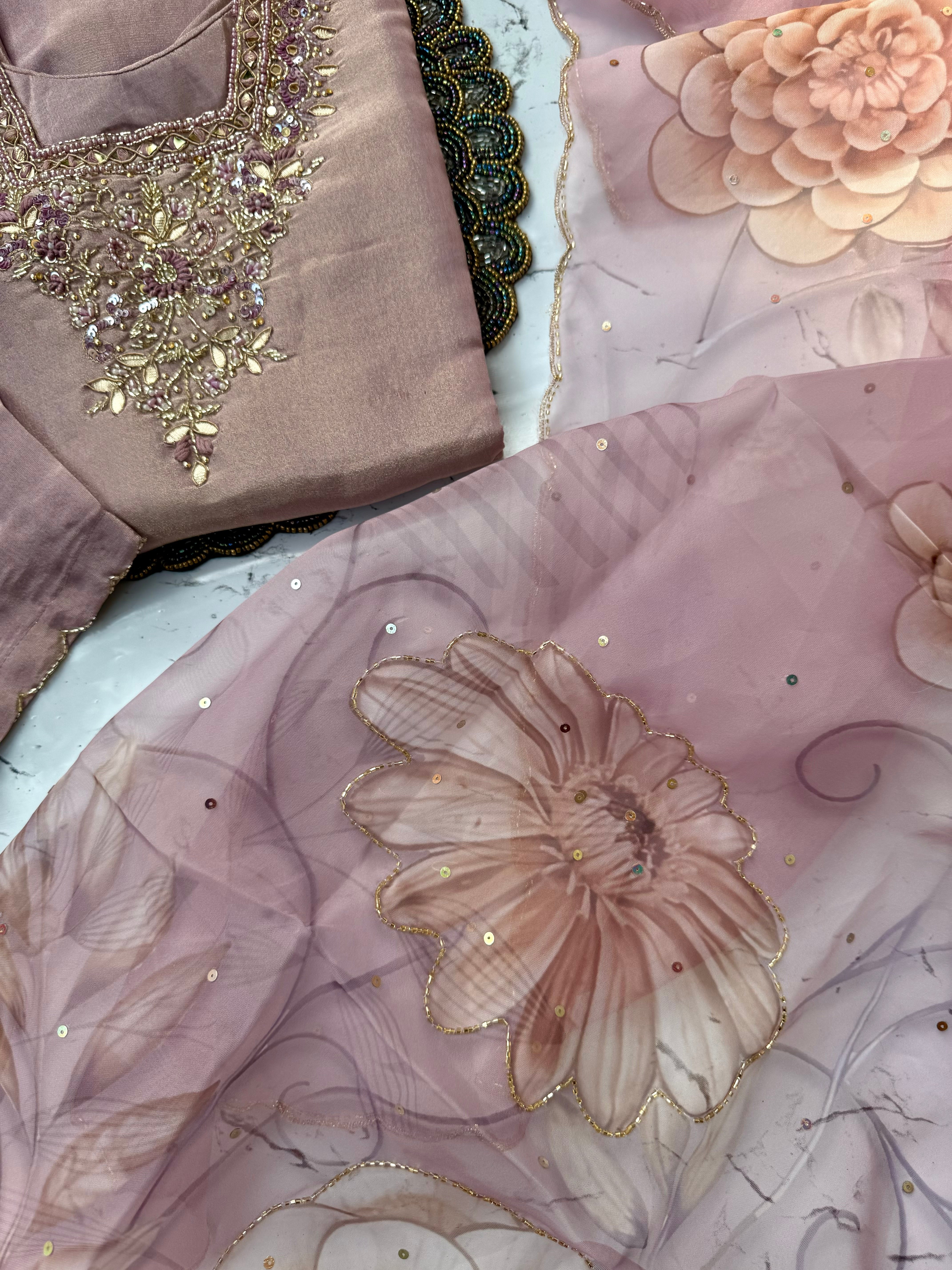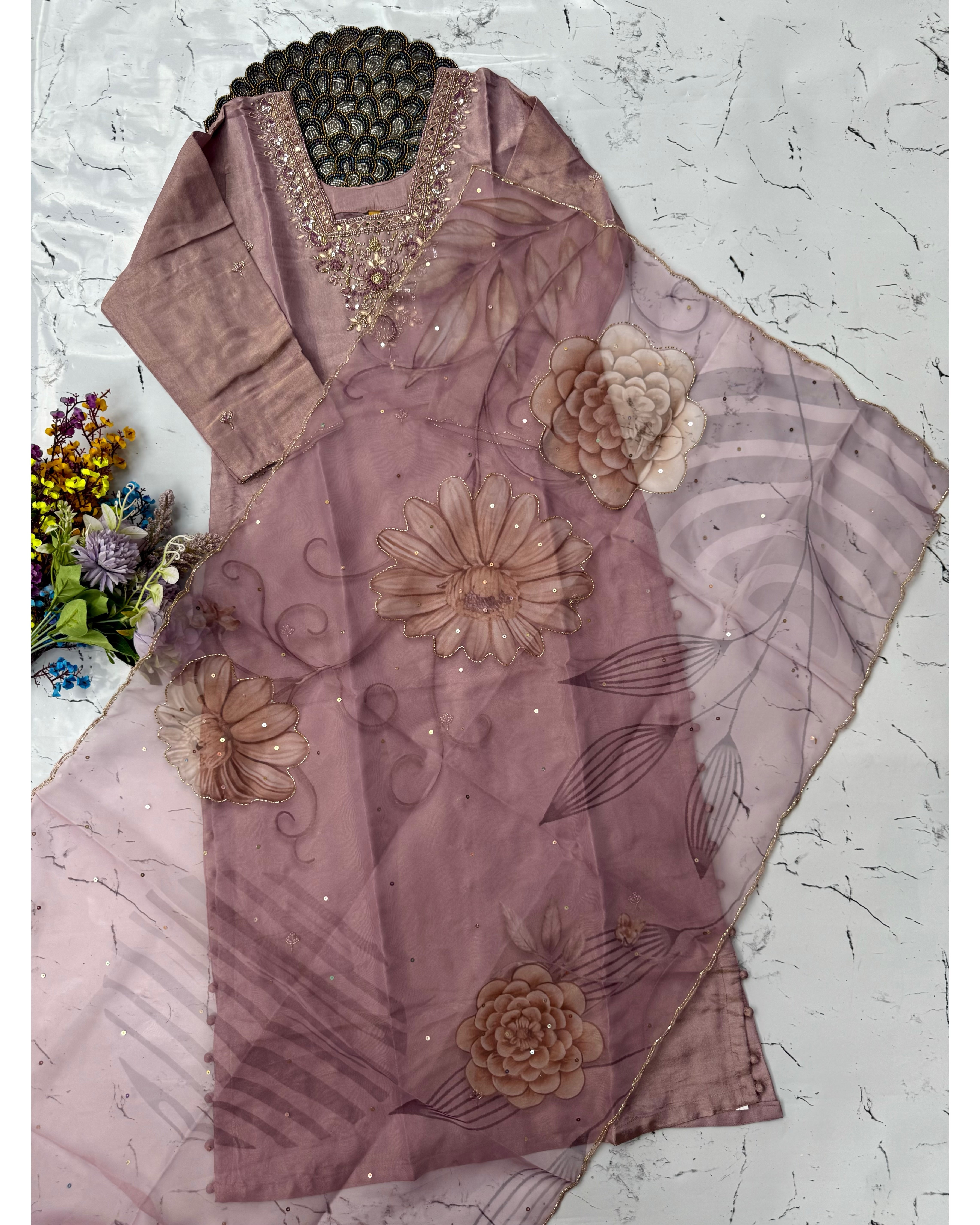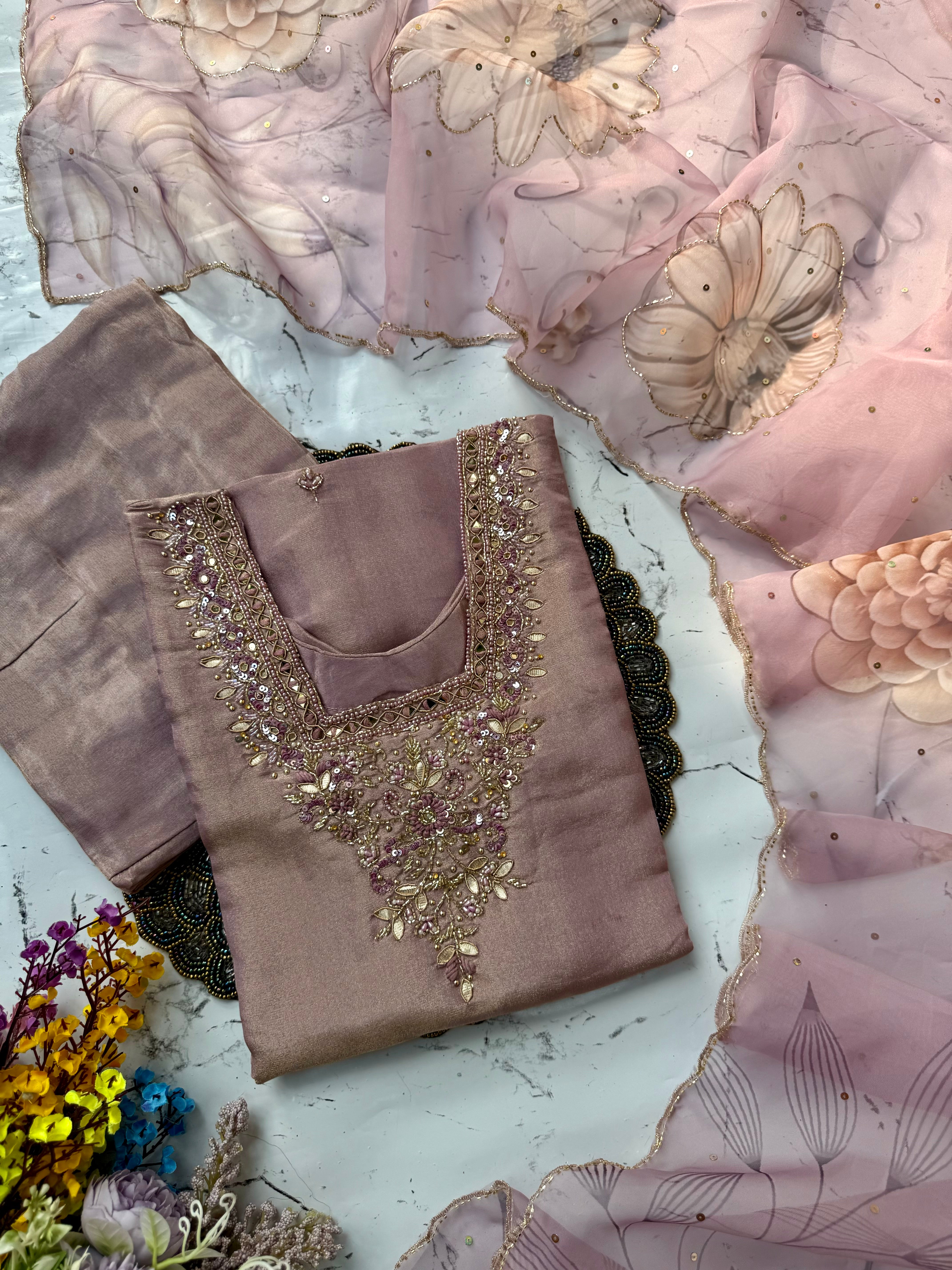 Tissue silk kurti palazzo with dupatta set with handwork on the yoke of the kurta with a beautiful Printed & hand work detailing organza dupatta with a tissue silk palazzo with work