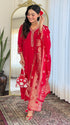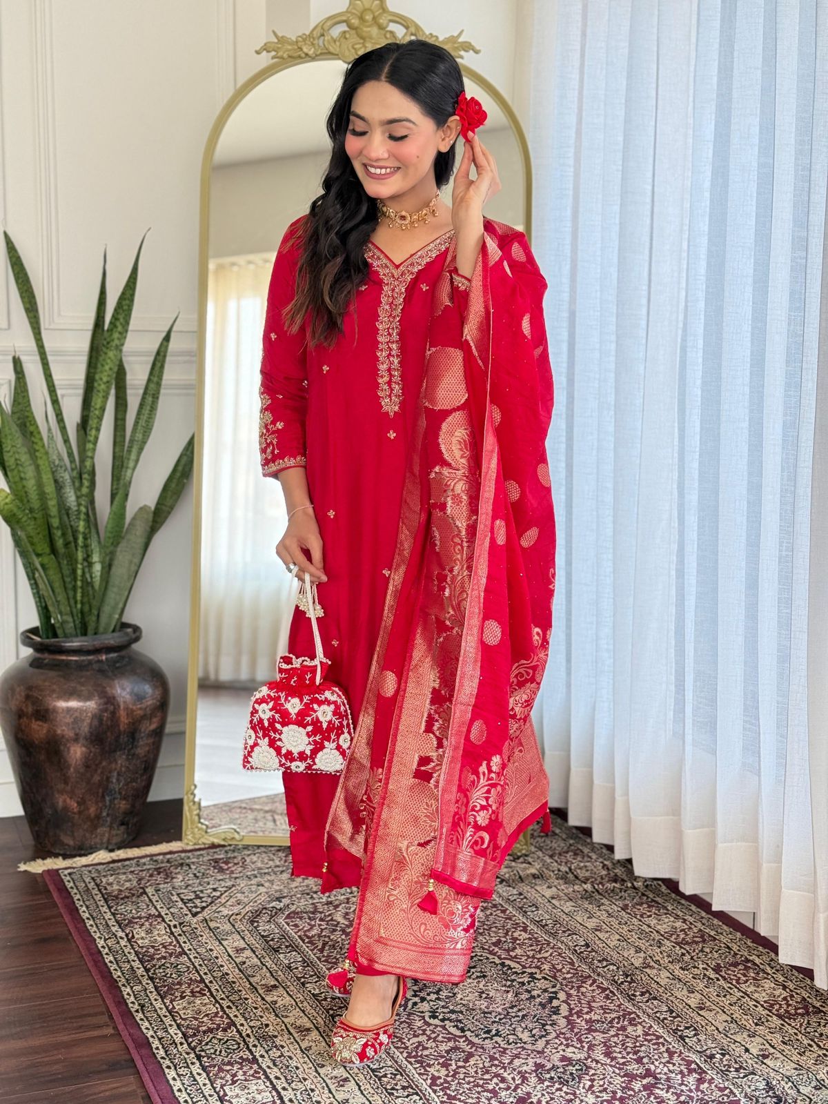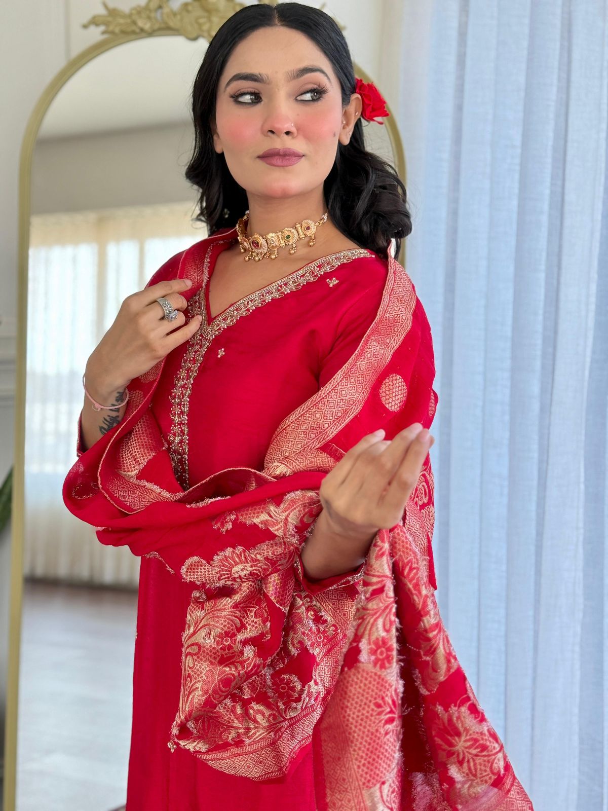 Handcrafted dola silk set with handwork work on the yoke & Sleeves of the kurta with a long banarsi dupatta with a dola silk bottom