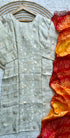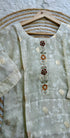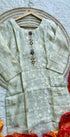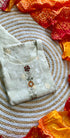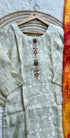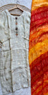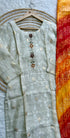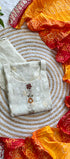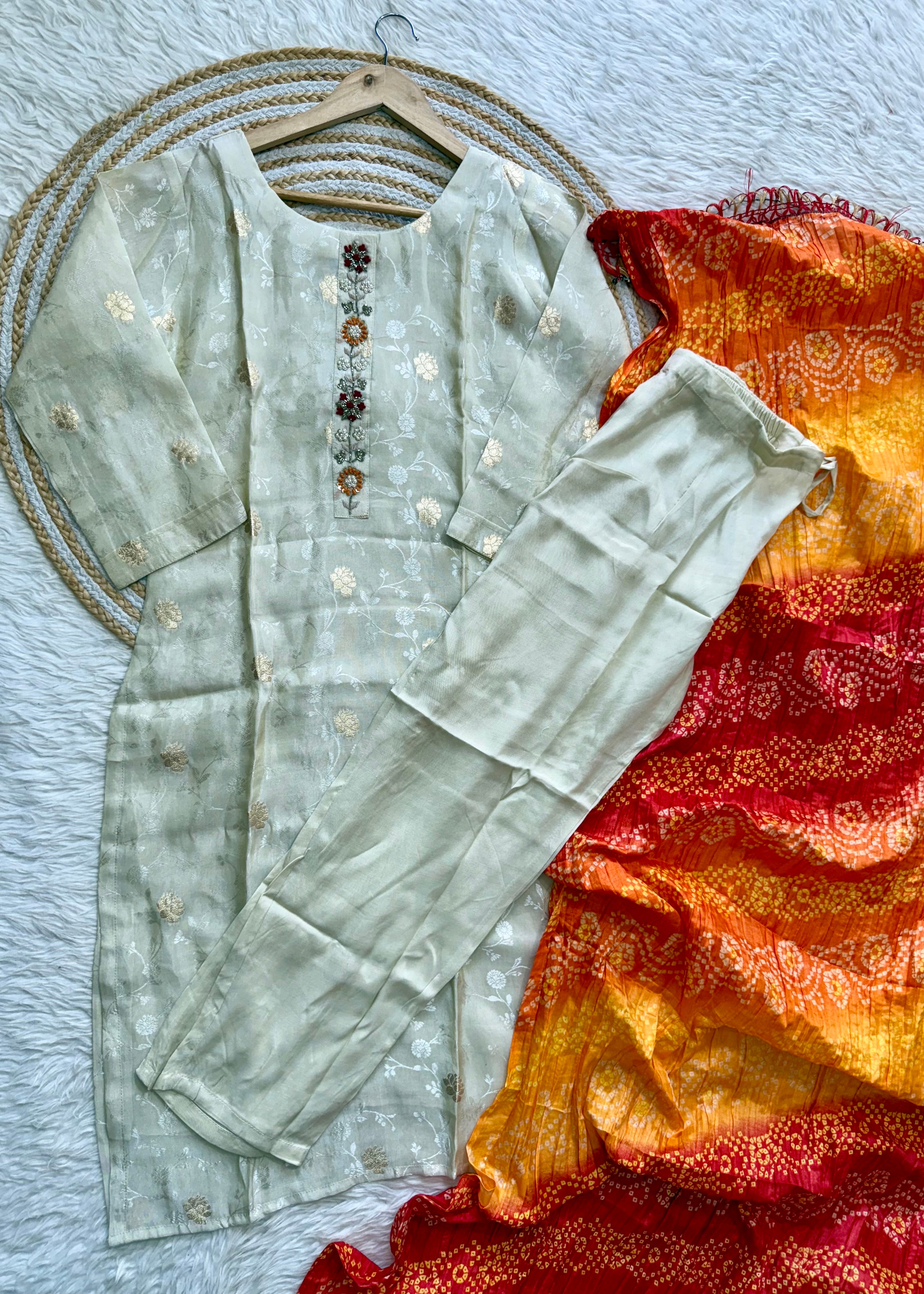 Beautiful off white Jacquard silk kurti set with handwork on the neck line with Jacquard weaving of the kurta with a long Bandhani dupatta and a silk bottom