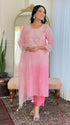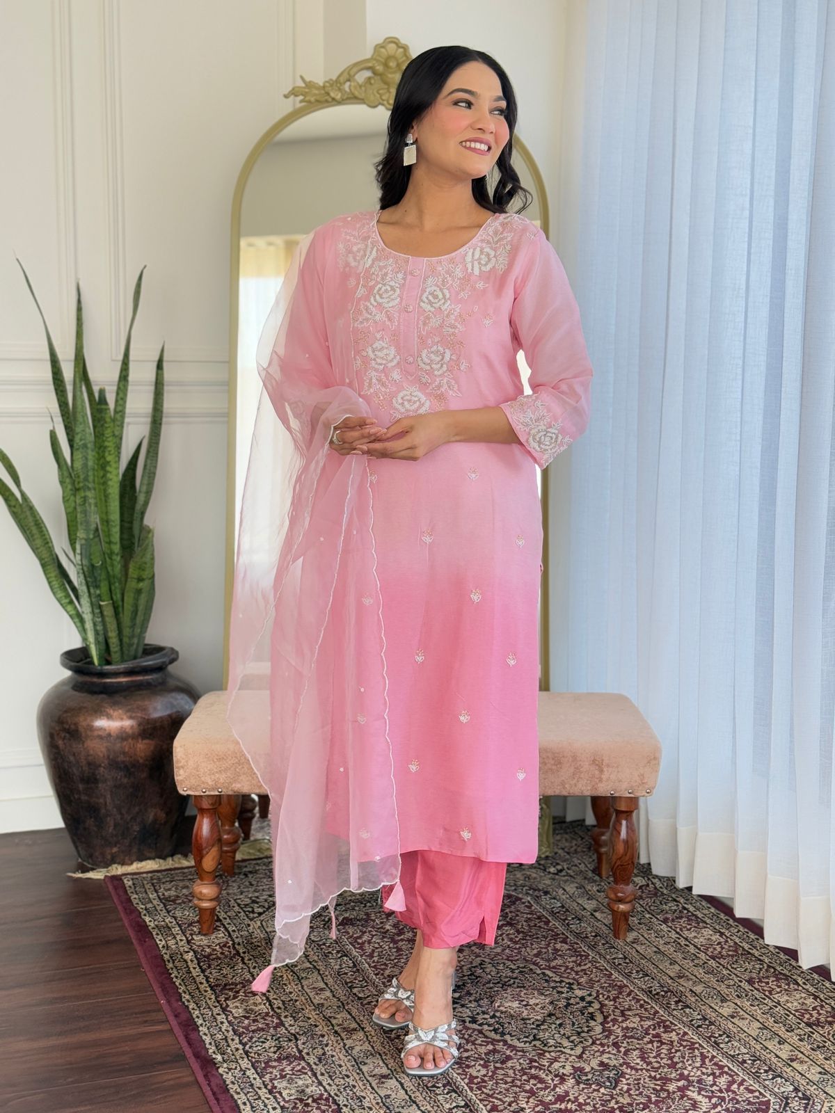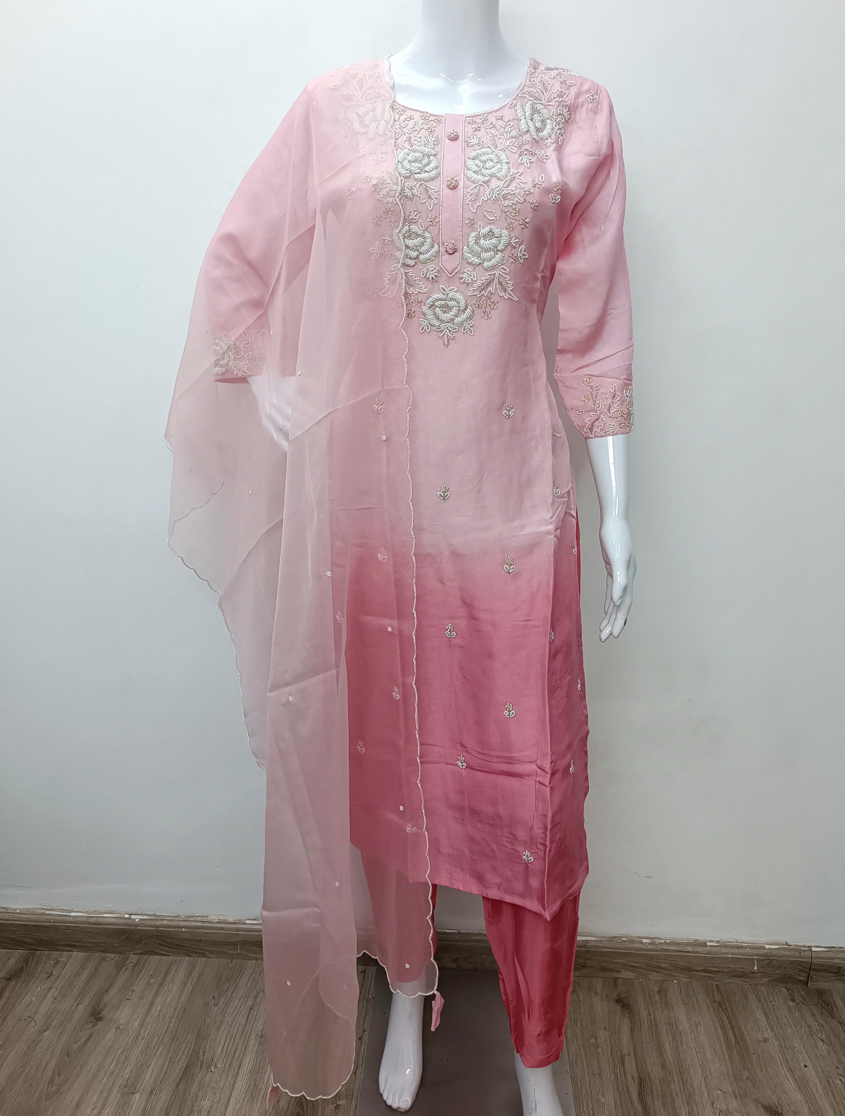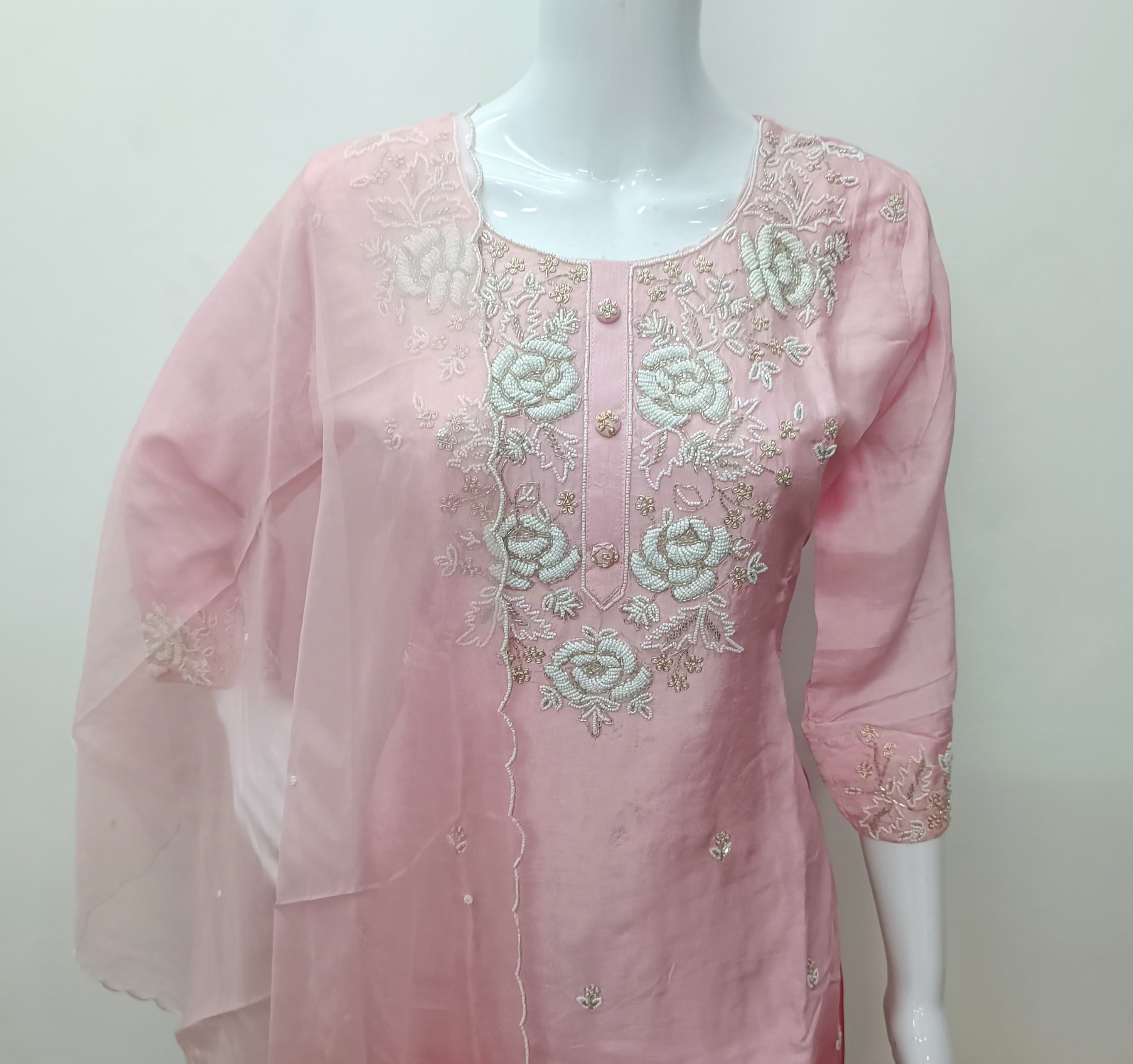 Beautiful Tissue silk kurta with with handwork on the yoke & sleeves of the kurta with a long organza dupatta with pearl work details & a dola silk bottom