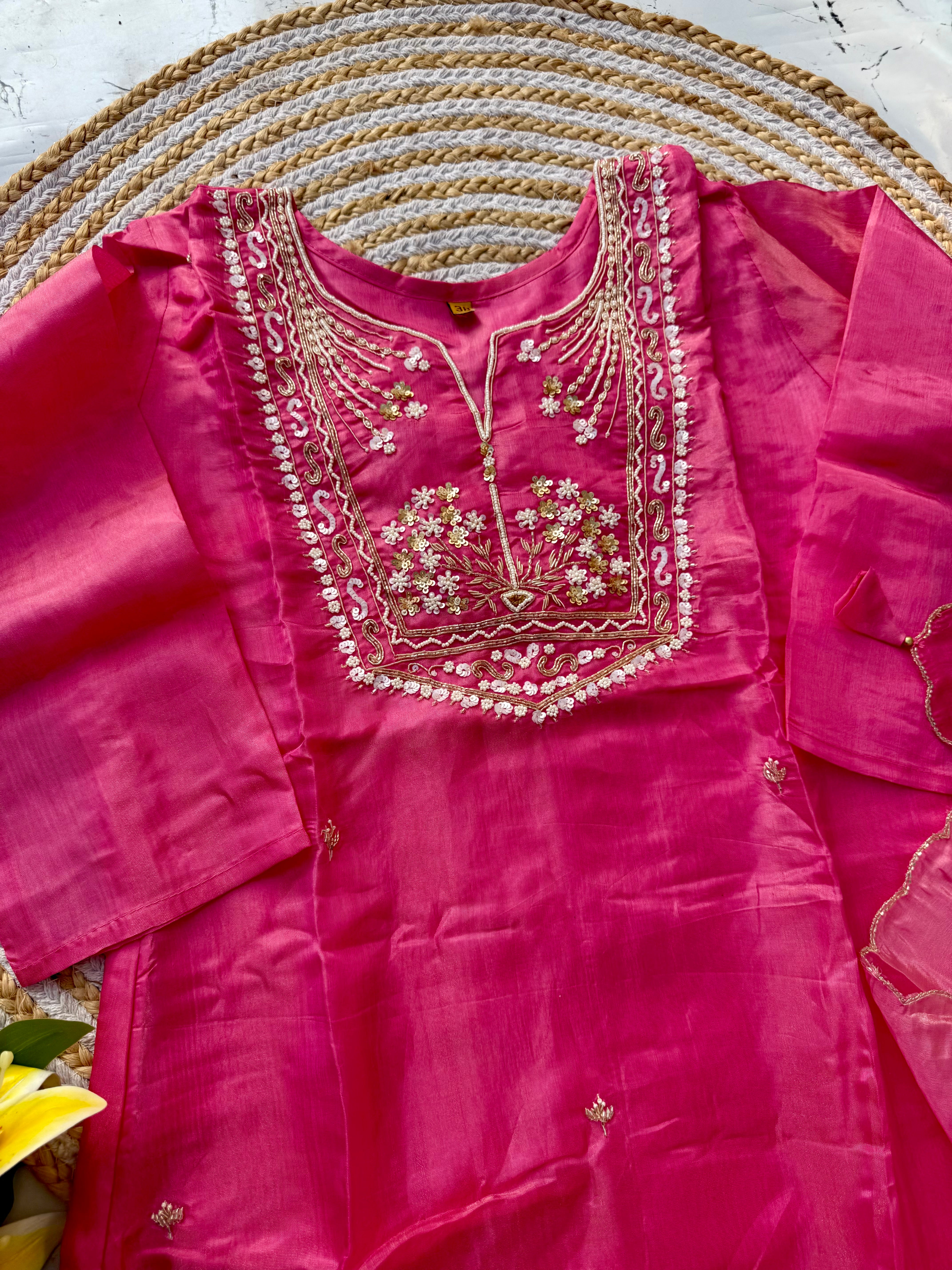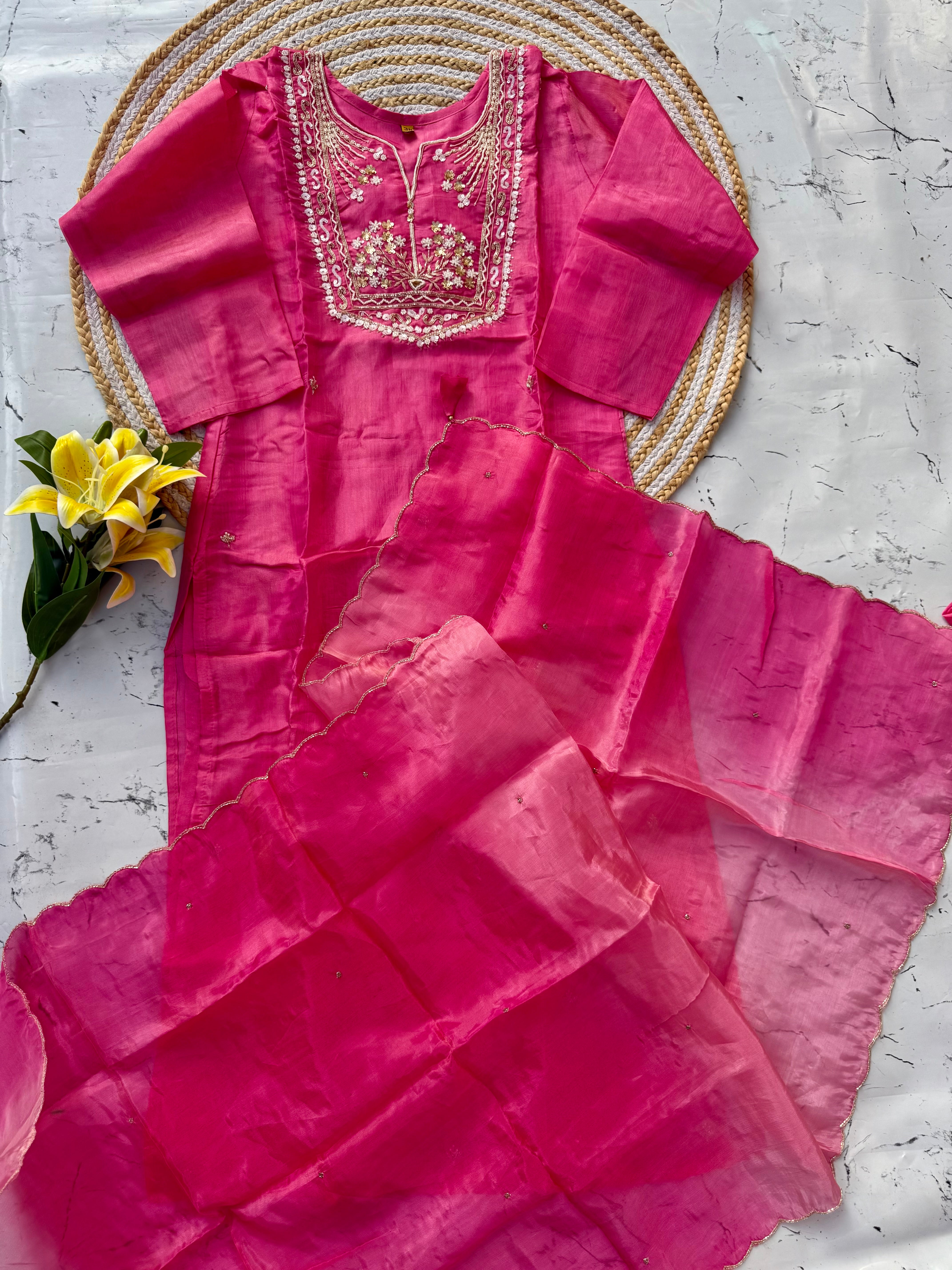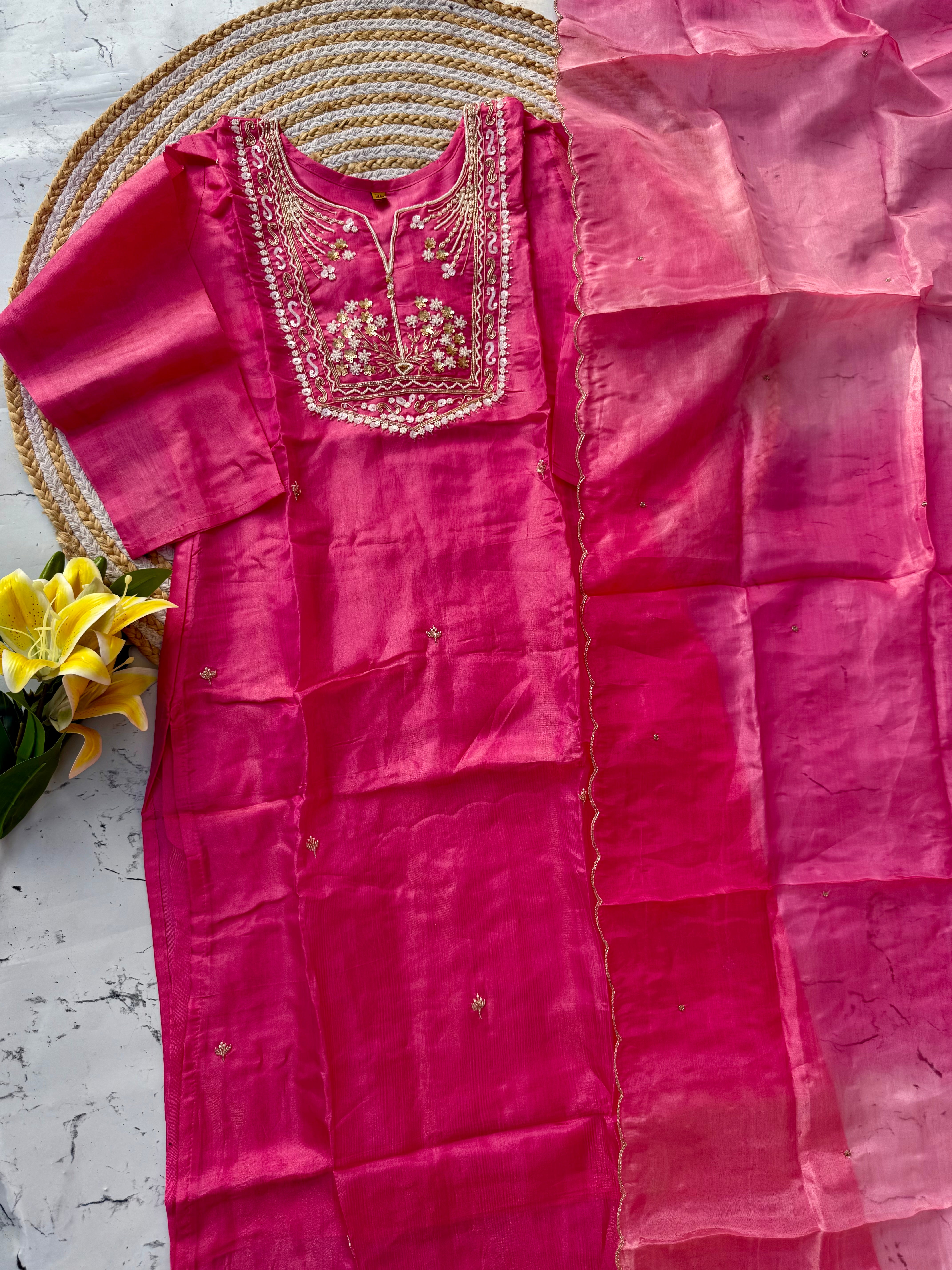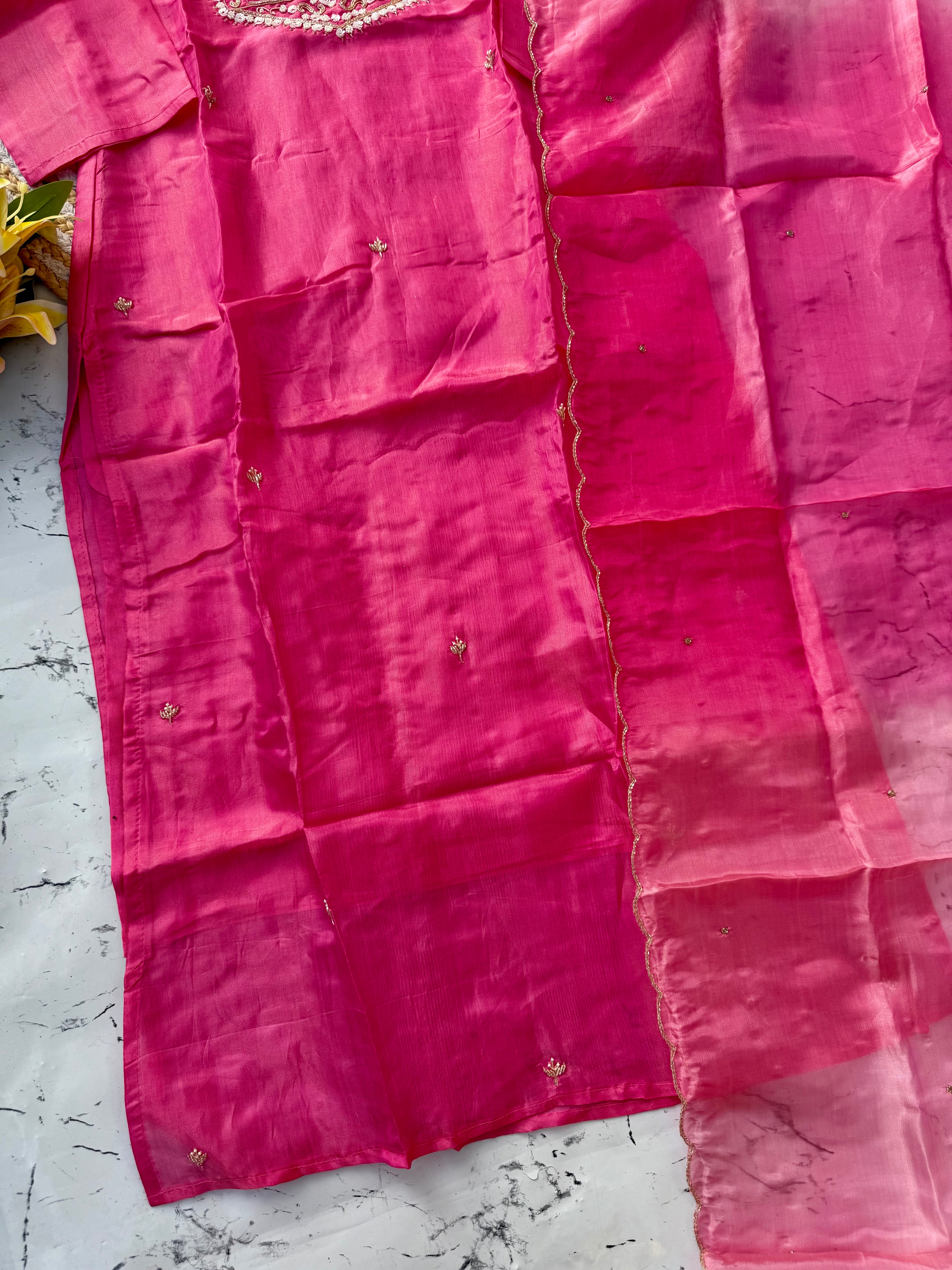 Beautiful Tissue silk kurta with with handwork on the yoke of the kurta with a long organza dupatta with pearl work details & a dola silk bottom