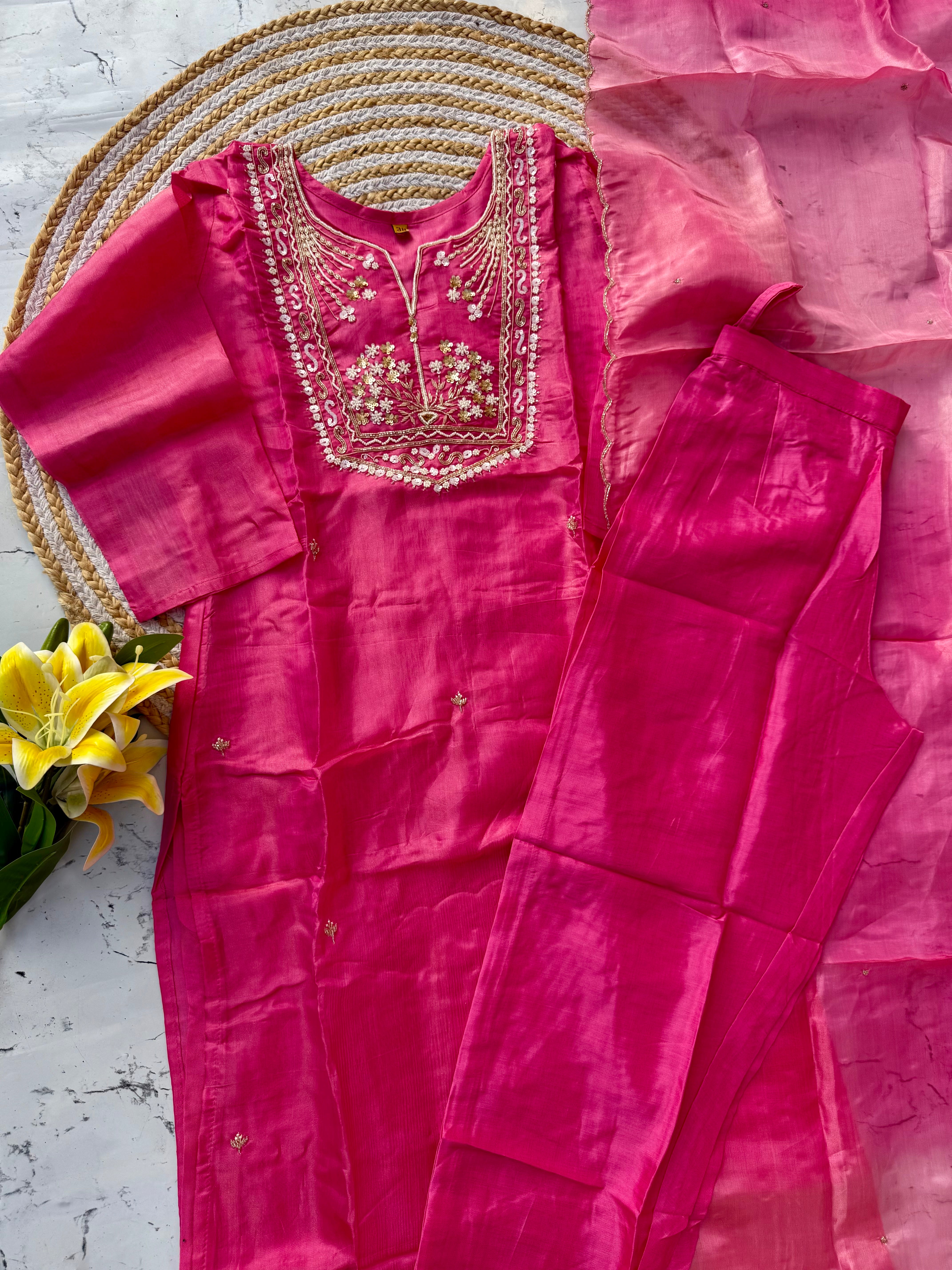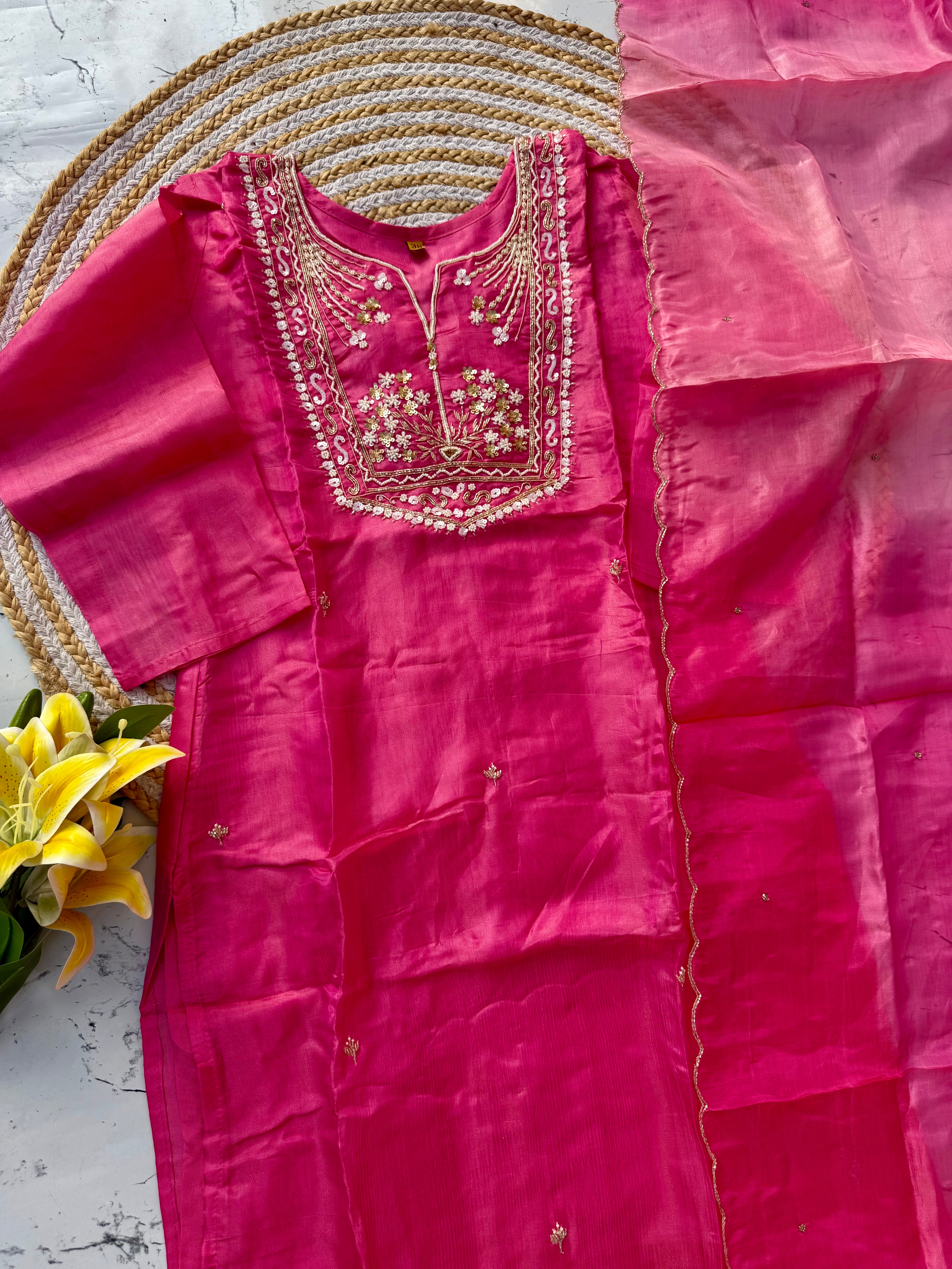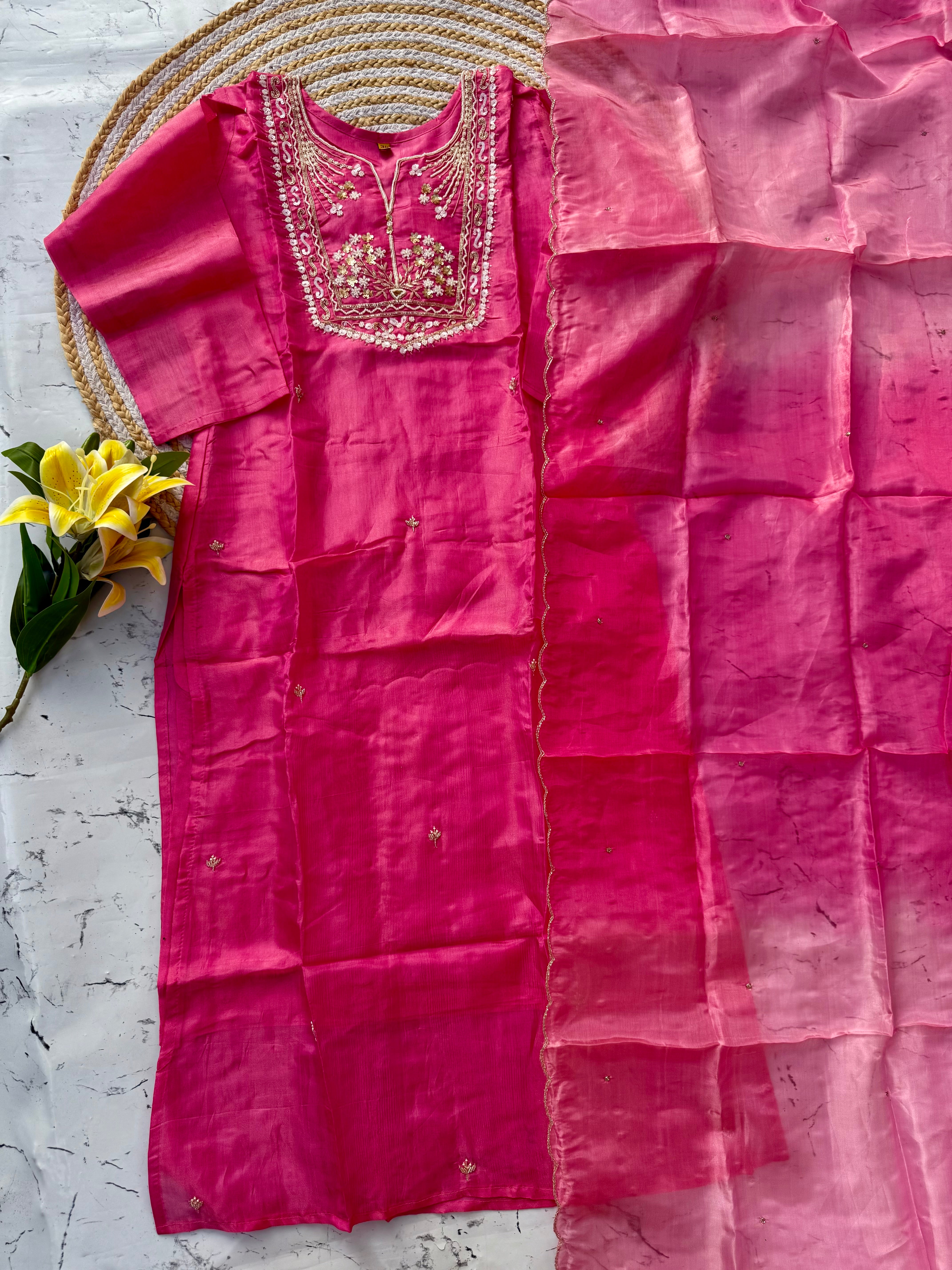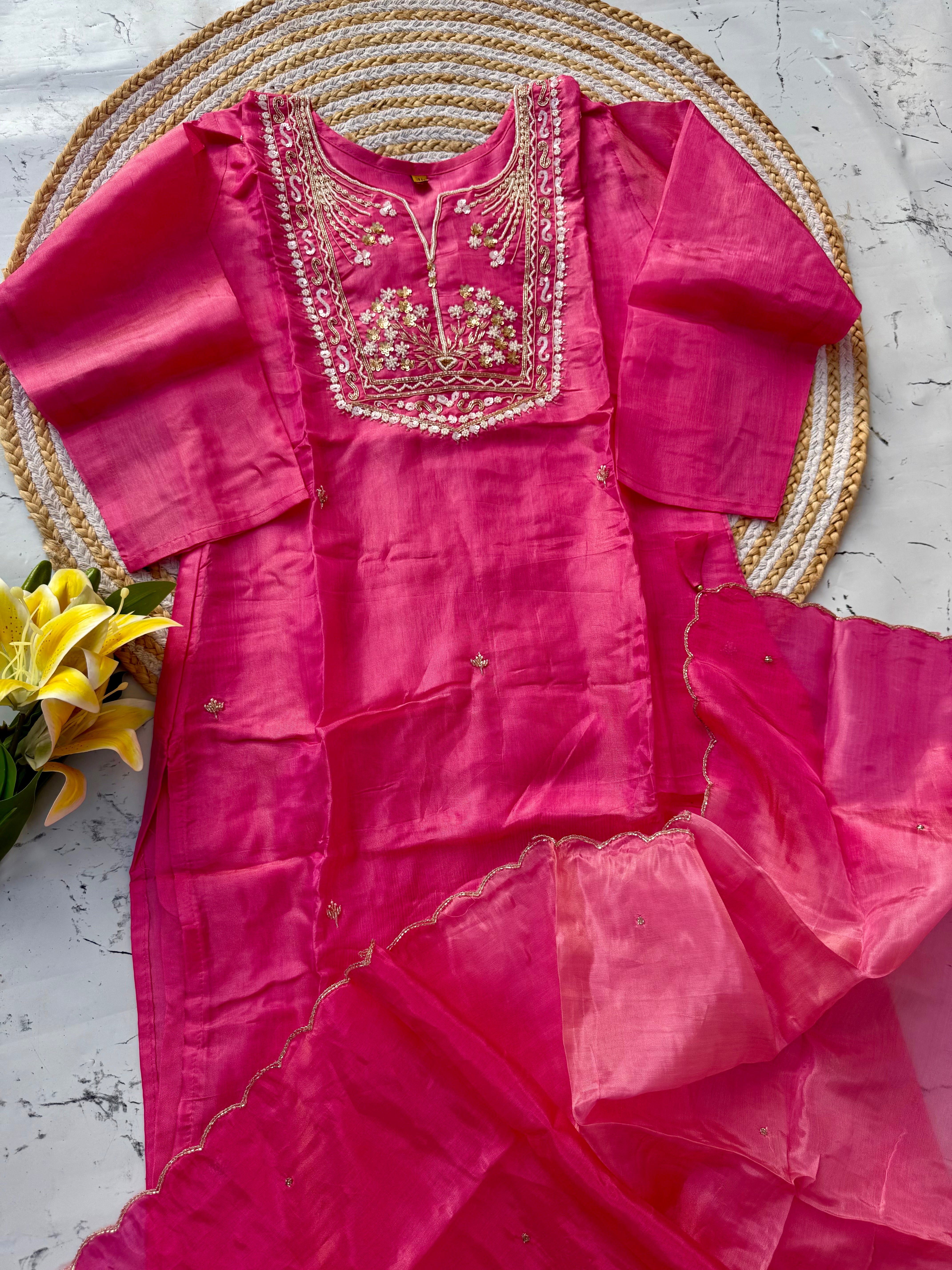 Beautiful Tissue silk kurta with with handwork on the yoke of the kurta with a long organza dupatta with pearl work details & a dola silk bottom