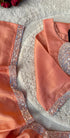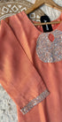Beautiful Peach with gold tone shimmer tissue kurta set with intricate handwork on the yoke and sleeve with a heavy handwork scallop viscose organza dupatta paired with a plane silk plazzo