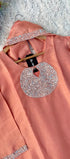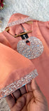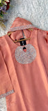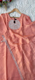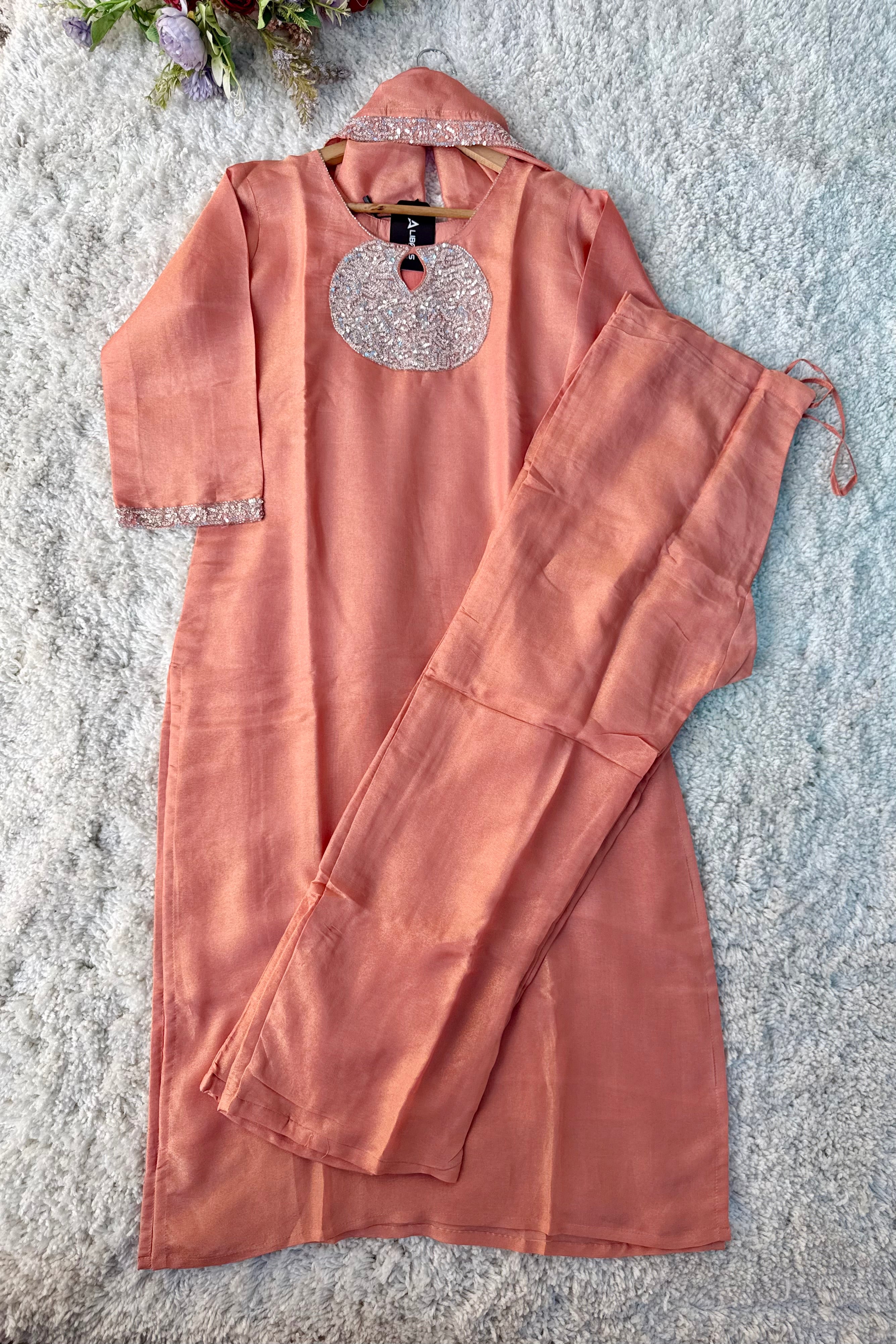 Beautiful Peach with gold tone shimmer tissue kurta set with intricate handwork on the yoke and sleeve with a heavy handwork scallop viscose organza dupatta paired with a plane silk plazzo
