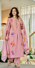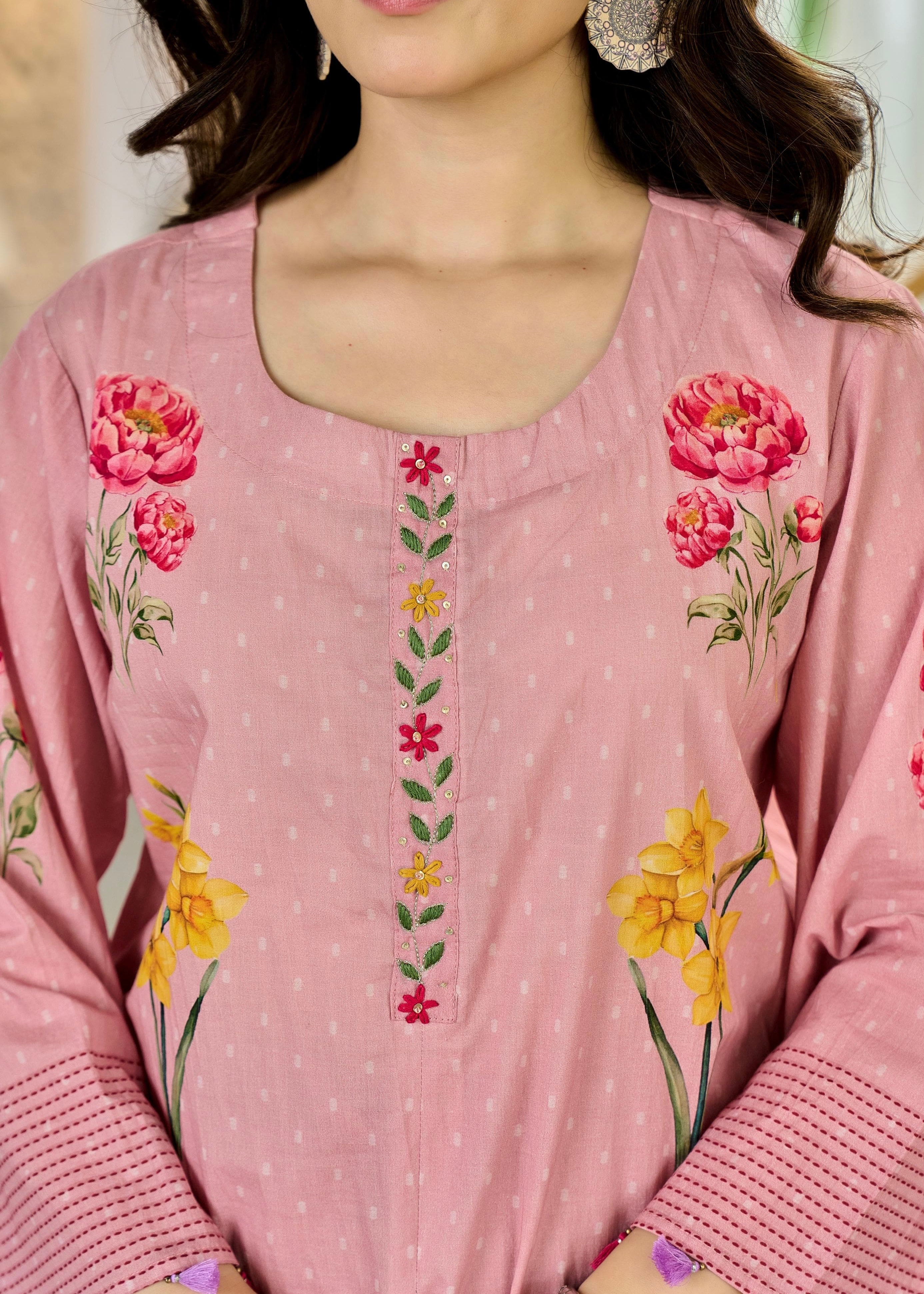 Premium cotton kurta pant dupatta set with handwork on the neck line and printed work all over the top with long printed cotton dupatta and a cotton bottom