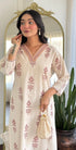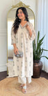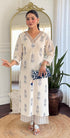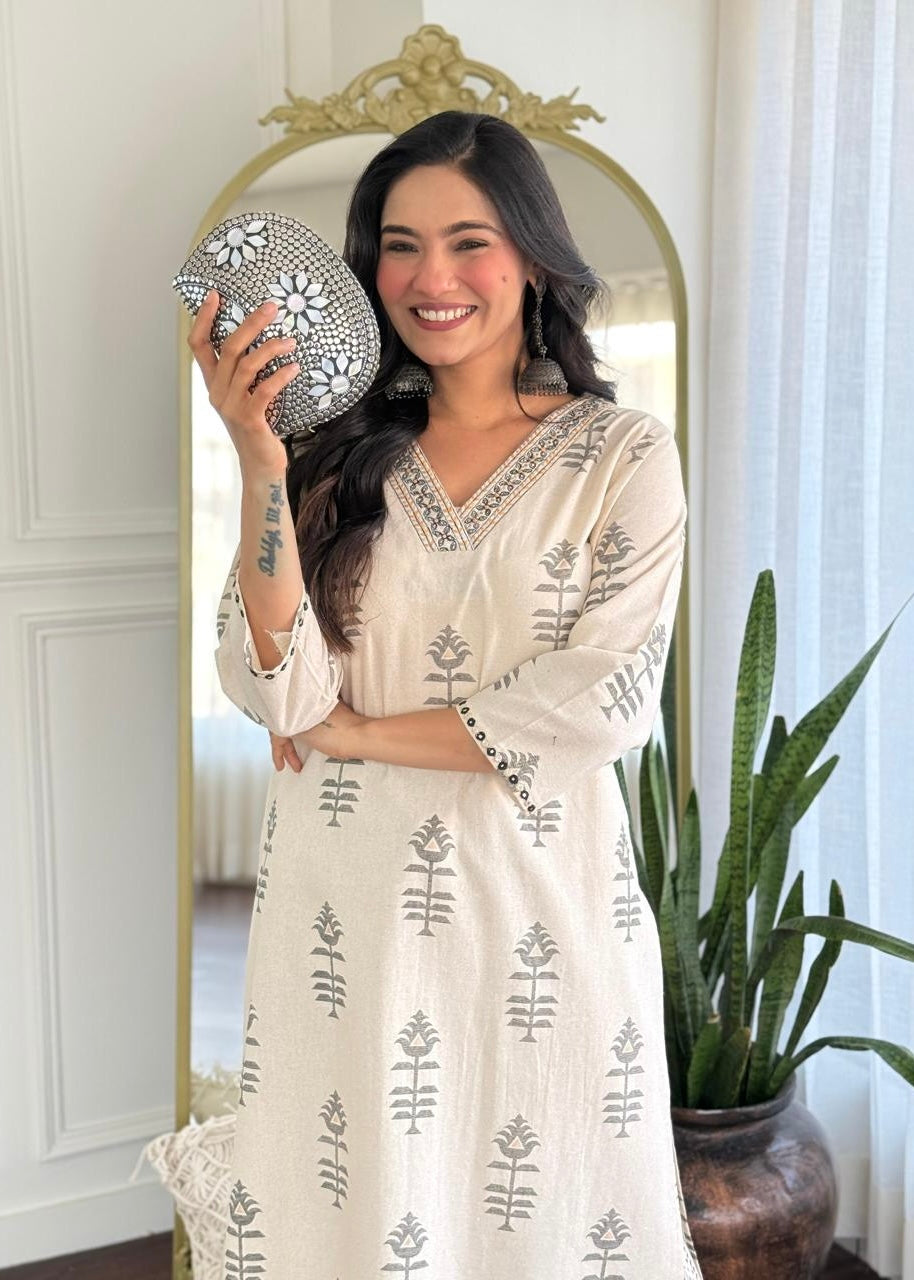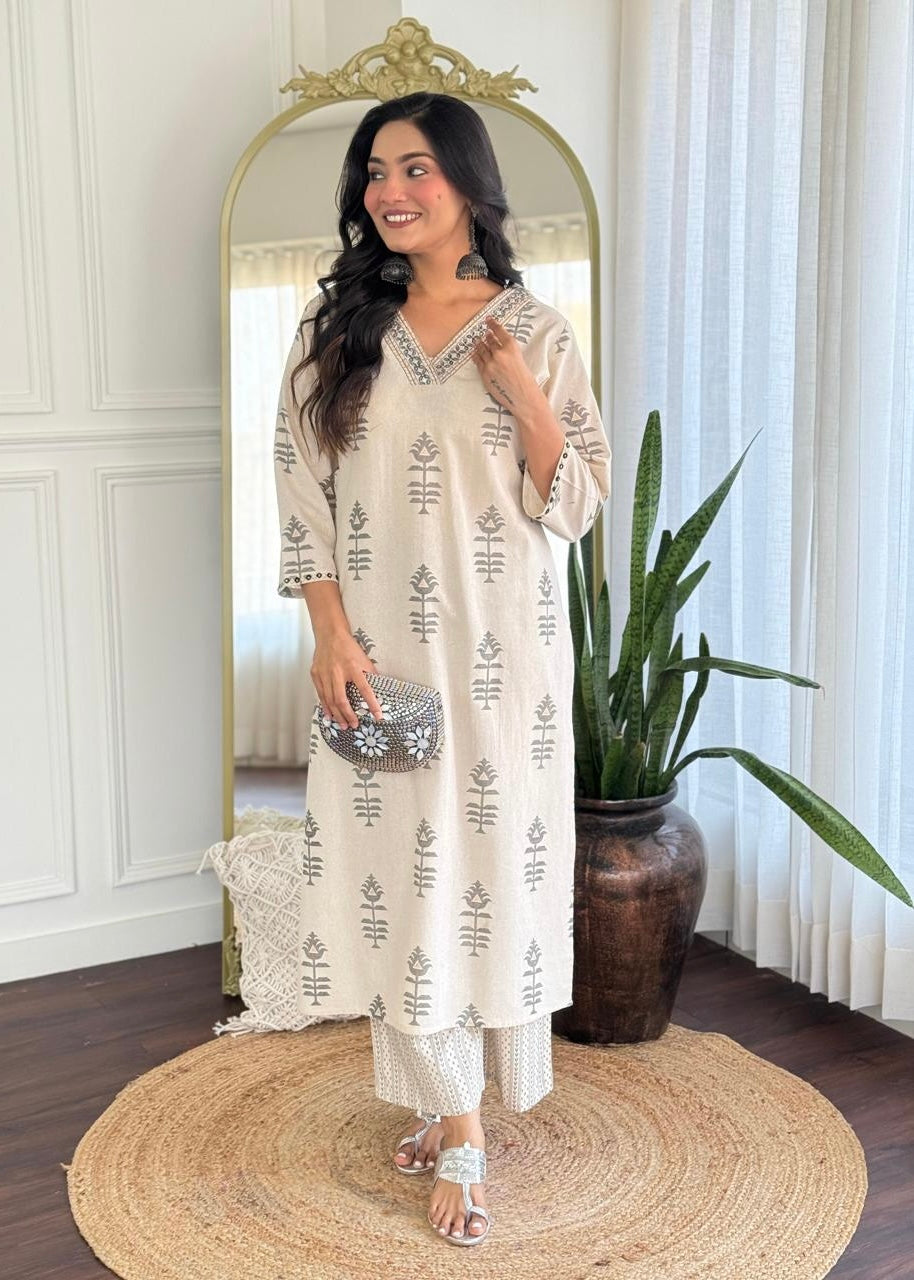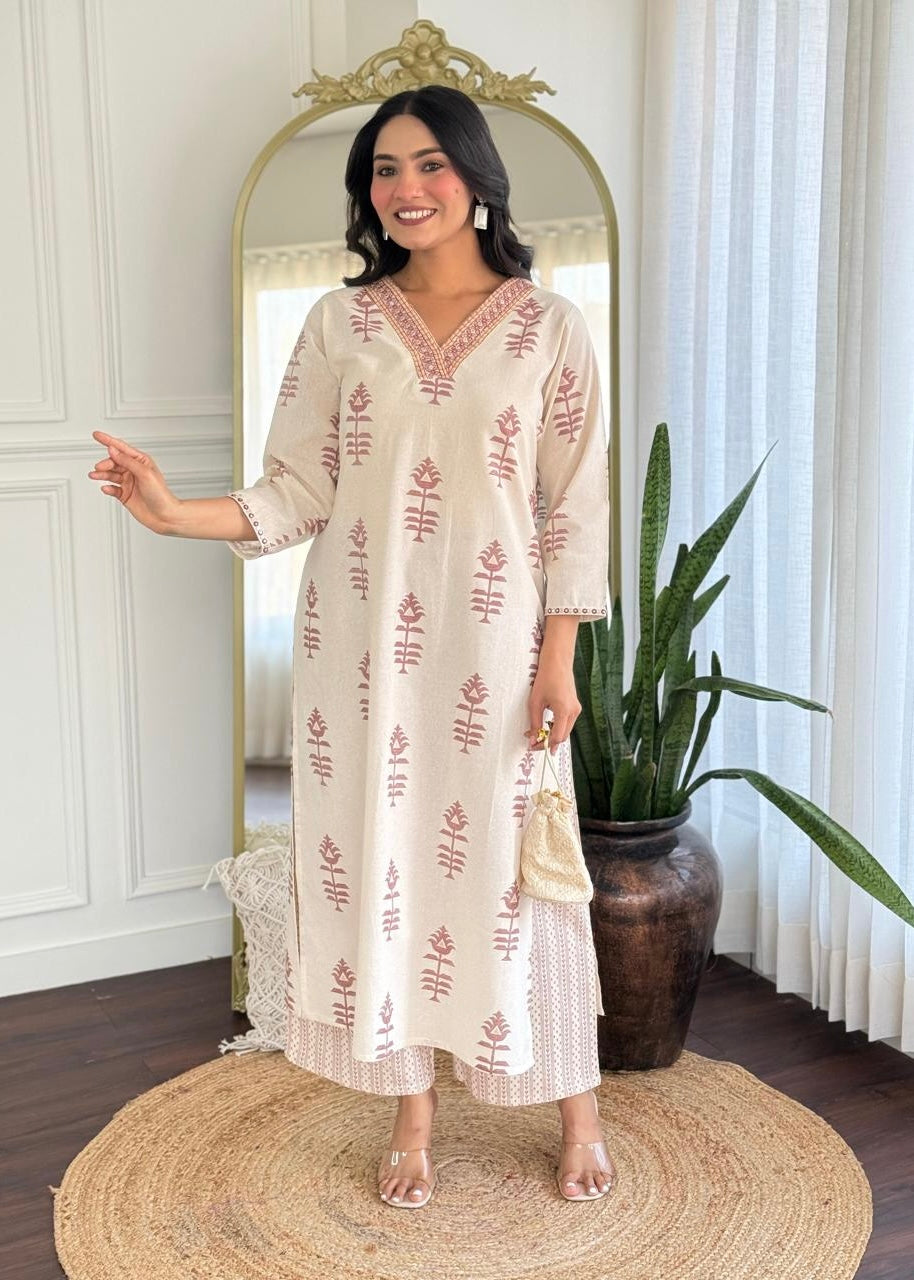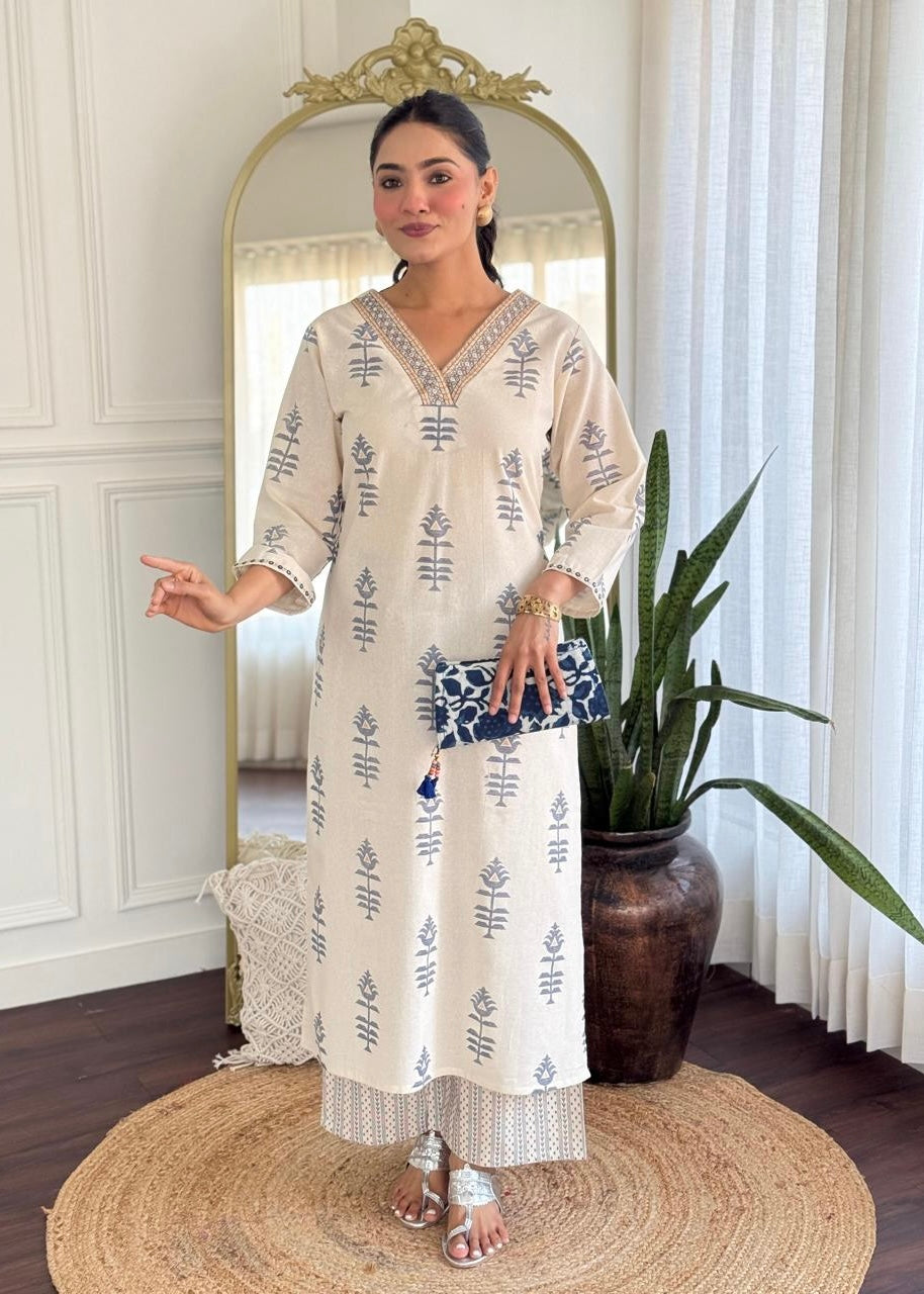 cotton kurti pant set with handwork on the yoke & sleeve with printed work all over the kurta with a cotton bottom