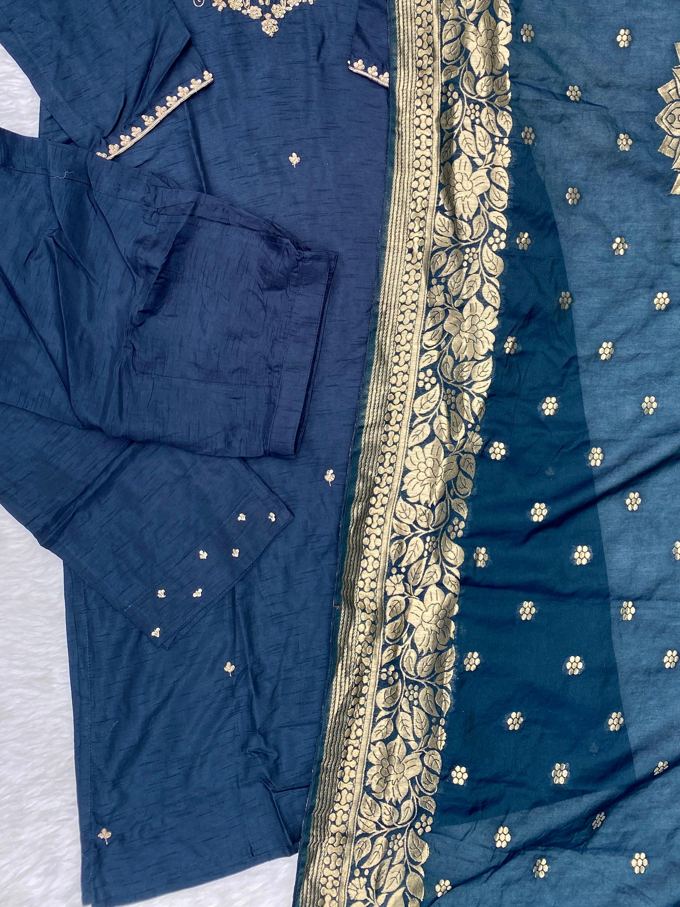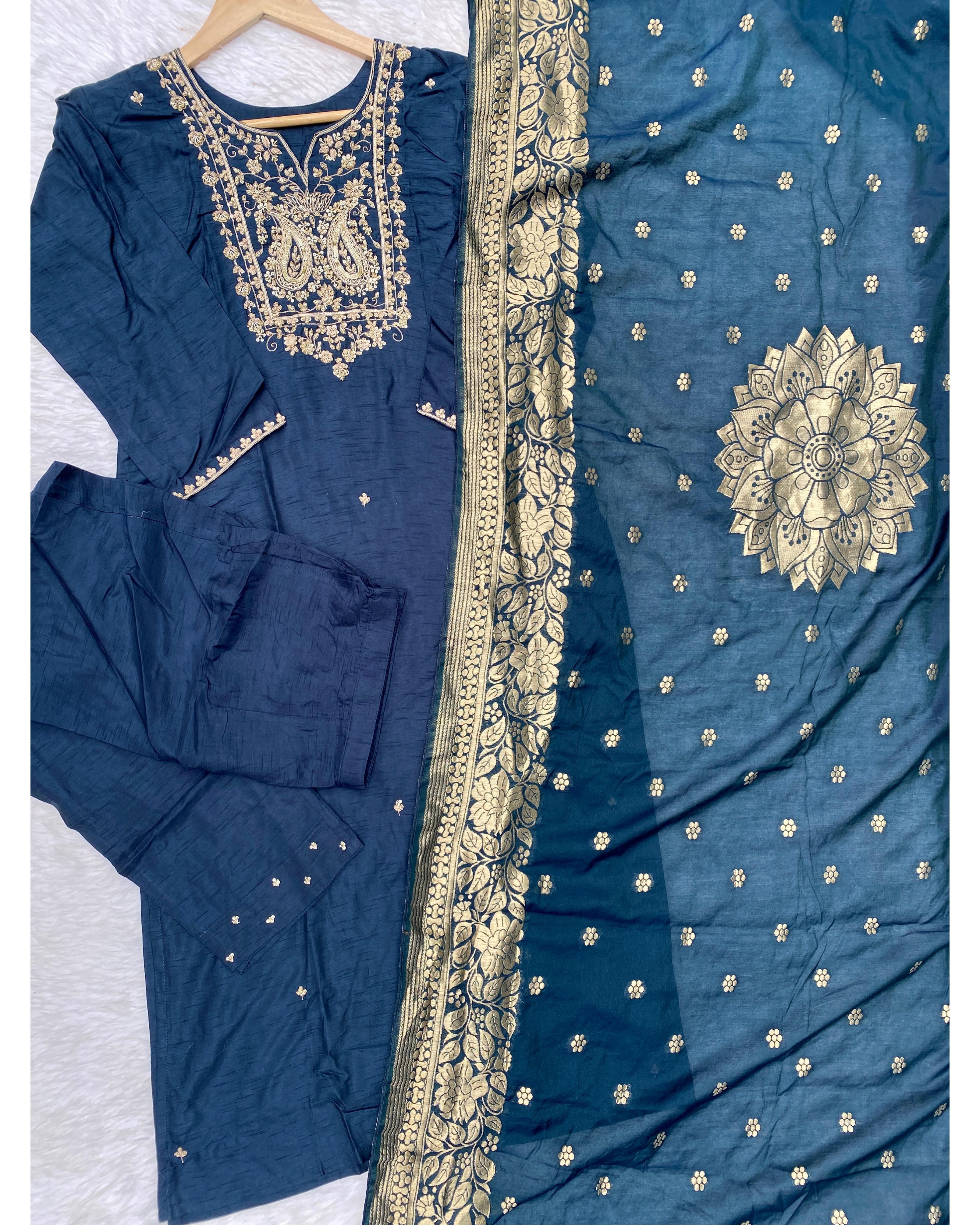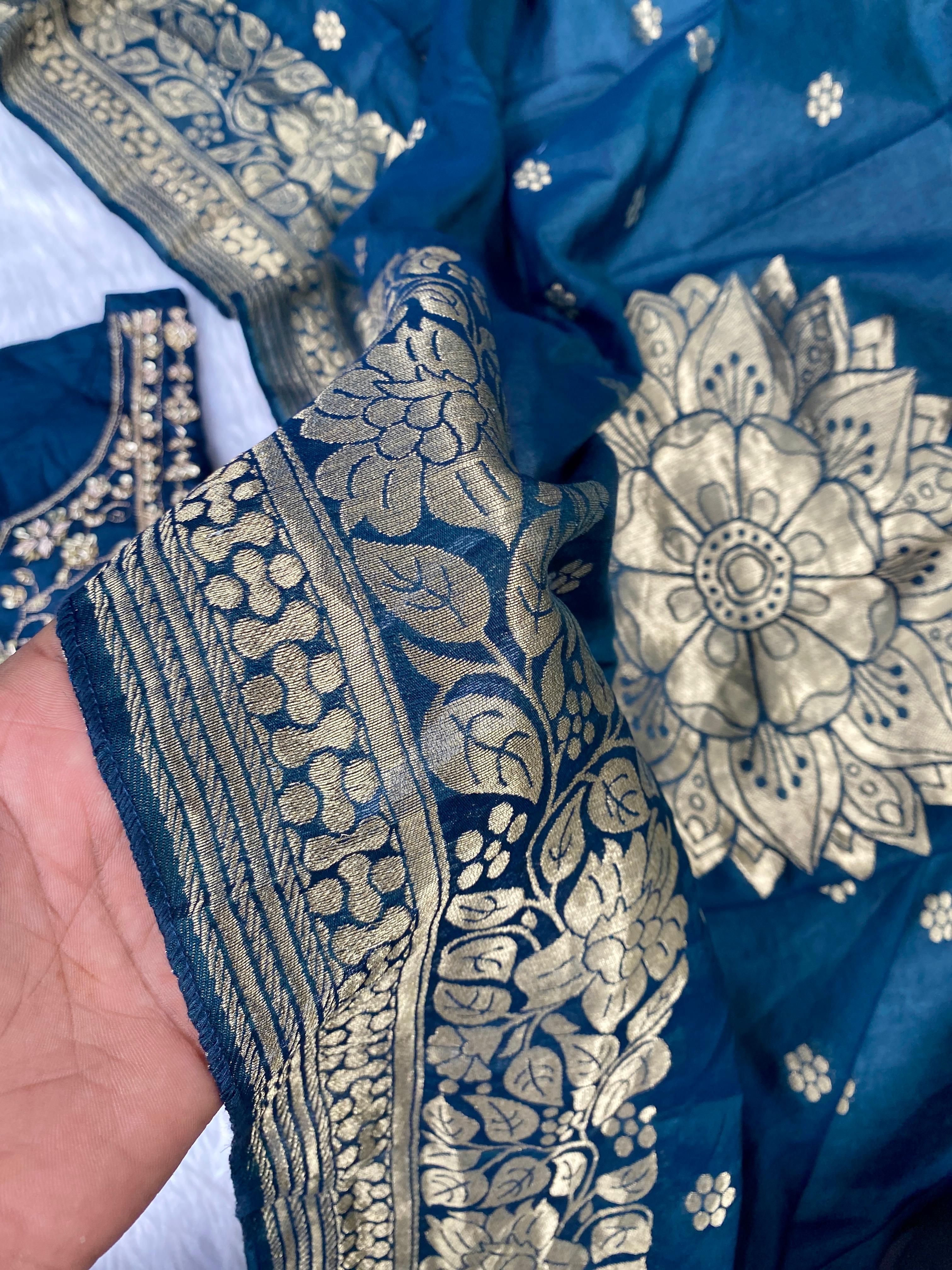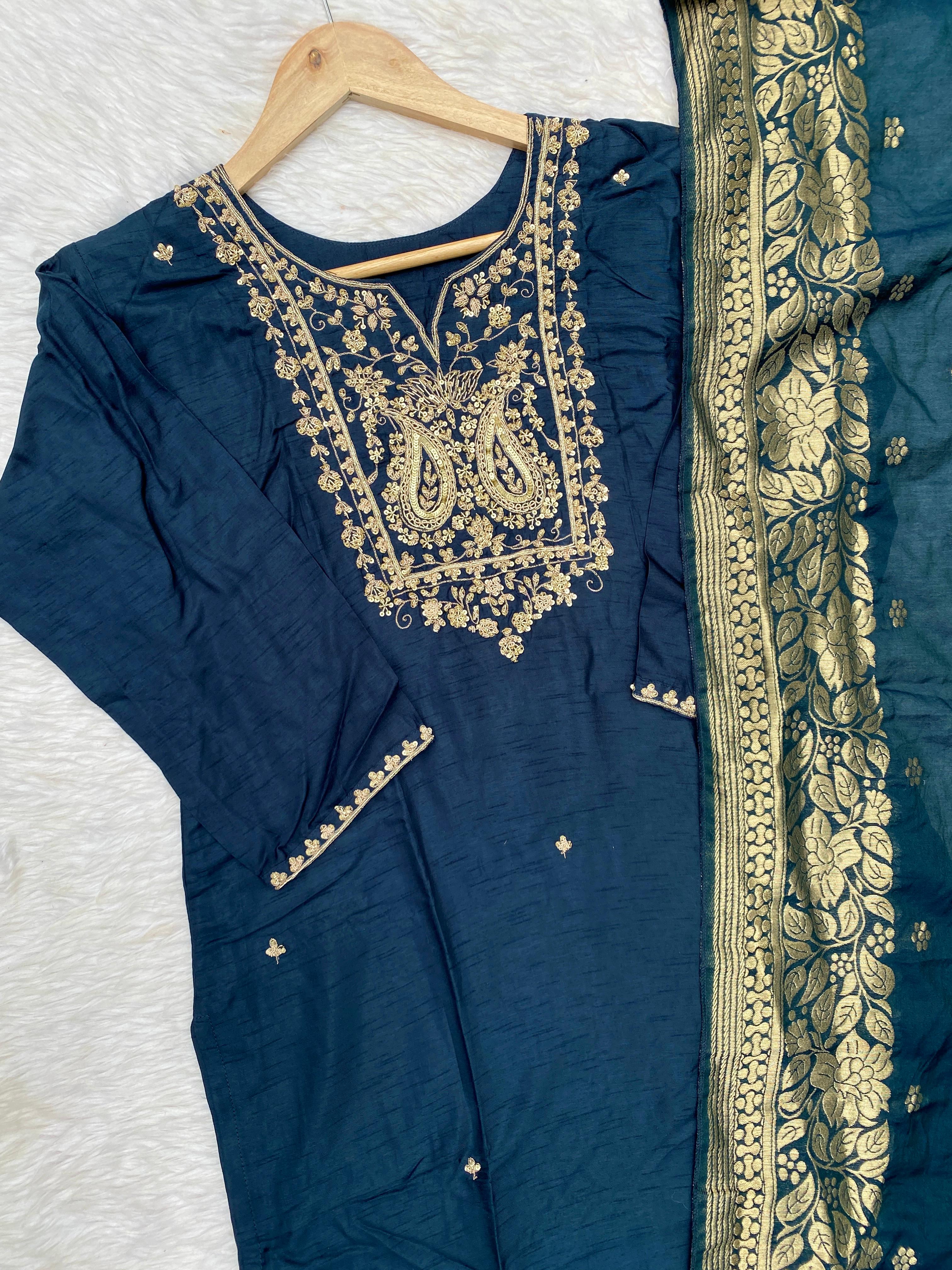 premium Dola silk straight kurti with handwork detailing all over the kurta with a long banarsi dupatta and silk bottom with work