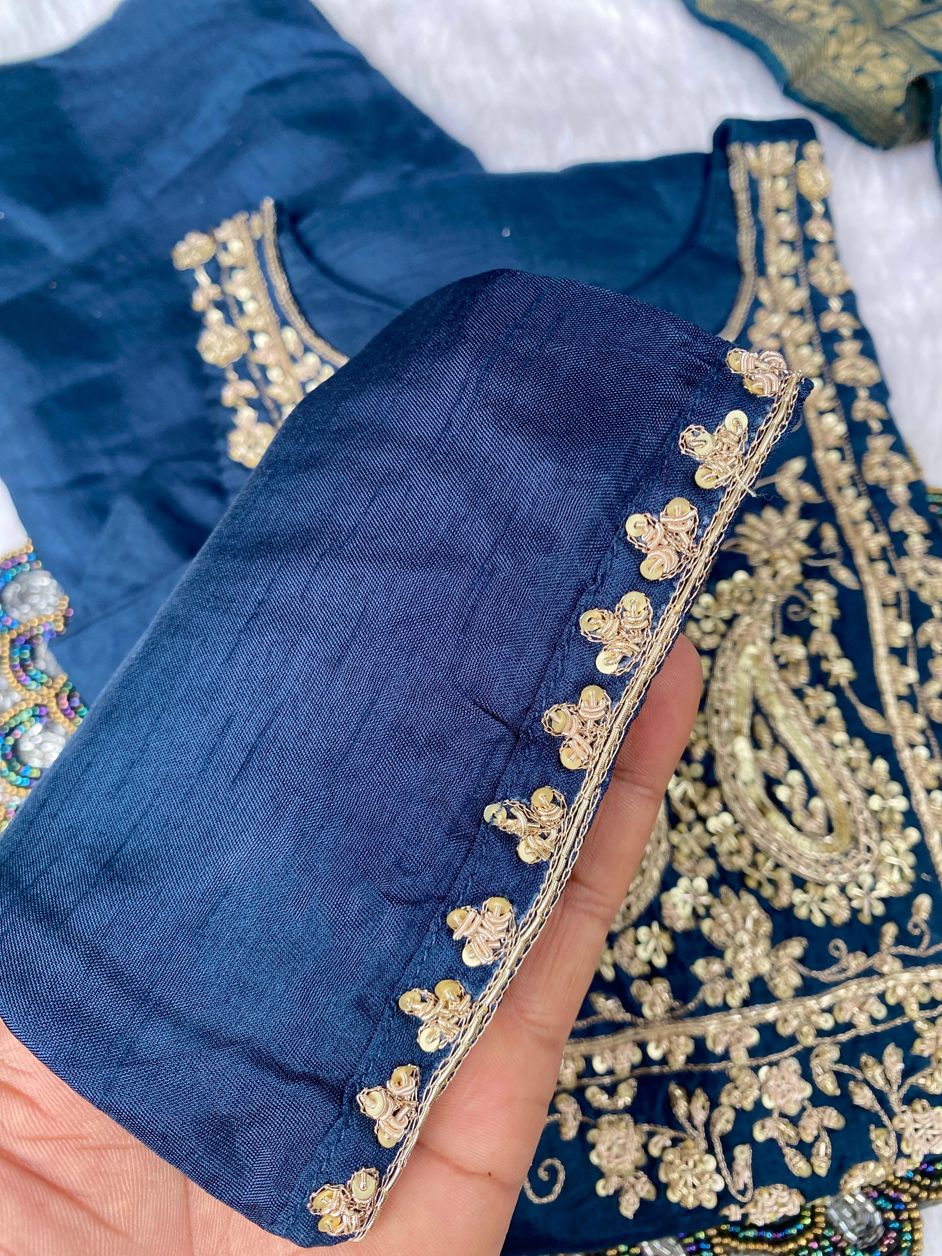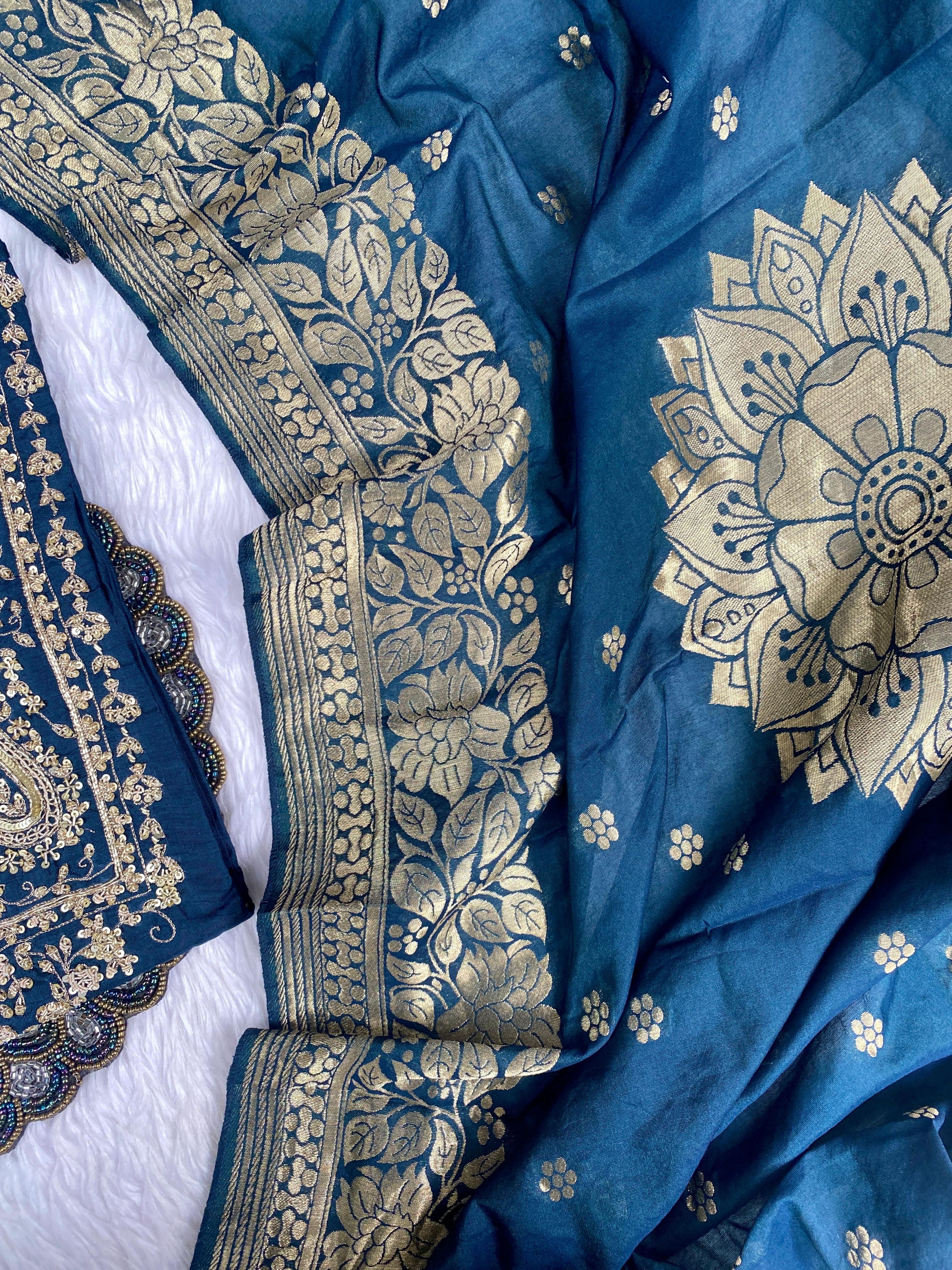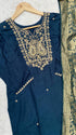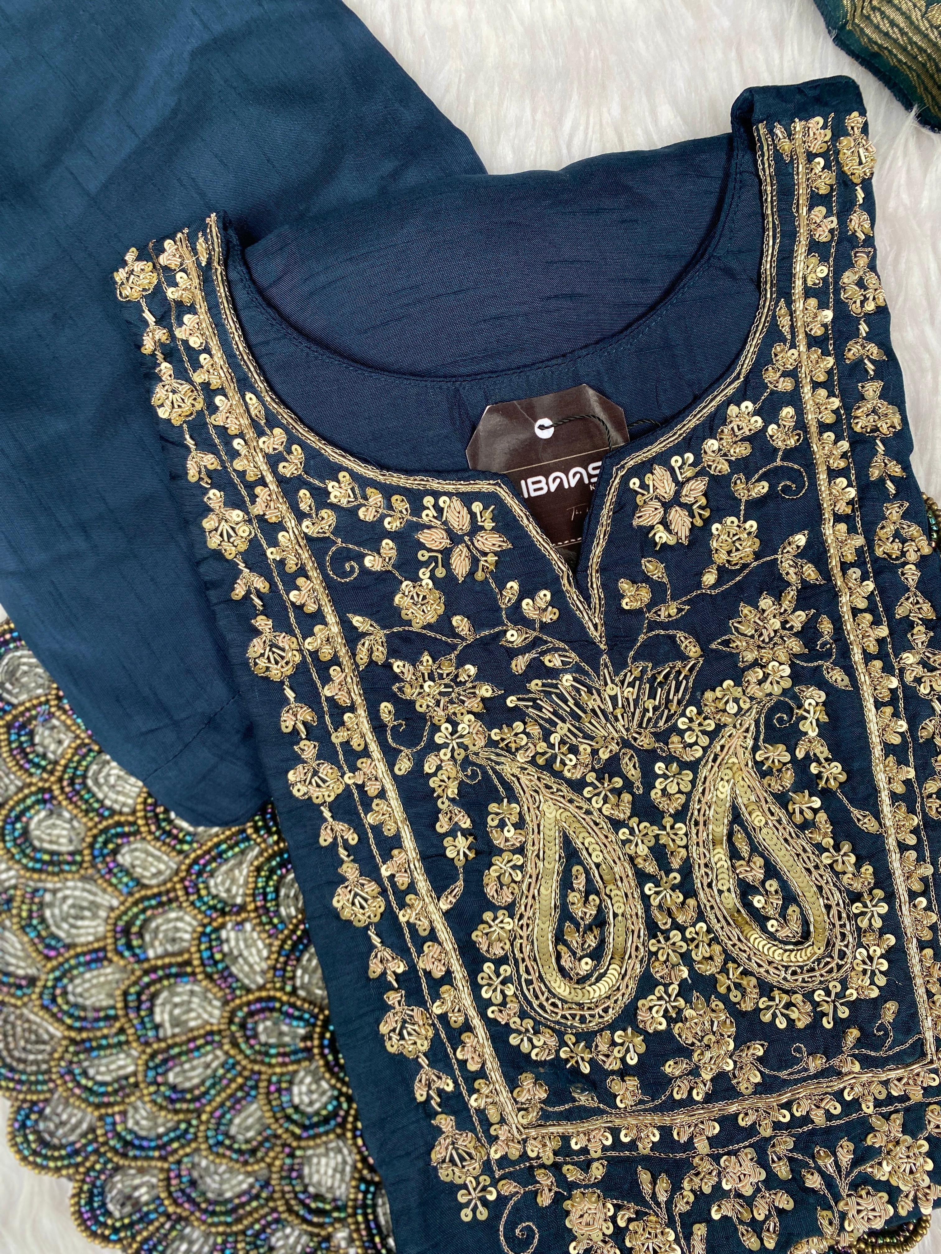 premium Dola silk straight kurti with handwork detailing all over the kurta with a long banarsi dupatta and silk bottom with work