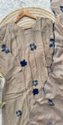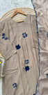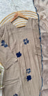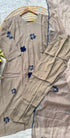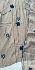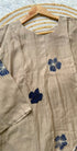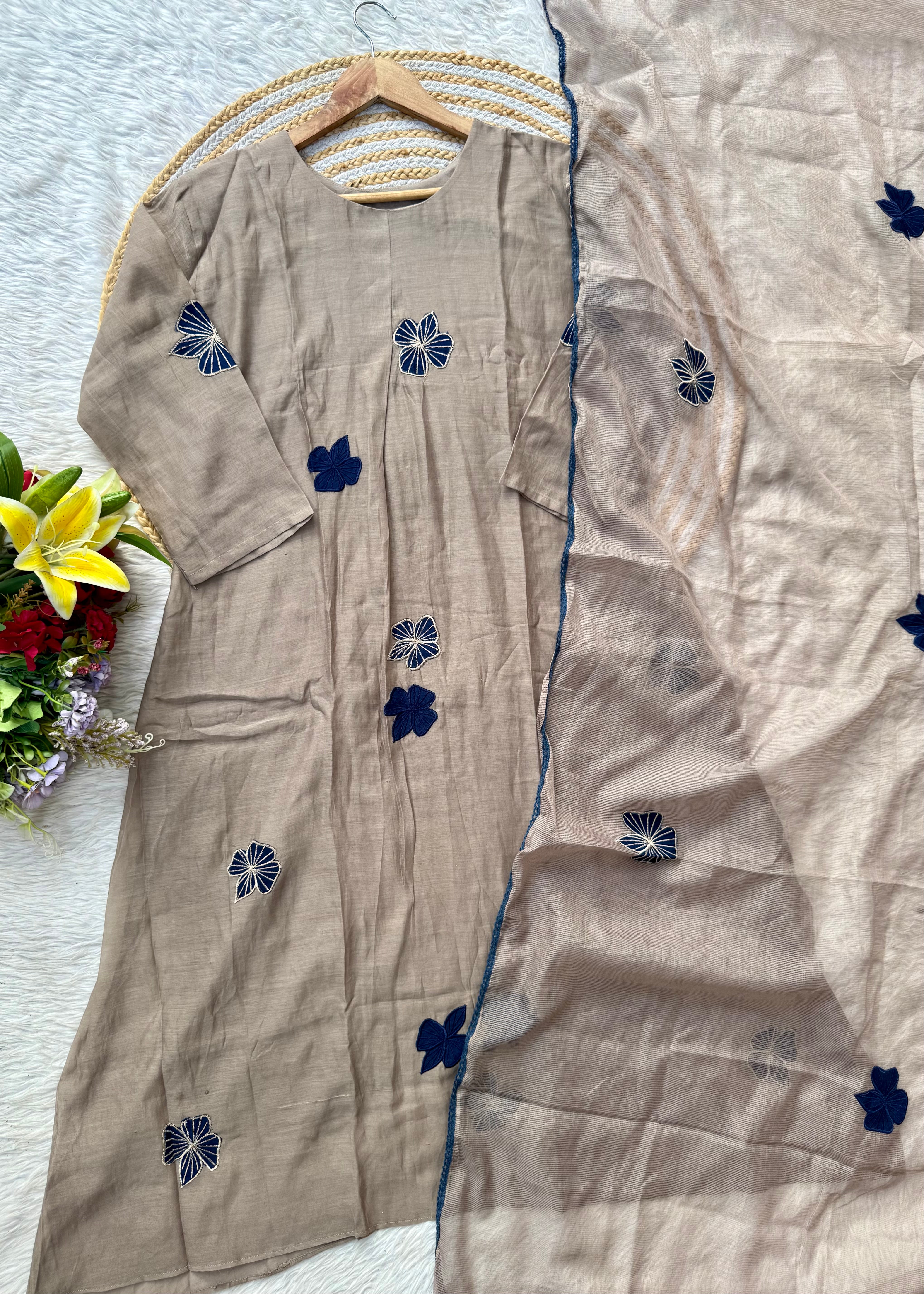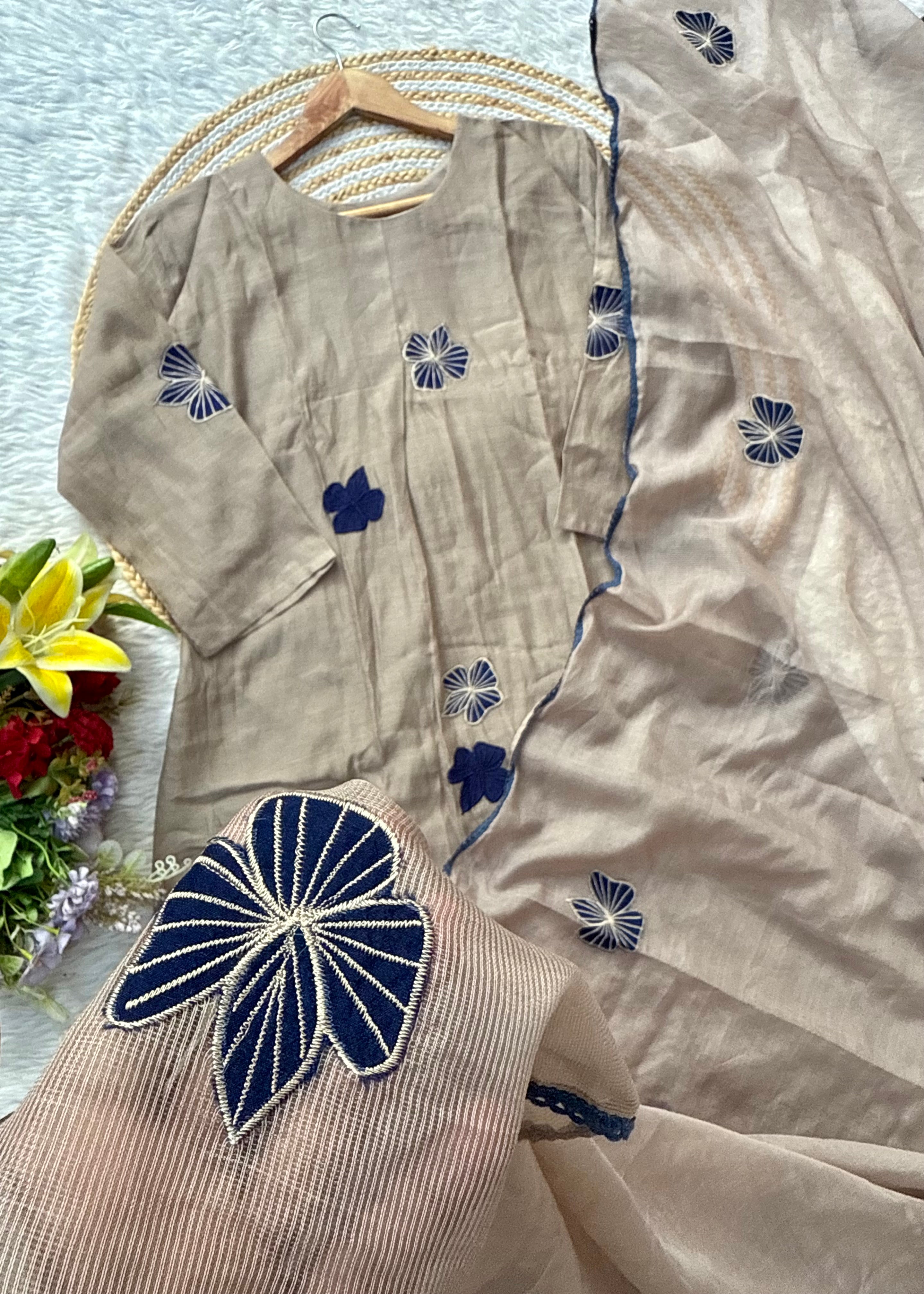 Premium mul Chanderi A line kurti with applique work on the yoke sleeves & Daman of the top with a handwork detailed mul Chanderi dupatta and a silk bottom with poker