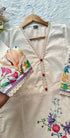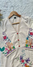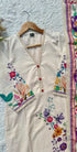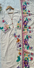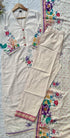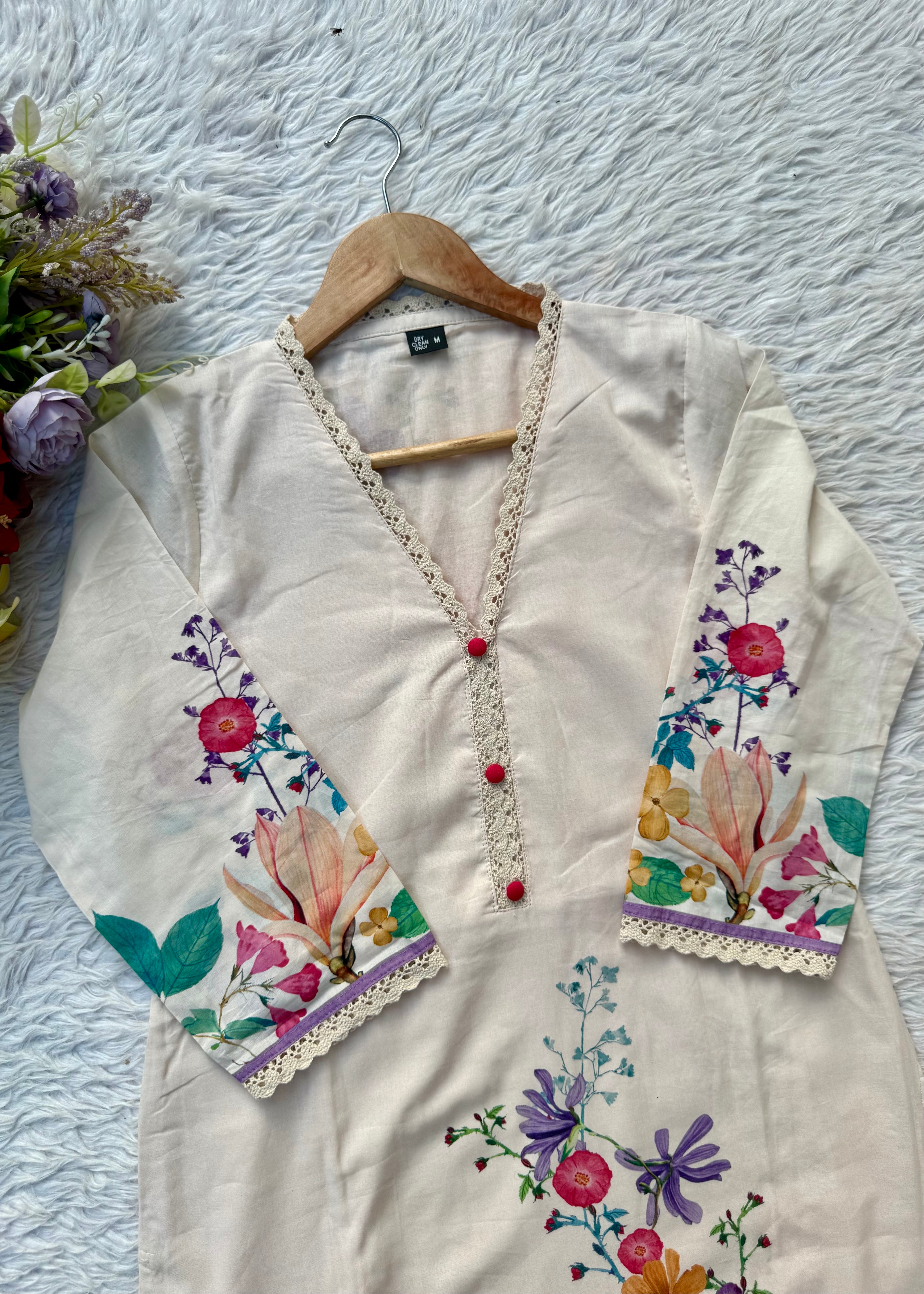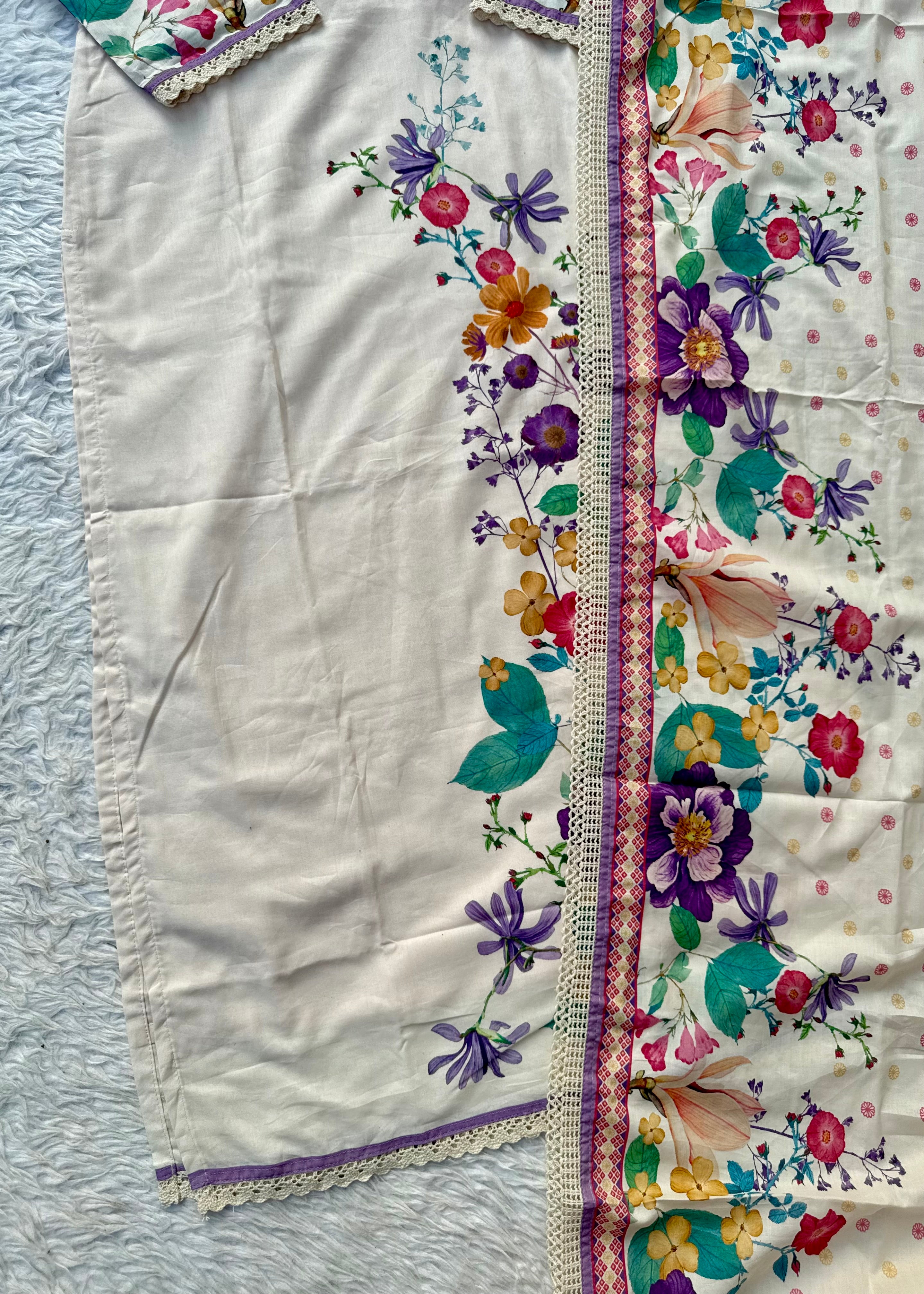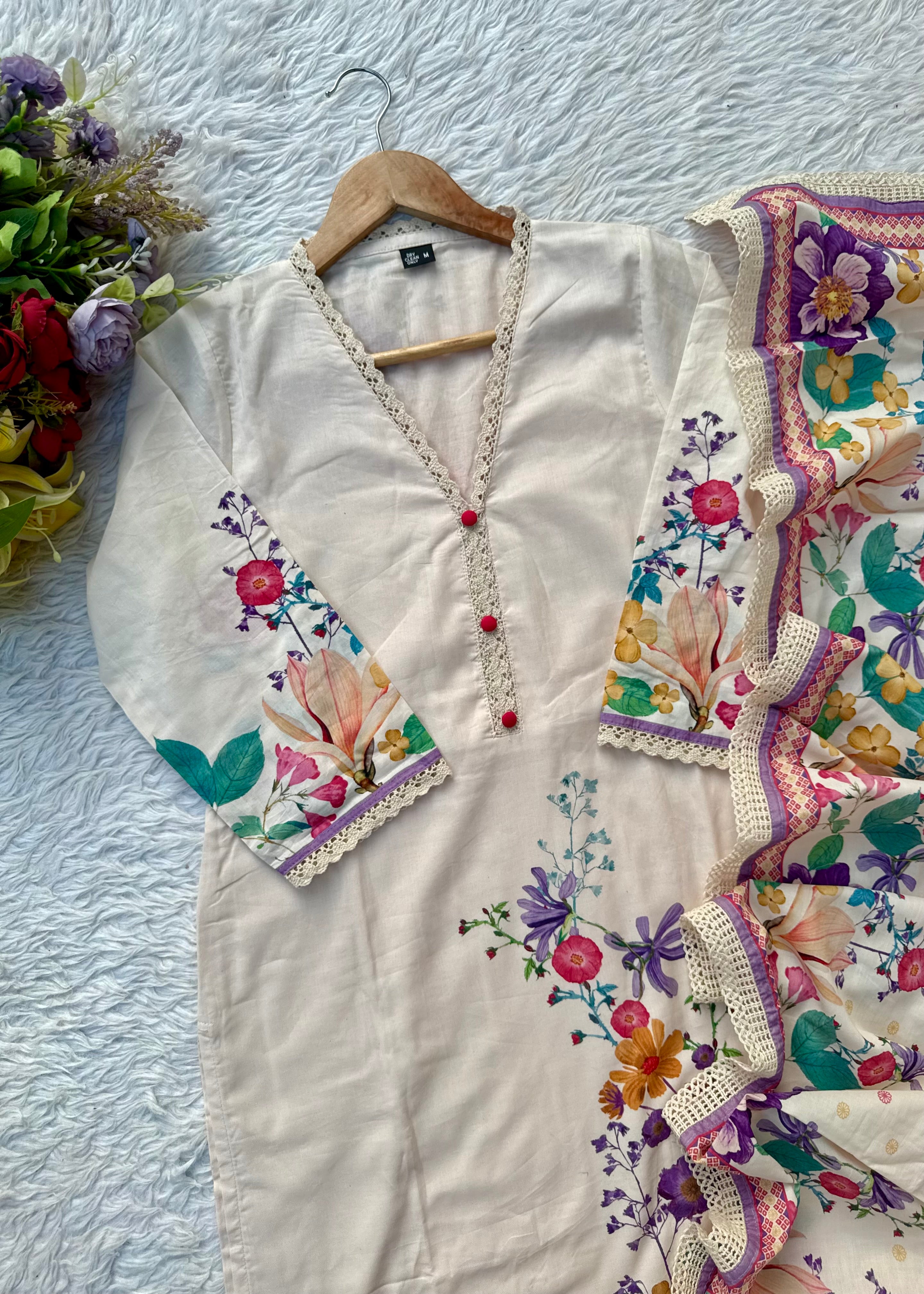 Mul cotton kurti pant dupatta set with lace work on the yoke & sleeve with printed work all over the kurta with a mul cotton bottom