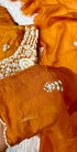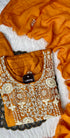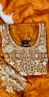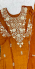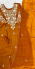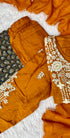 A very beautiful festival wear special rust orange kurta set with heavy work on the yoke of kurta and sleeve, with a long scallops chiffon dupatta and a silk bottom