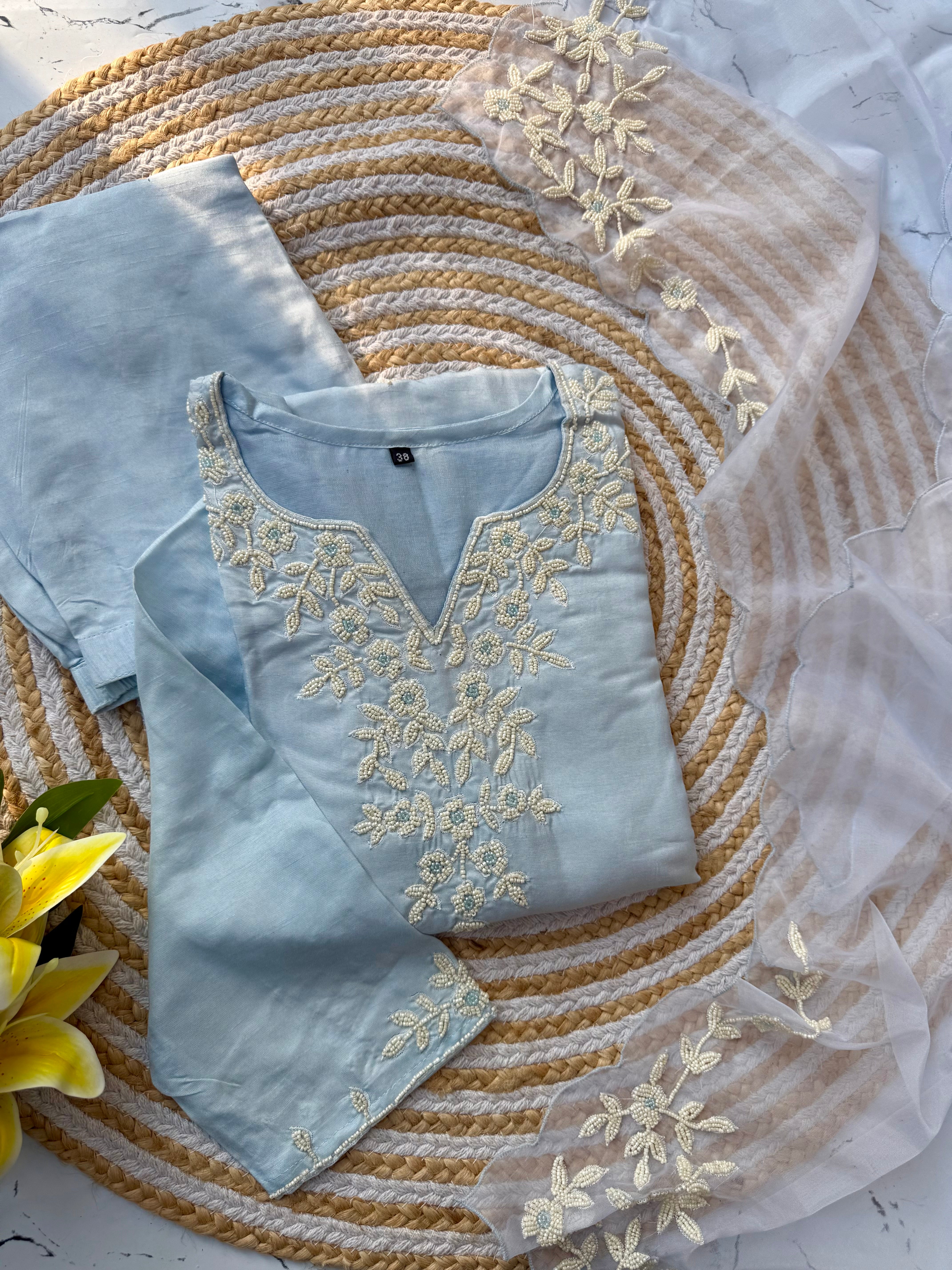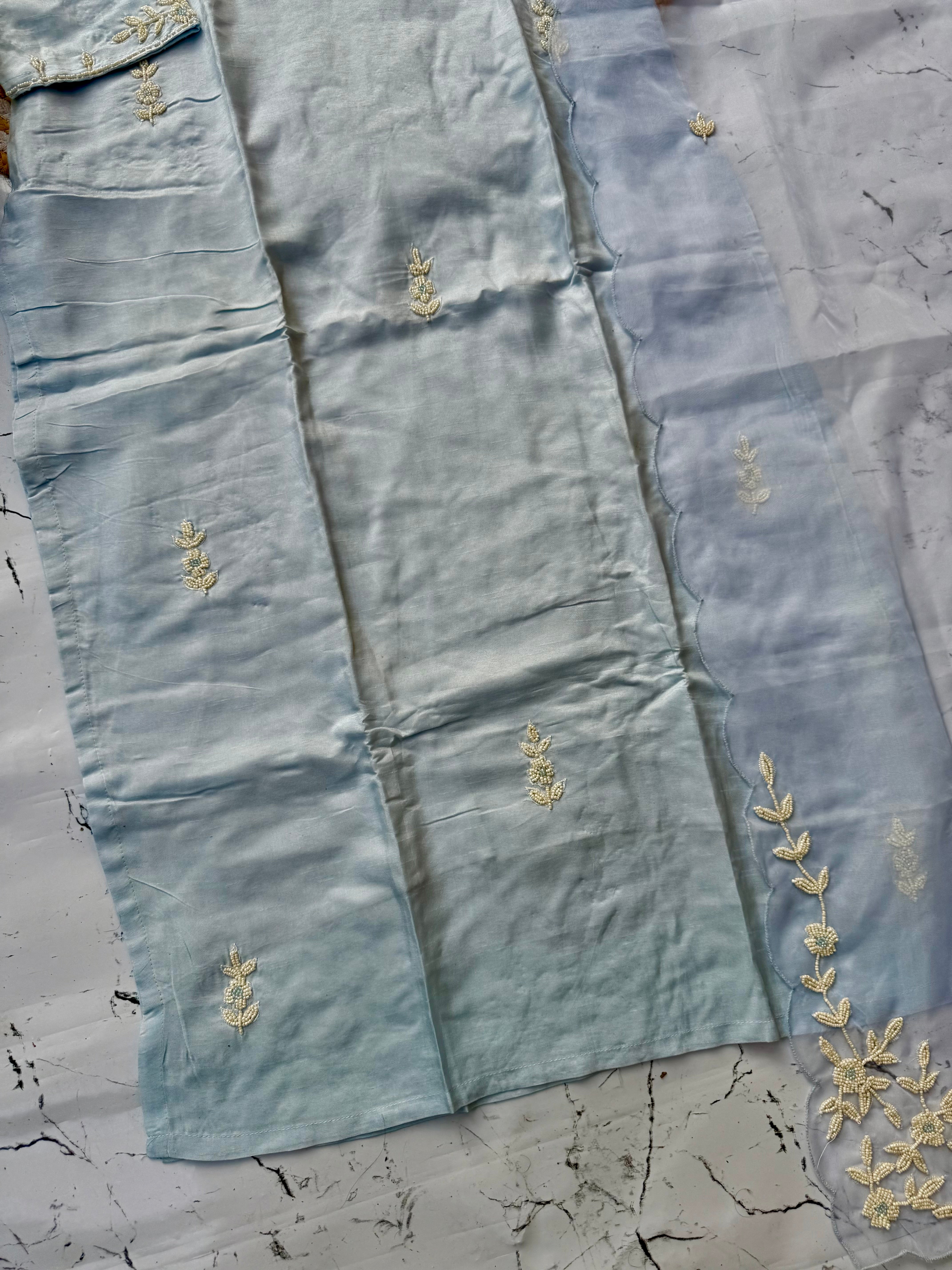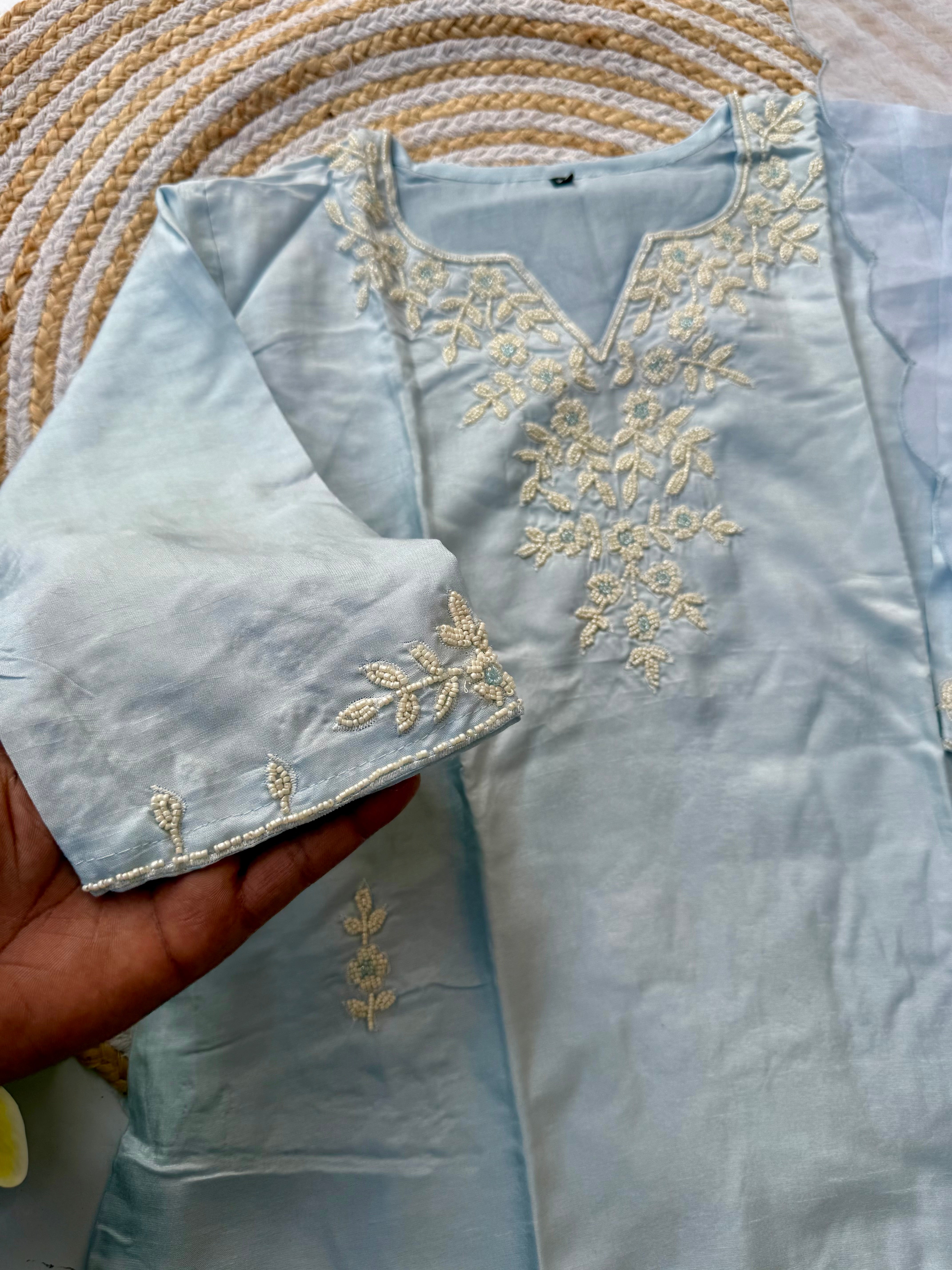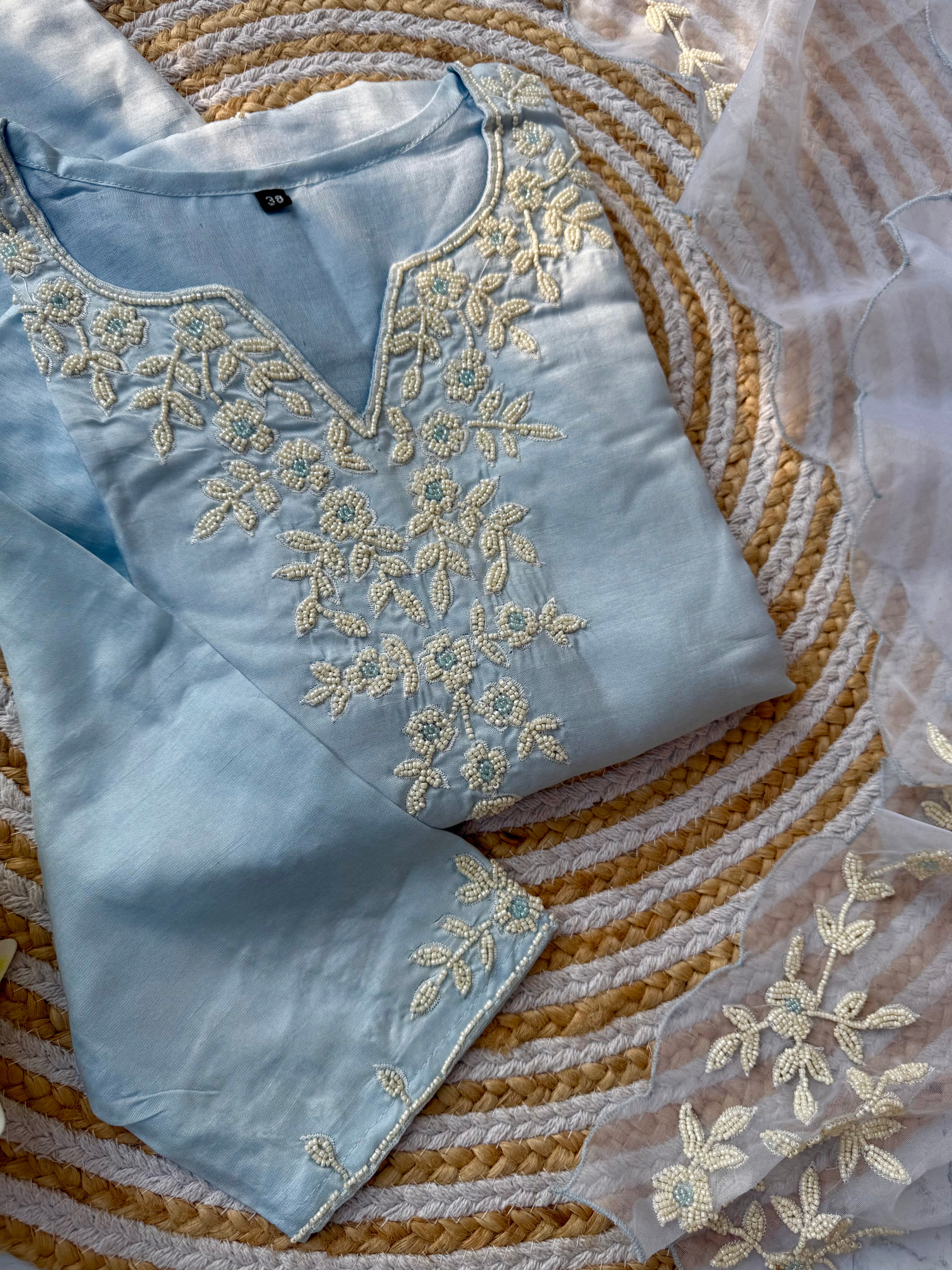 Beautiful dola silk kurta with with pearl work on the yoke & sleeves of the kurta with a long organza dupatta with pearl work details & a dola silk bottom with work