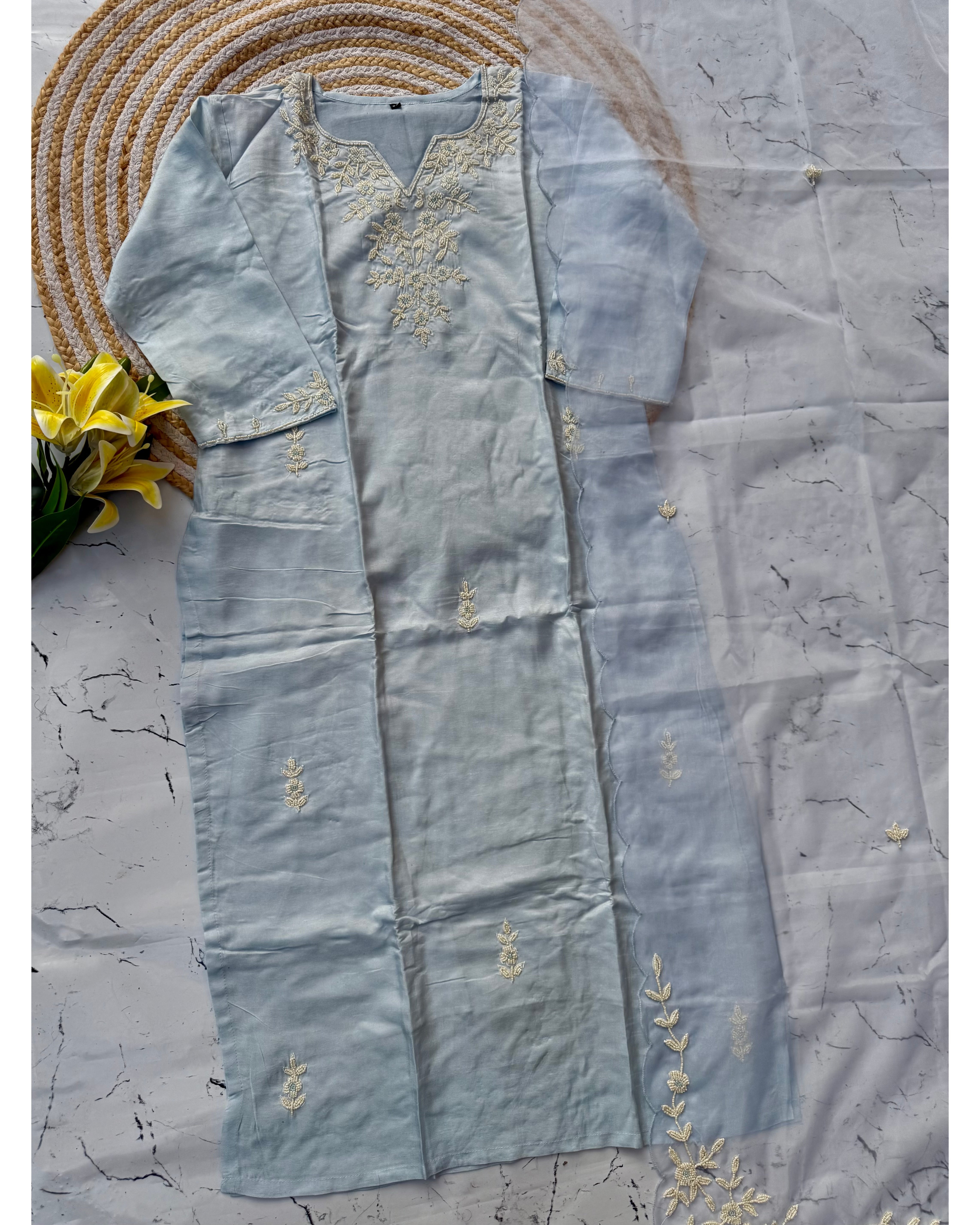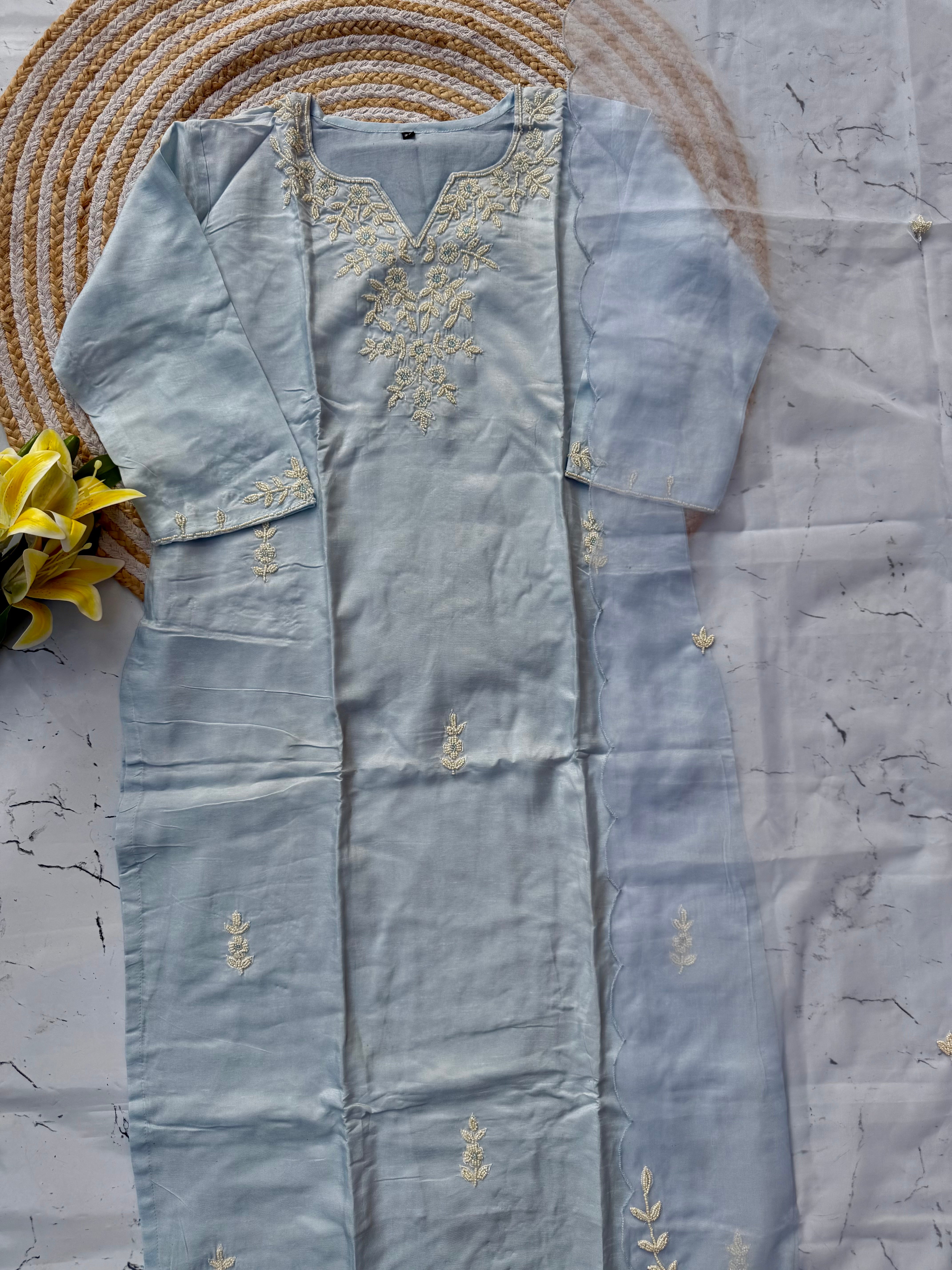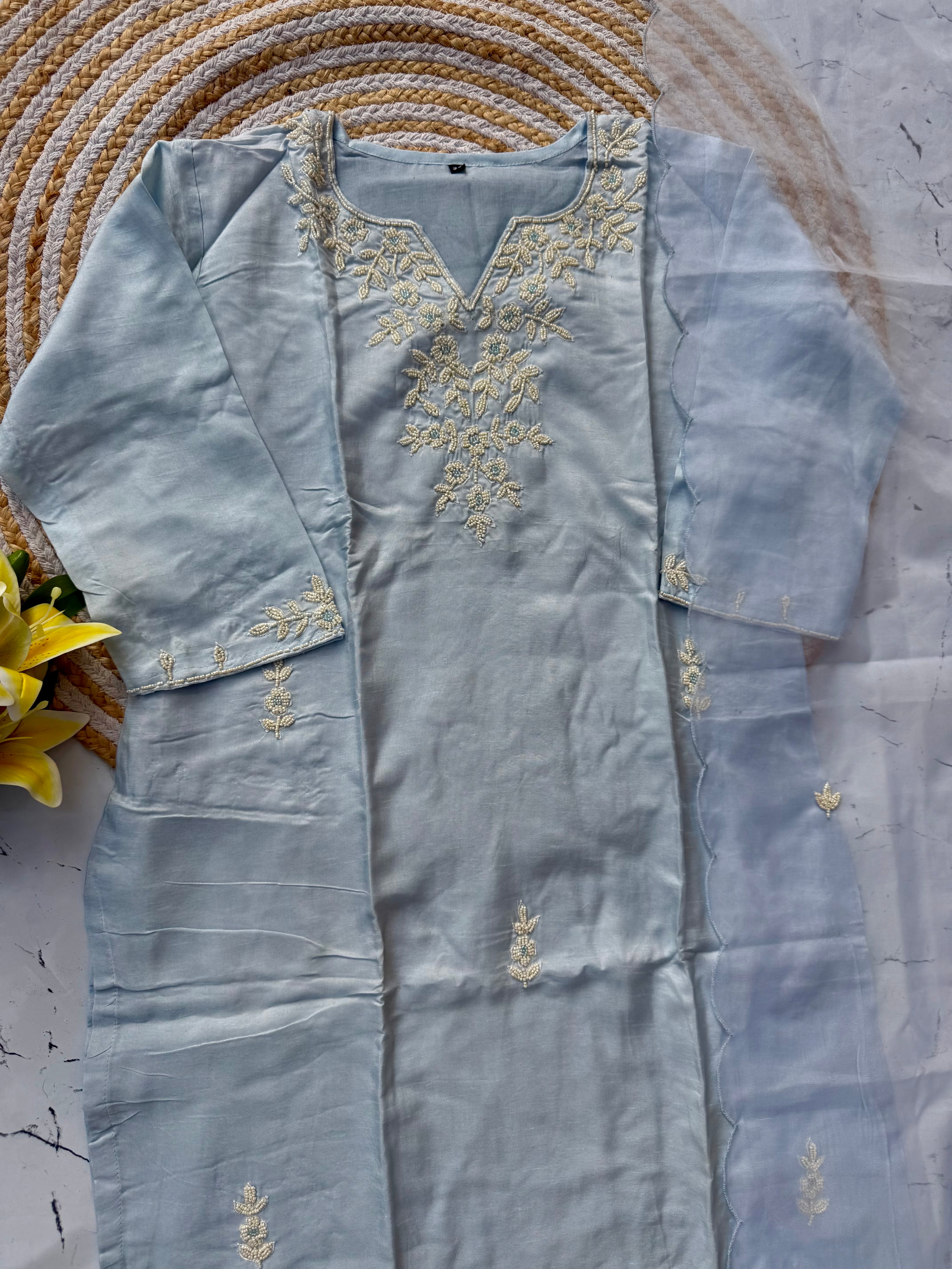Beautiful dola silk kurta with with pearl work on the yoke & sleeves of the kurta with a long organza dupatta with pearl work details & a dola silk bottom with work