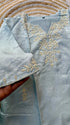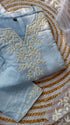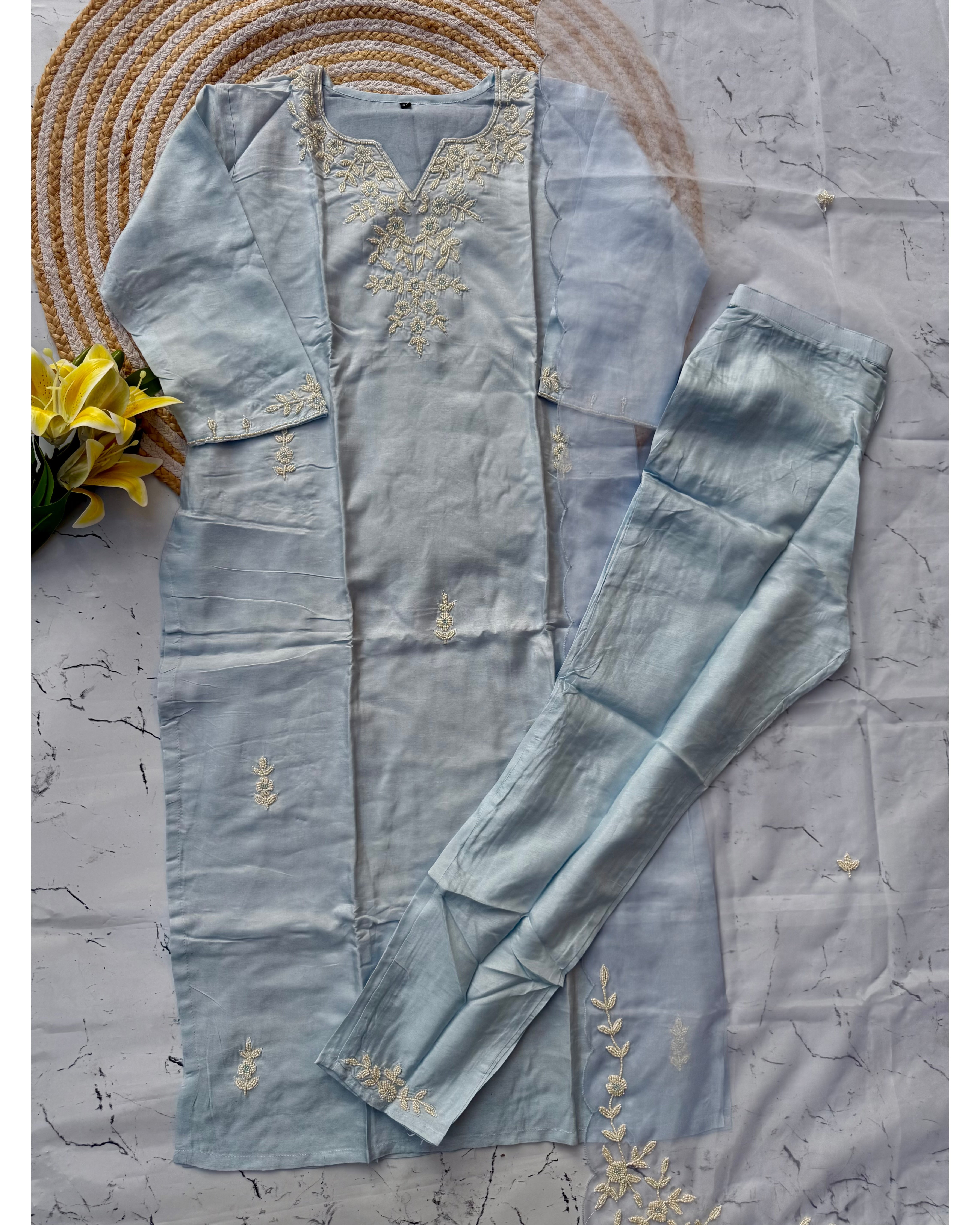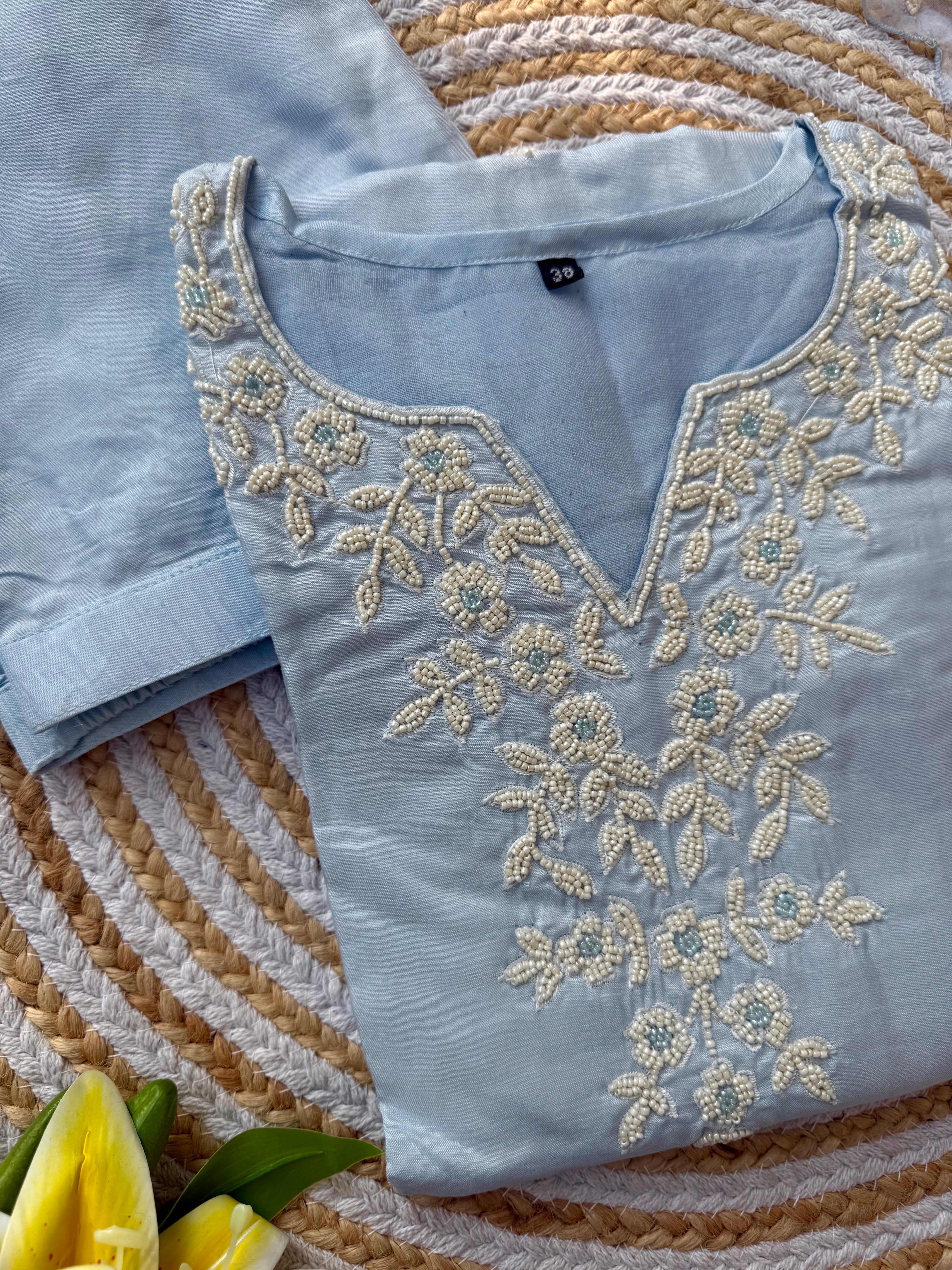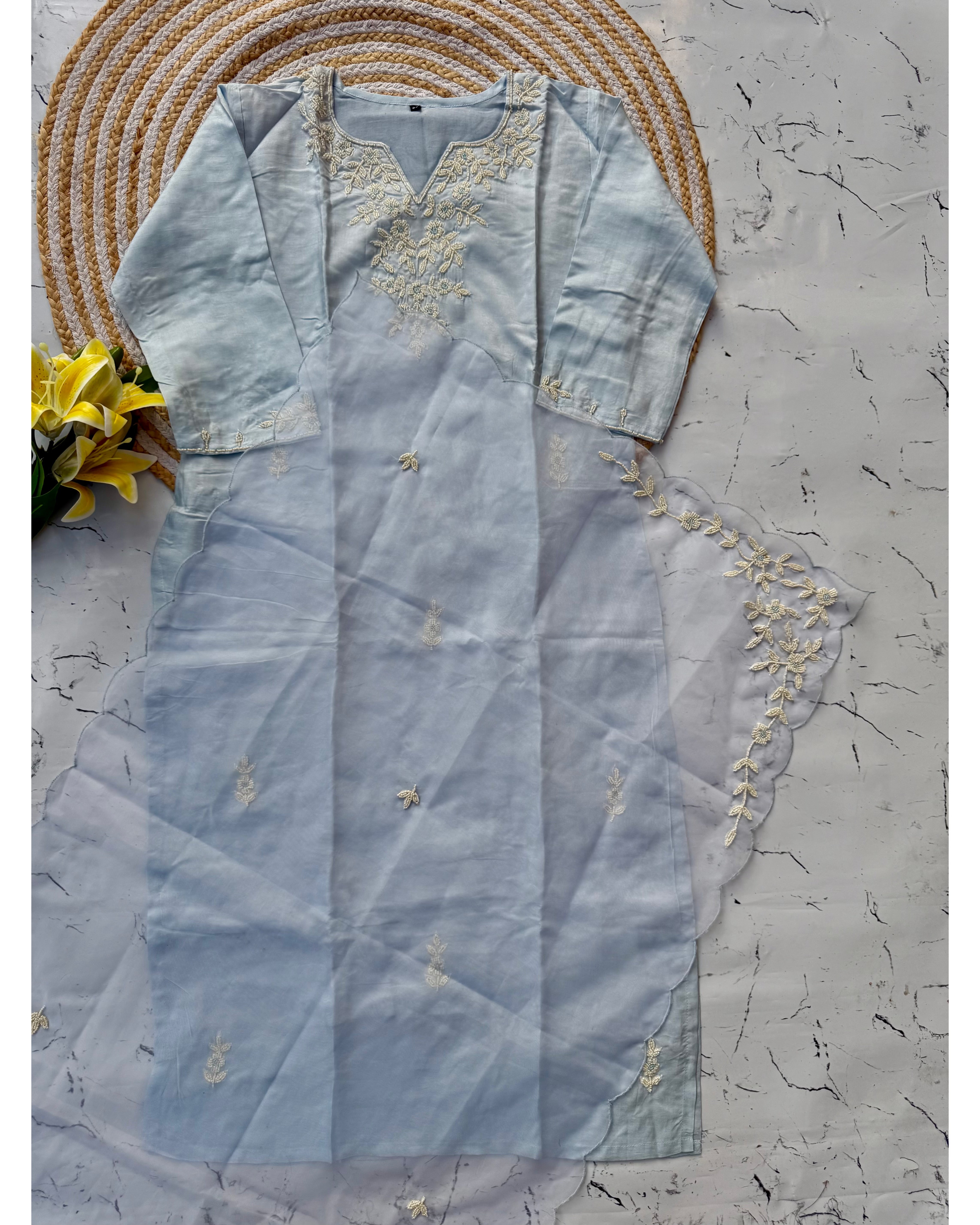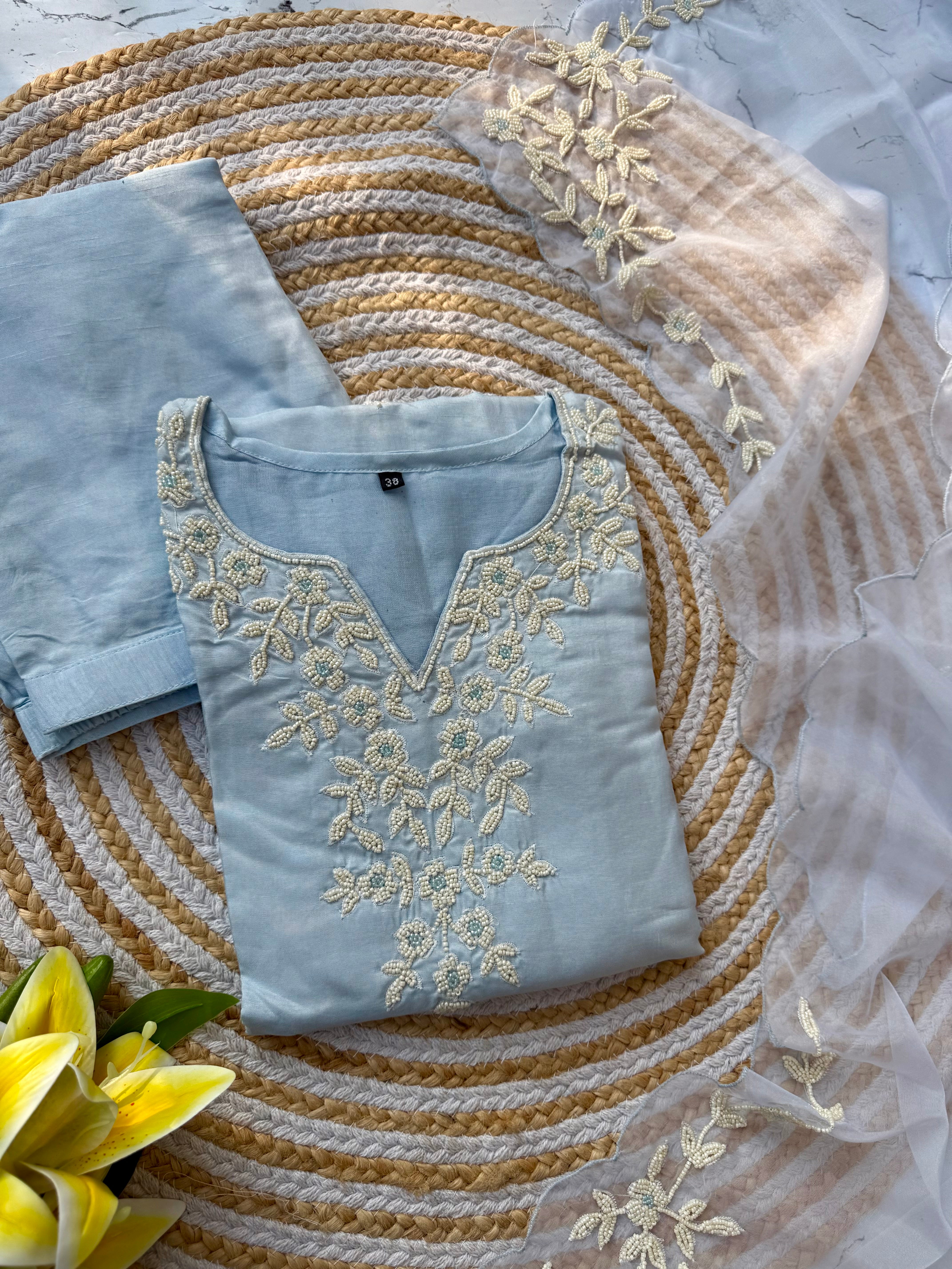 Beautiful dola silk kurta with with pearl work on the yoke & sleeves of the kurta with a long organza dupatta with pearl work details & a dola silk bottom with work