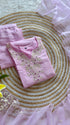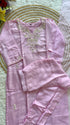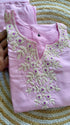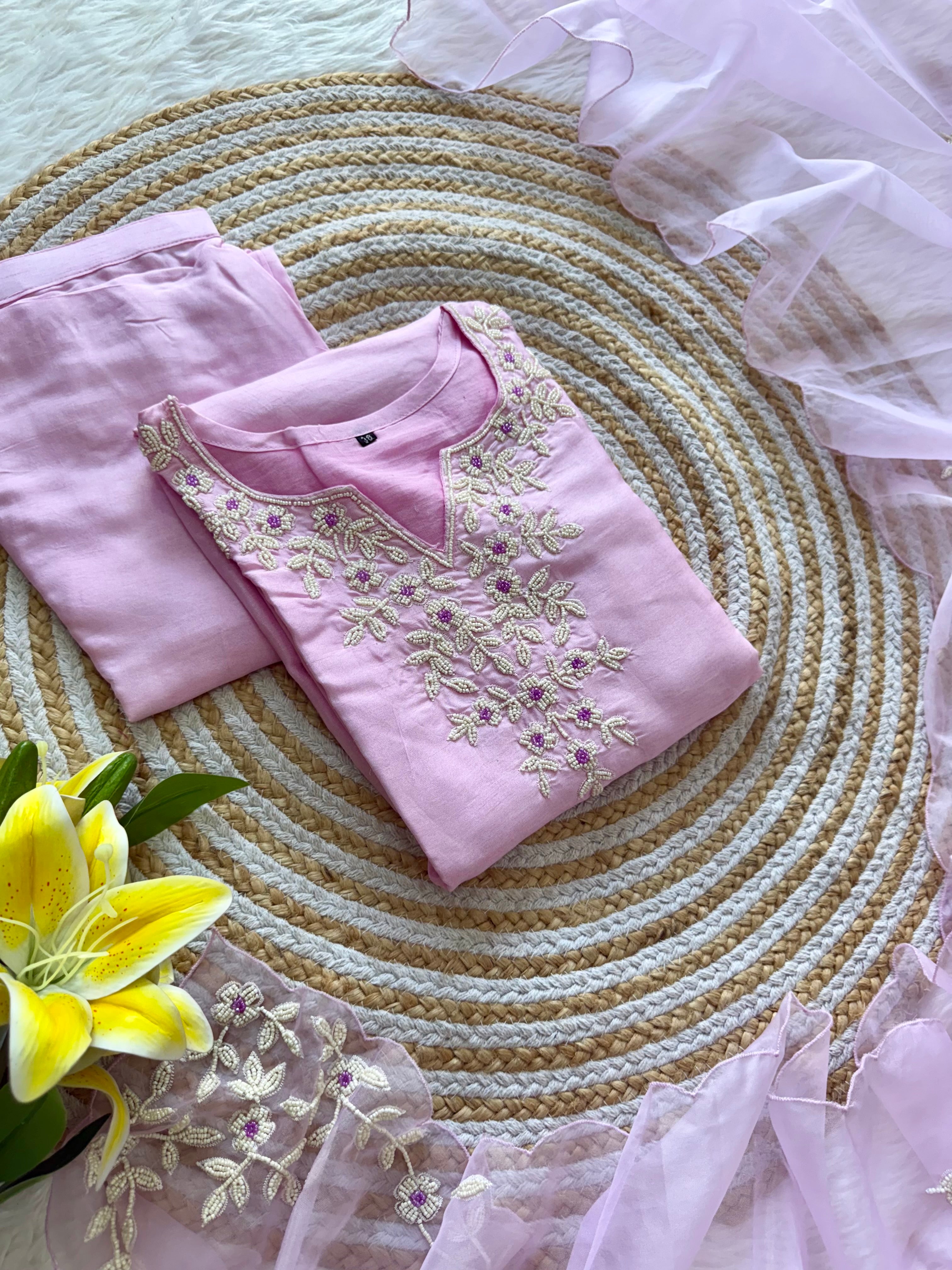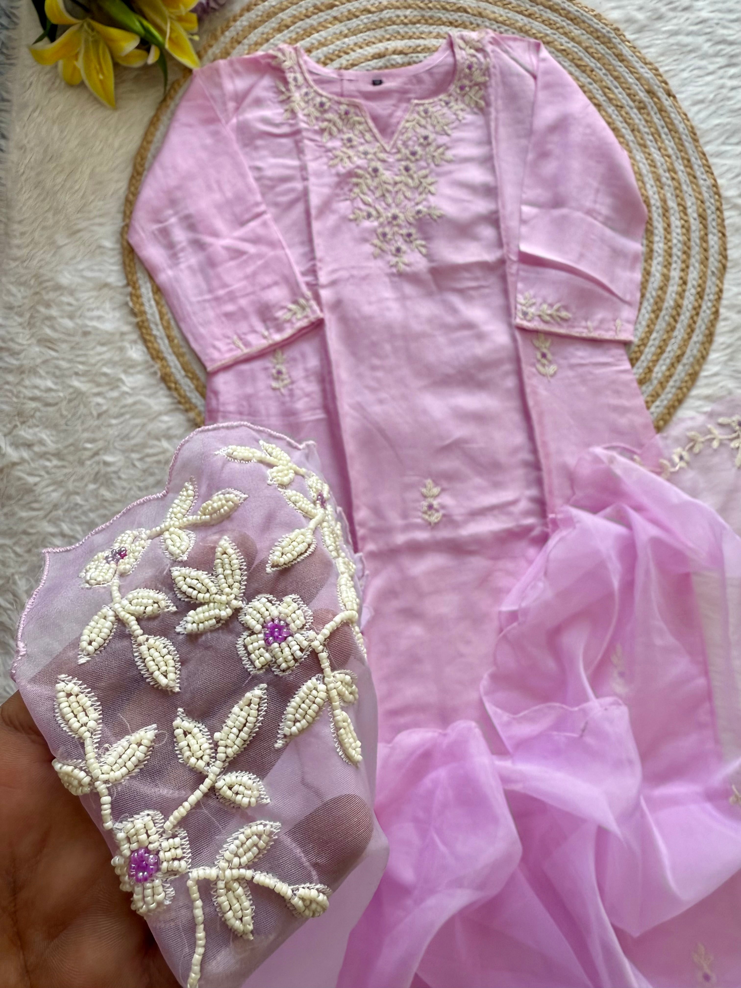 Beautiful dola silk kurta with with pearl work on the yoke & sleeves of the kurta with a long organza dupatta with pearl work details & a dola silk bottom with work