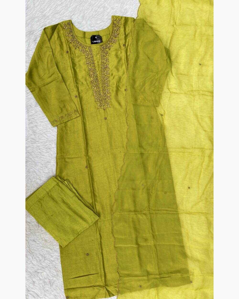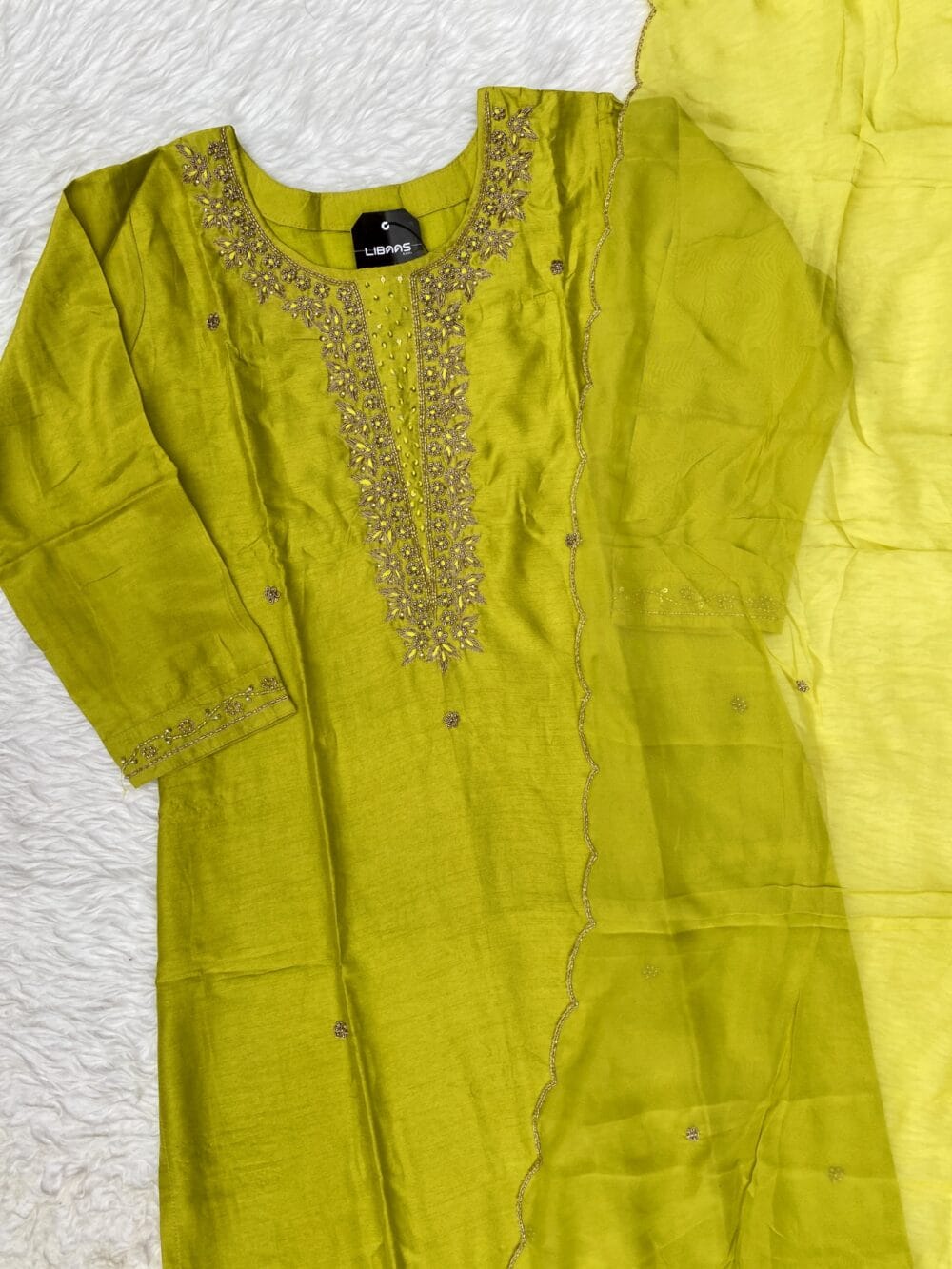 Very beautiful piece with handwork on the yoke & body and sleeves of the kurta with a long Cutdana scallope organza dupatta and a plan dola silk bottom