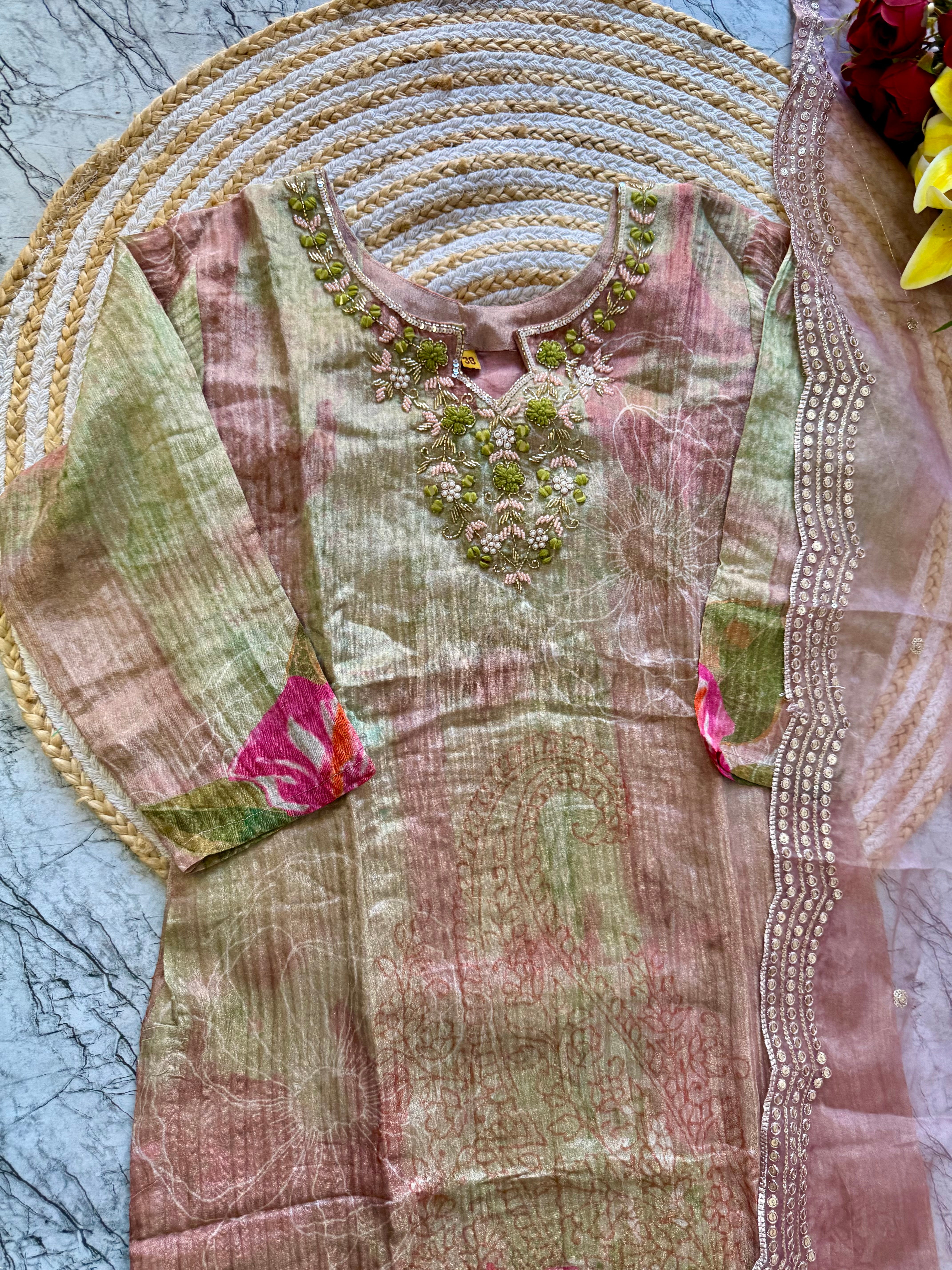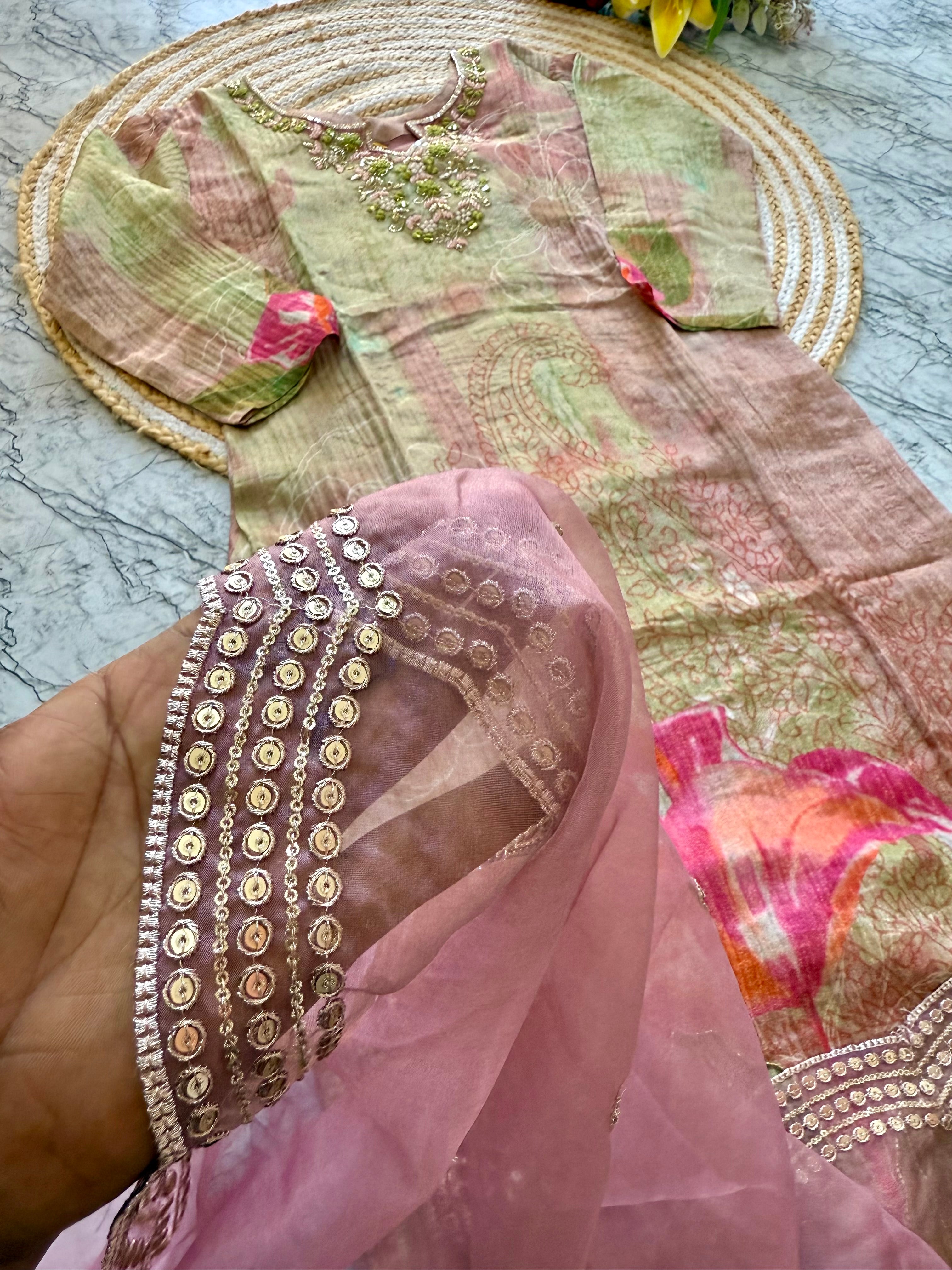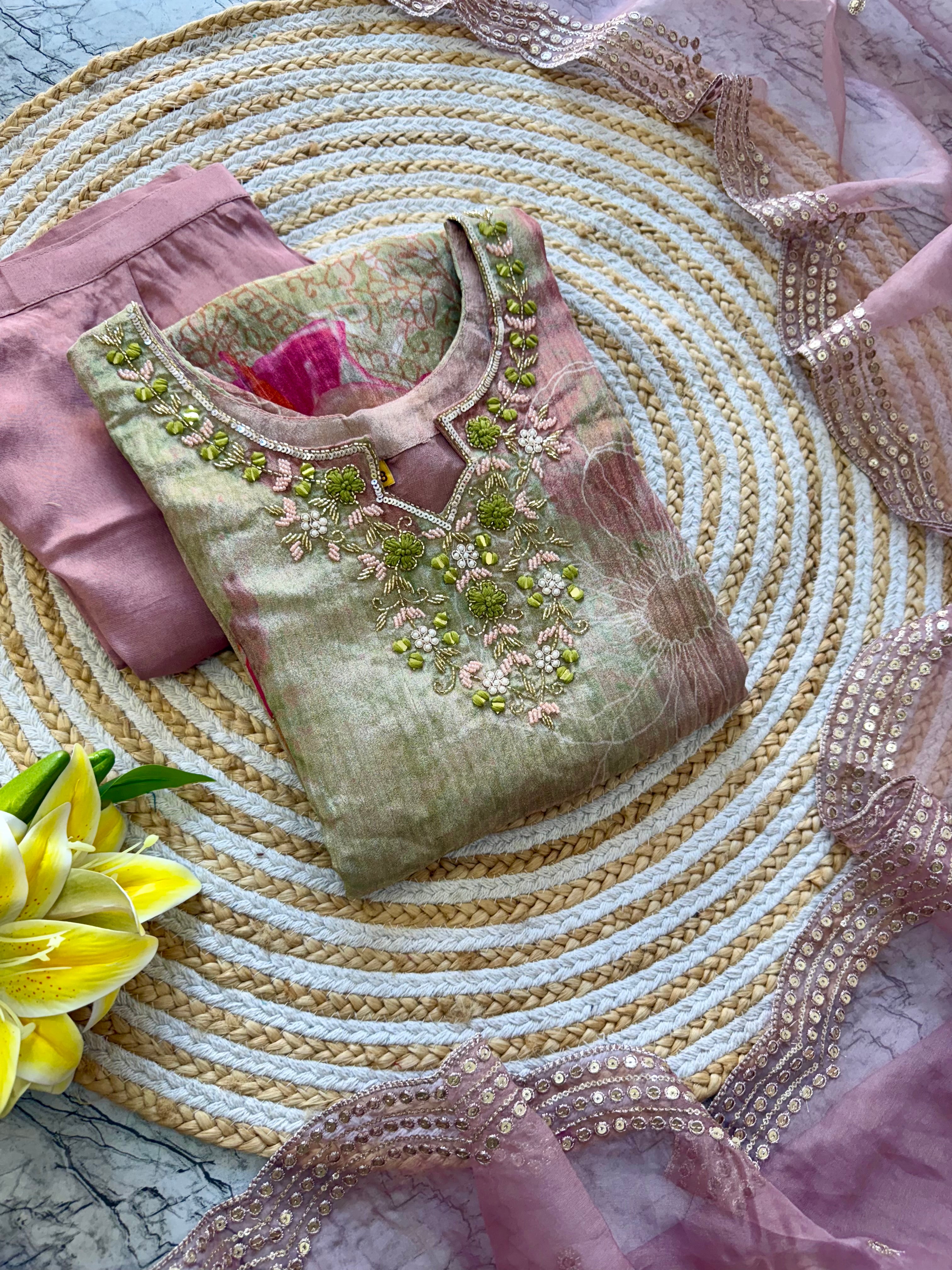 Front & back printed organza set with heavy handwork work on the yoke of the kurta with a long handwork detailed viscose organza dupatta with a silk bottom