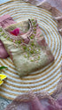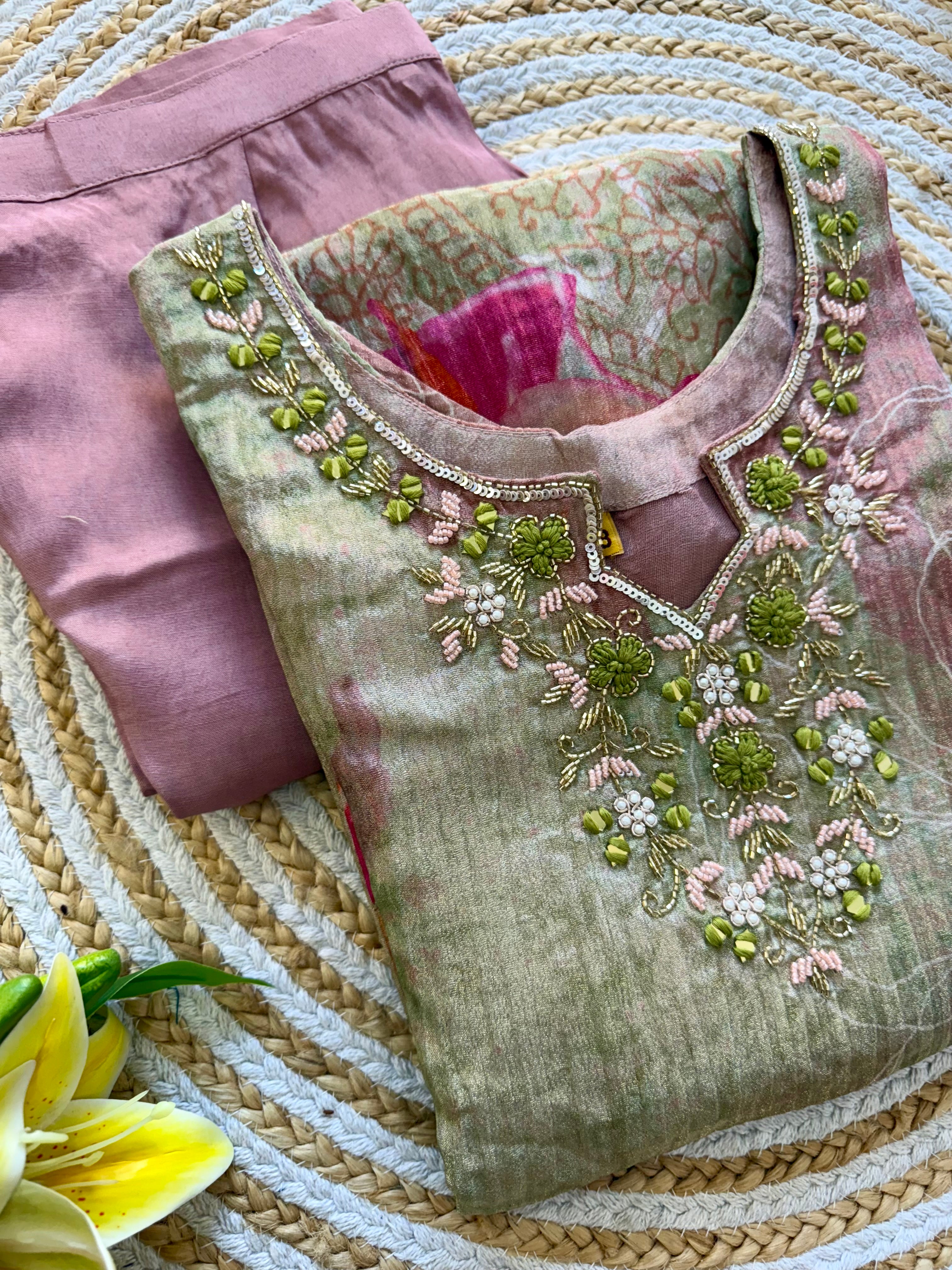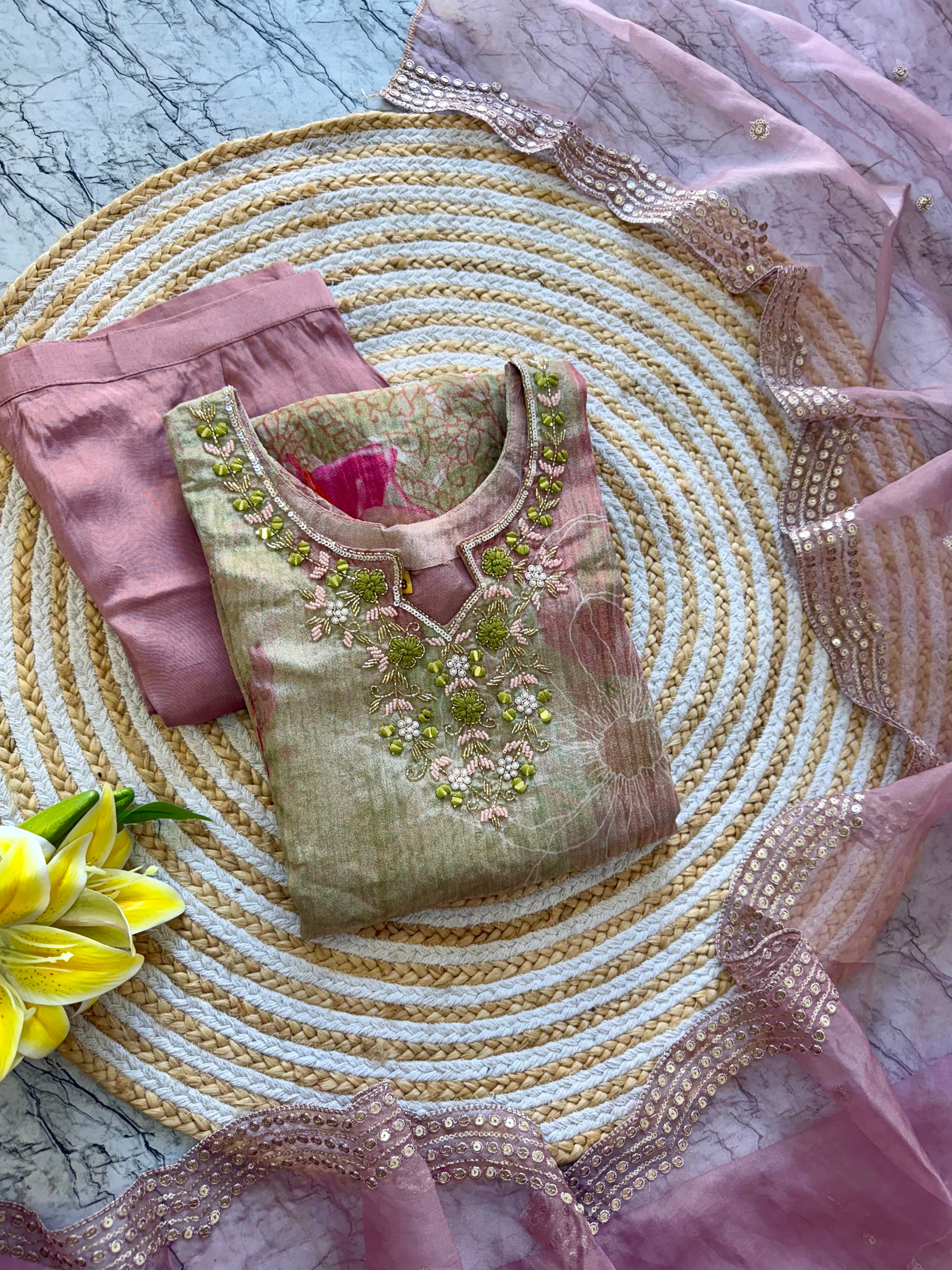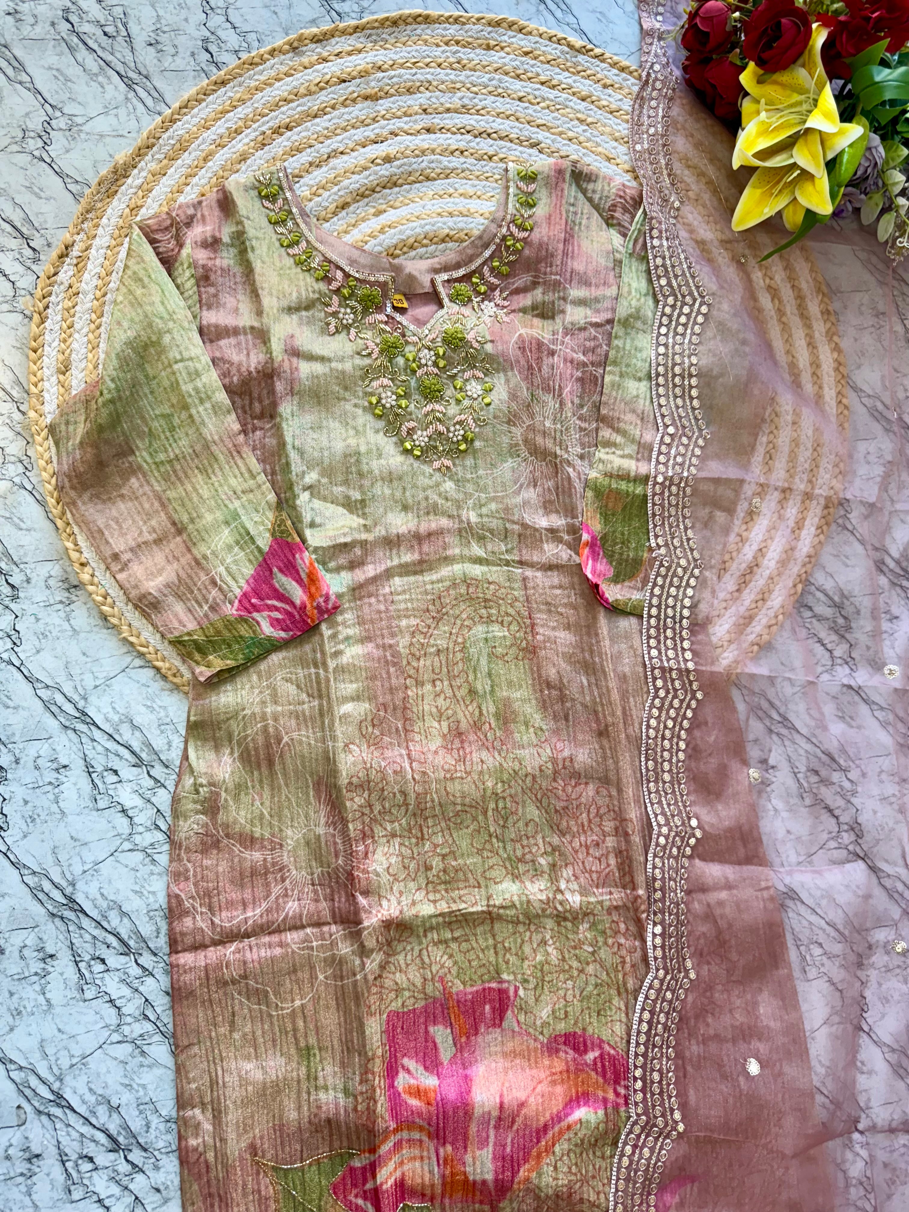 Front & back printed organza set with heavy handwork work on the yoke of the kurta with a long handwork detailed viscose organza dupatta with a silk bottom