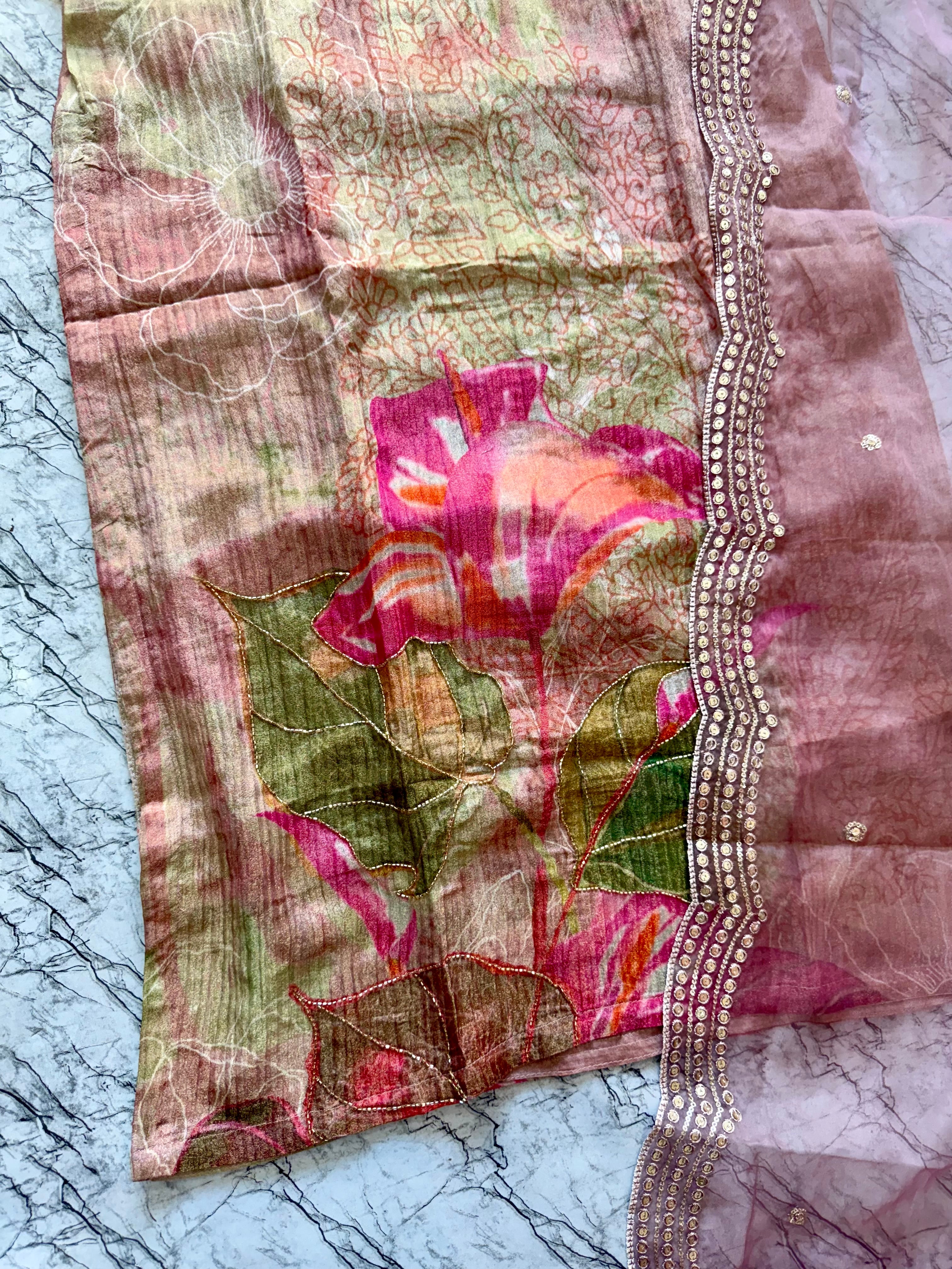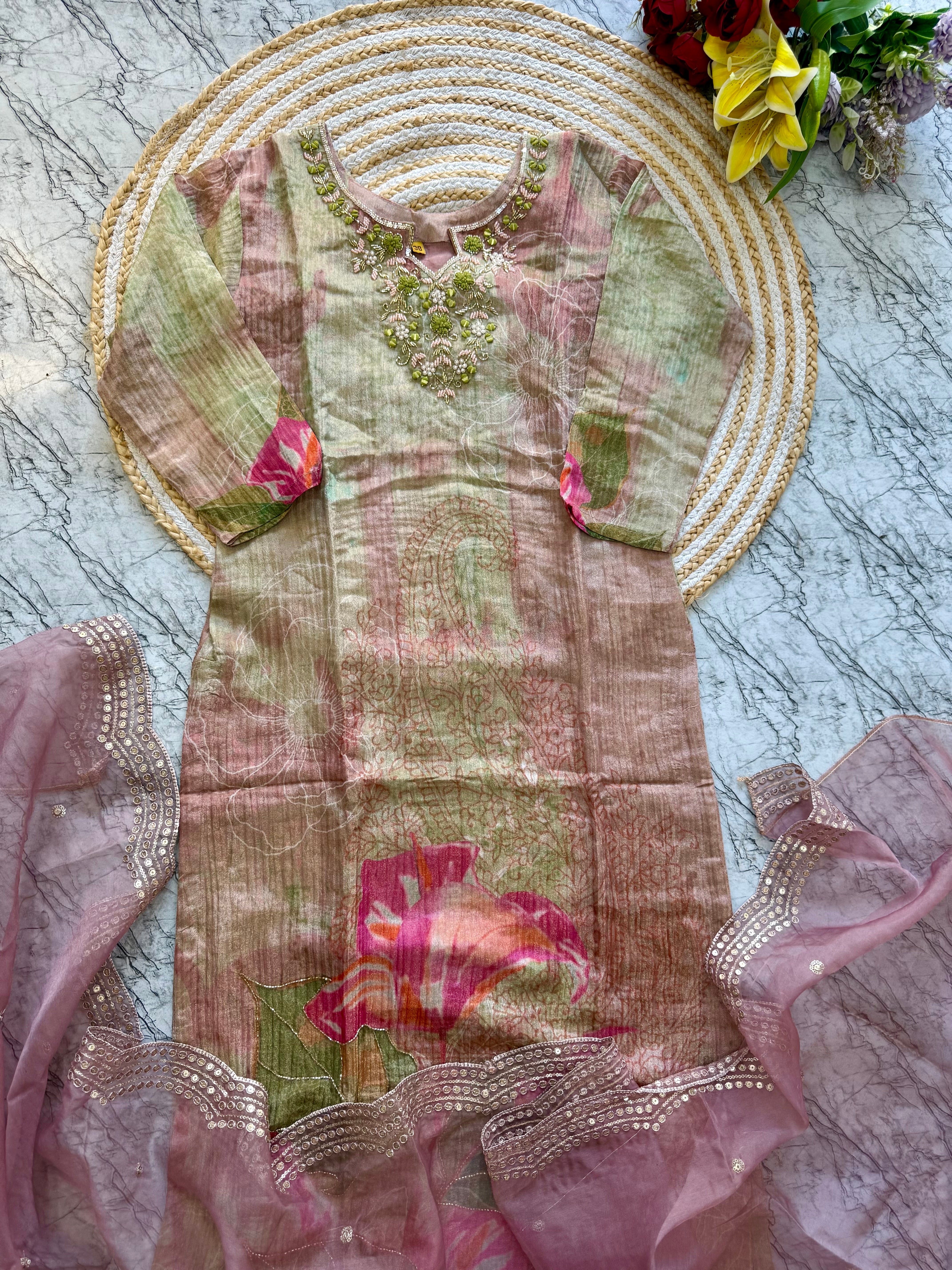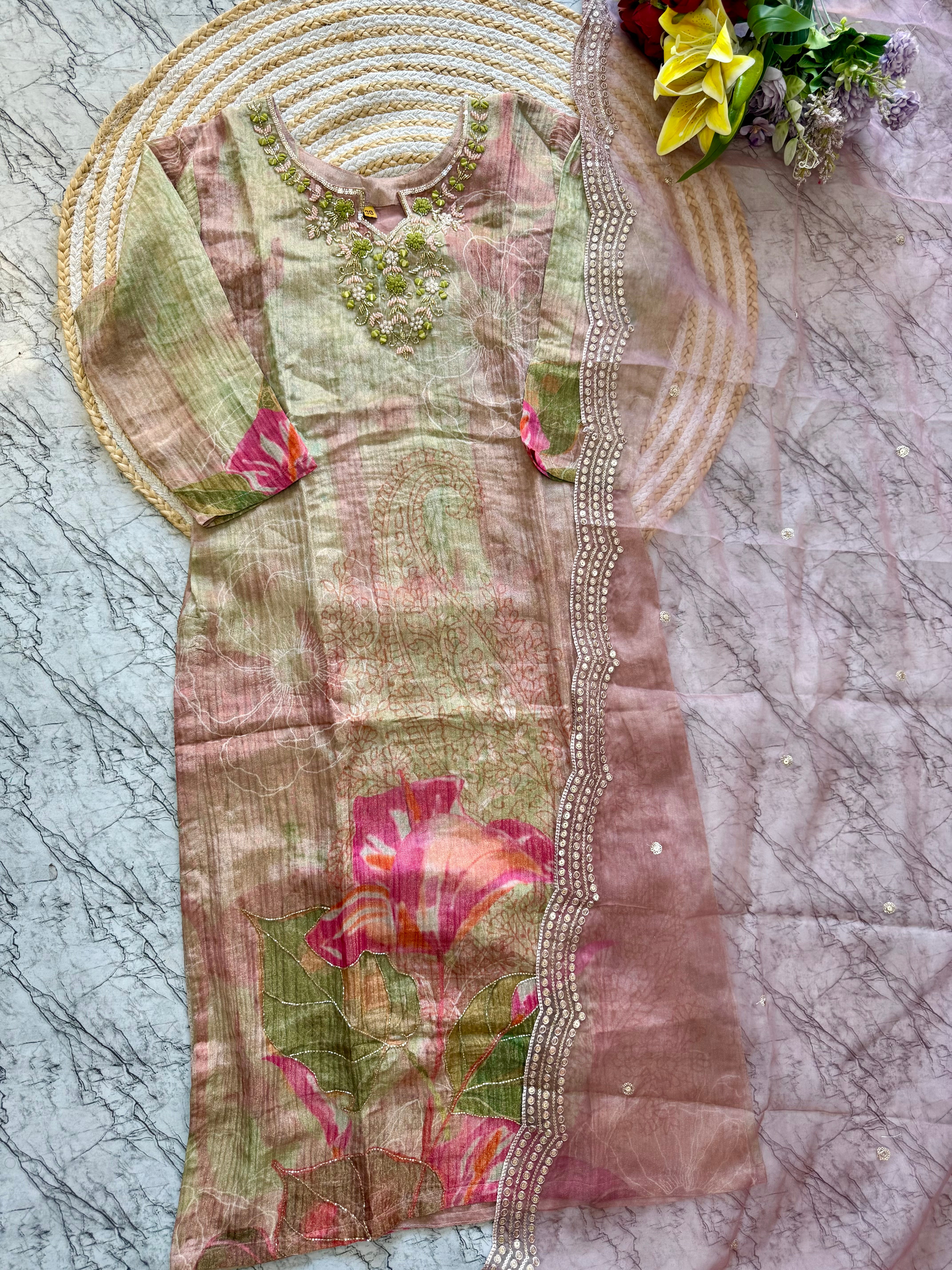 “Tajassus" Premium printed organza handcrafted kurti bottom with dupatta set 🛍️