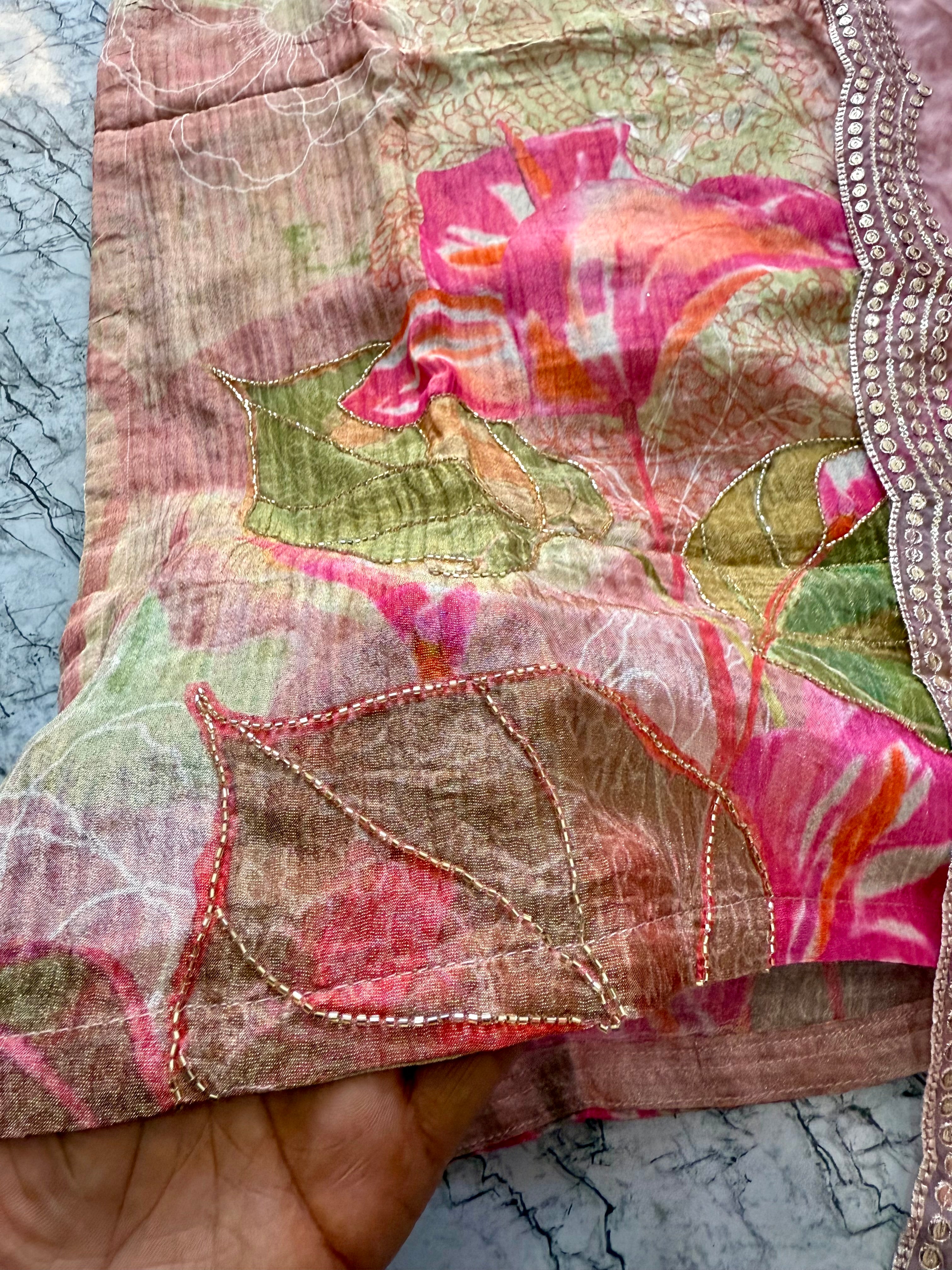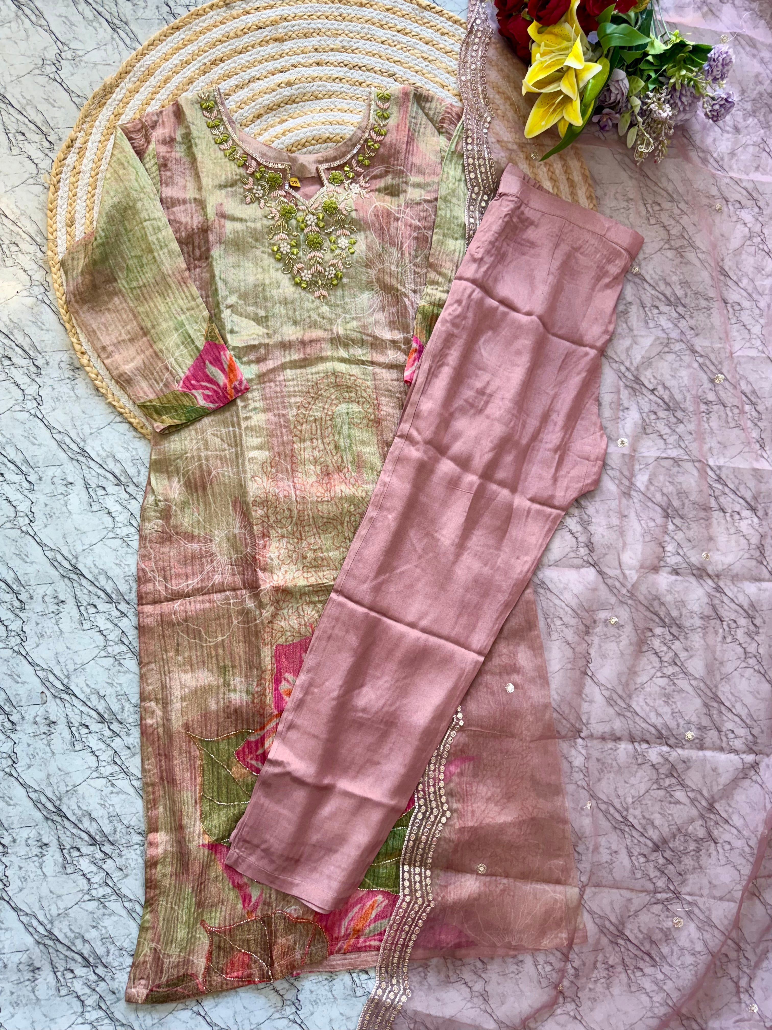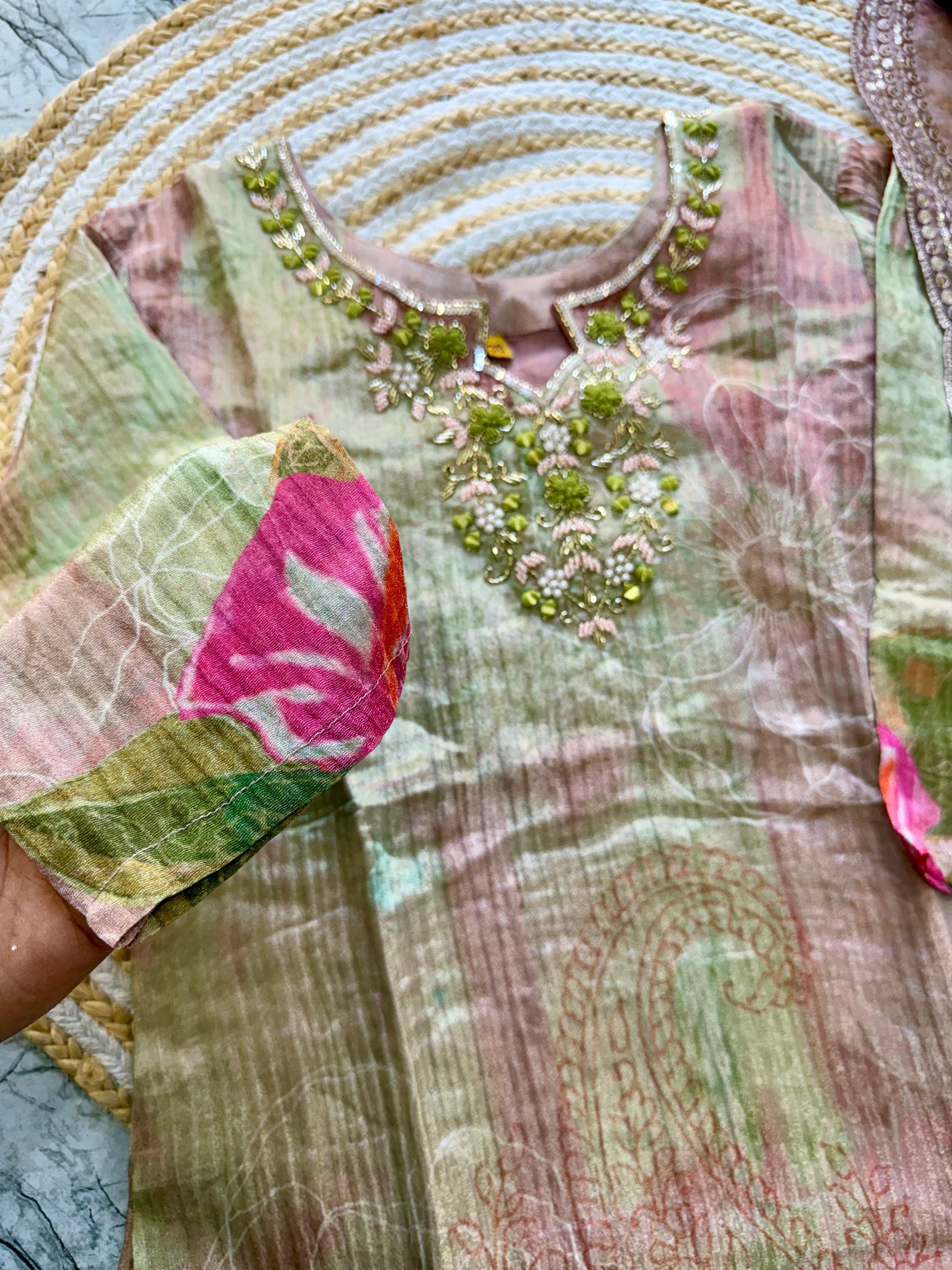 “Tajassus" Premium printed organza handcrafted kurti bottom with dupatta set 🛍️