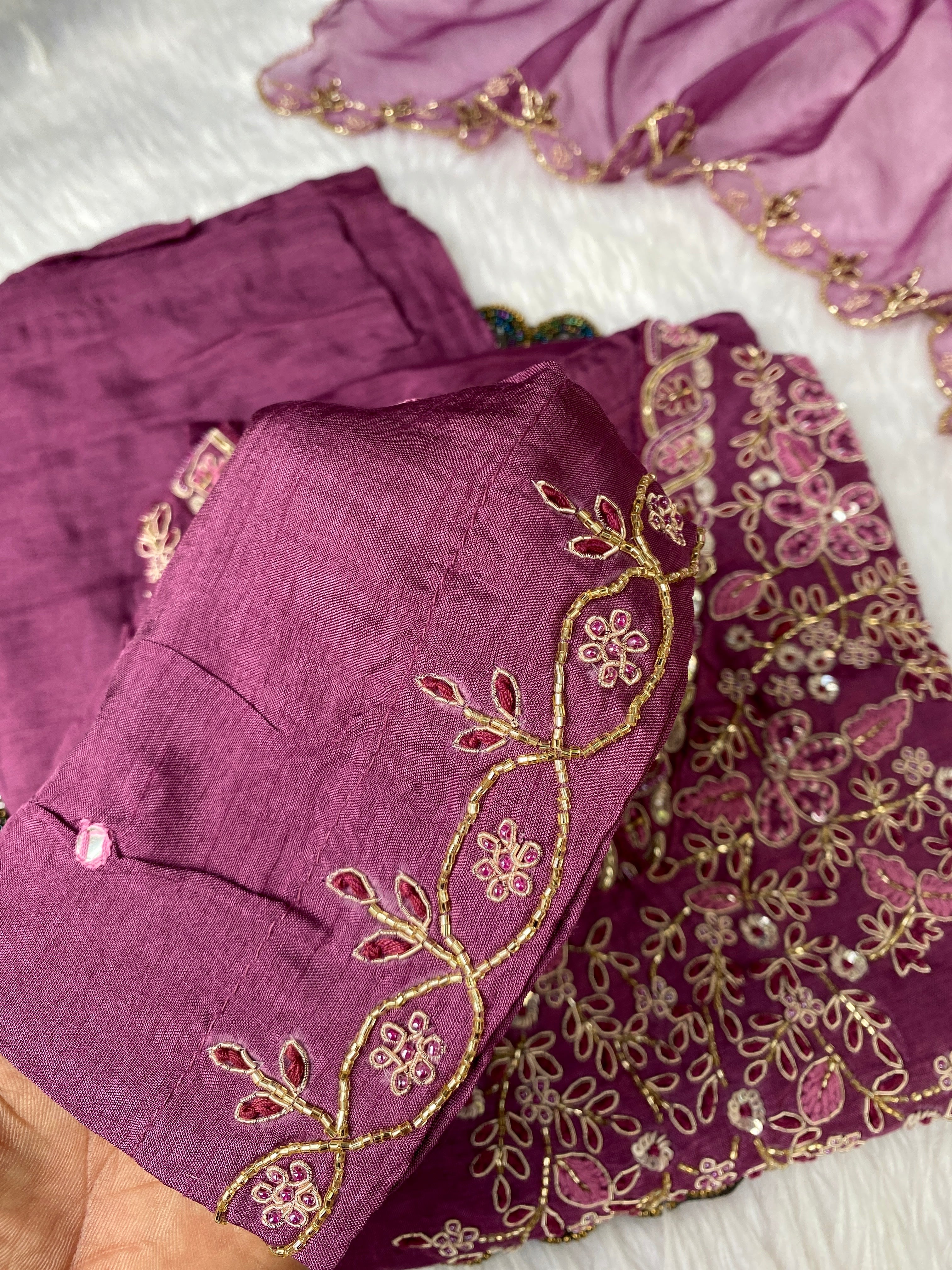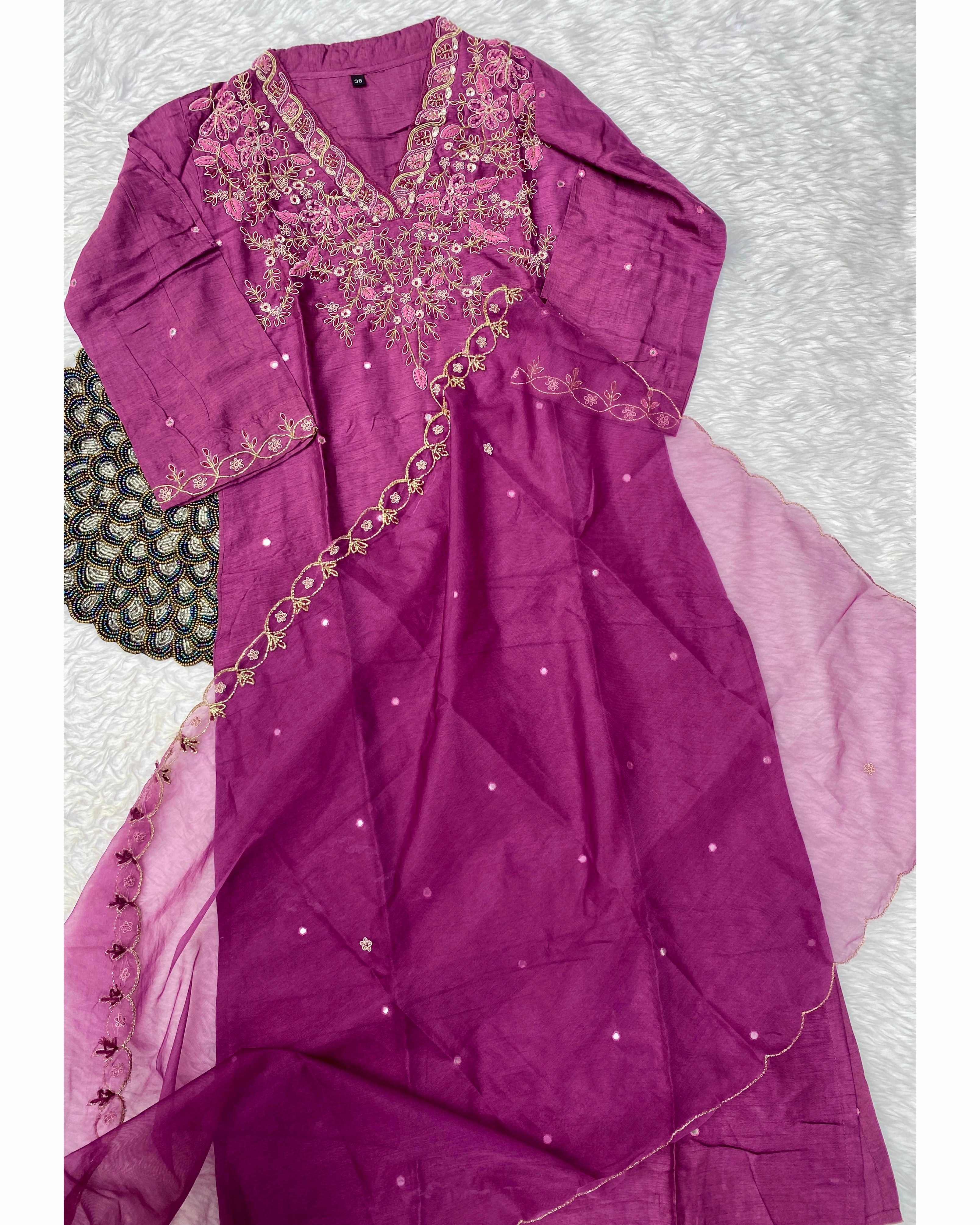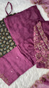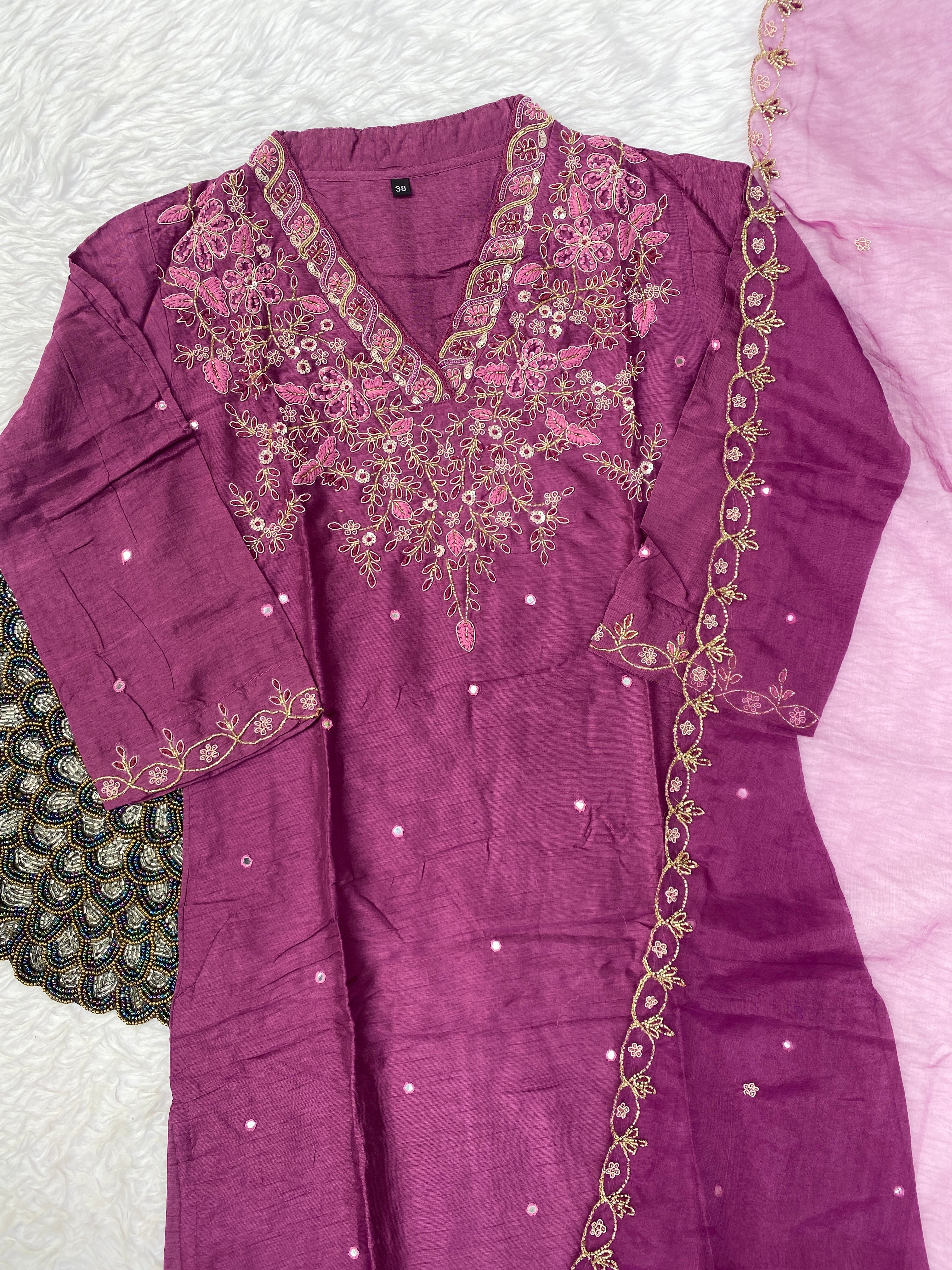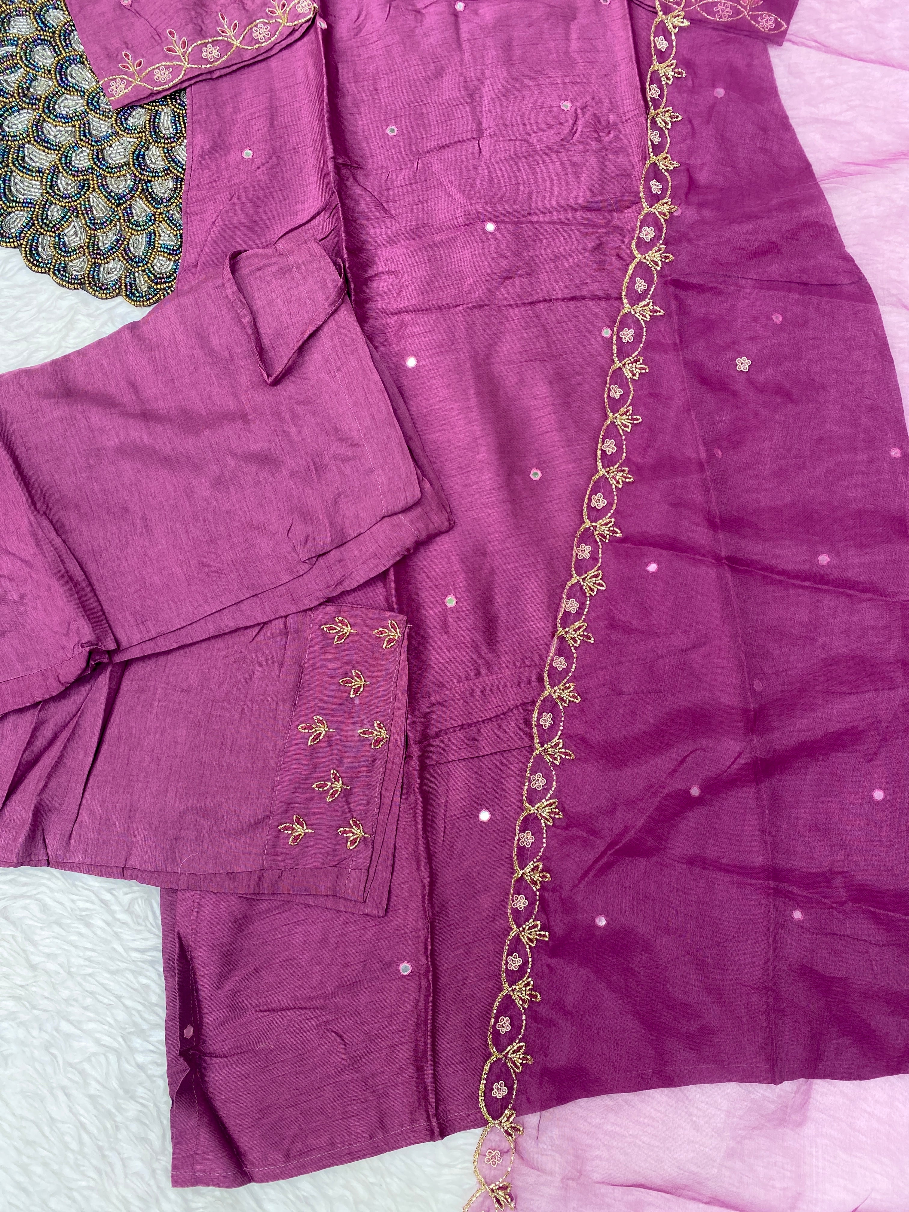 Glass tissue set with handwork on the yoke with a long dupatta and a plane bottom.