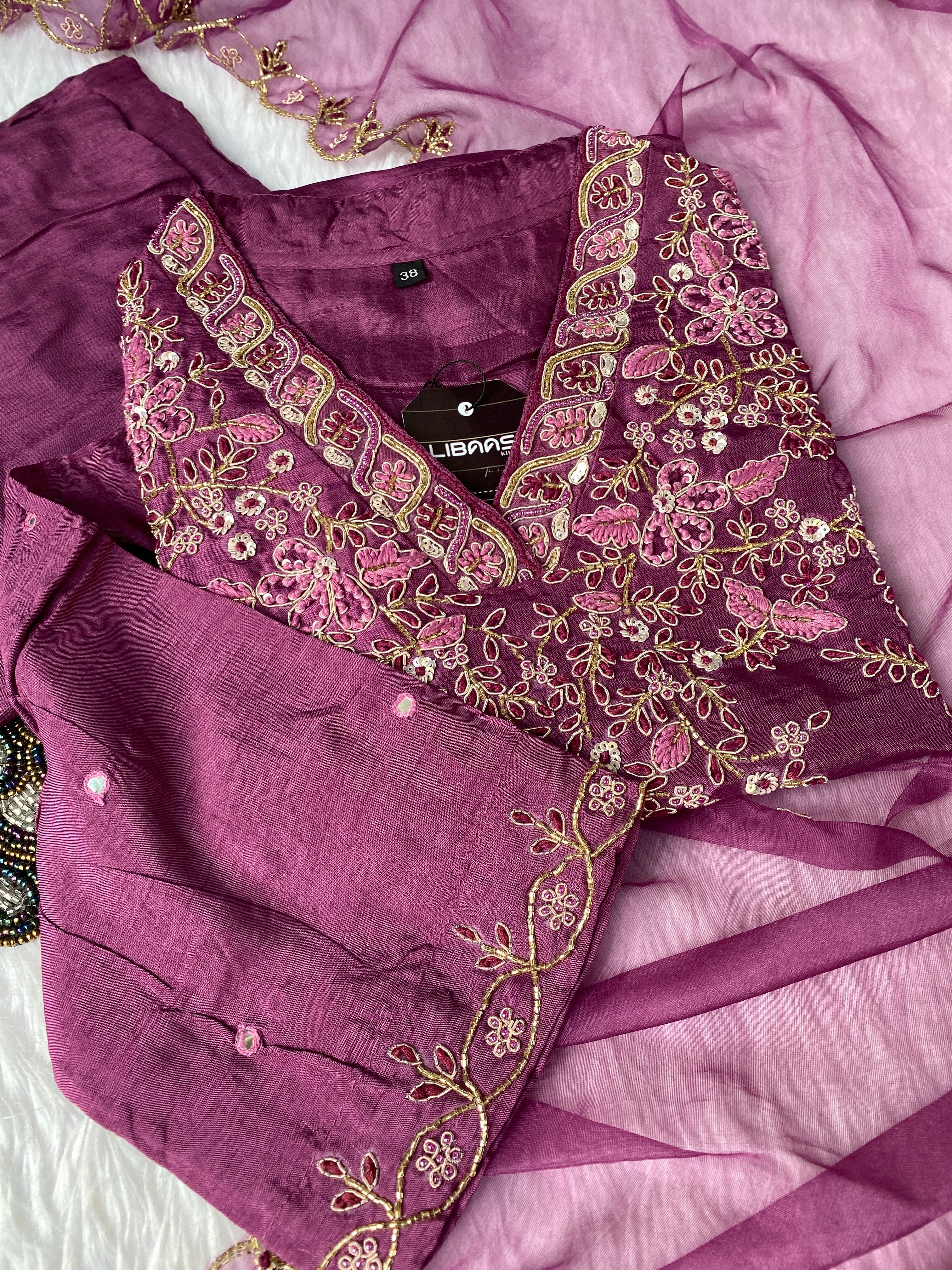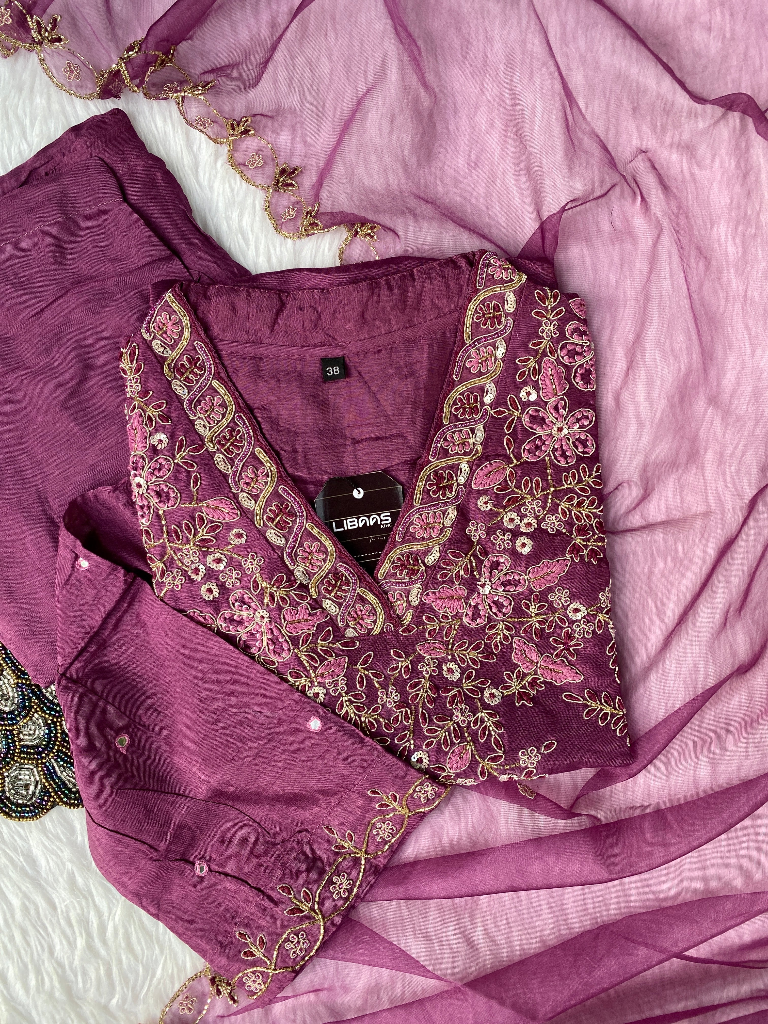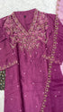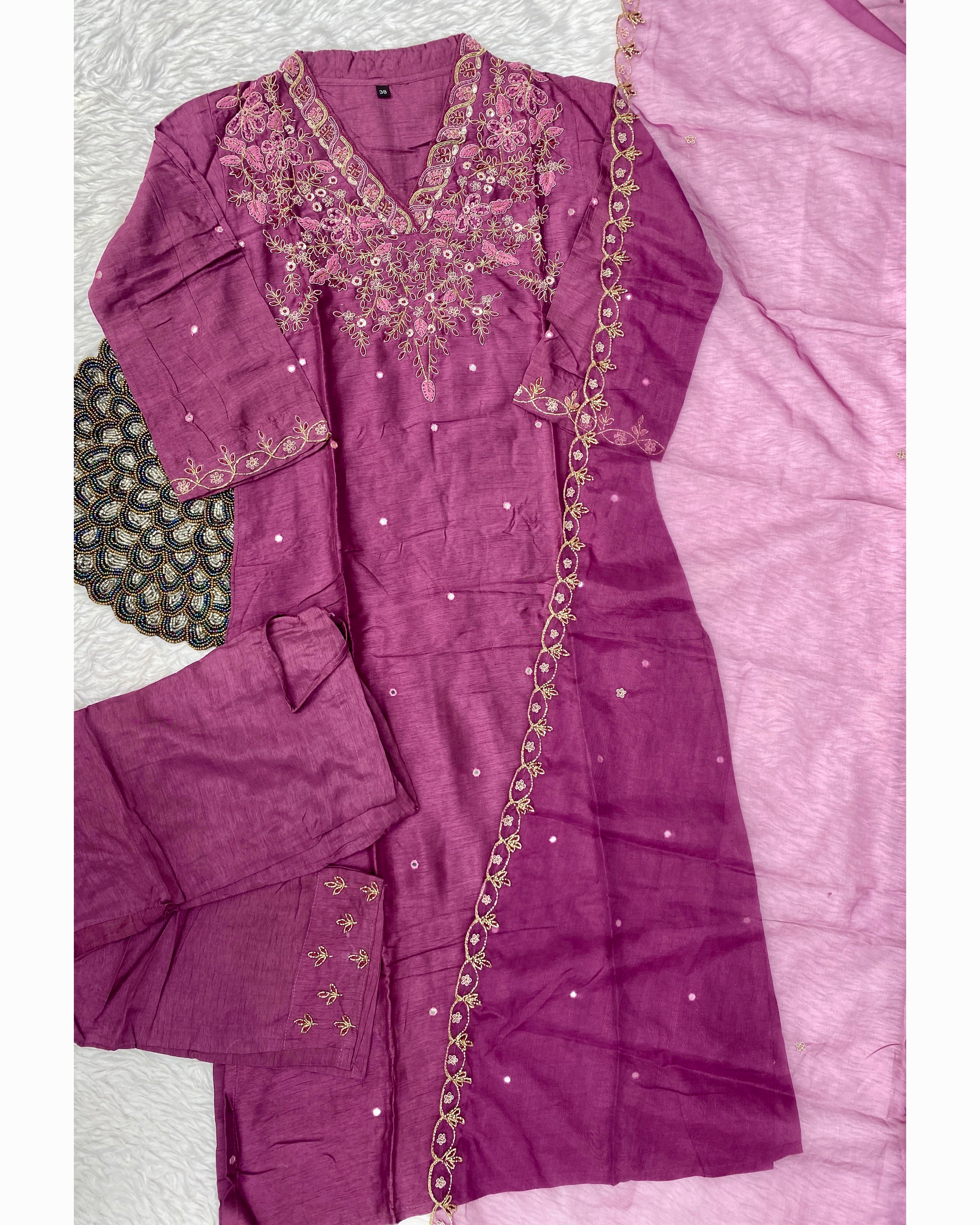 Glass tissue set with handwork on the yoke with a long dupatta and a plane bottom.