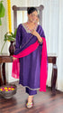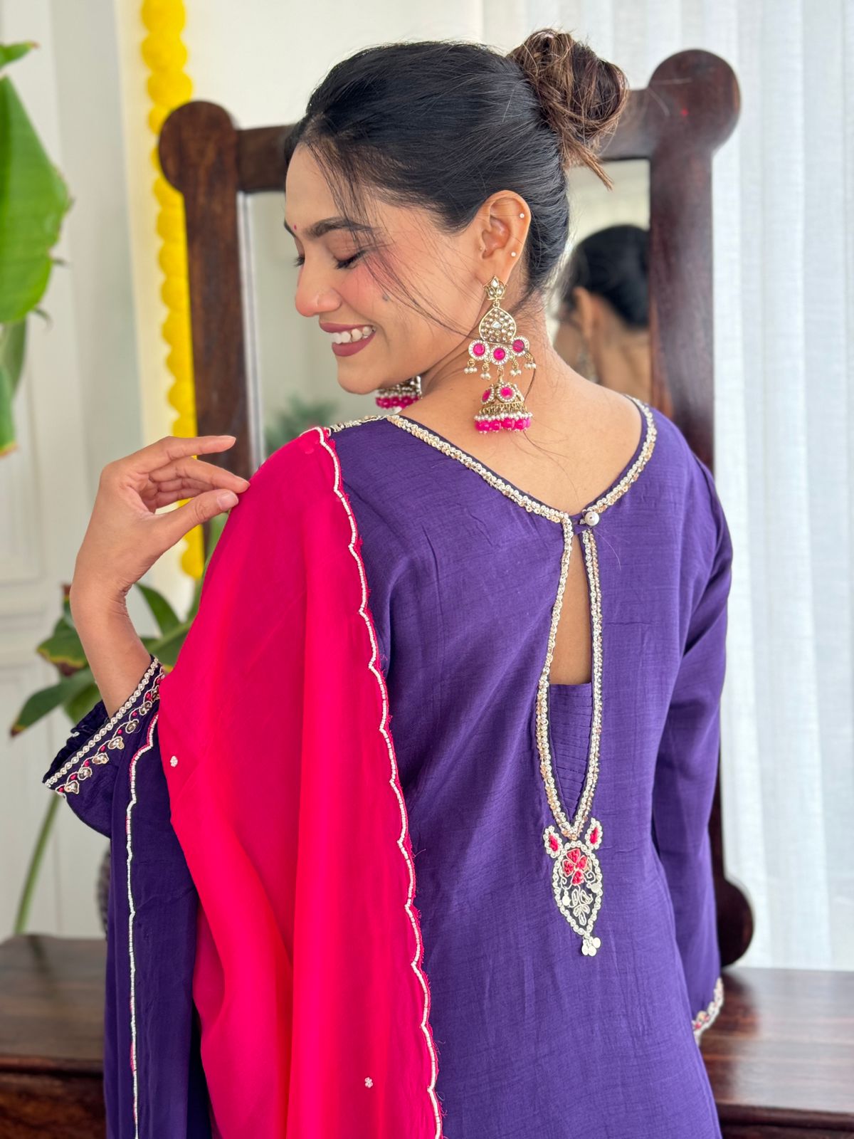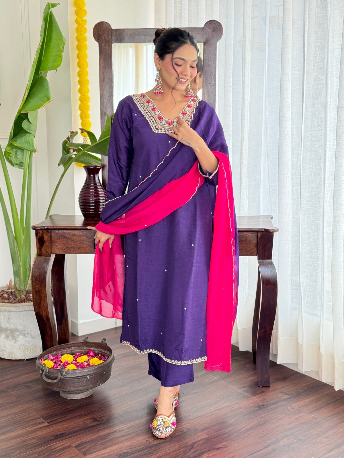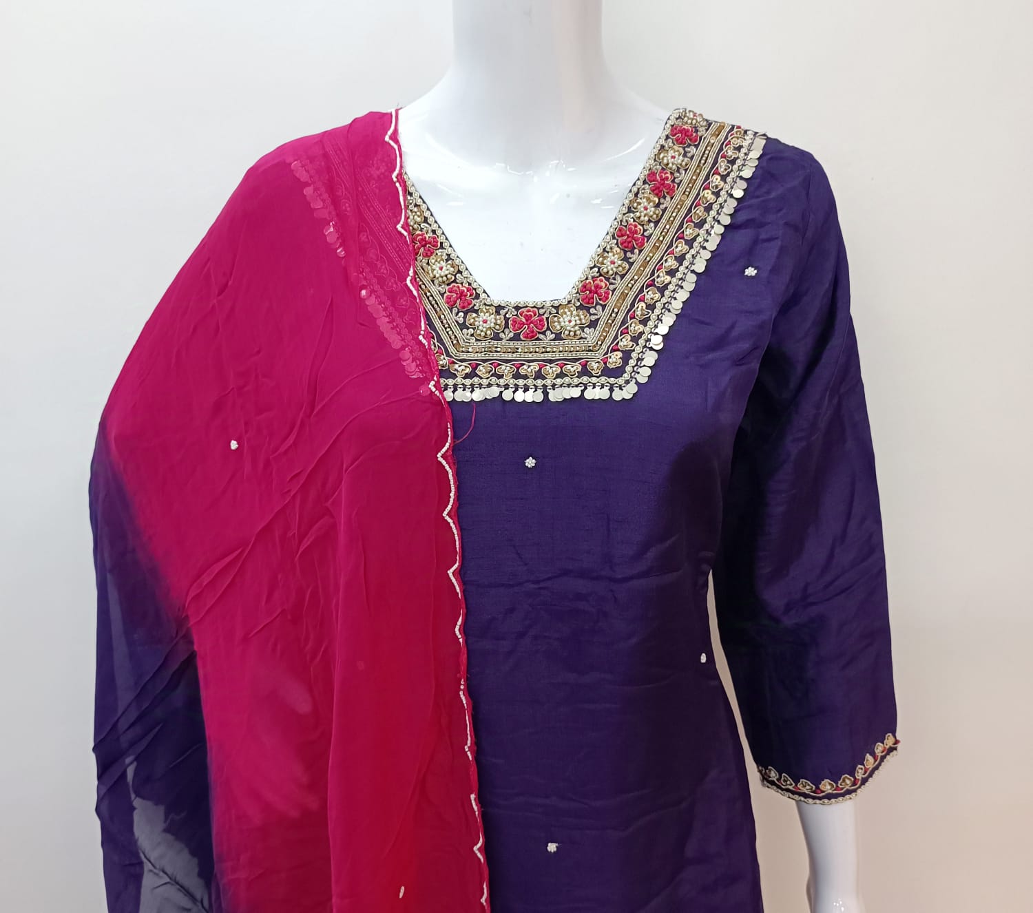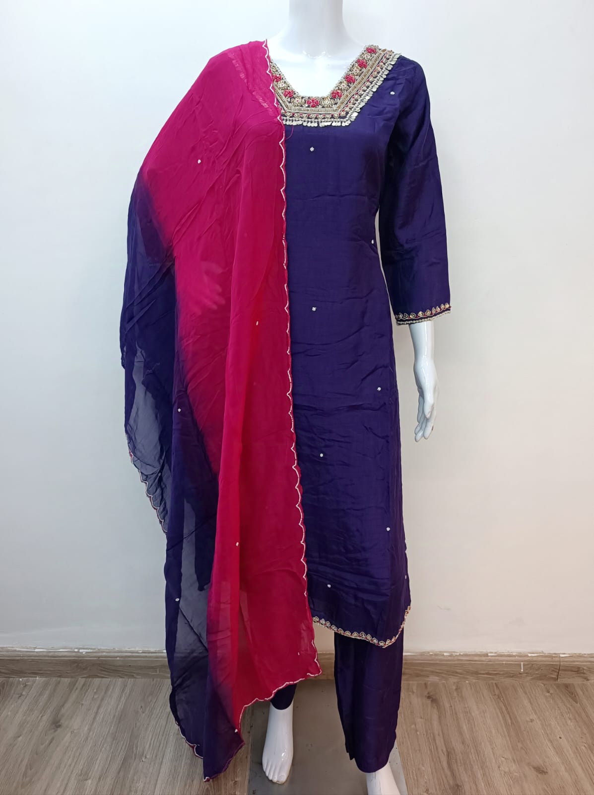Tissue silk stright handwork set with heavy handwork on the yoke, sleeves, Daman & back side of the kurta with a elegant handwork chinnon dupatta with a silk bottom