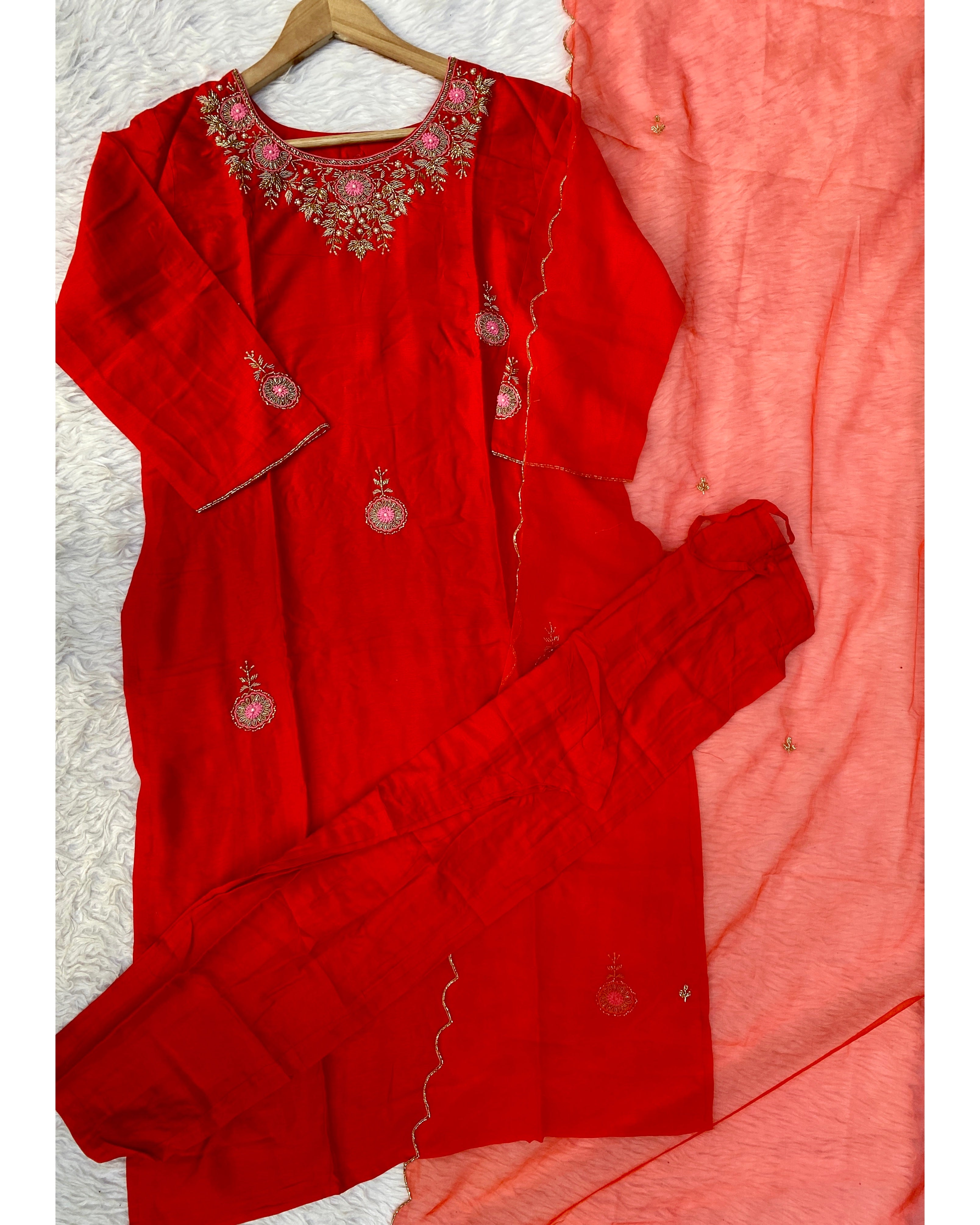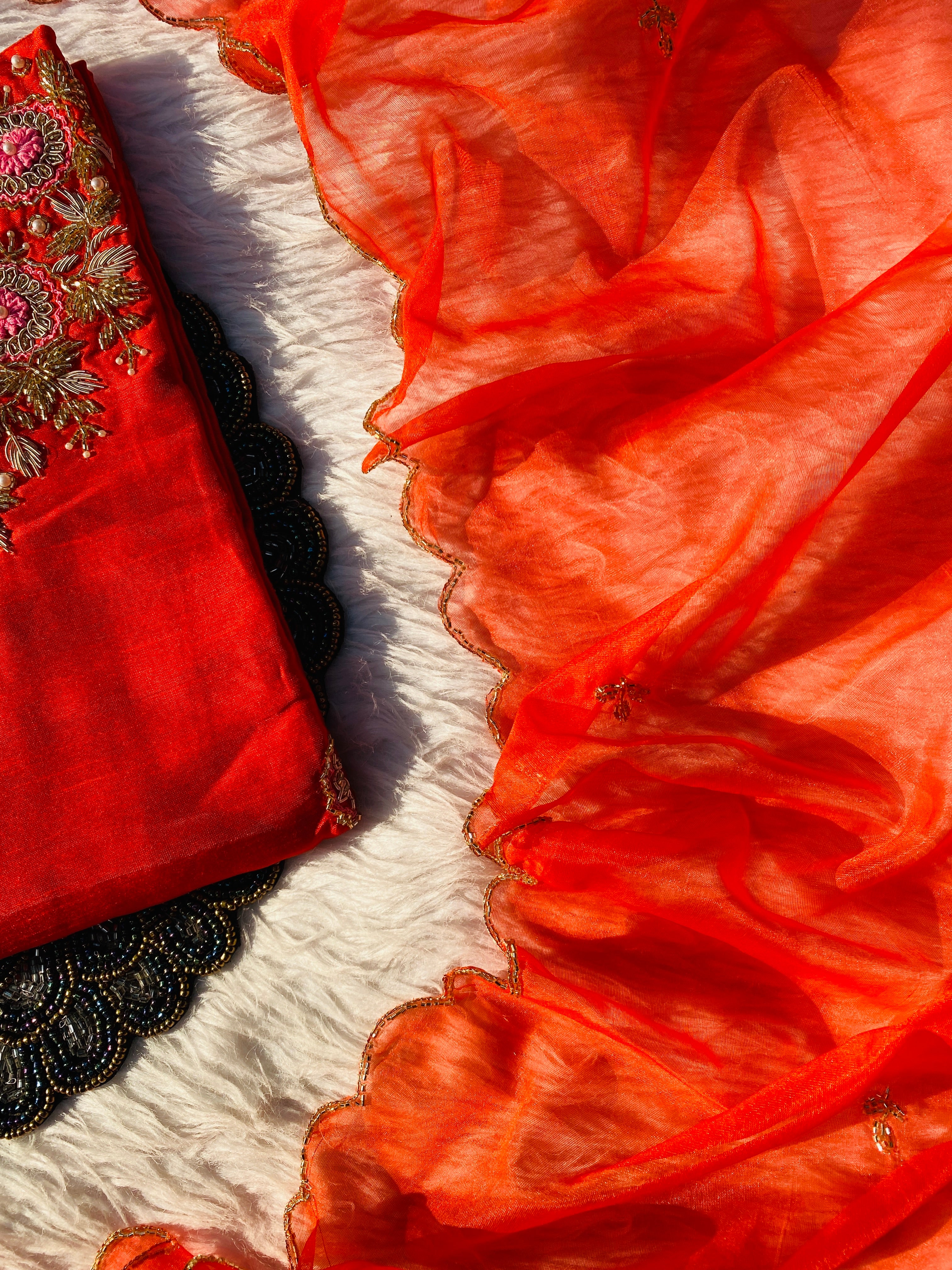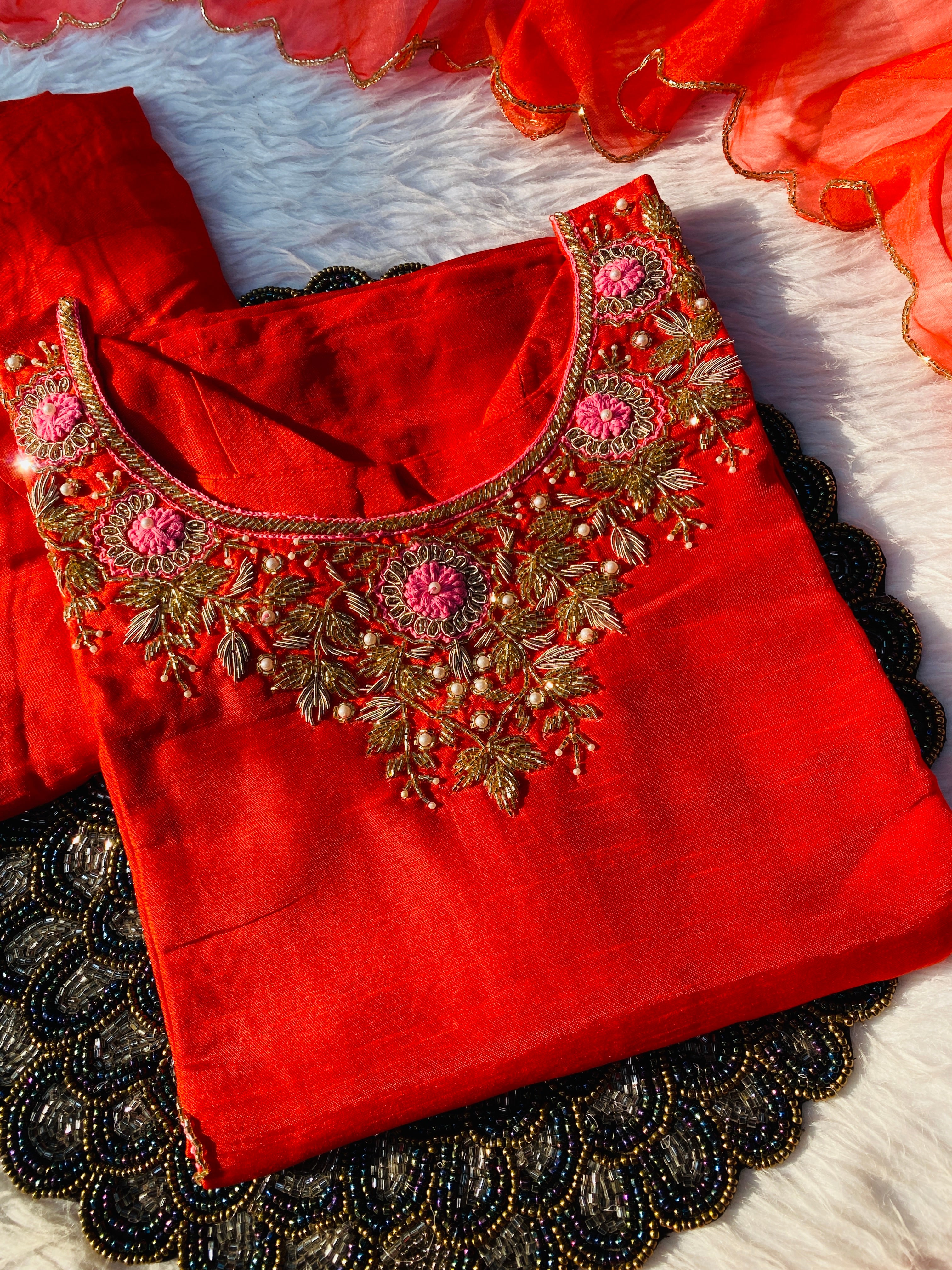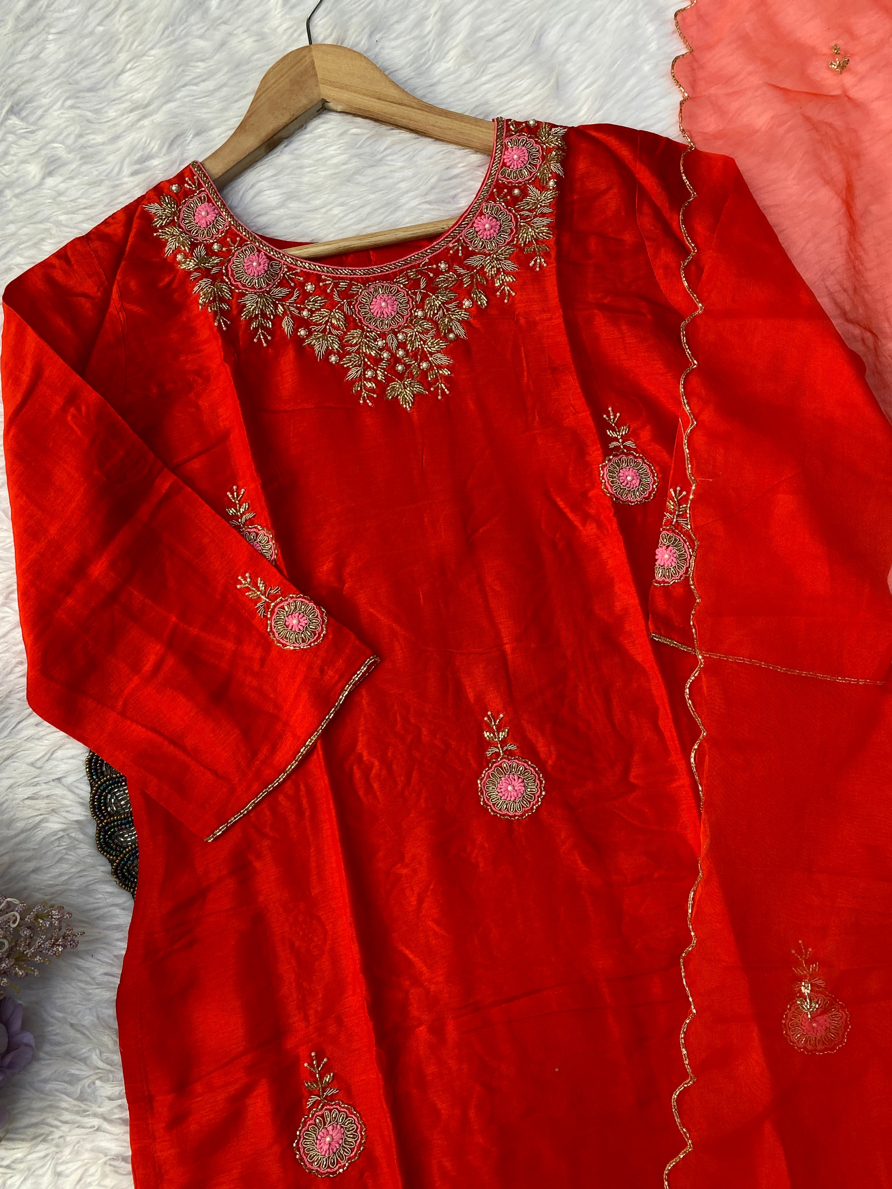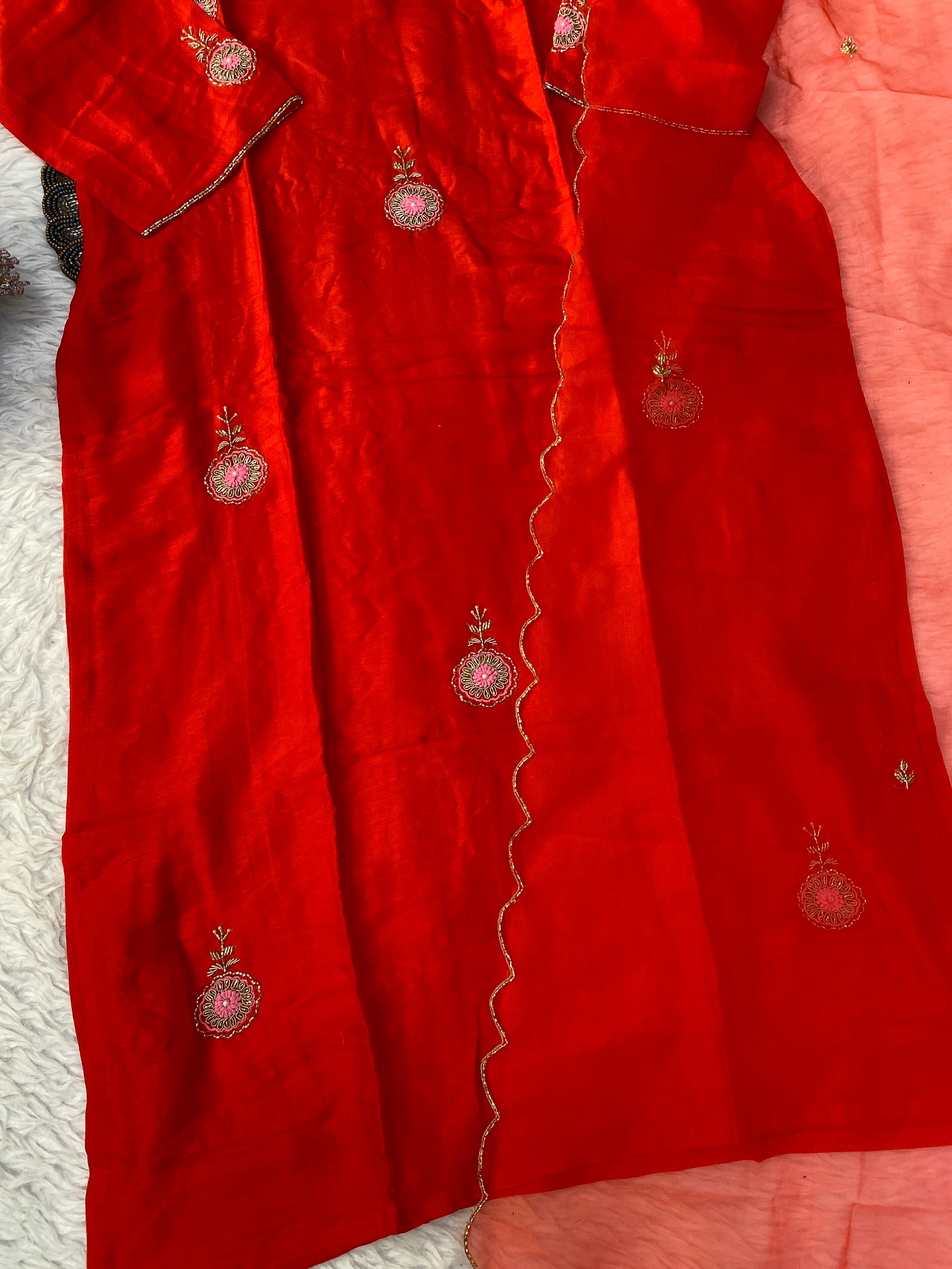 A very beautiful piece with heavy handwork on the yoke and sleeve of the kurta with a beautiful sided scallop organza dupatta and a silk bottom