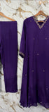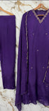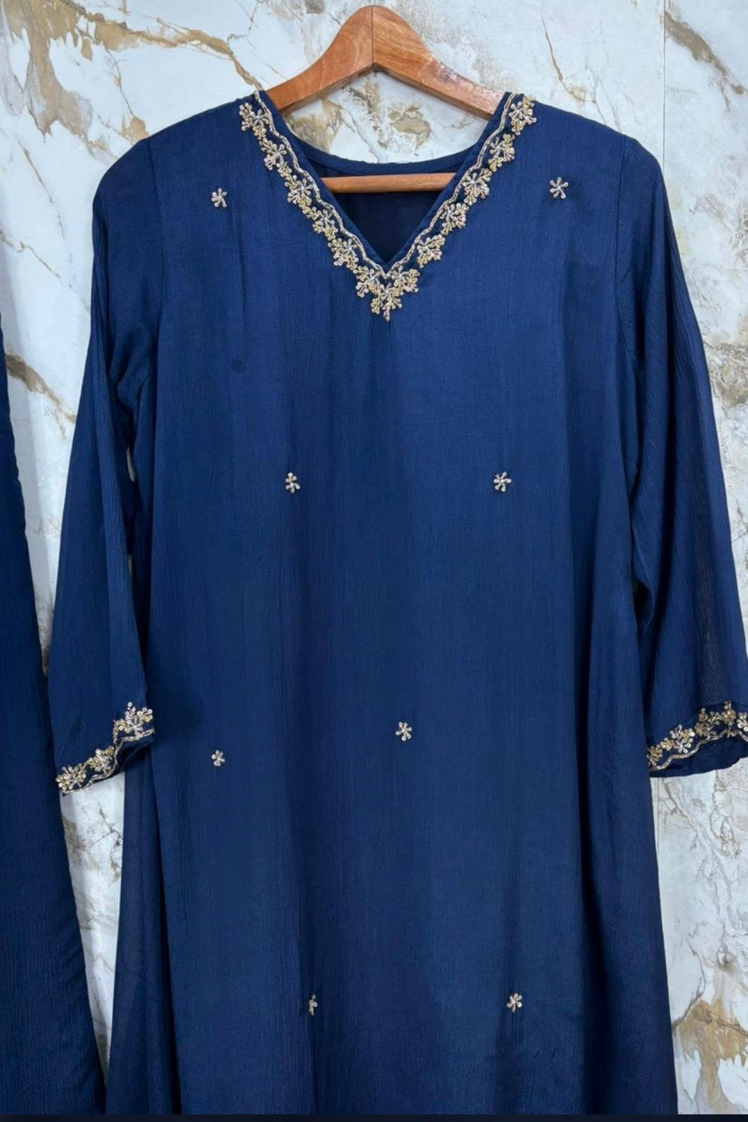 Premium Chinnon a line kurta set with handwork on the neck line sleeve on the top with a long chinnon dupatta paired with chinnon bottom