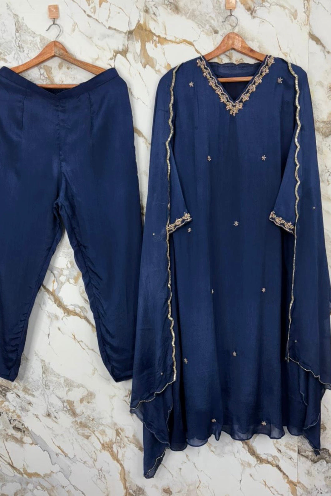 Aaira - Premium Chinnon A-Line Suit Set - XS / Indigo Blue