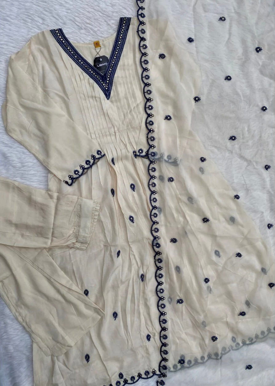 Muslin silk anarkali kurti with handwork on the neck line sleevs and Daman with a long organza dupatta with a plan silk bottom