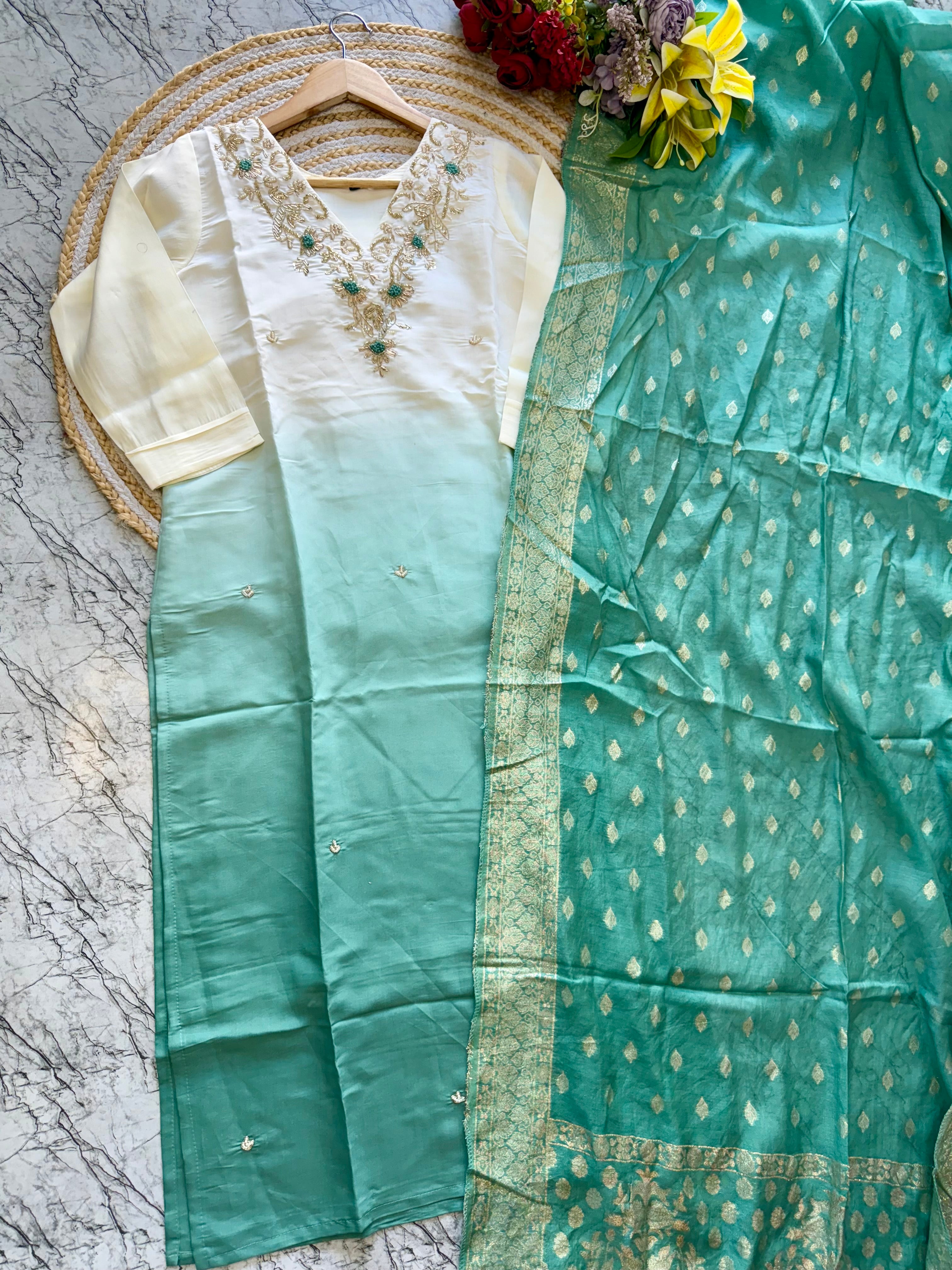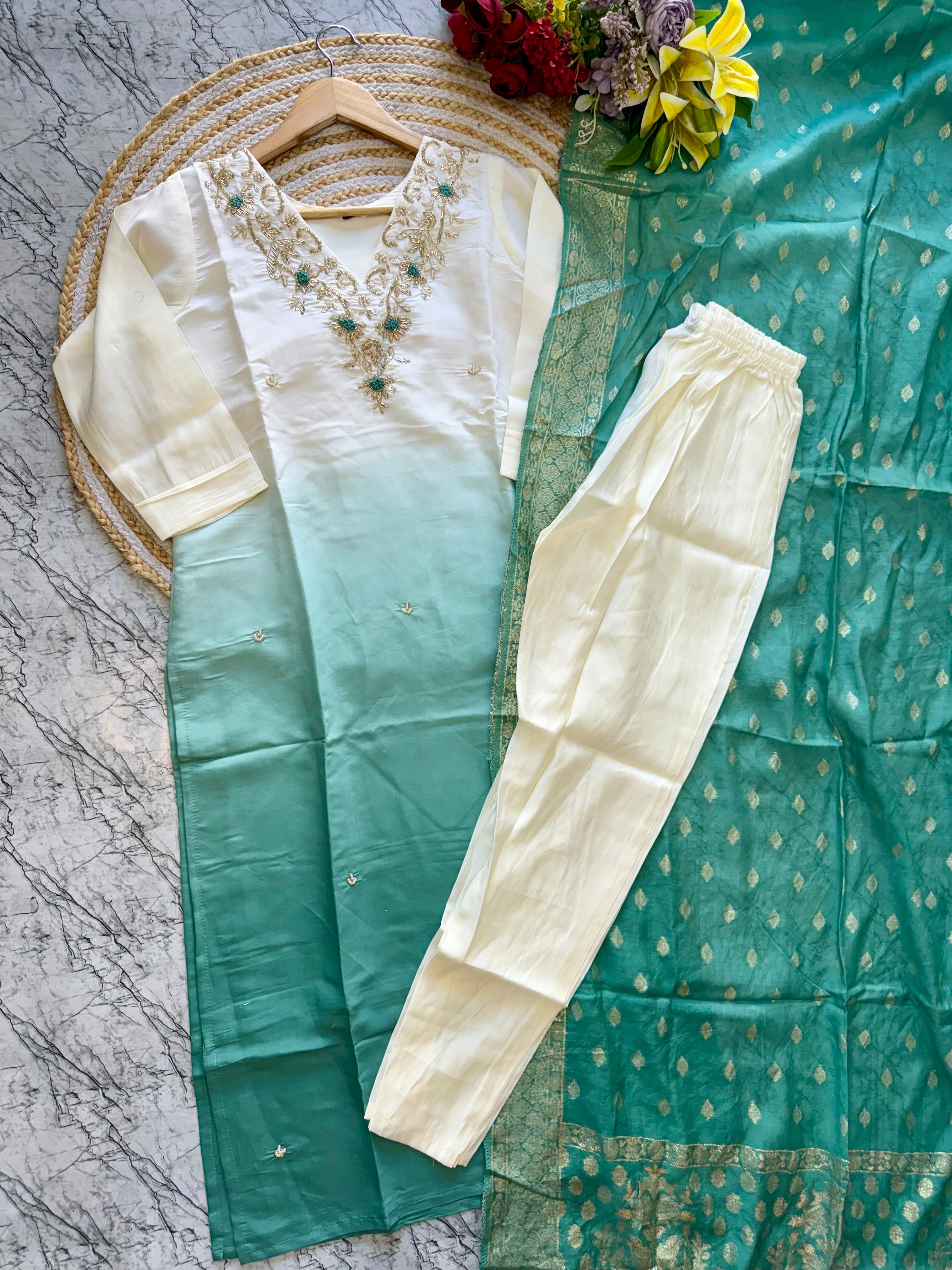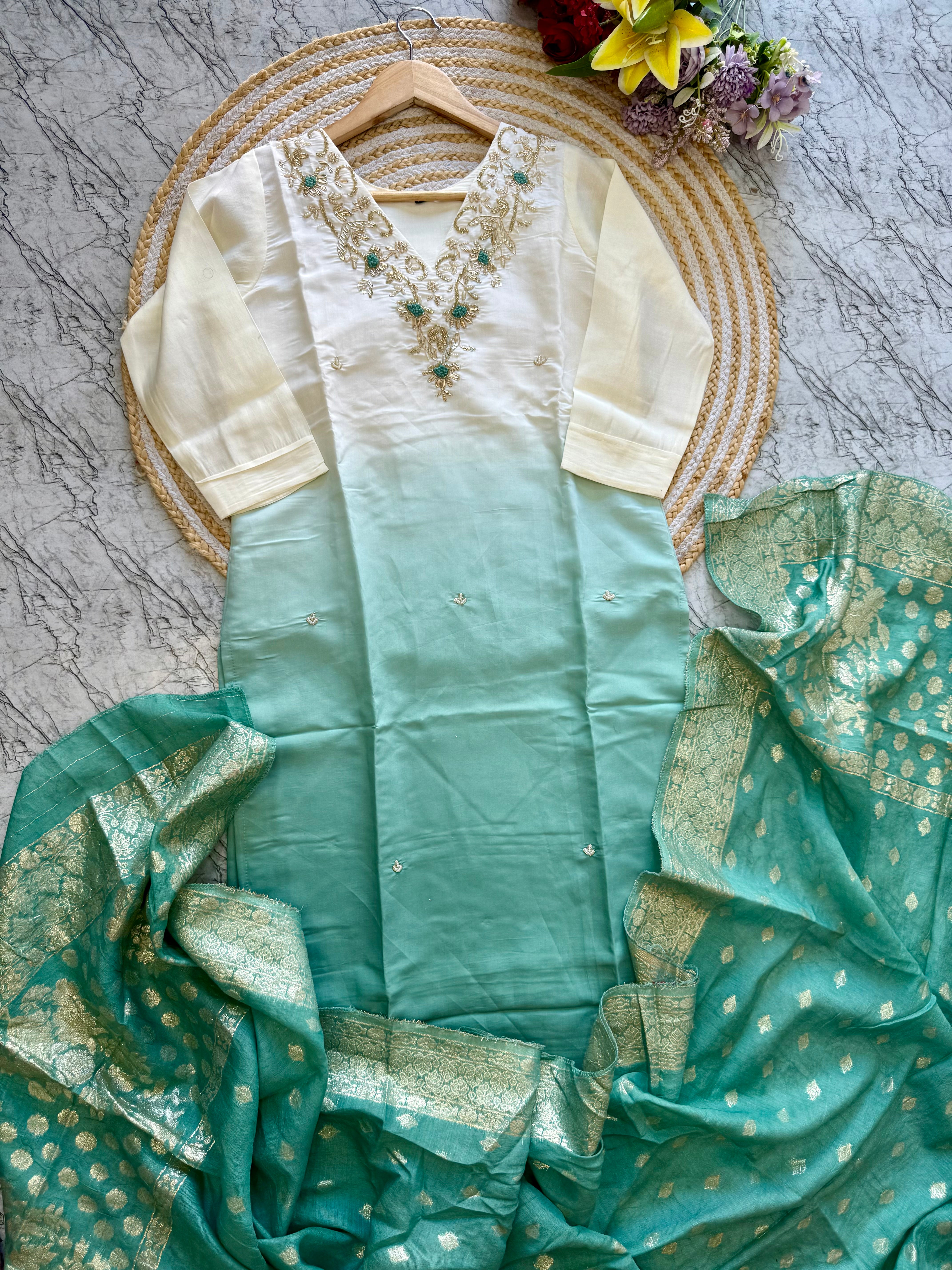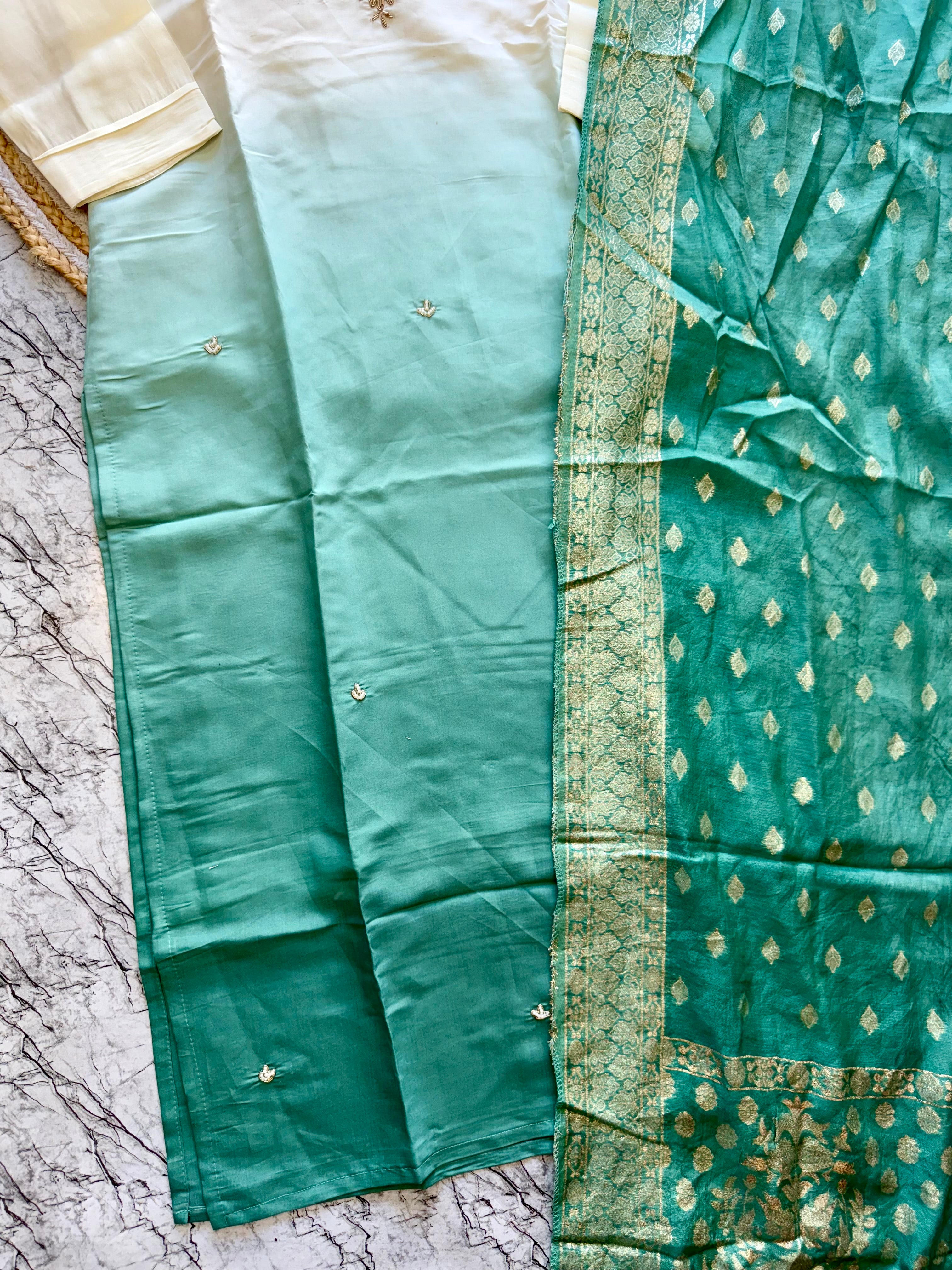 pure Roman silk top in ombre with attached lining, expertly lined for a luxurious feel. The silk pant adds a touch of sophistication, while the self-zari jacquard Chanderi dupatta drapes elegantly around you.